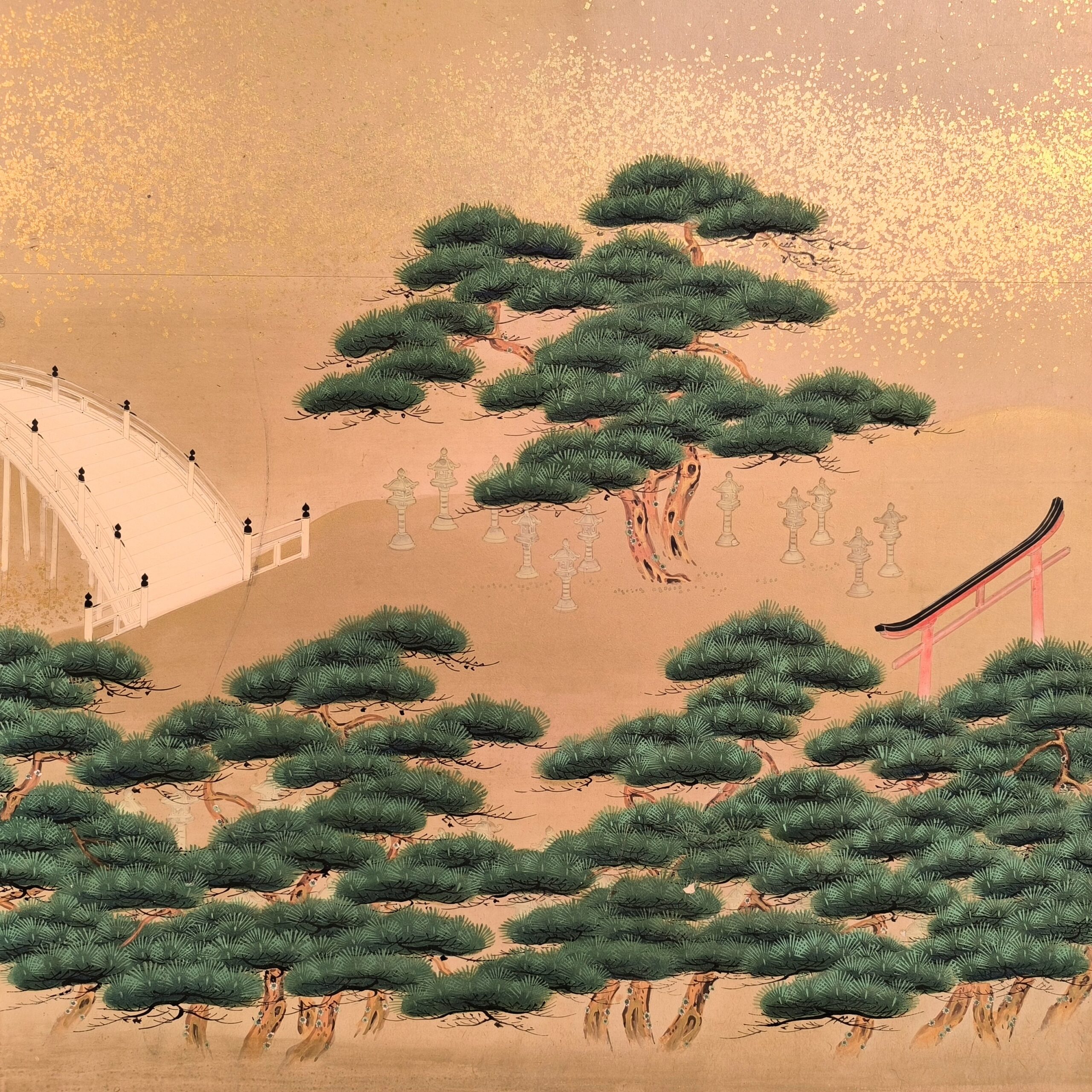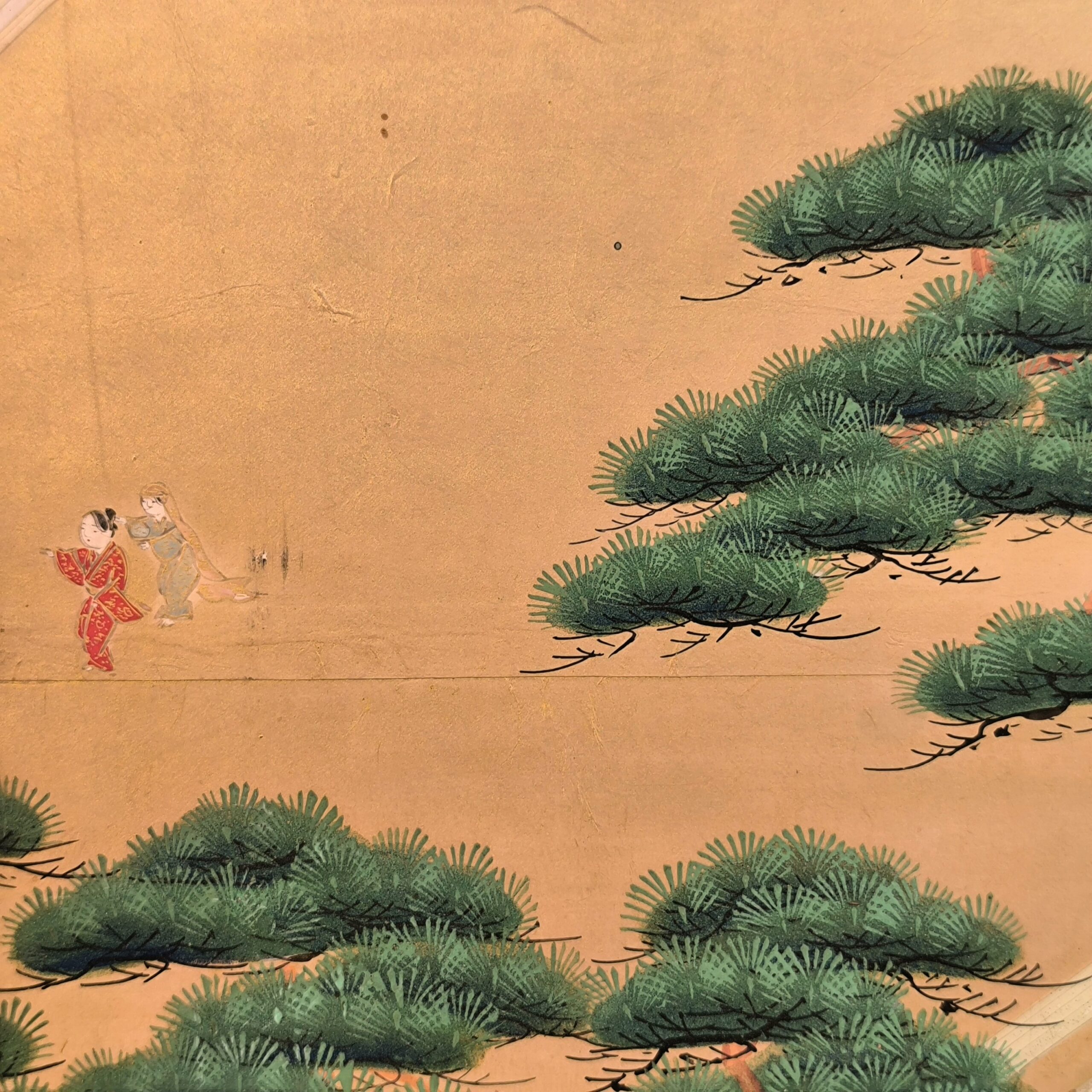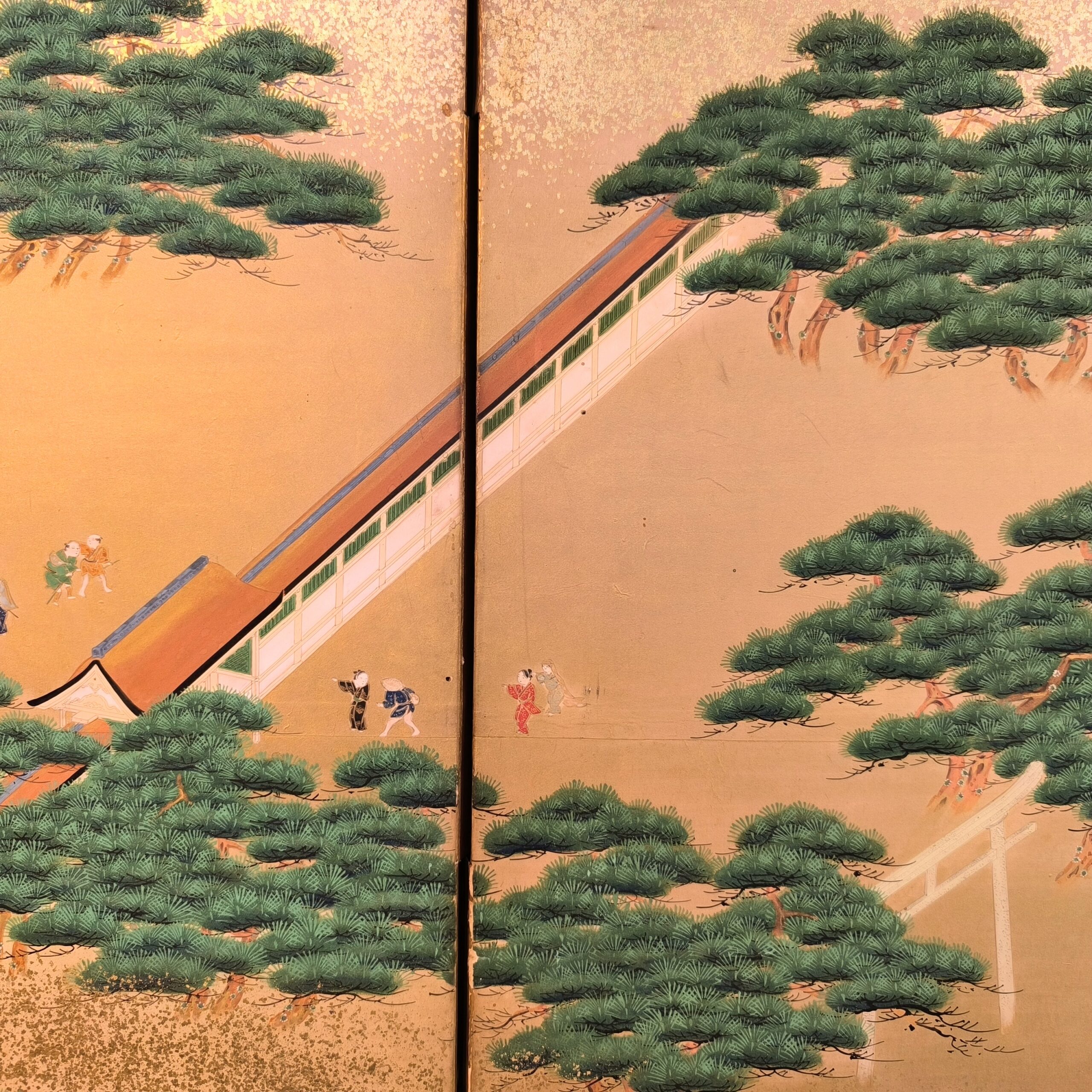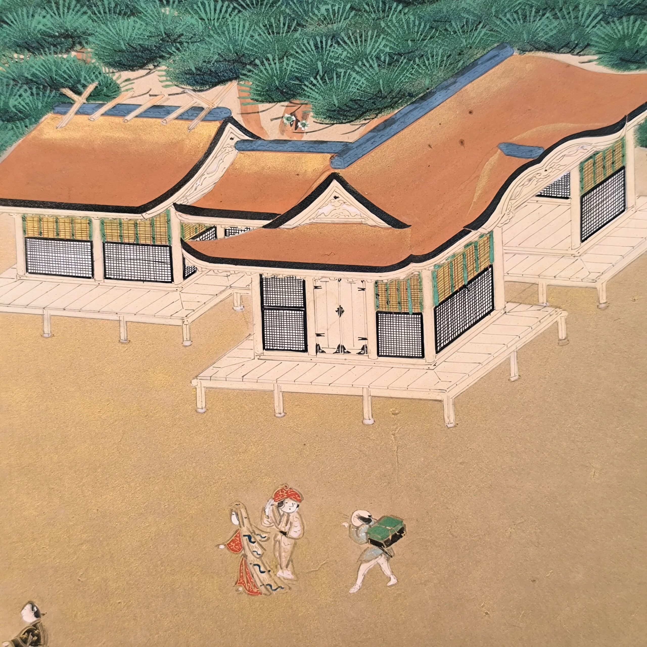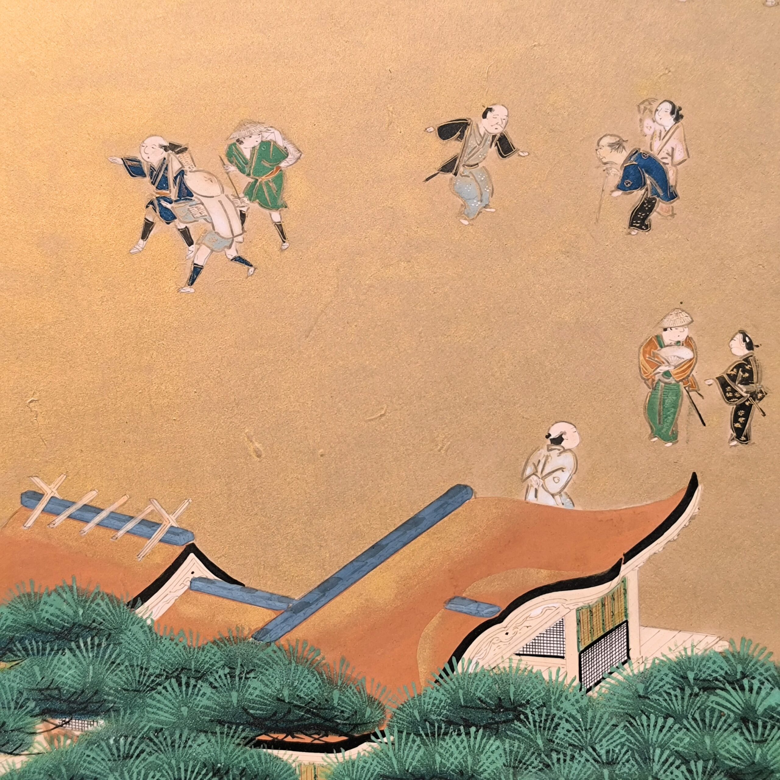 島にある神社の参拝を描写した風俗図屏風で、場所を特定できないものの、その描写はとても細かくてお社、太鼓橋、人々の服装や顔までとても丁寧に描かれています。当時の人々の様子や参拝風景を垣間見れる興味深い屏風です。