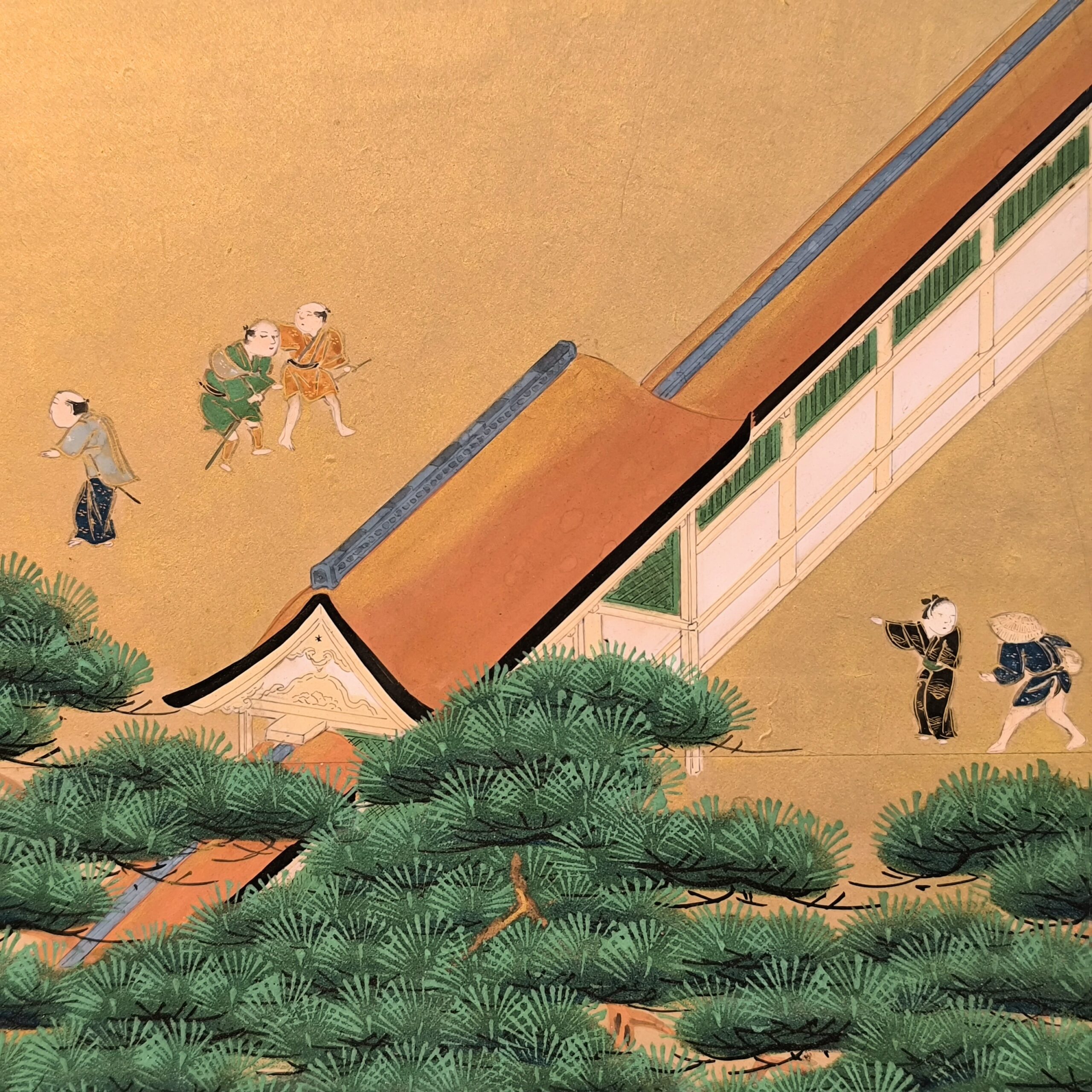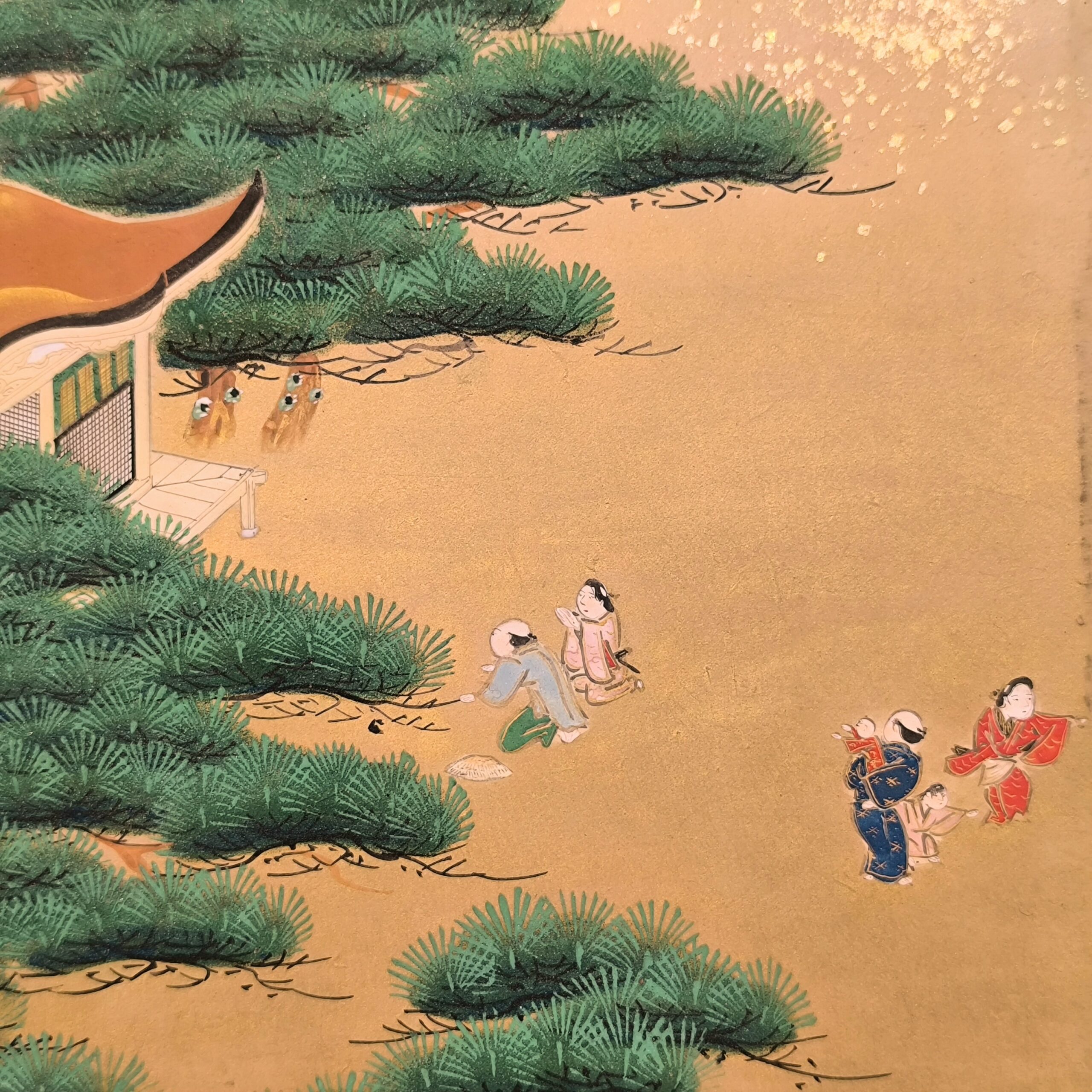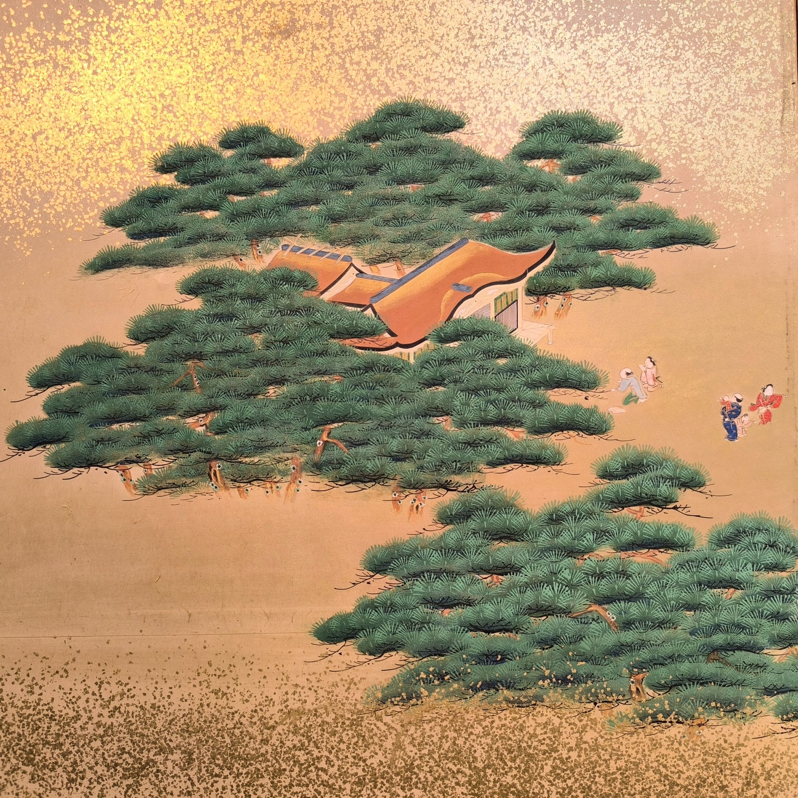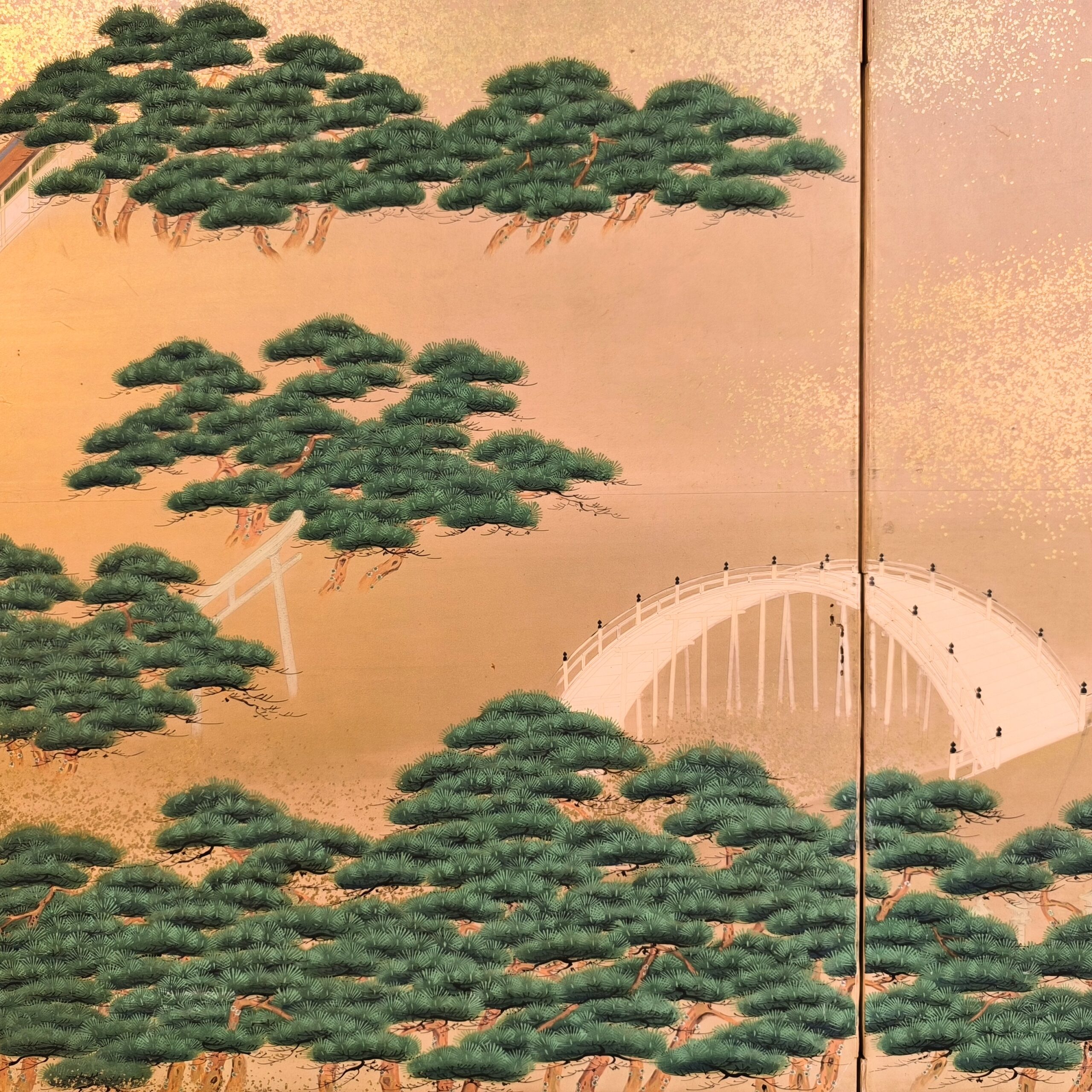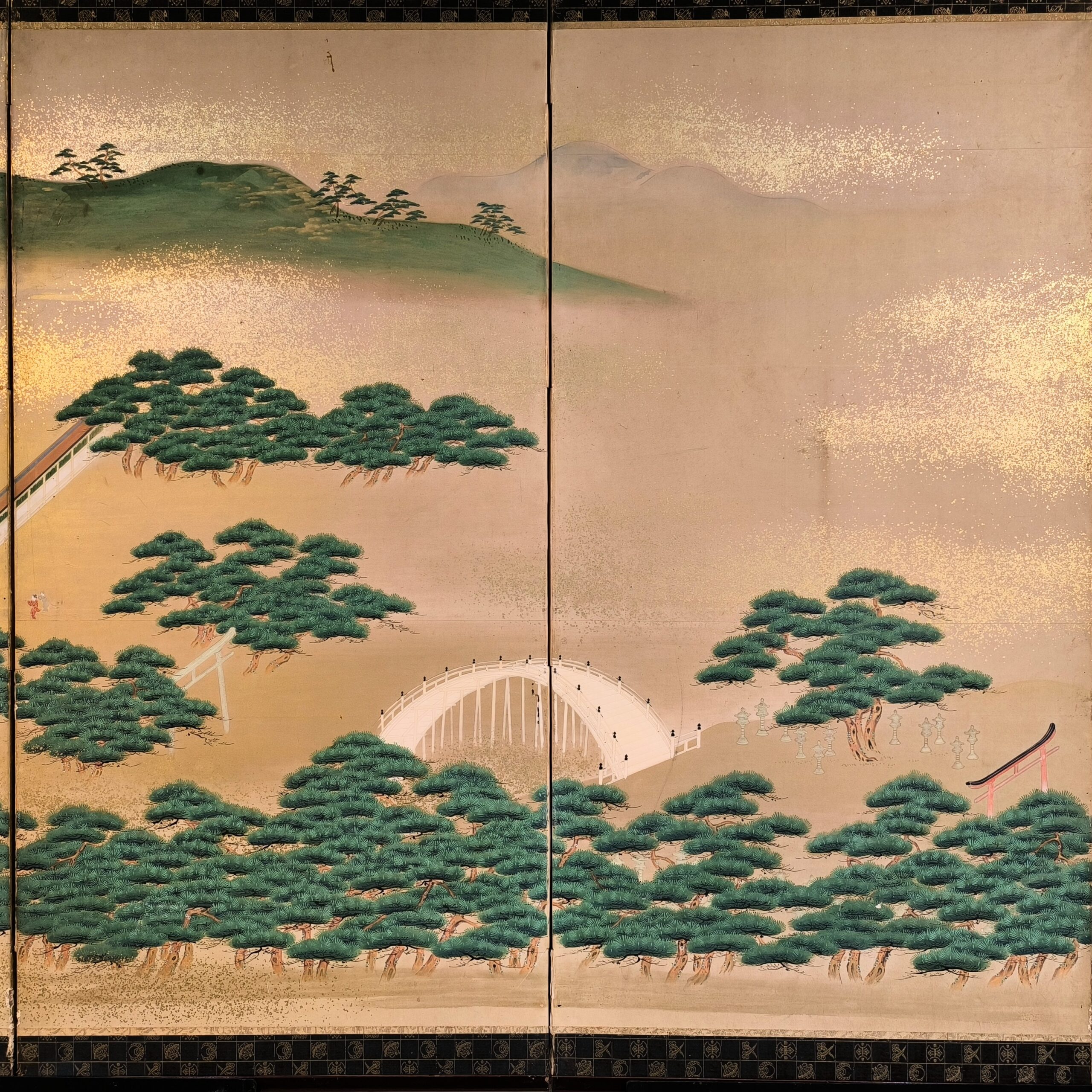 島にある神社の参拝を描写した風俗図屏風で、場所を特定できないものの、その描写はとても細かくてお社、太鼓橋、人々の服装や顔までとても丁寧に描かれています。当時の人々の様子や参拝風景を垣間見れる興味深い屏風です。
