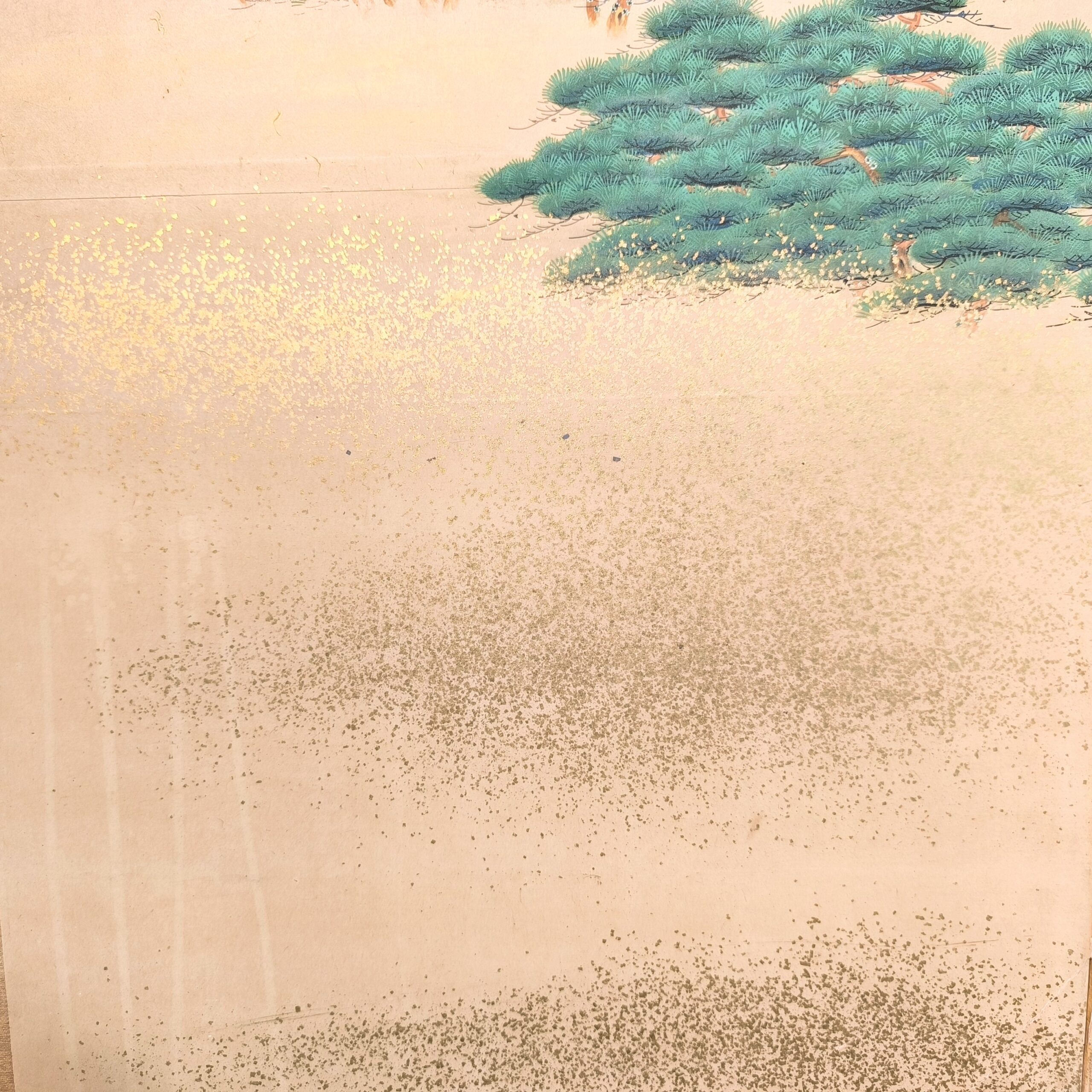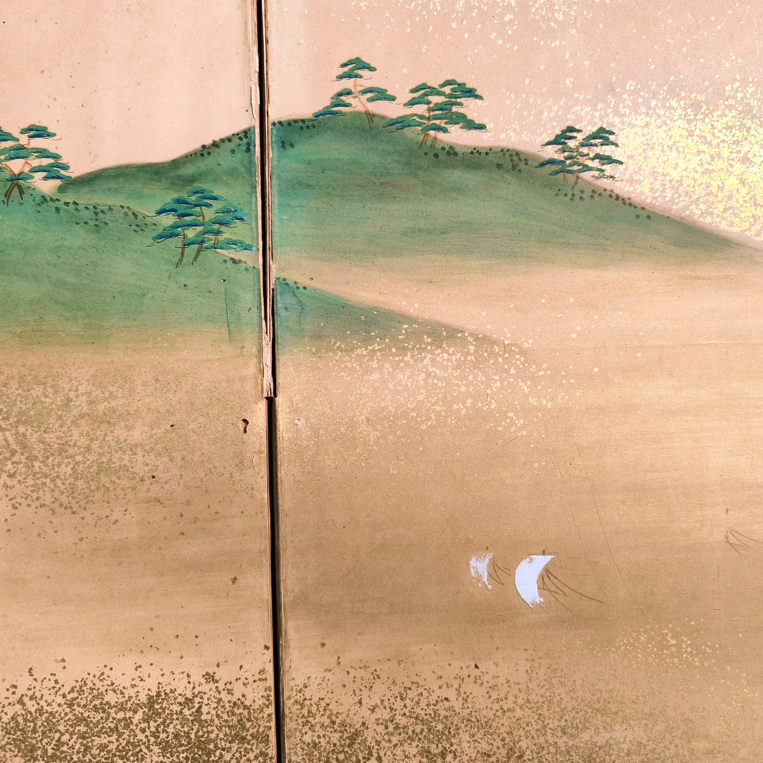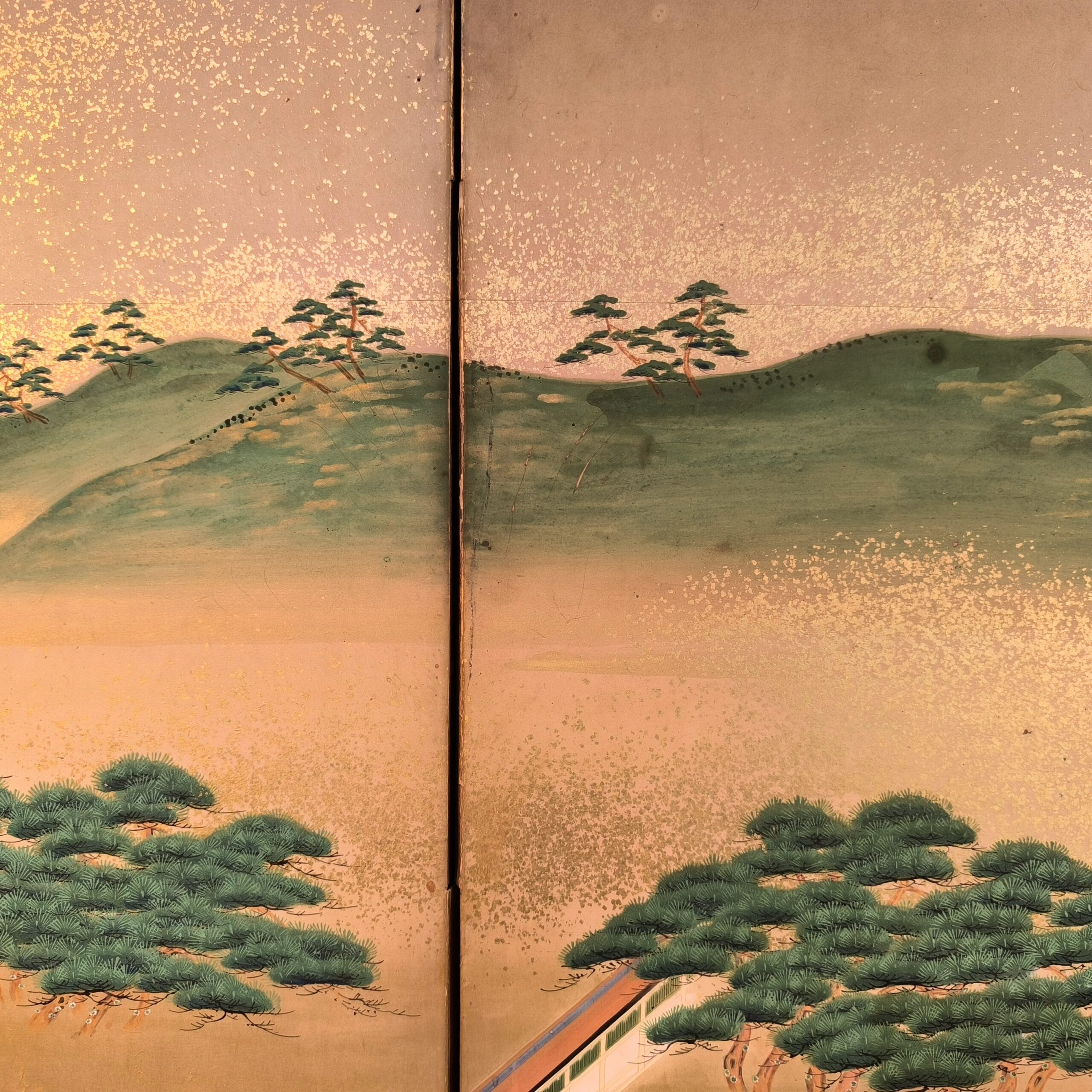 屏風とは複数の板を紙や絹で貼り、蝶番で繋げて折りたためる構造で、2曲・6曲などの形式が多く見られます。用途としては室内の間仕切りや風除け、儀礼や儀式での装飾、美術品としての鑑賞目的で作られました。元々は角度をつけて床に置いていましたが、今ではまっすぐに広げて壁に絵画のように飾られることが多いです。特に金箔地に絵が前面に描かれた物が人気です。時代によって金箔の大きさや色味が違い、使われた岩絵の具や絵の構図などから時代を考察します。