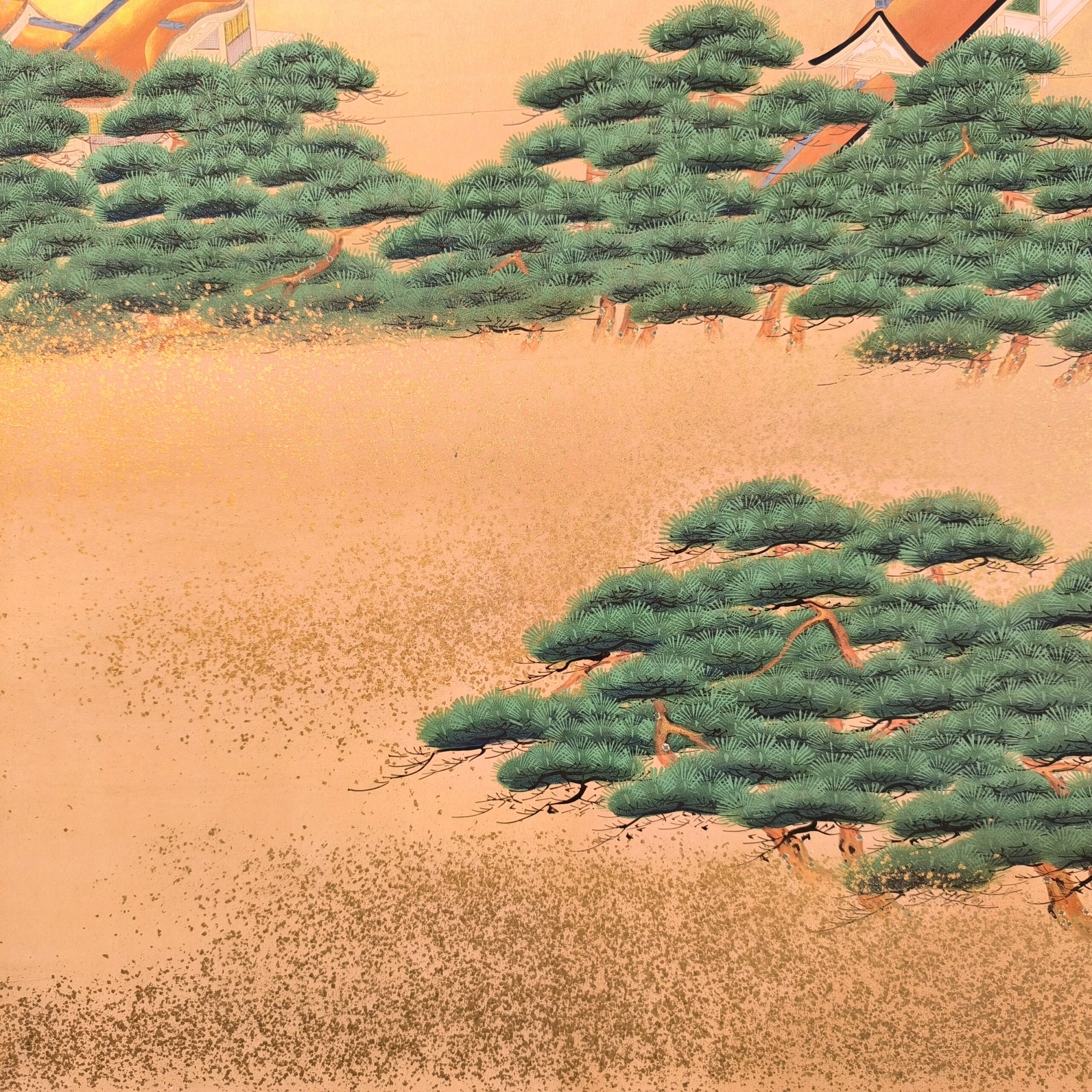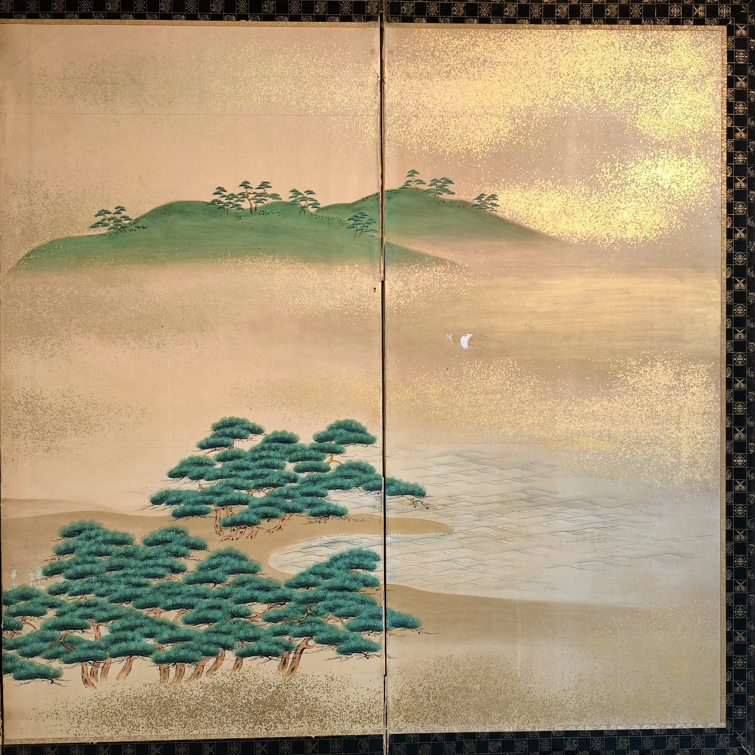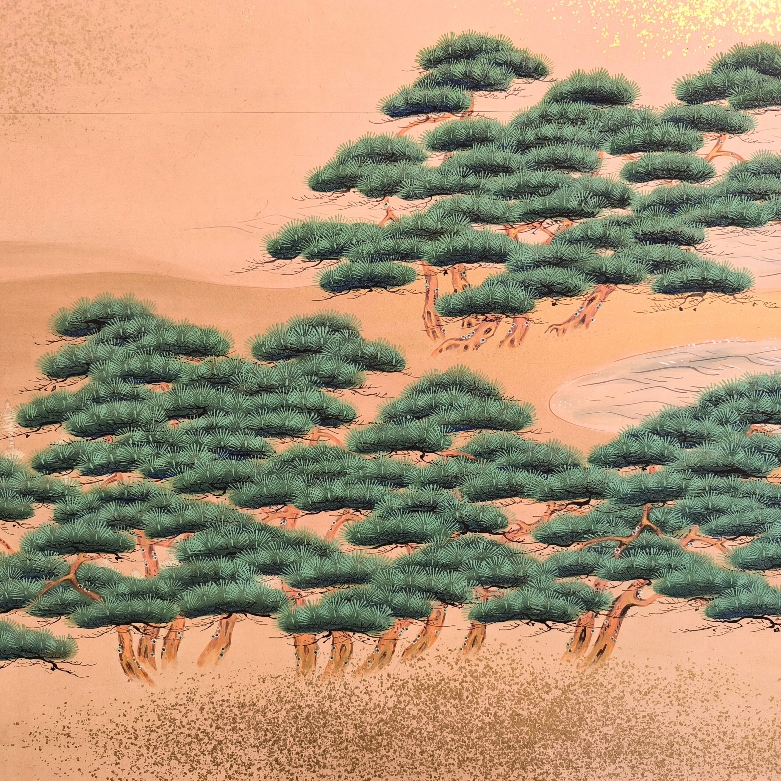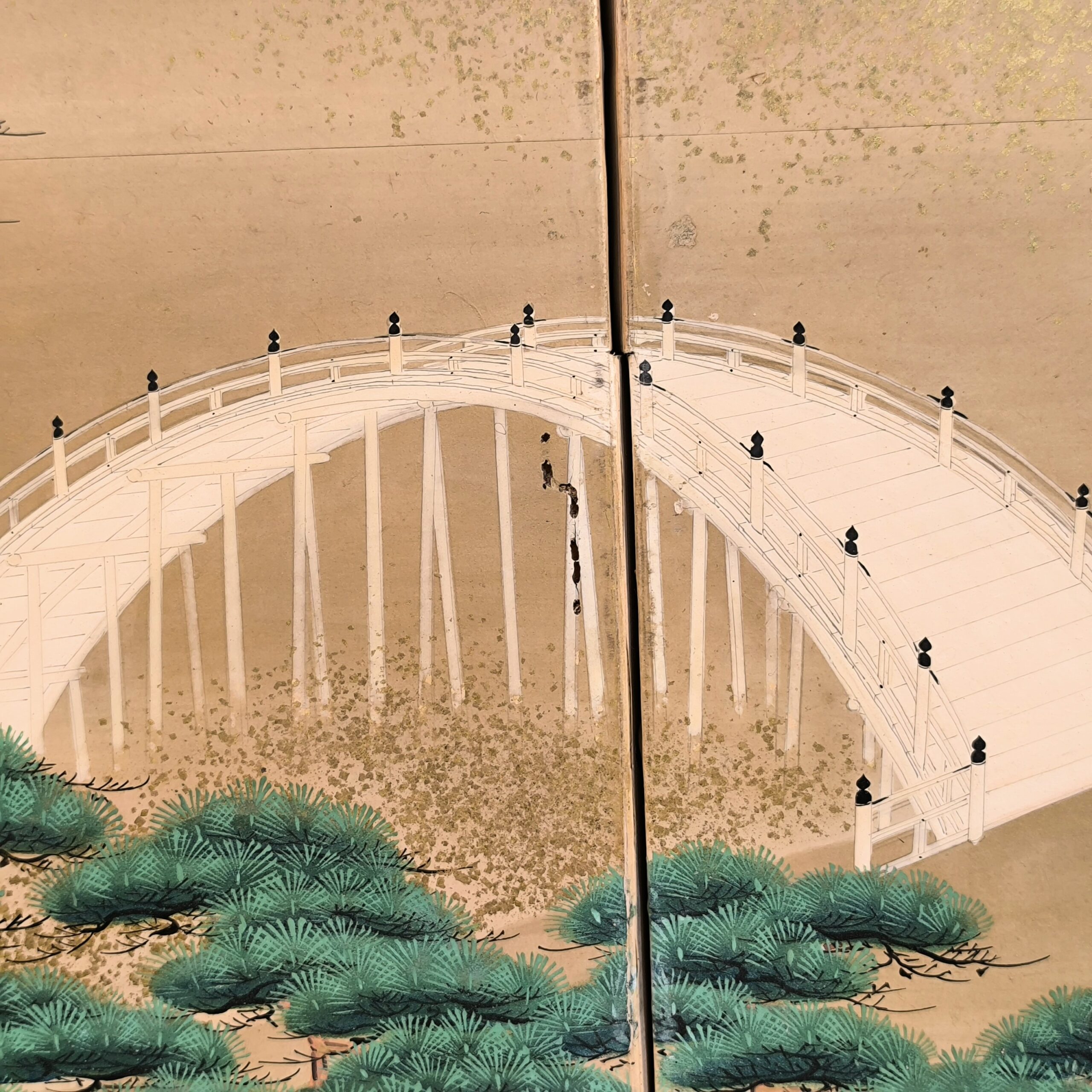 屏風とは複数の板を紙や絹で貼り、蝶番で繋げて折りたためる構造で、2曲・6曲などの形式が多く見られます。用途としては室内の間仕切りや風除け、儀礼や儀式での装飾、美術品としての鑑賞目的で作られました。元々は角度をつけて床に置いていましたが、今ではまっすぐに広げて壁に絵画のように飾られることが多いです。特に金箔地に絵が前面に描かれた物が人気です。時代によって金箔の大きさや色味が違い、使われた岩絵の具や絵の構図などから時代を考察します。