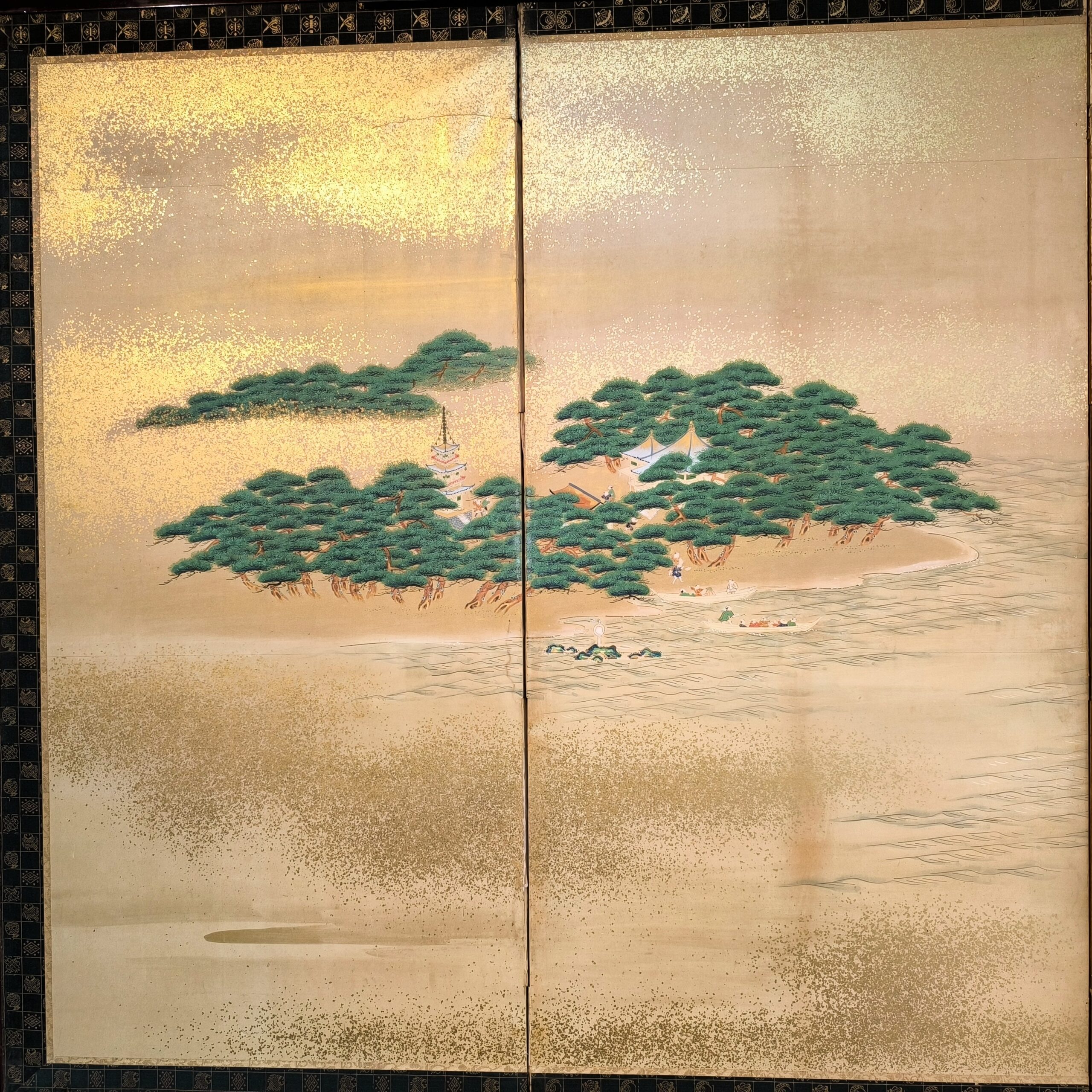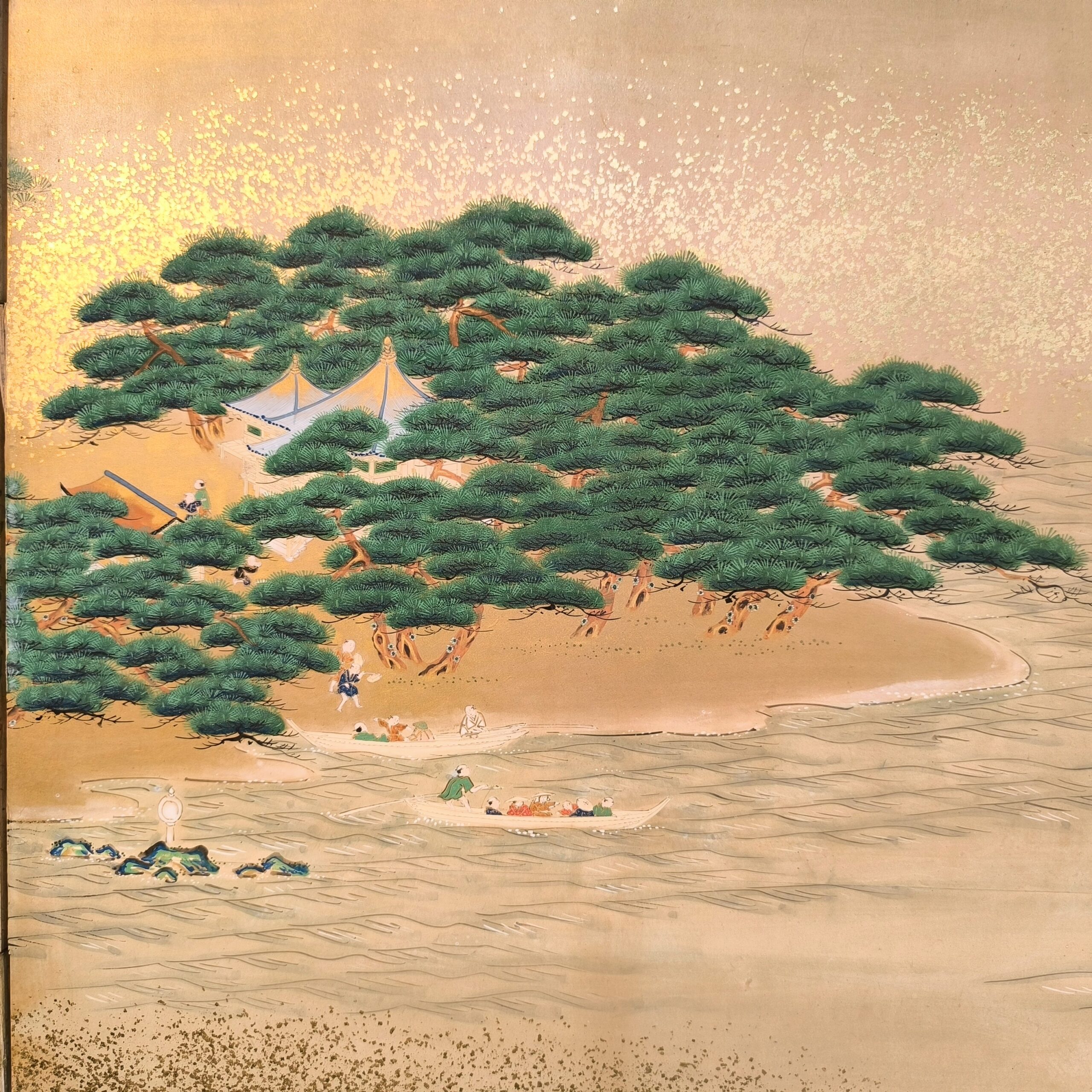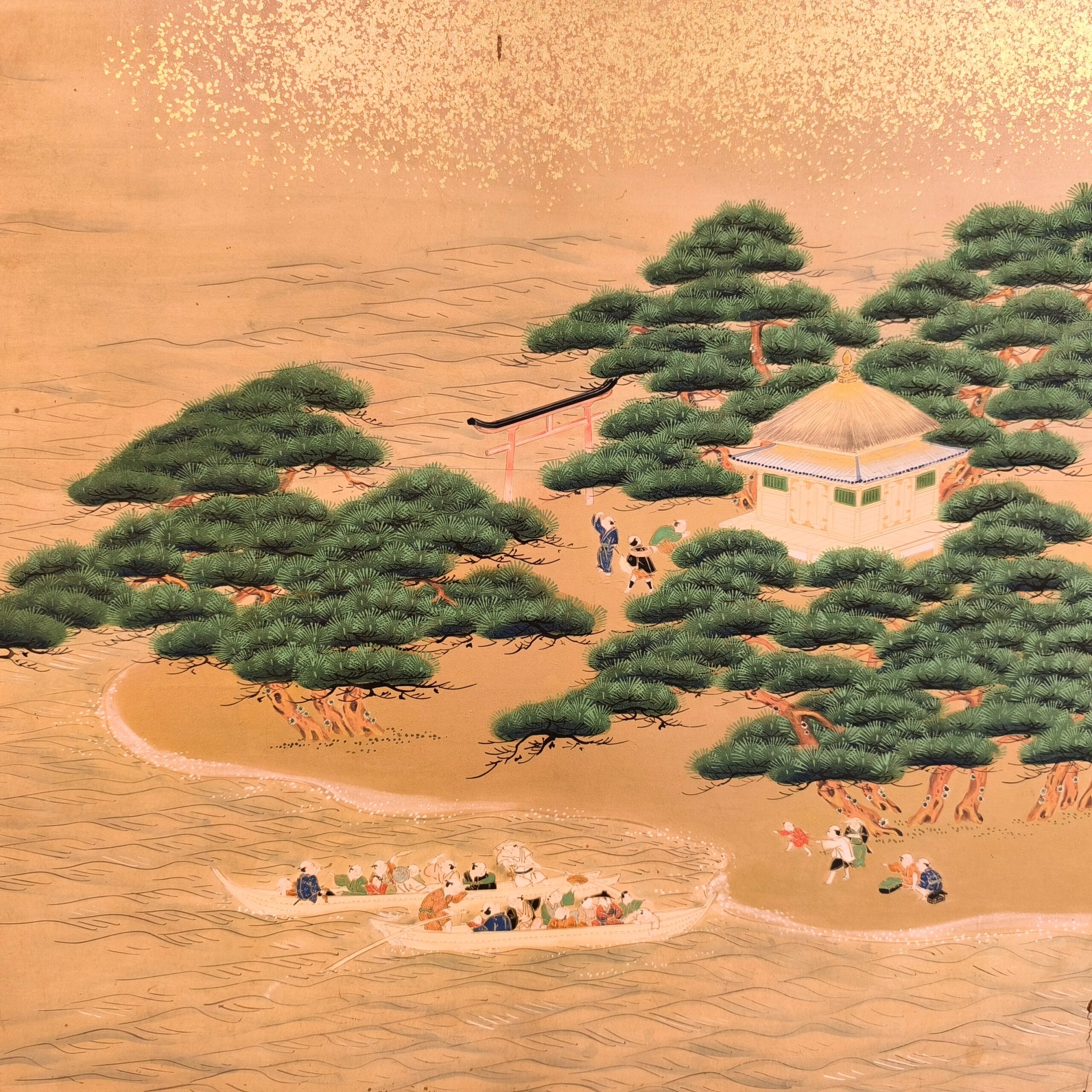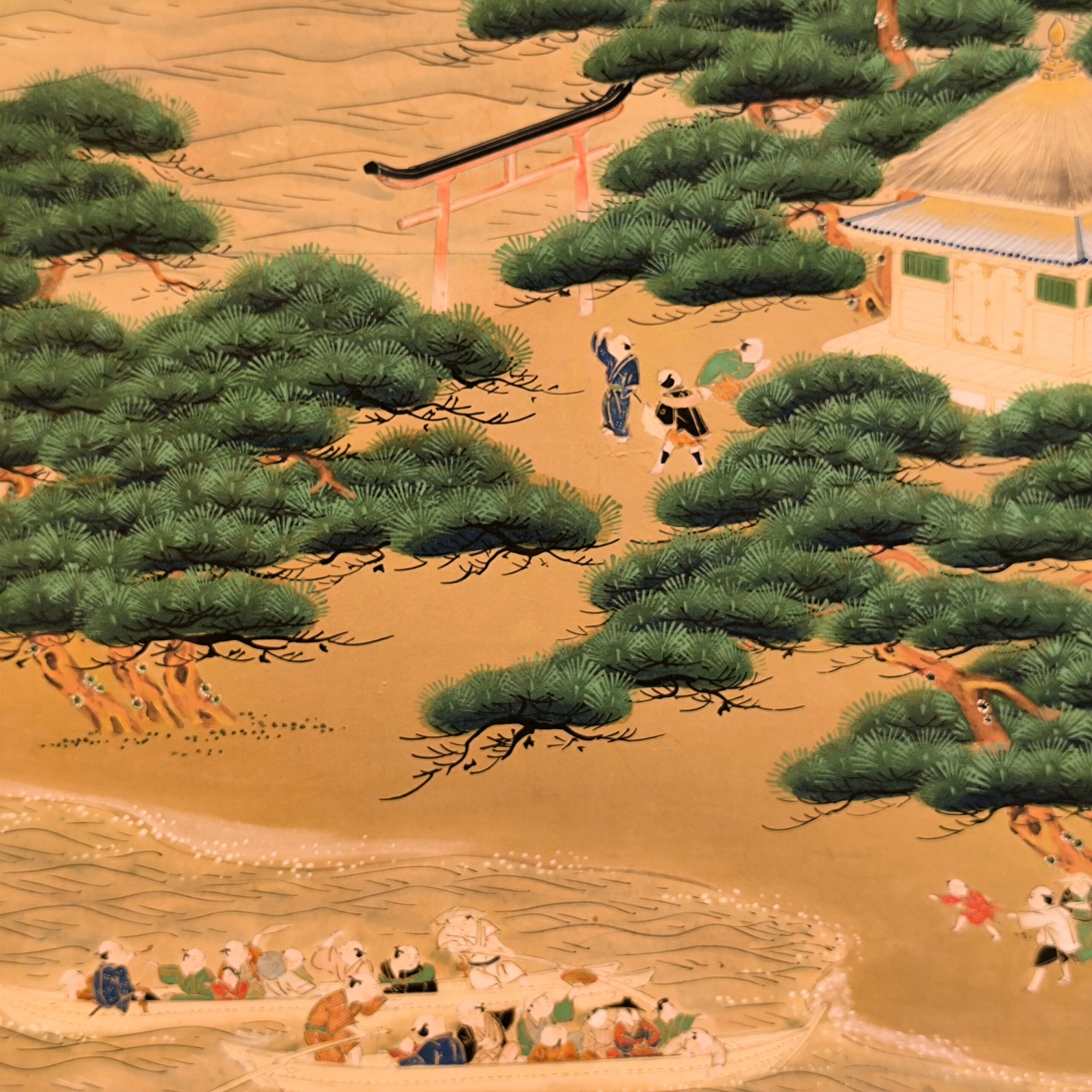 島にある神社の参拝を描写した風俗図屏風で、場所を特定できないものの、その描写はとても細かくてお社、三重の塔、人々の服装や顔までとても丁寧に描かれています。当時の人々の様子や参拝風景を垣間見れる興味深い屏風です。