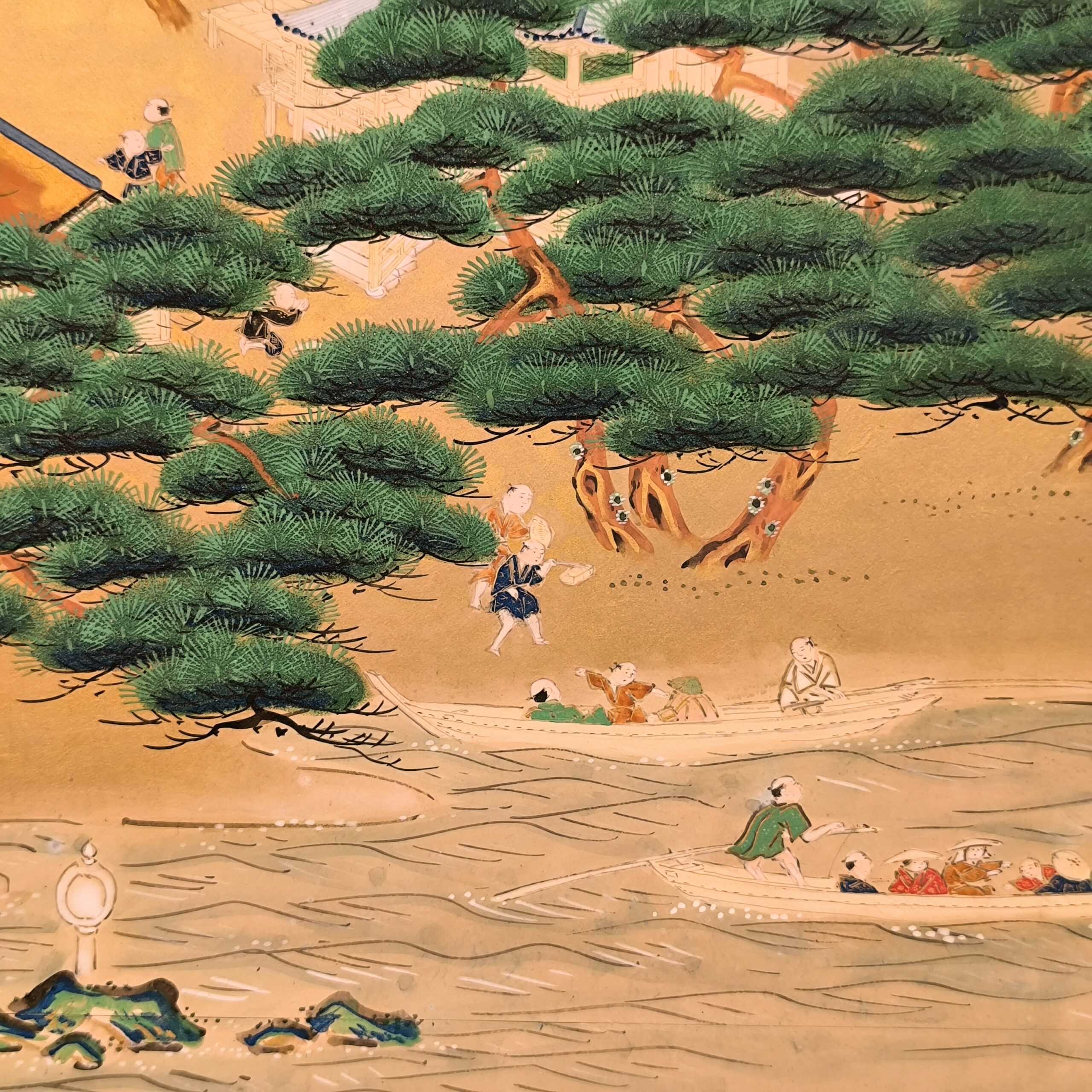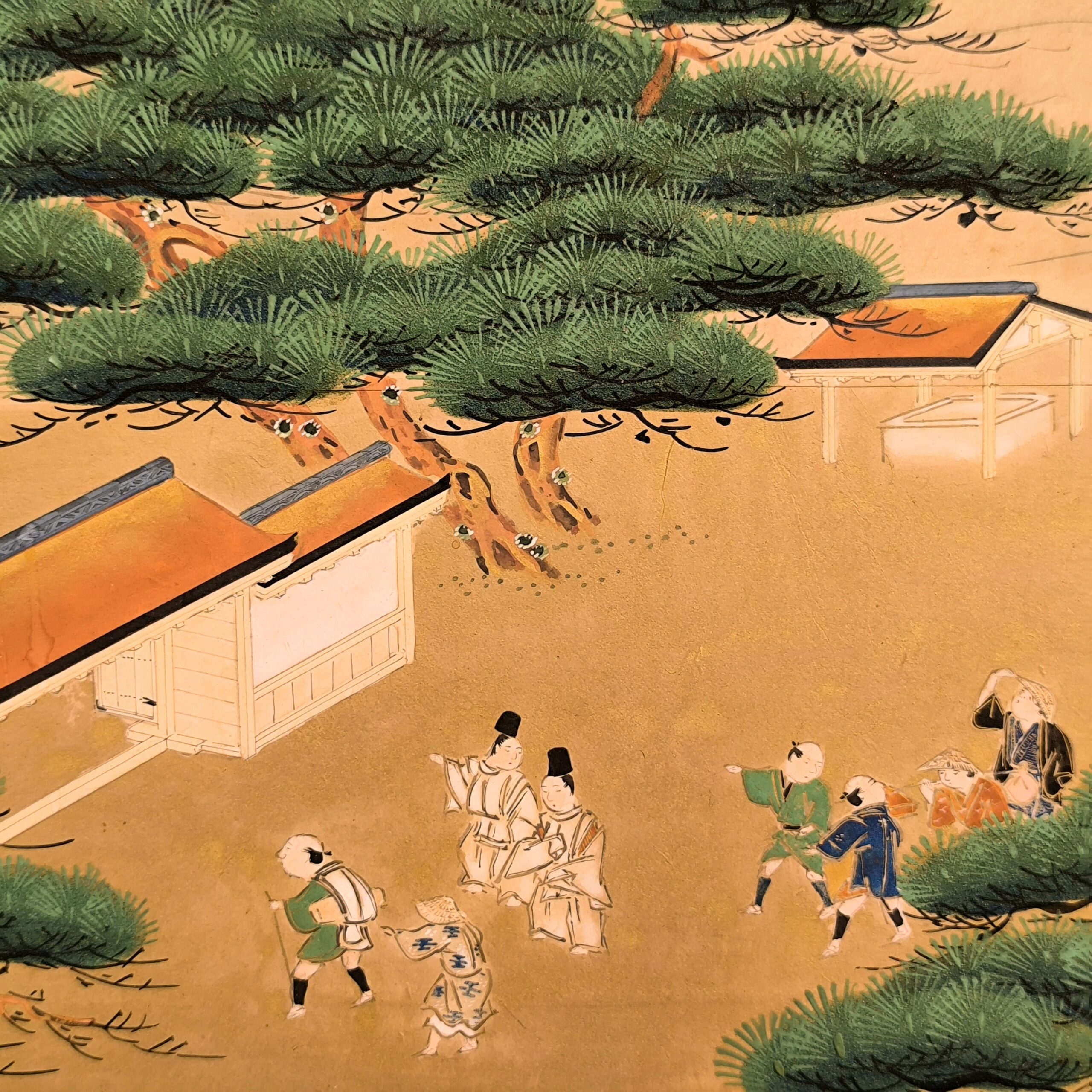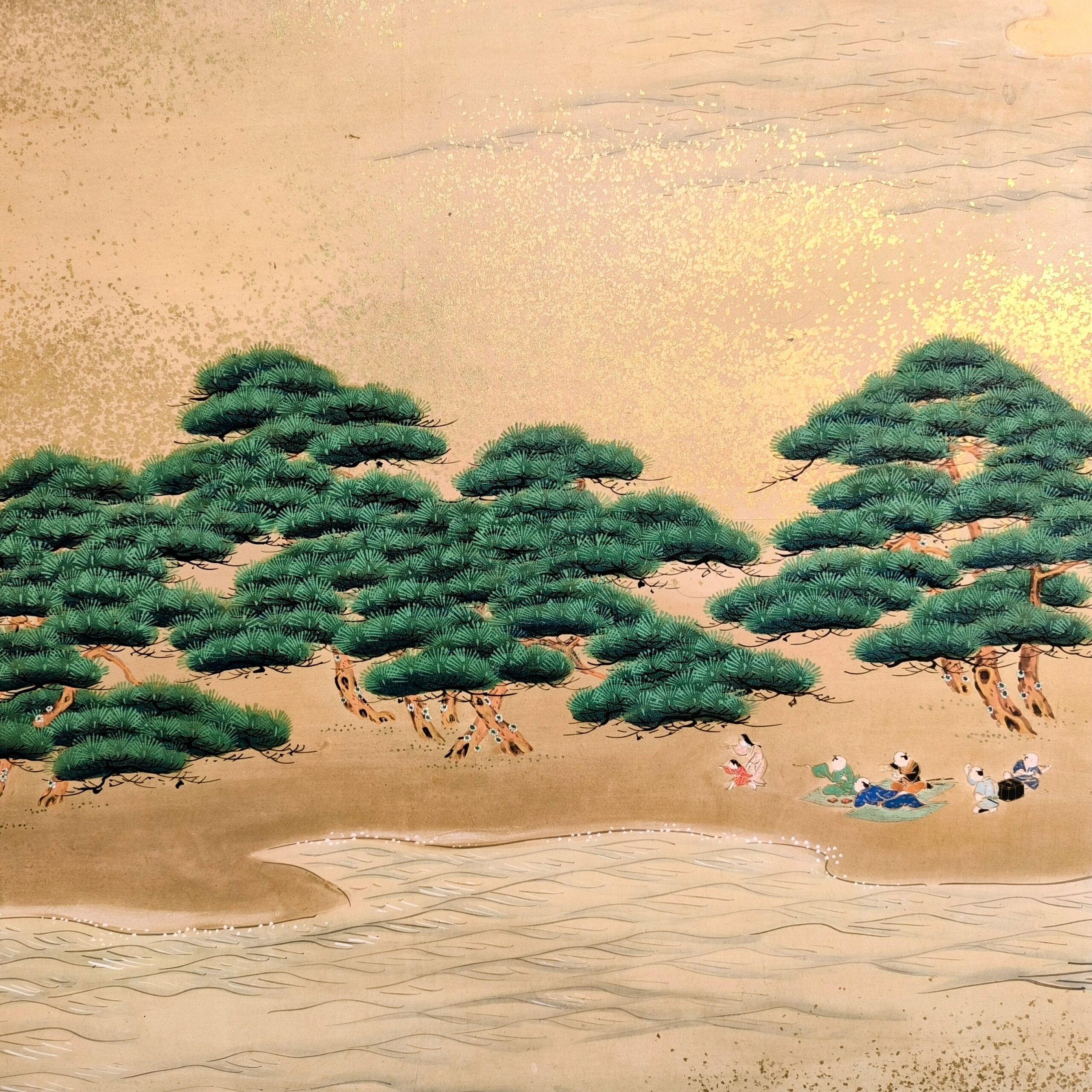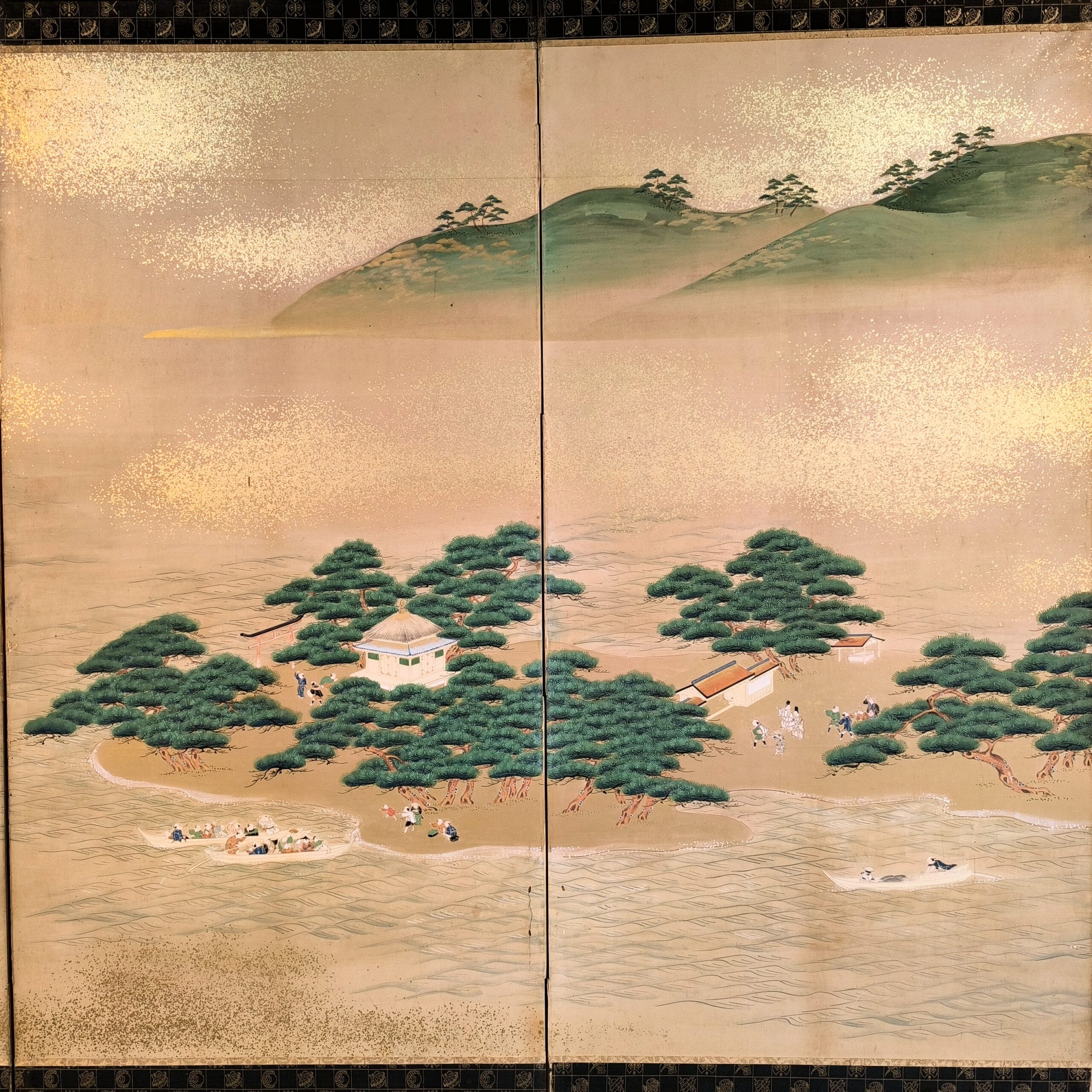 島にある神社の参拝を描写した風俗図屏風で、場所を特定できないものの、その描写はとても細かくてお社、三重の塔、人々の服装や顔までとても丁寧に描かれています。当時の人々の様子や参拝風景を垣間見れる興味深い屏風です。