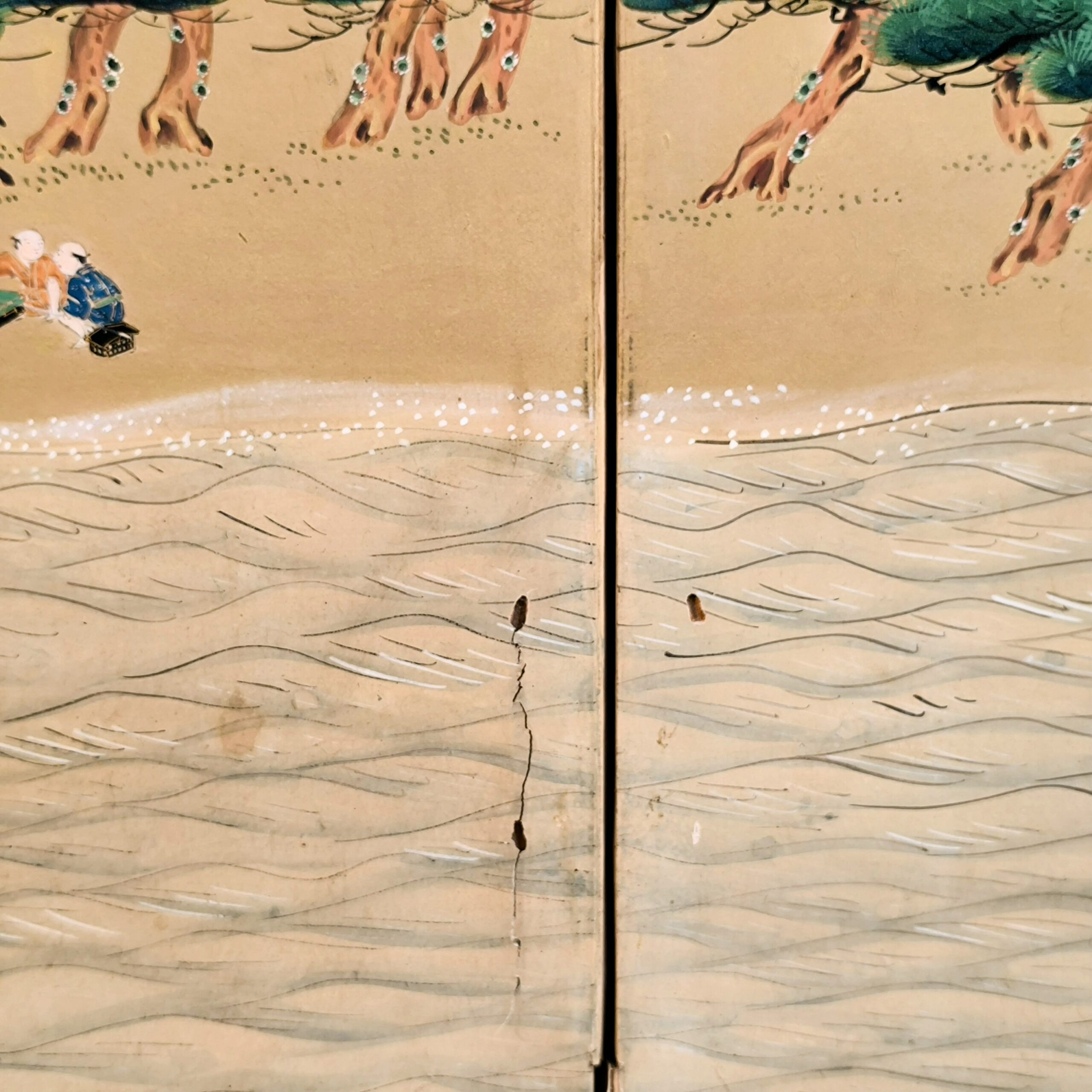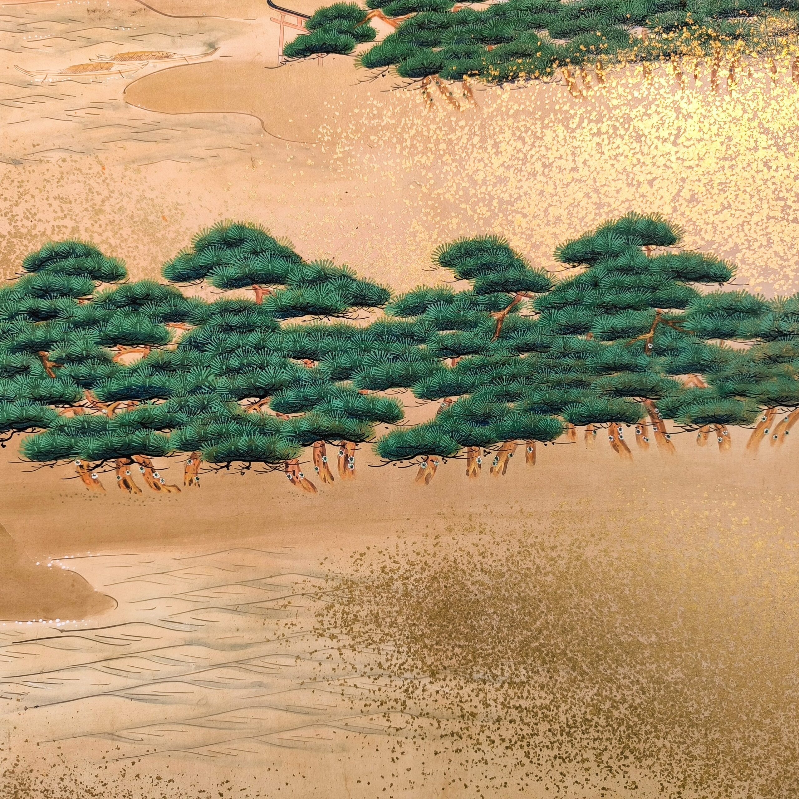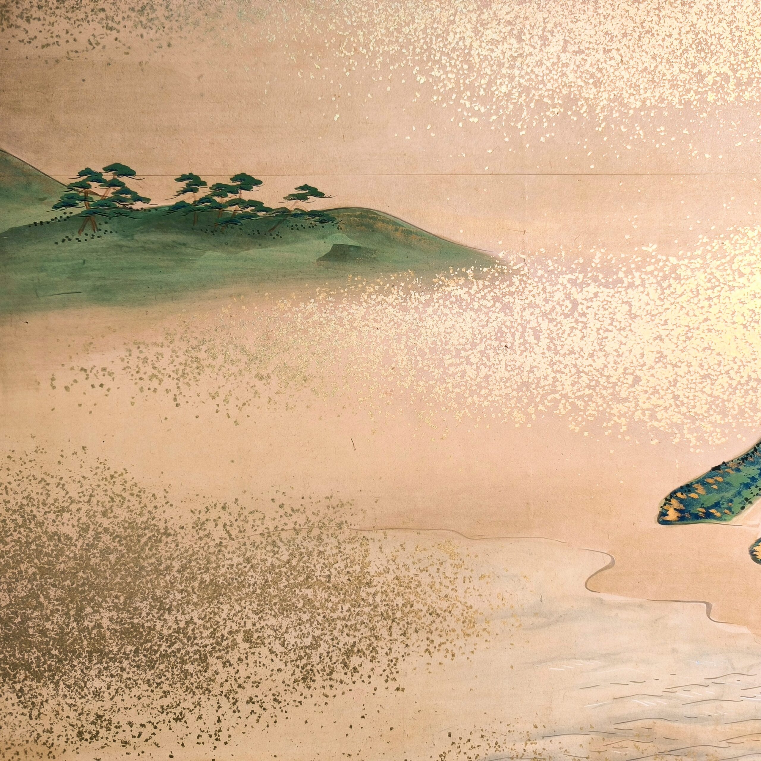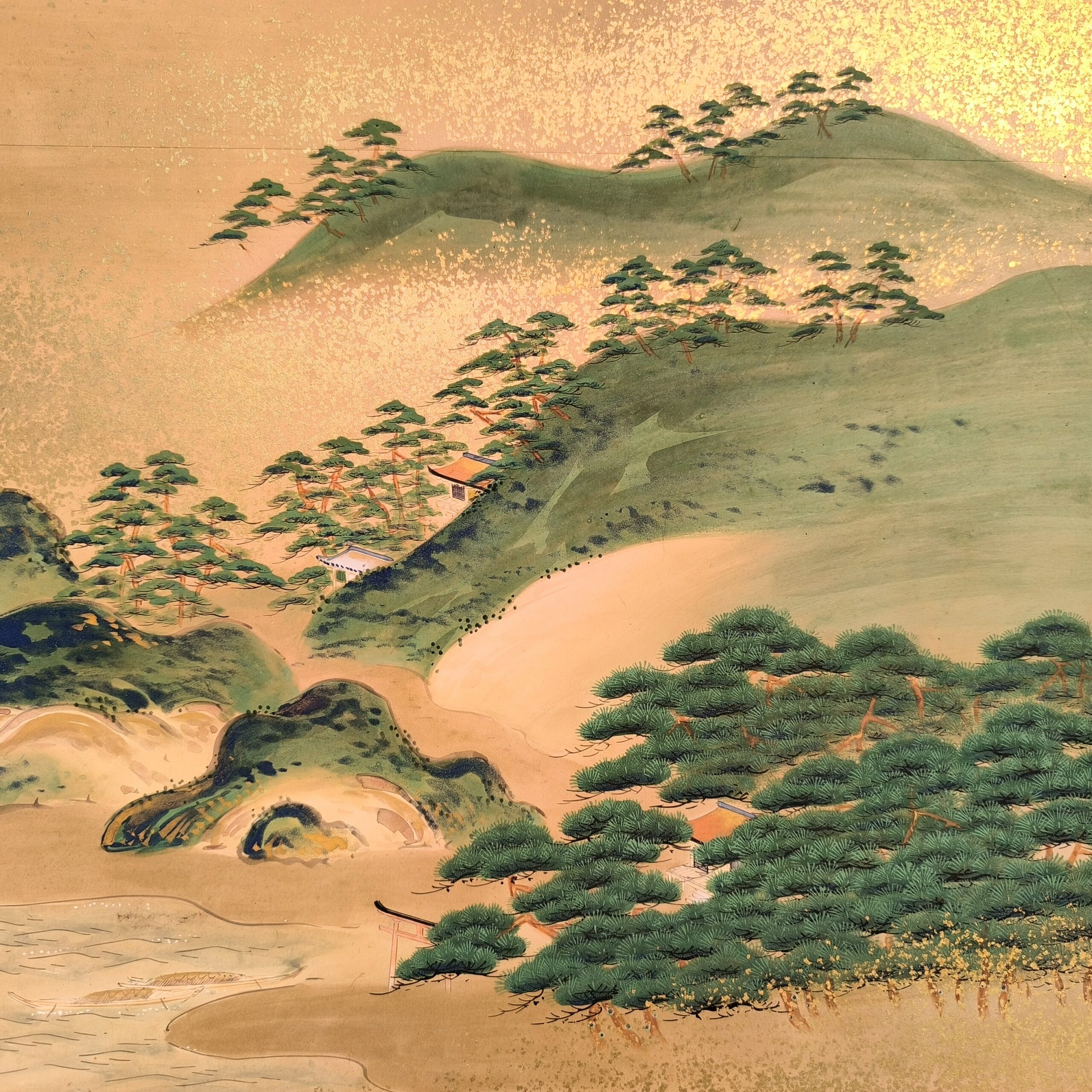 島にある神社の参拝を描写した風俗図屏風で、場所を特定できないものの、その描写はとても細かくてお社、三重の塔、人々の服装や顔までとても丁寧に描かれています。当時の人々の様子や参拝風景を垣間見れる興味深い屏風です。