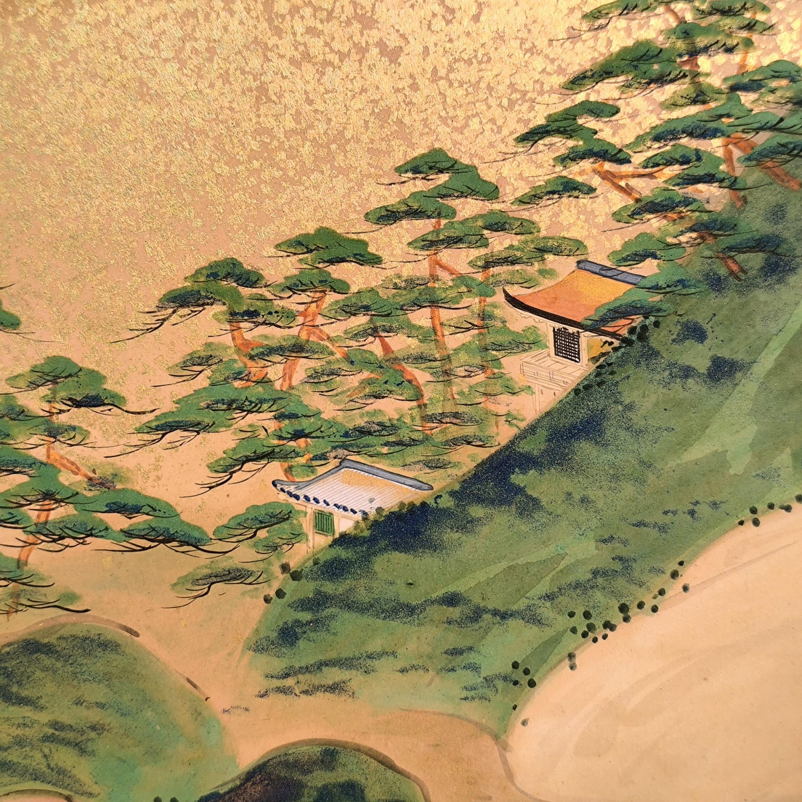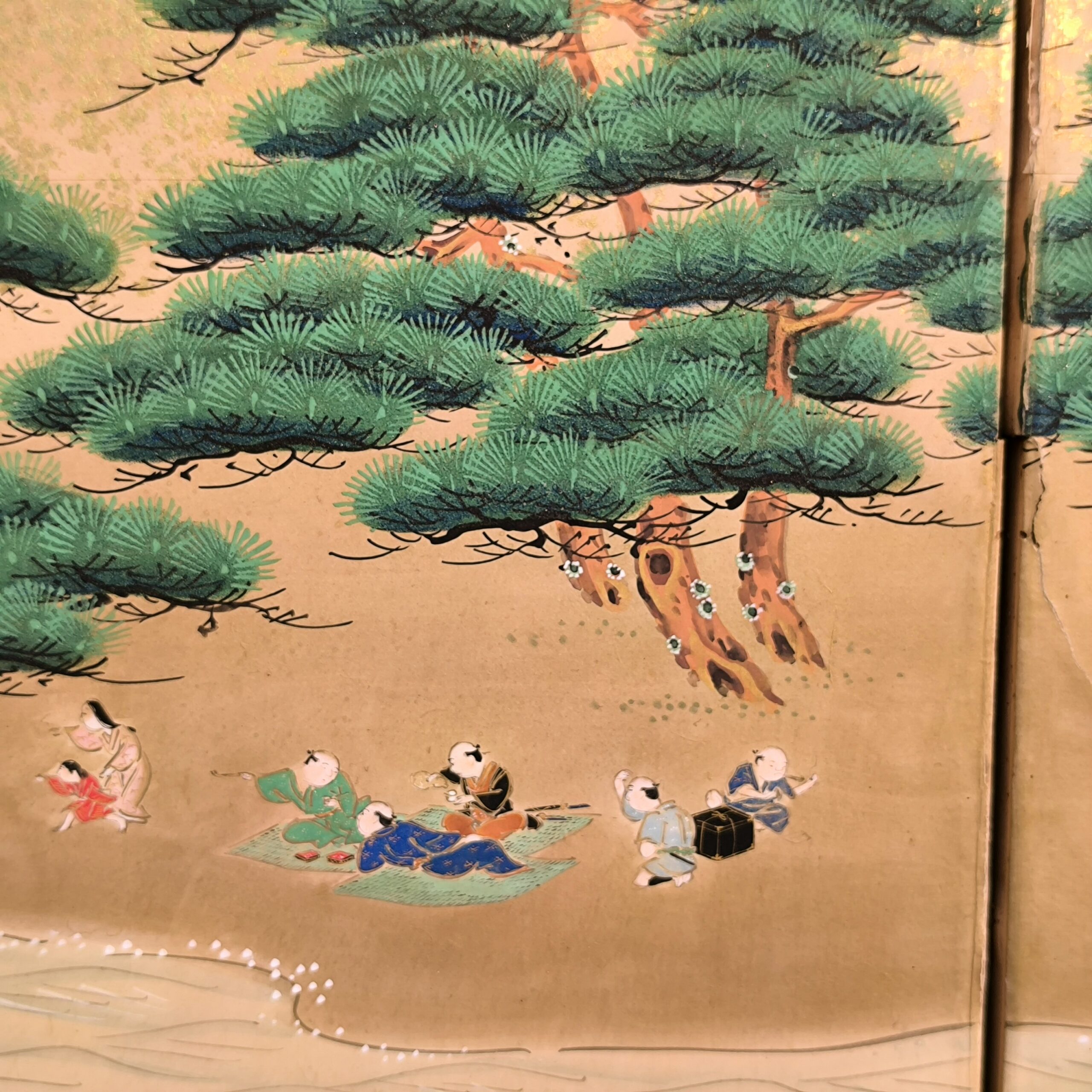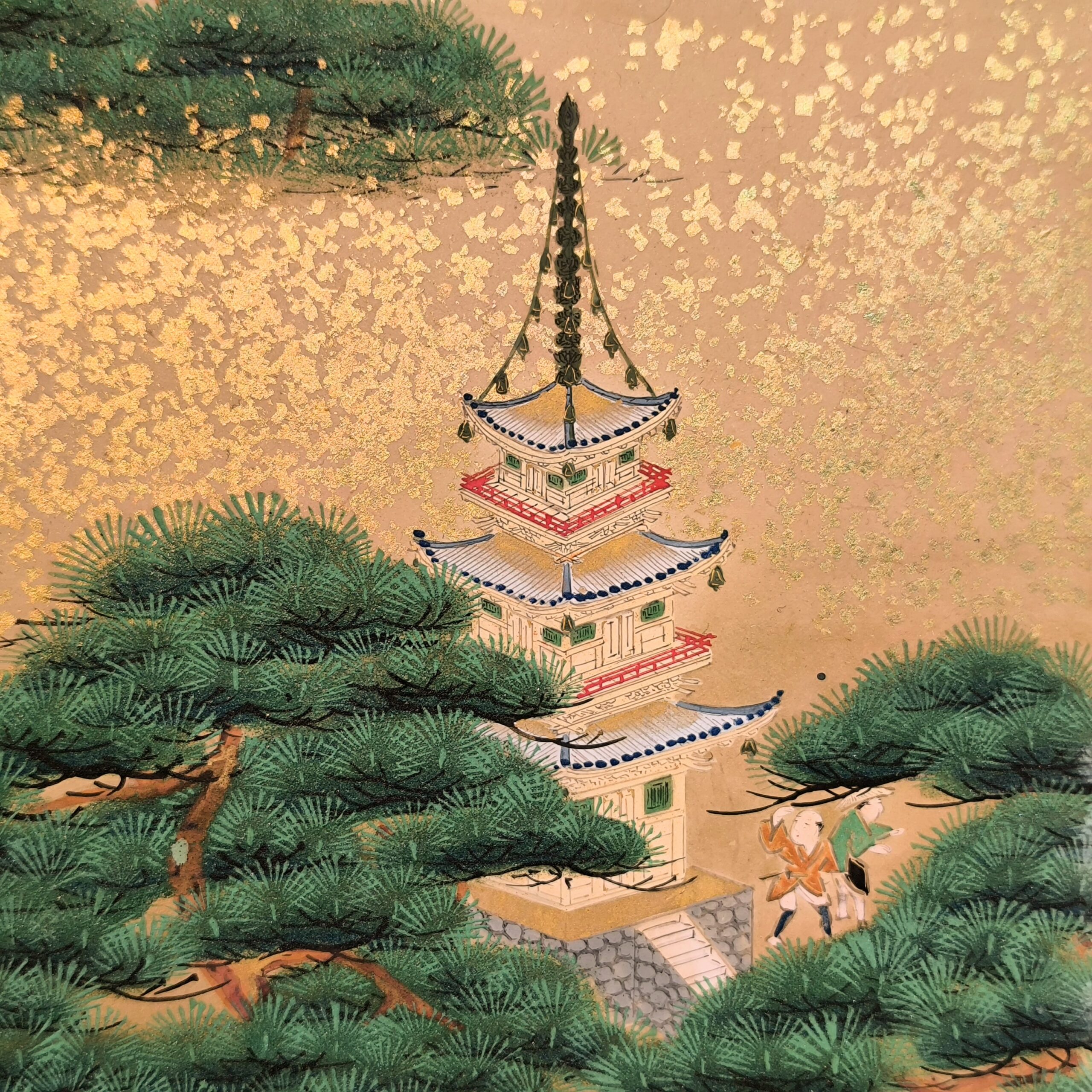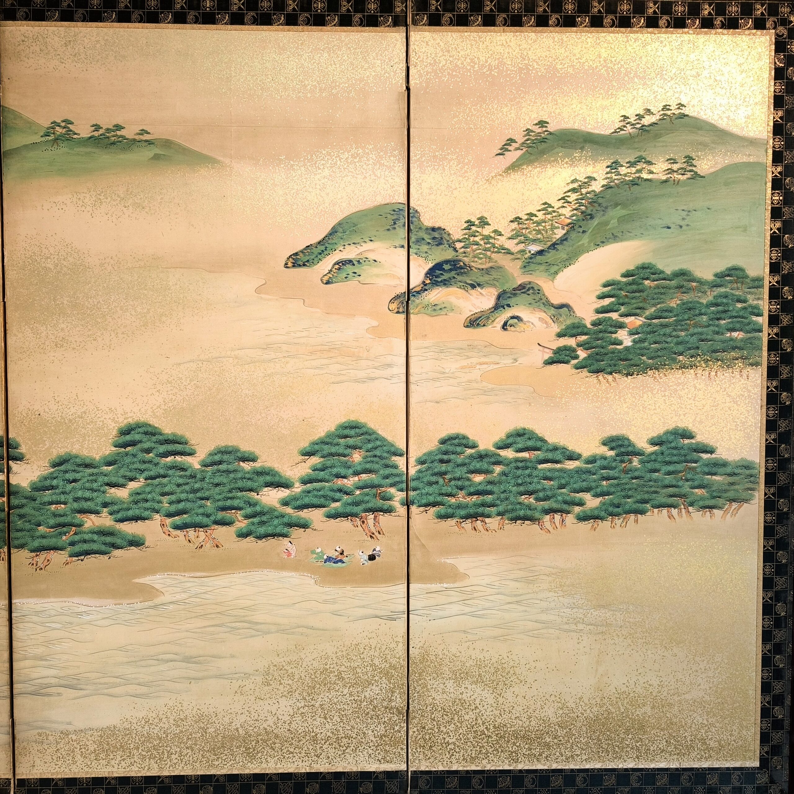 島にある神社の参拝を描写した風俗図屏風で、場所を特定できないものの、その描写はとても細かくてお社、三重の塔、人々の服装や顔までとても丁寧に描かれています。当時の人々の様子や参拝風景を垣間見れる興味深い屏風です。