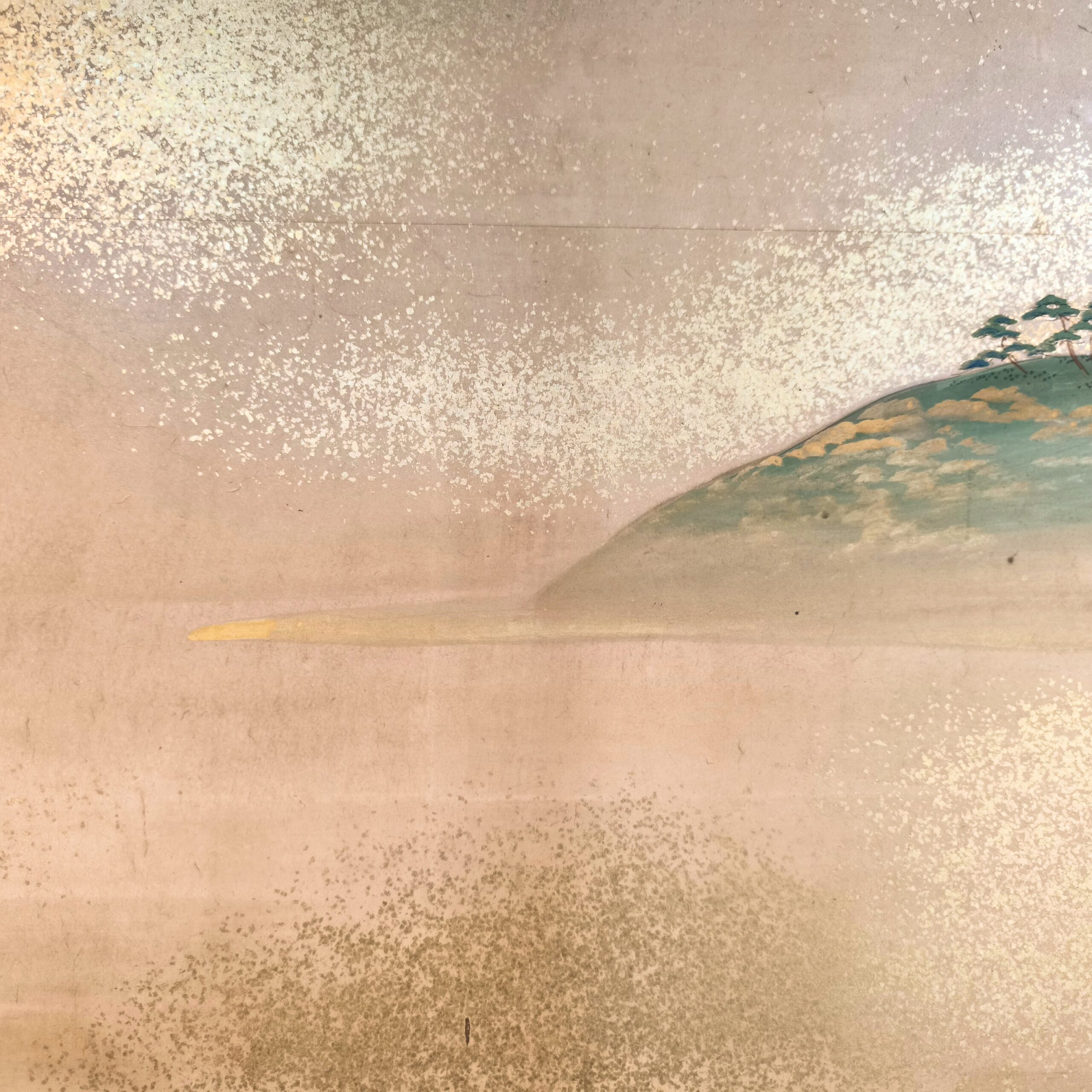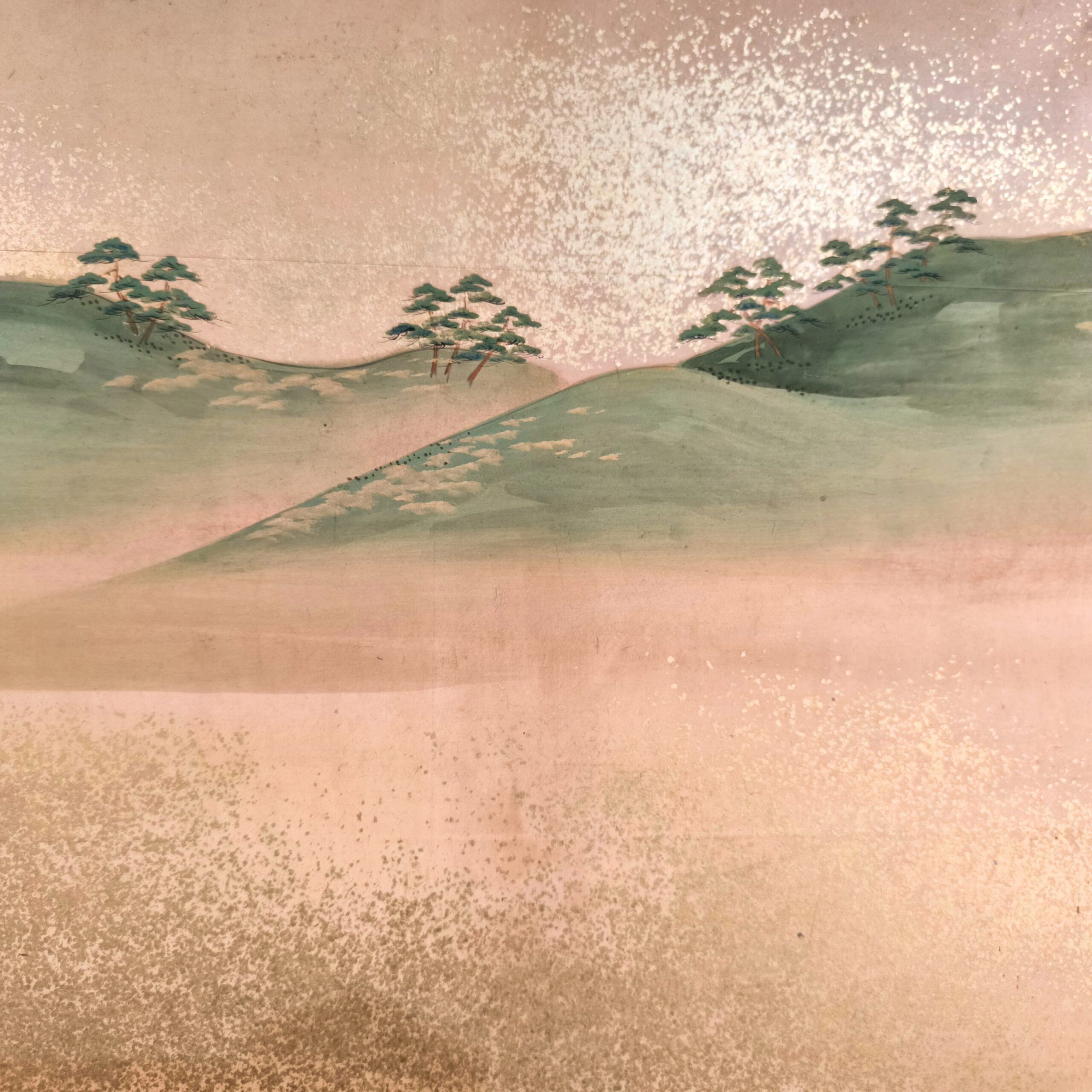 屏風とは複数の板を紙や絹で貼り、蝶番で繋げて折りたためる構造で、2曲・6曲などの形式が多く見られます。用途としては室内の間仕切りや風除け、儀礼や儀式での装飾、美術品としての鑑賞目的で作られました。元々は角度をつけて床に置いていましたが、今ではまっすぐに広げて壁に絵画のように飾られることが多いです。特に金箔地に絵が前面に描かれた物が人気です。時代によって金箔の大きさや色味が違い、使われた岩絵の具や絵の構図などから時代を考察します。