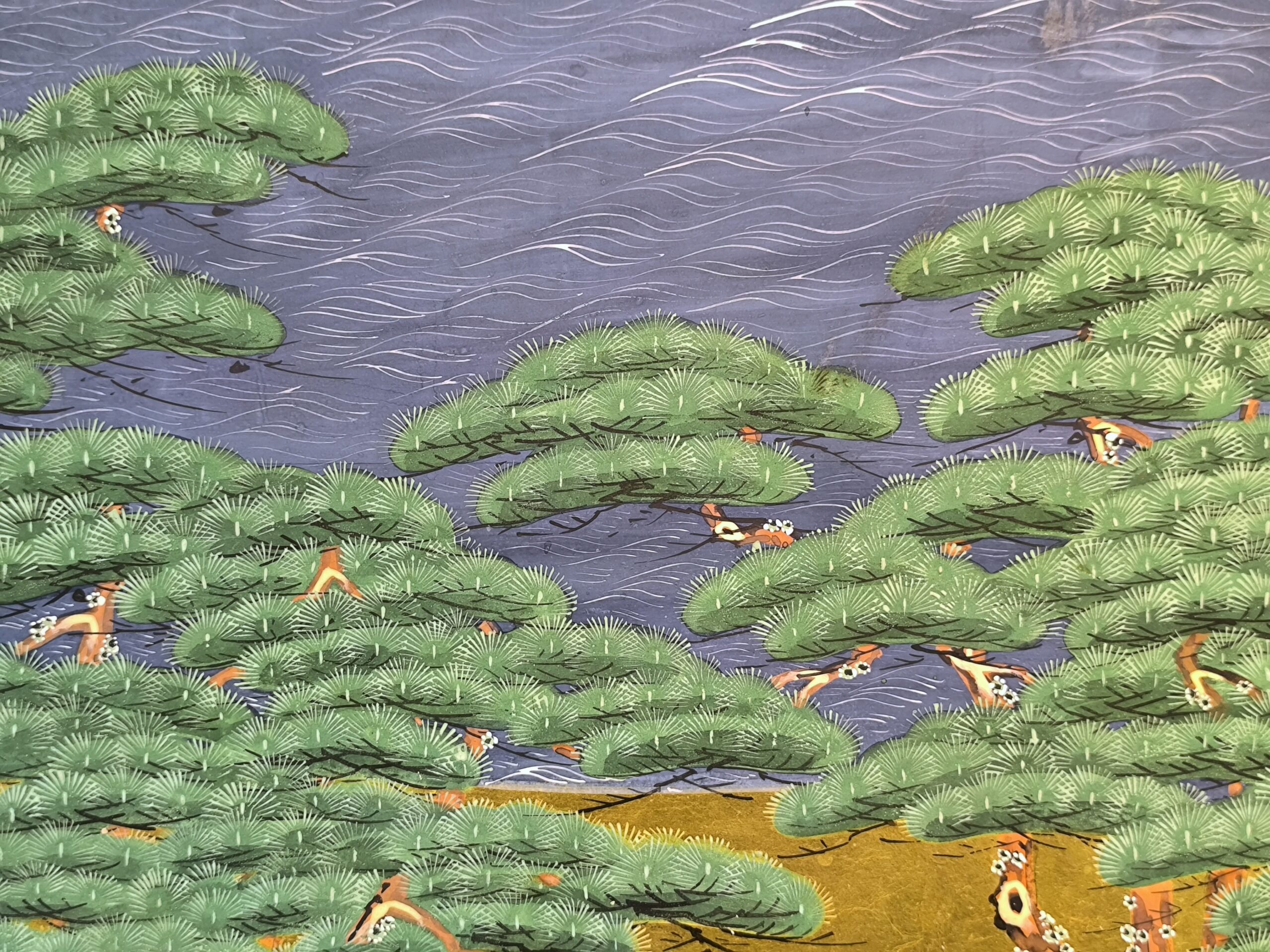 屏風とは複数の板を紙や絹で貼り、蝶番で繋げて折りたためる構造で、2曲・6曲などの形式が多く見られます。用途としては室内の間仕切りや風除け、儀礼や儀式での装飾、美術品としての鑑賞目的で作られました。元々は角度をつけて床に置いていましたが、今ではまっすぐに広げて壁に絵画のように飾られることが多いです。特に金箔地に絵が前面に描かれた物が人気です。時代によって金箔の大きさや色味が違い、使われた岩絵の具や絵の構図などから時代を考察します。