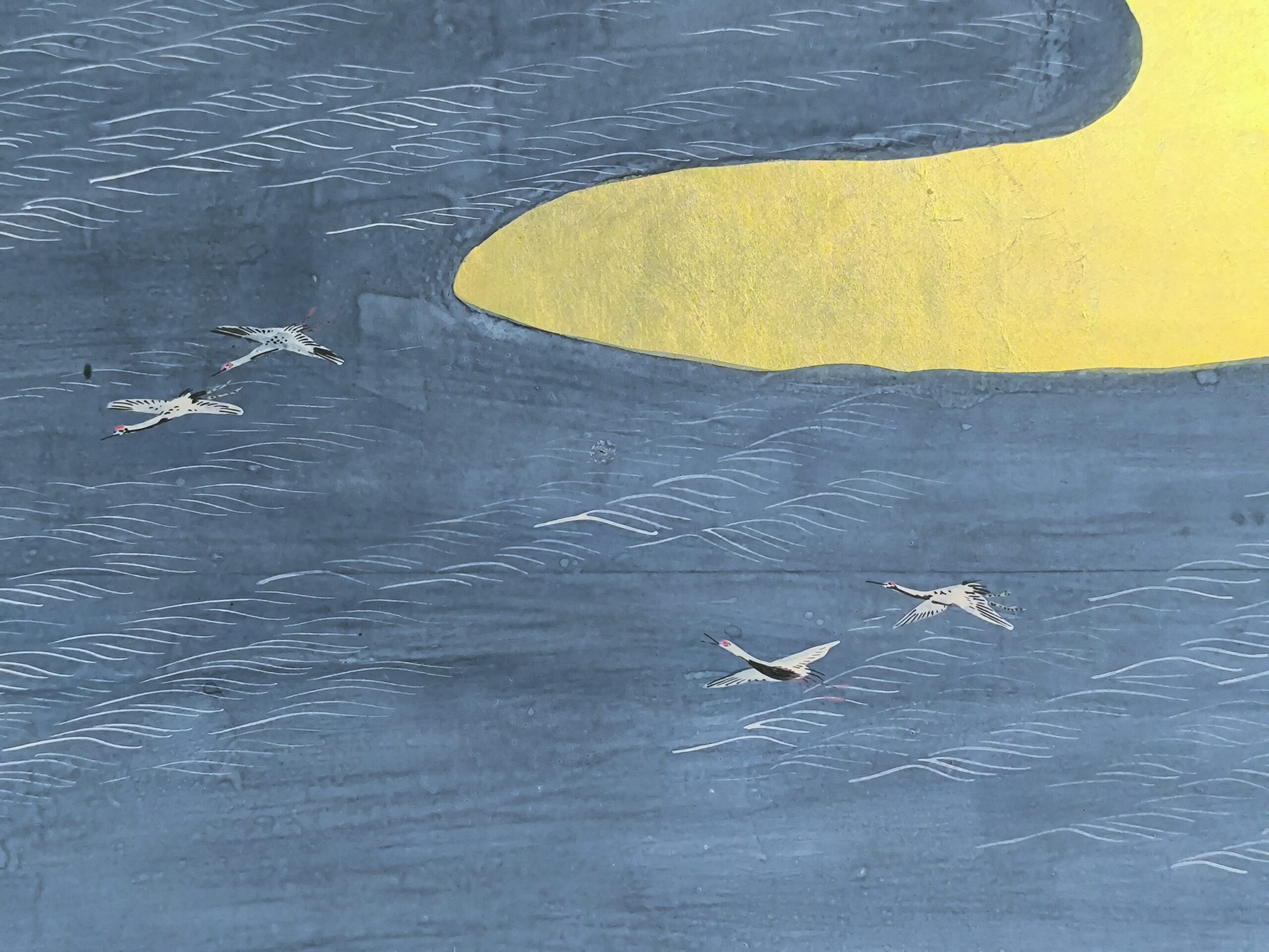 波の動きやしぶきを細かく描き、松葉や鶴も目・足や羽まで細部まで丁寧に描いています。