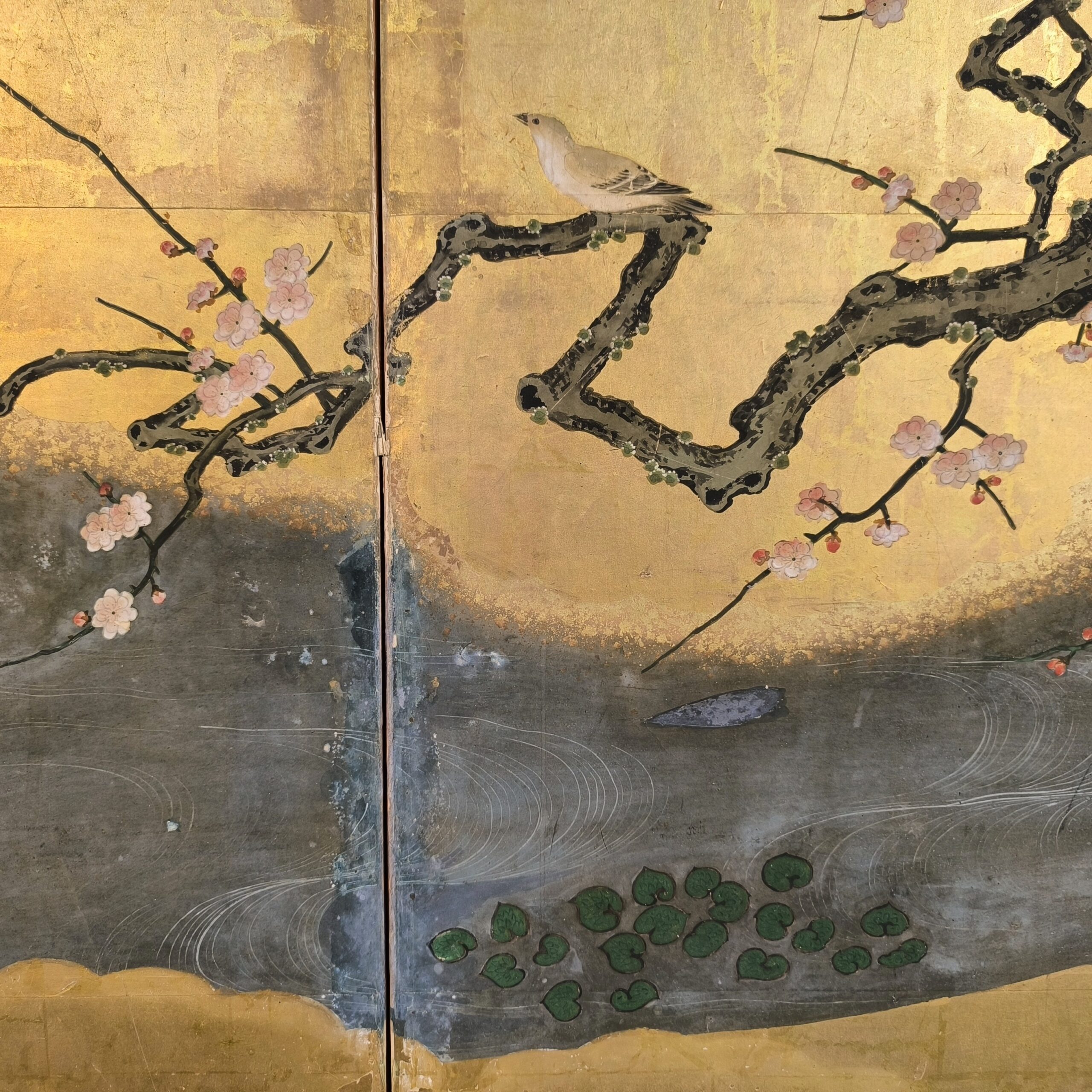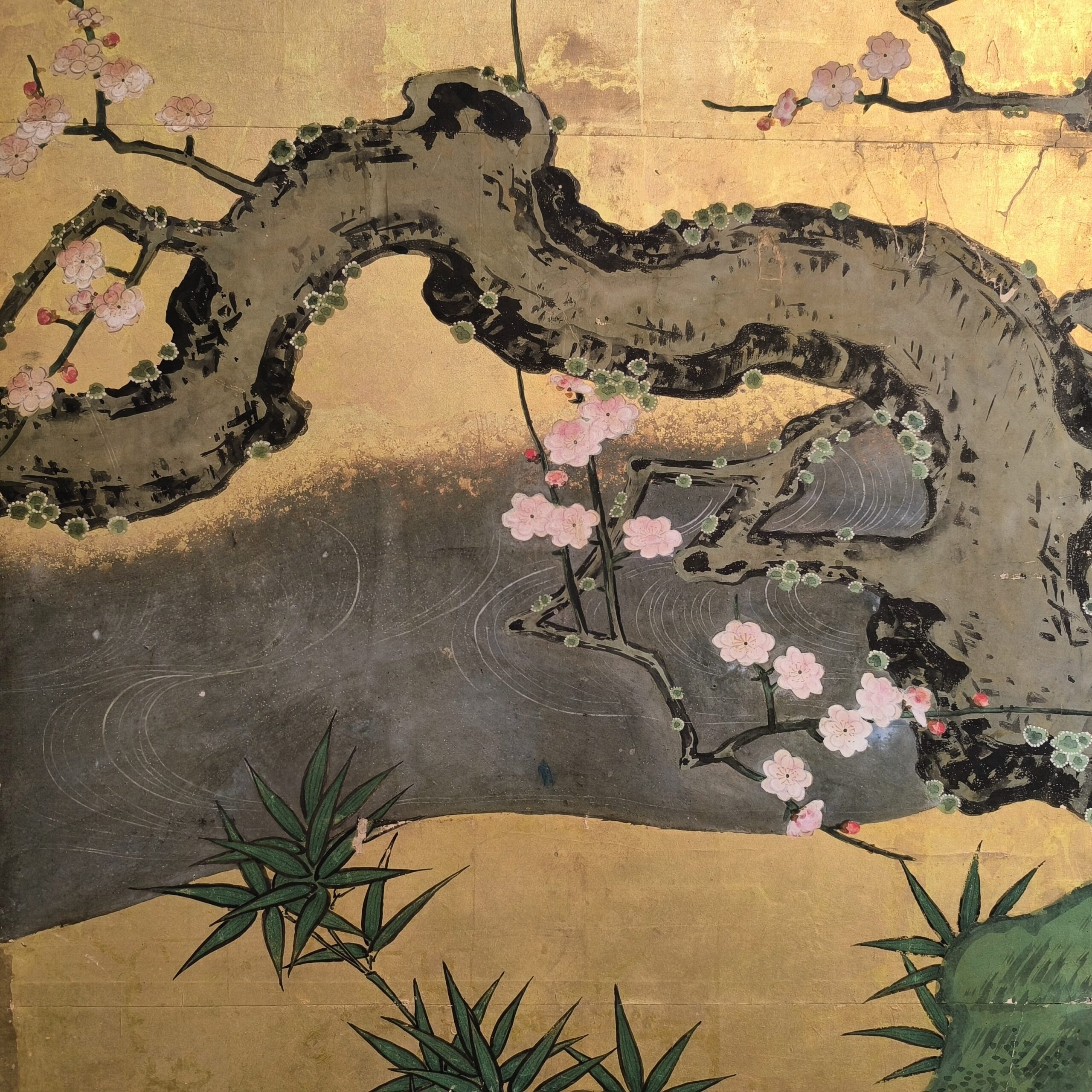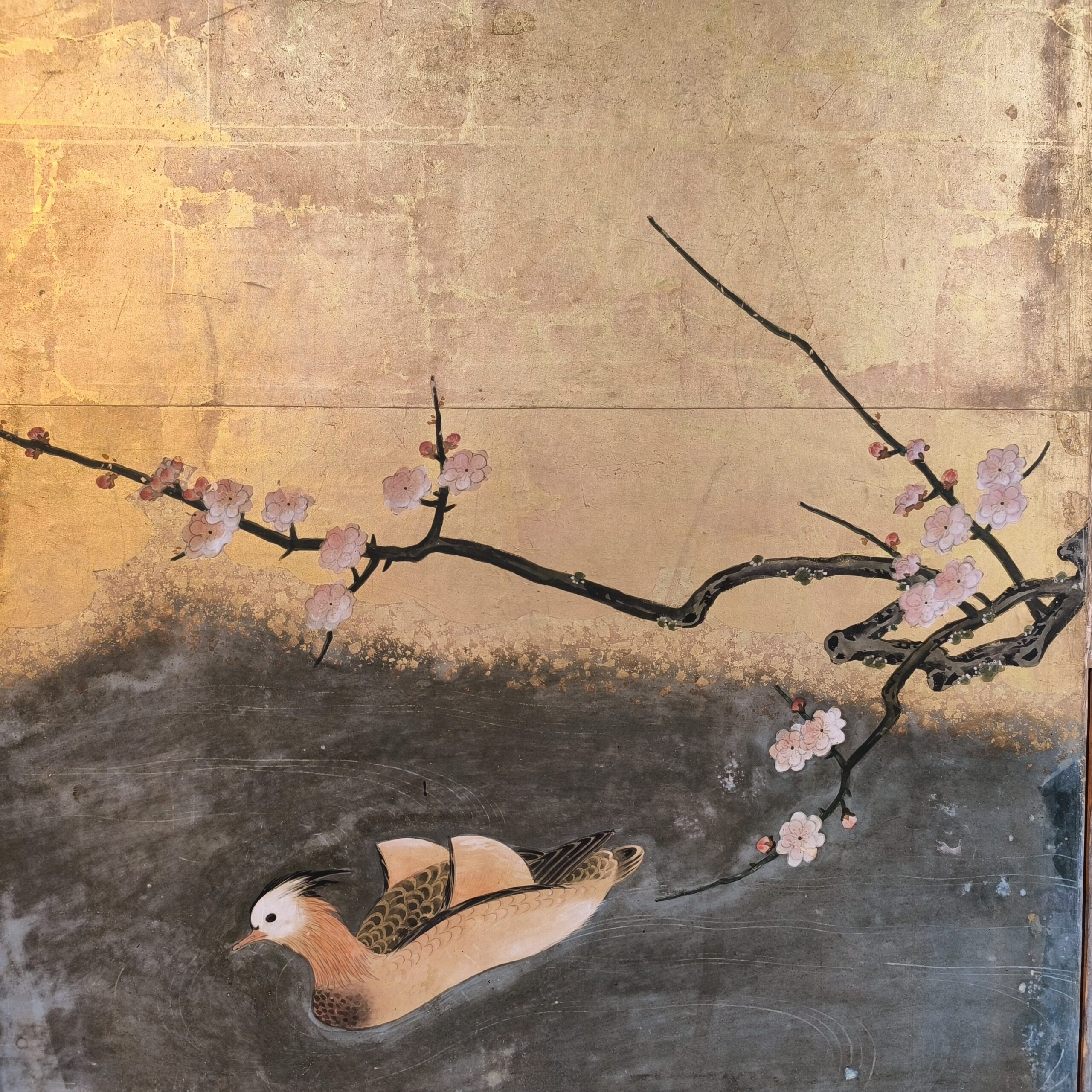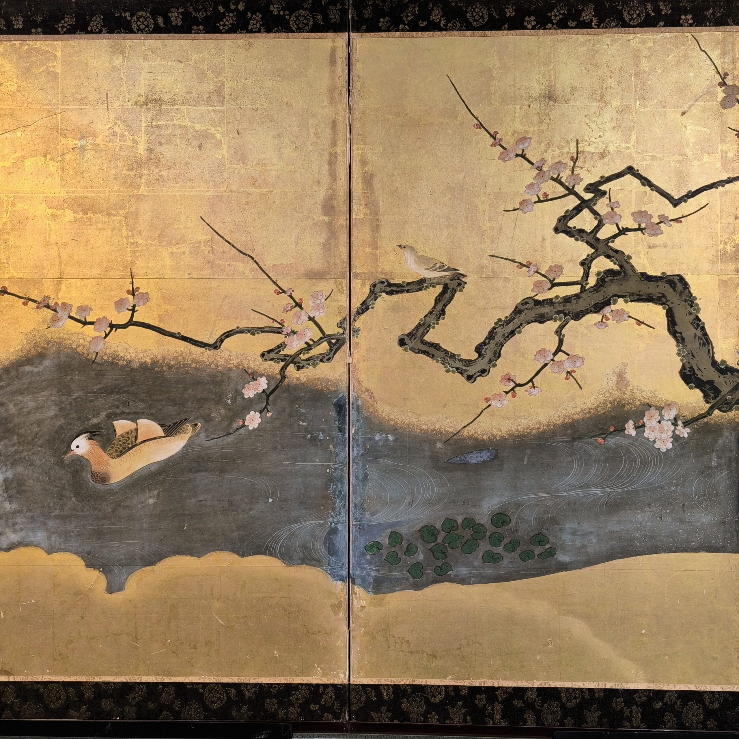 シンプルな構図で梅の木に鶯、土坡と川に鴛鴦、菖蒲が描かれています。