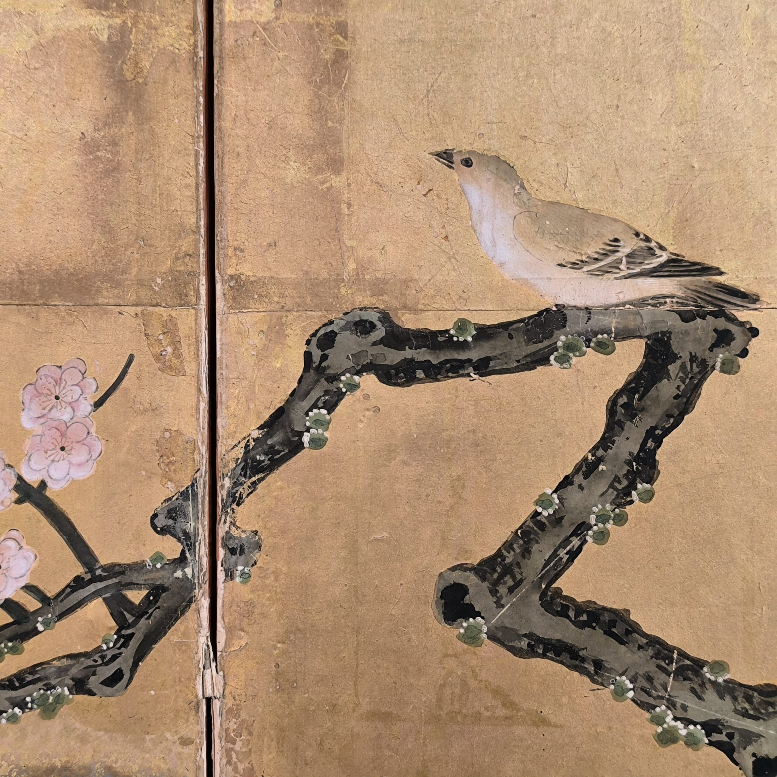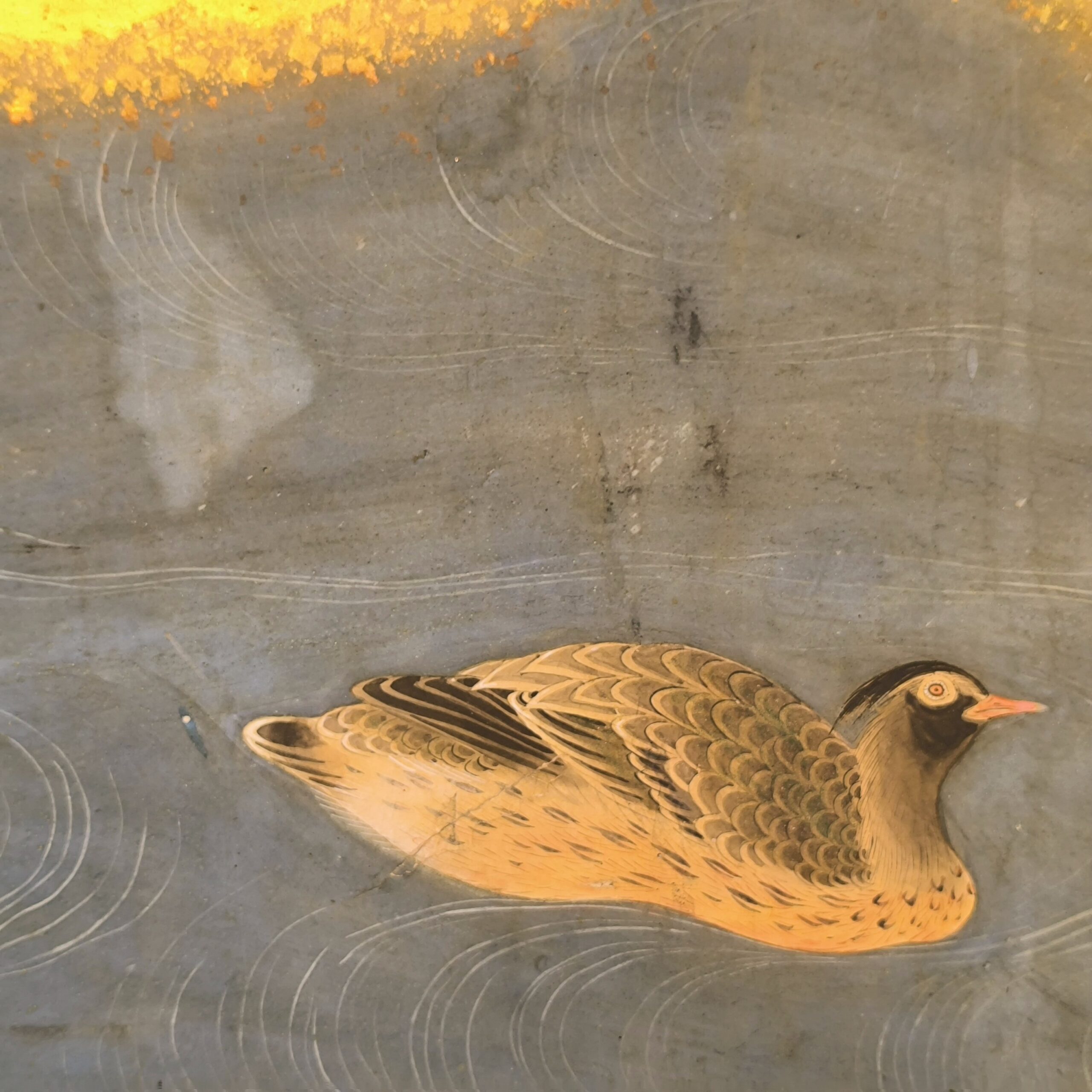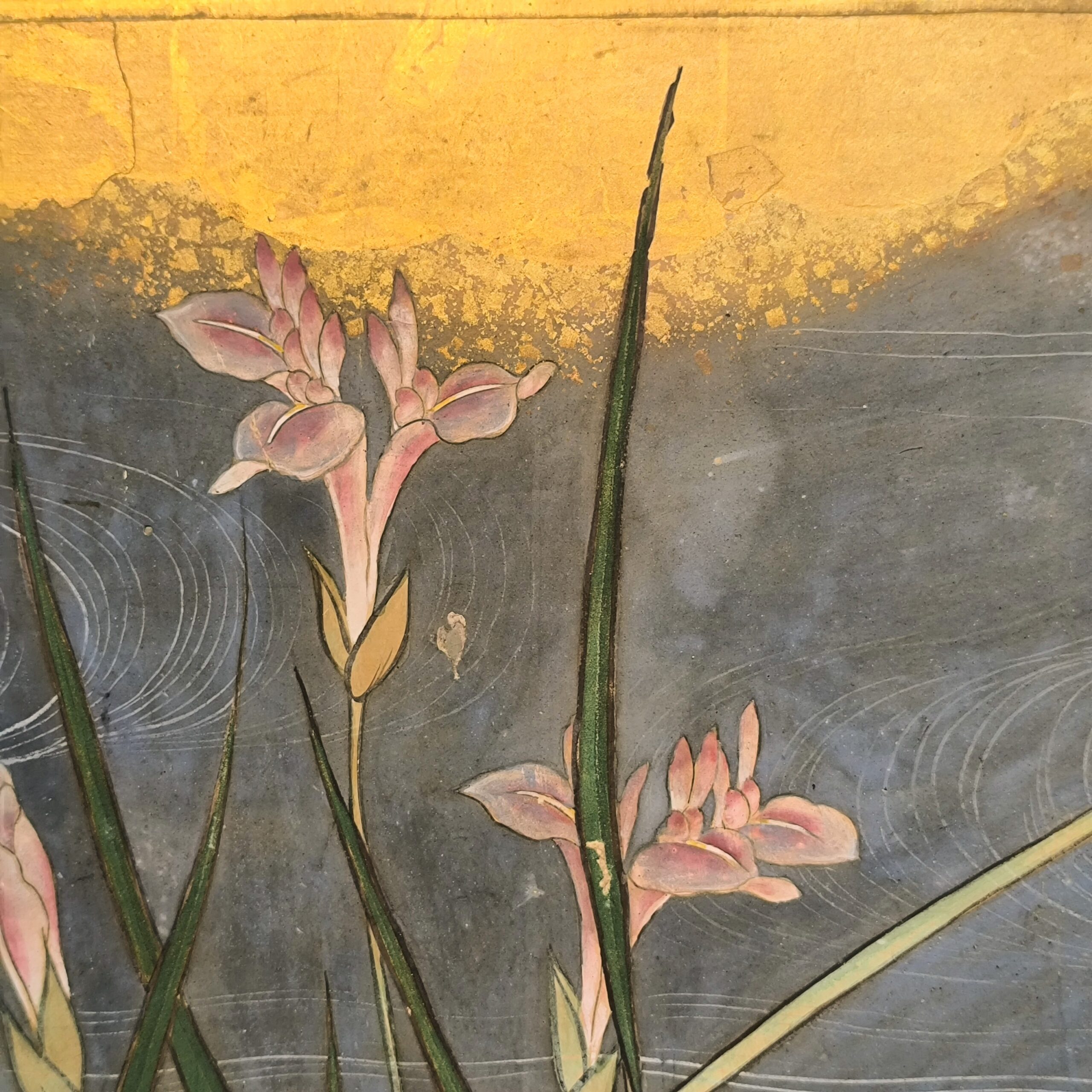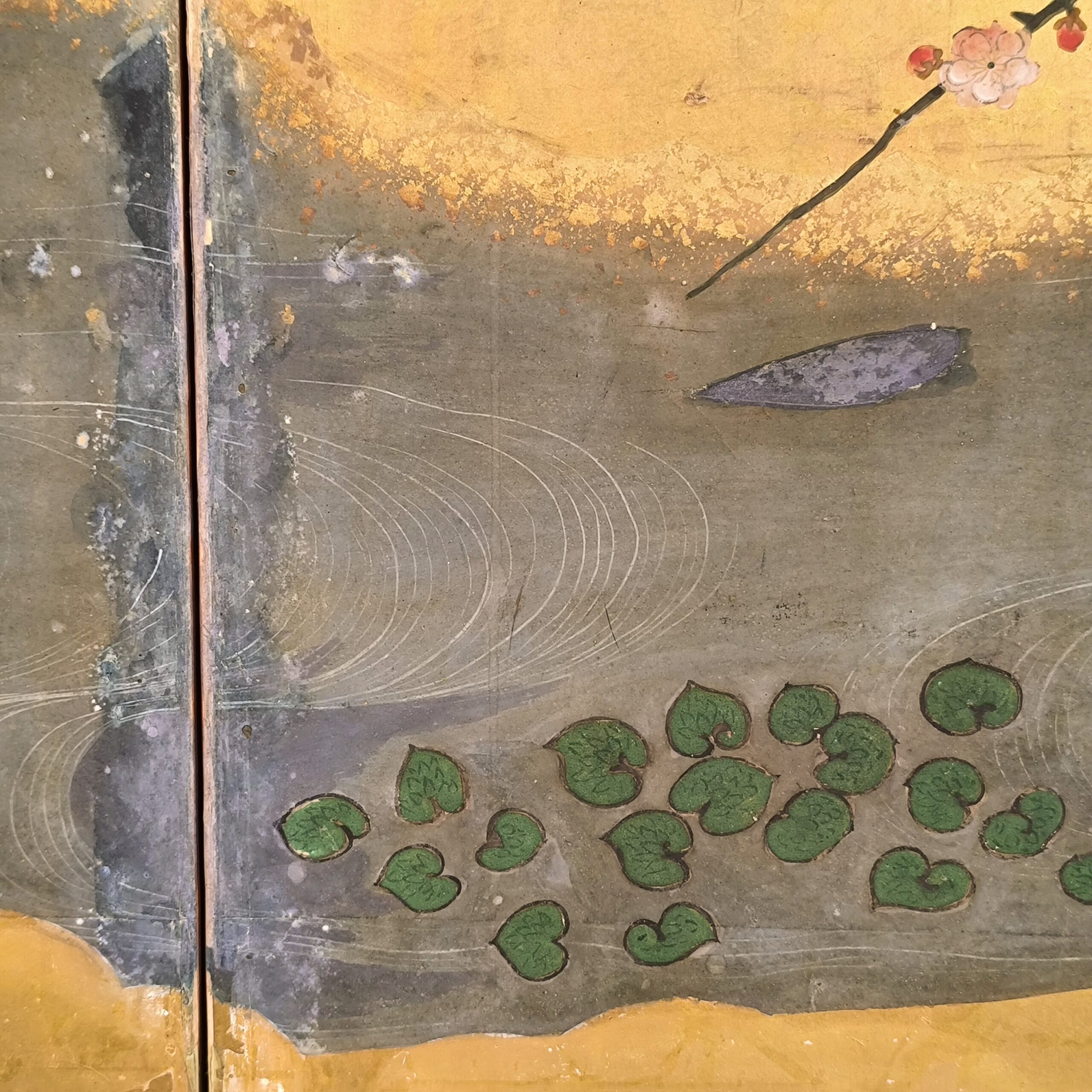 シンプルな構図で梅の木に鶯、土坡と川に鴛鴦、菖蒲が描かれています。