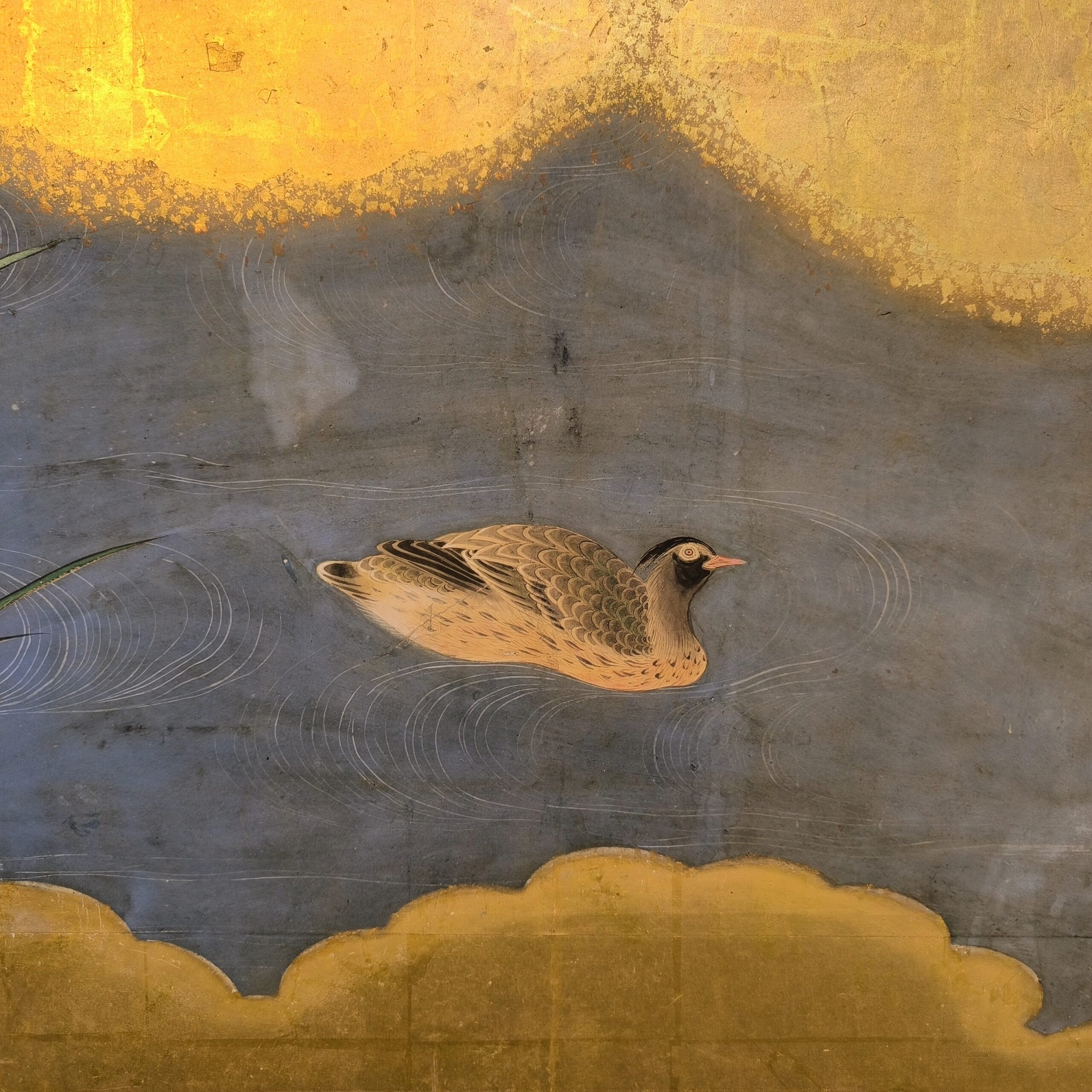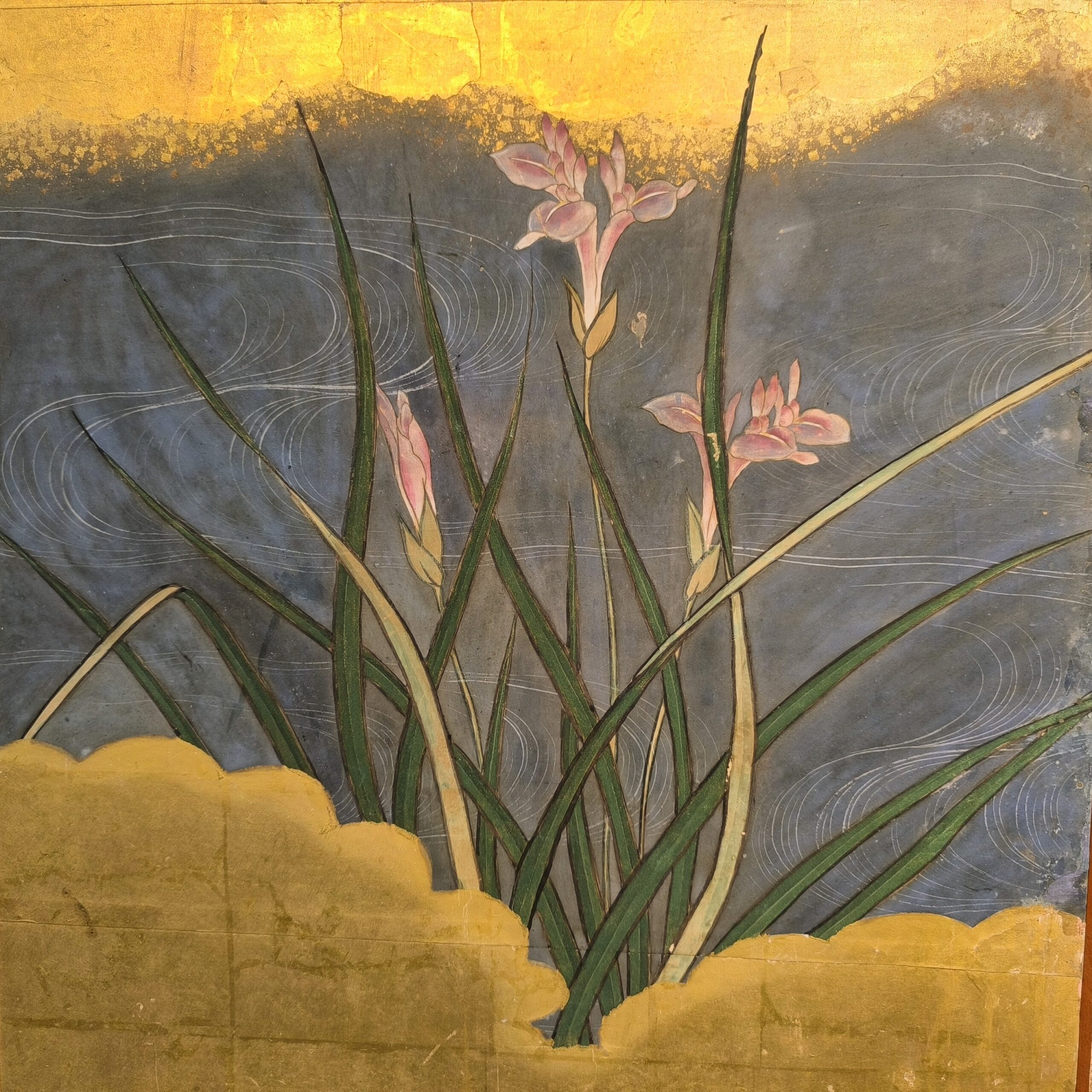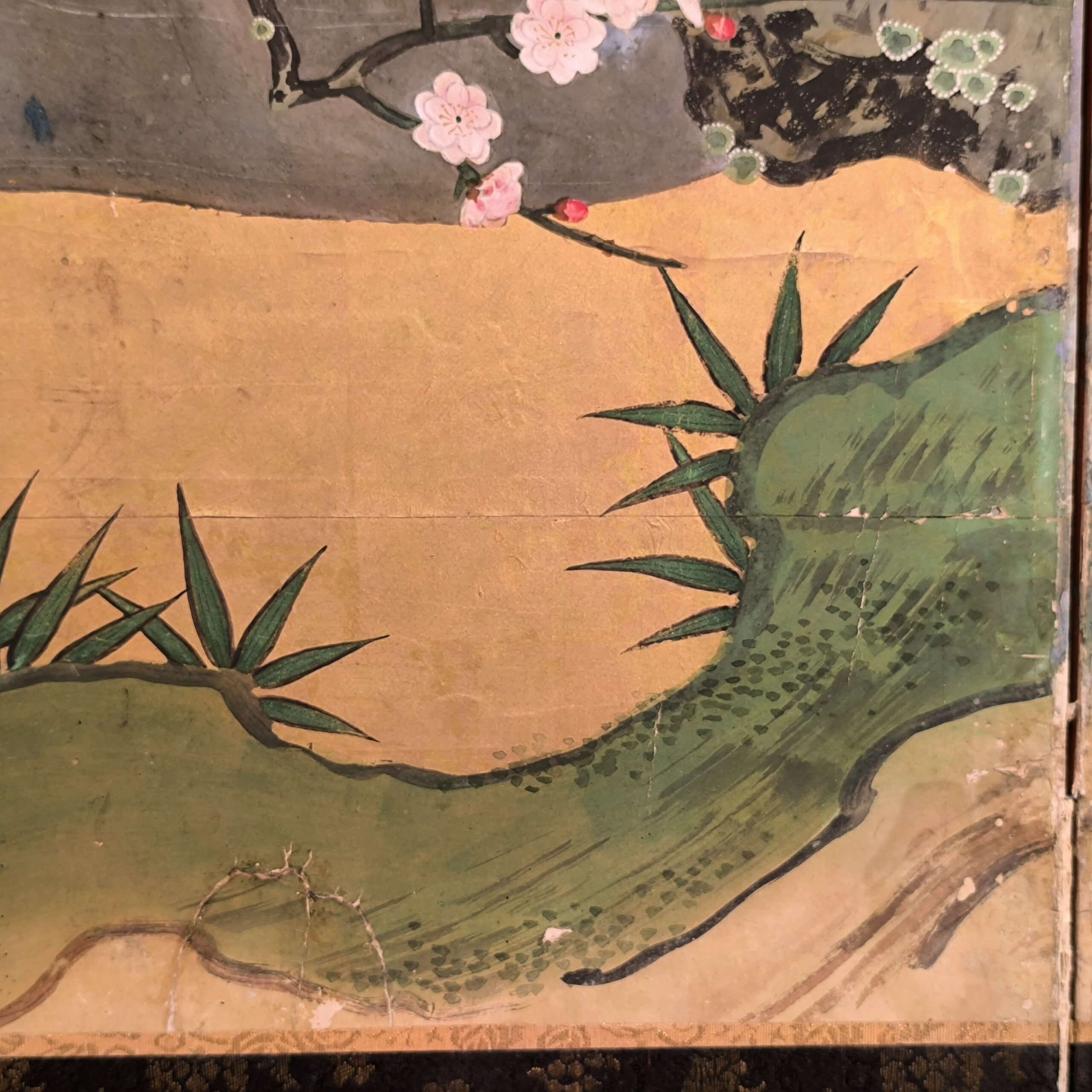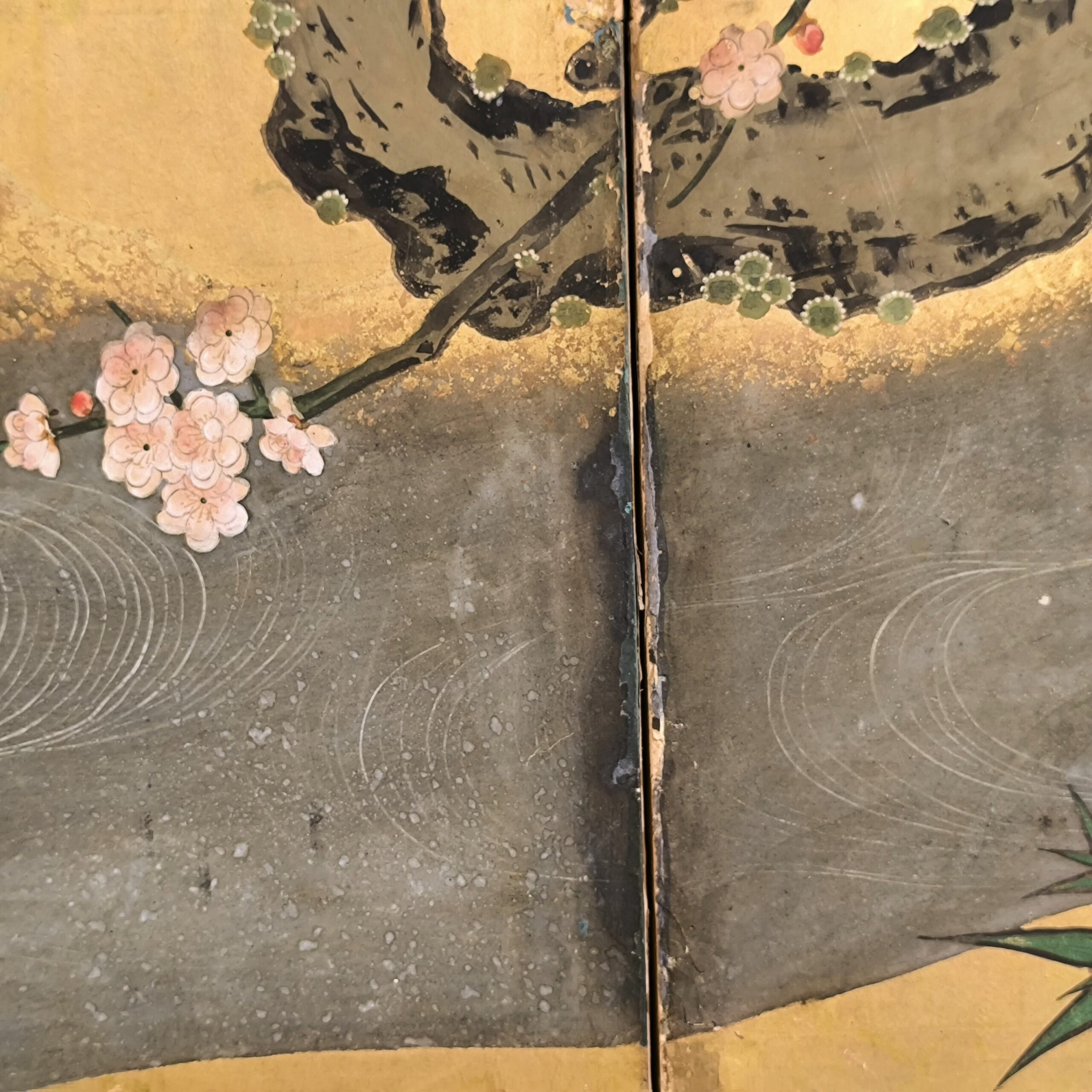 屏風とは複数の板を紙や絹で貼り、蝶番で繋げて折りたためる構造で、2曲・6曲などの形式が多く見られます。用途としては室内の間仕切りや風除け、儀礼や儀式での装飾、美術品としての鑑賞目的で作られました。元々は角度をつけて床に置いていましたが、今ではまっすぐに広げて壁に絵画のように飾られることが多いです。特に金箔地に絵が前面に描かれた物が人気です。時代によって金箔の大きさや色味が違い、使われた岩絵の具や絵の構図などから時代を考察します。