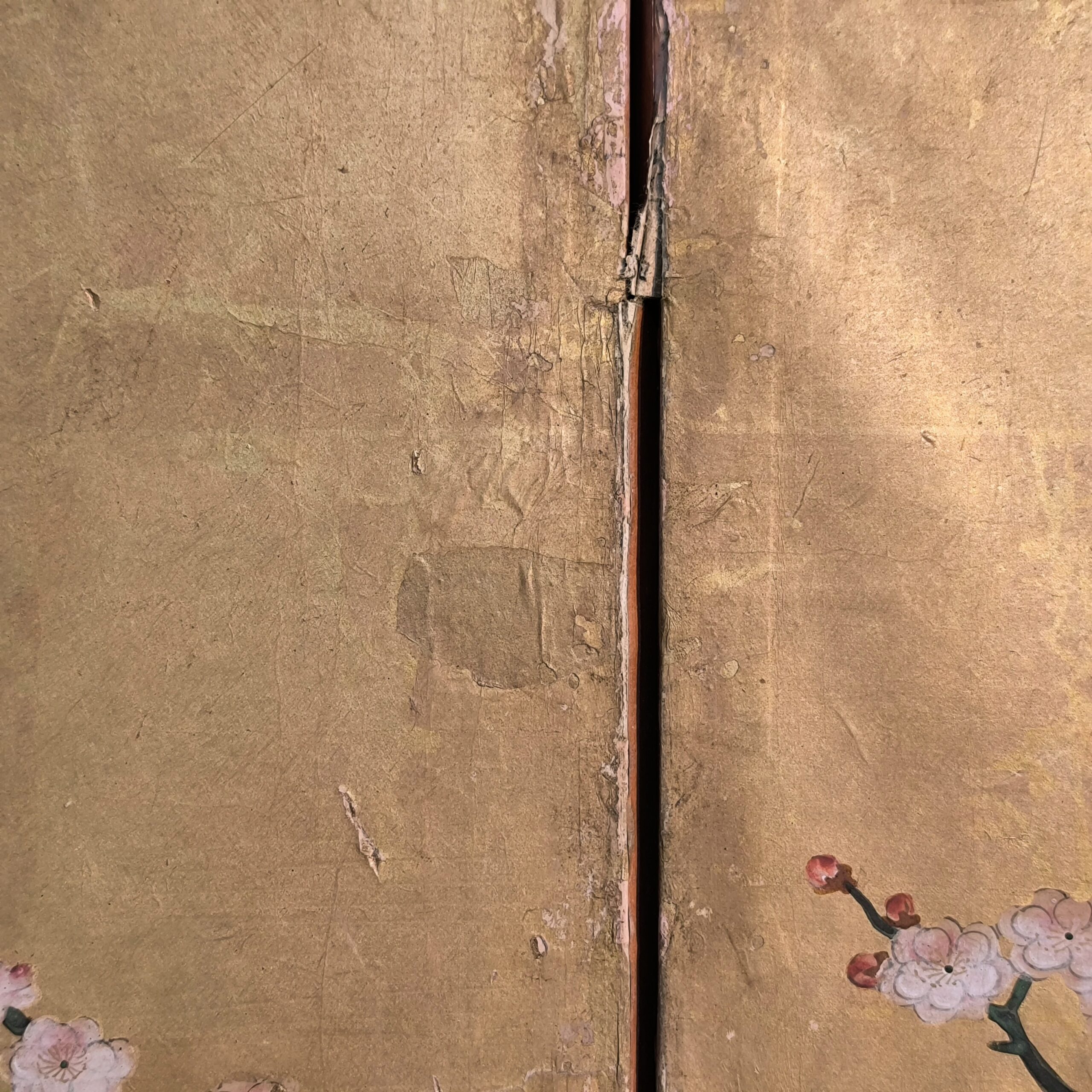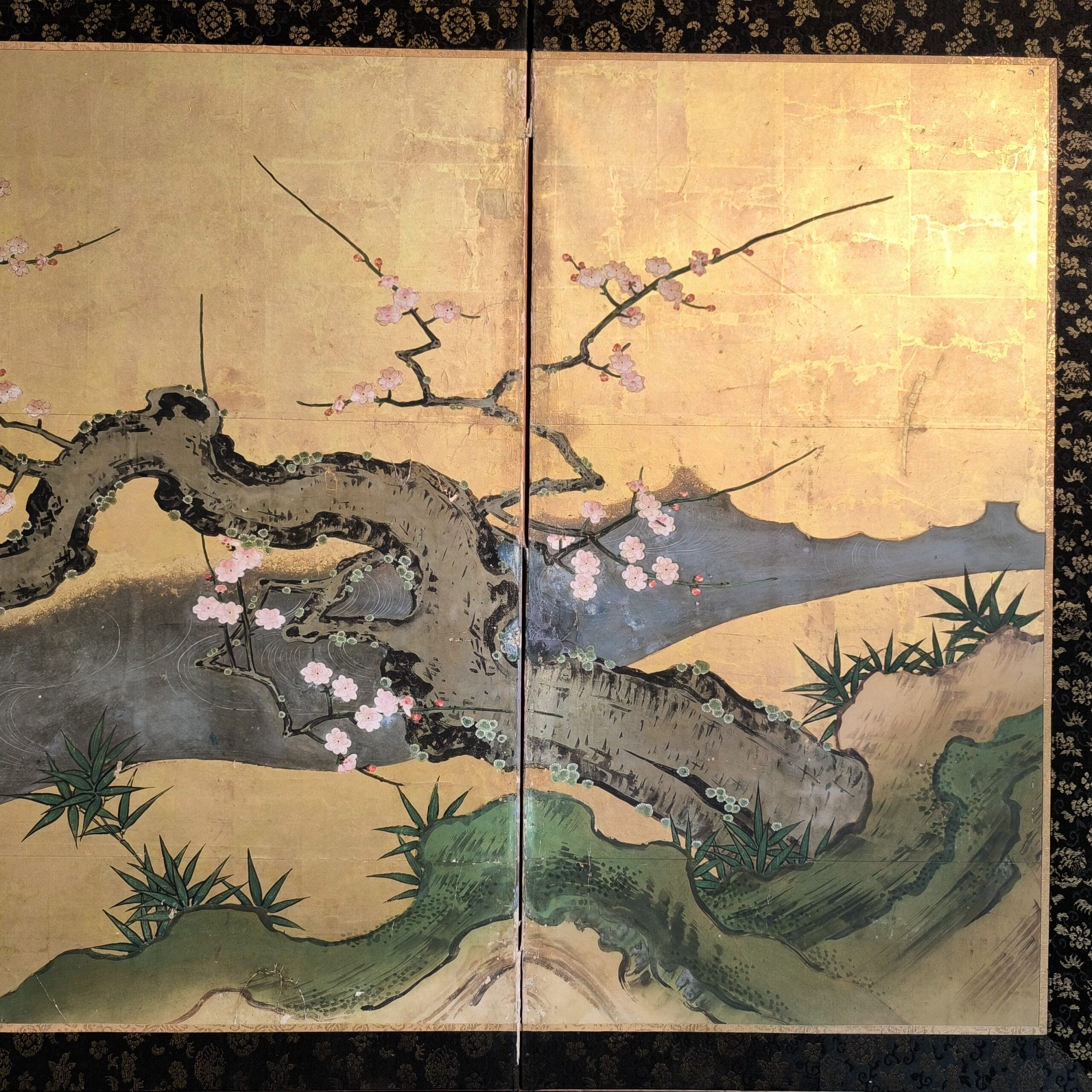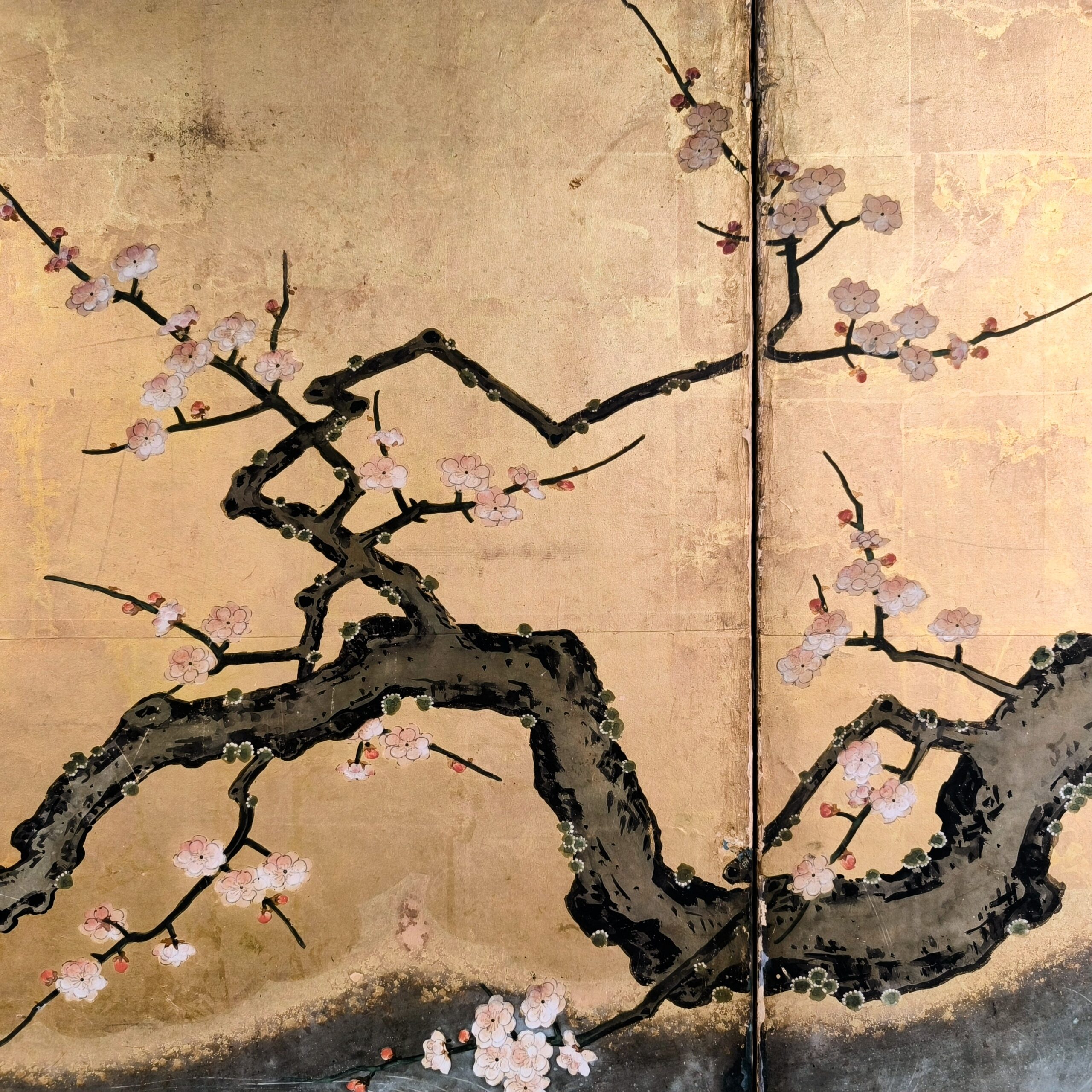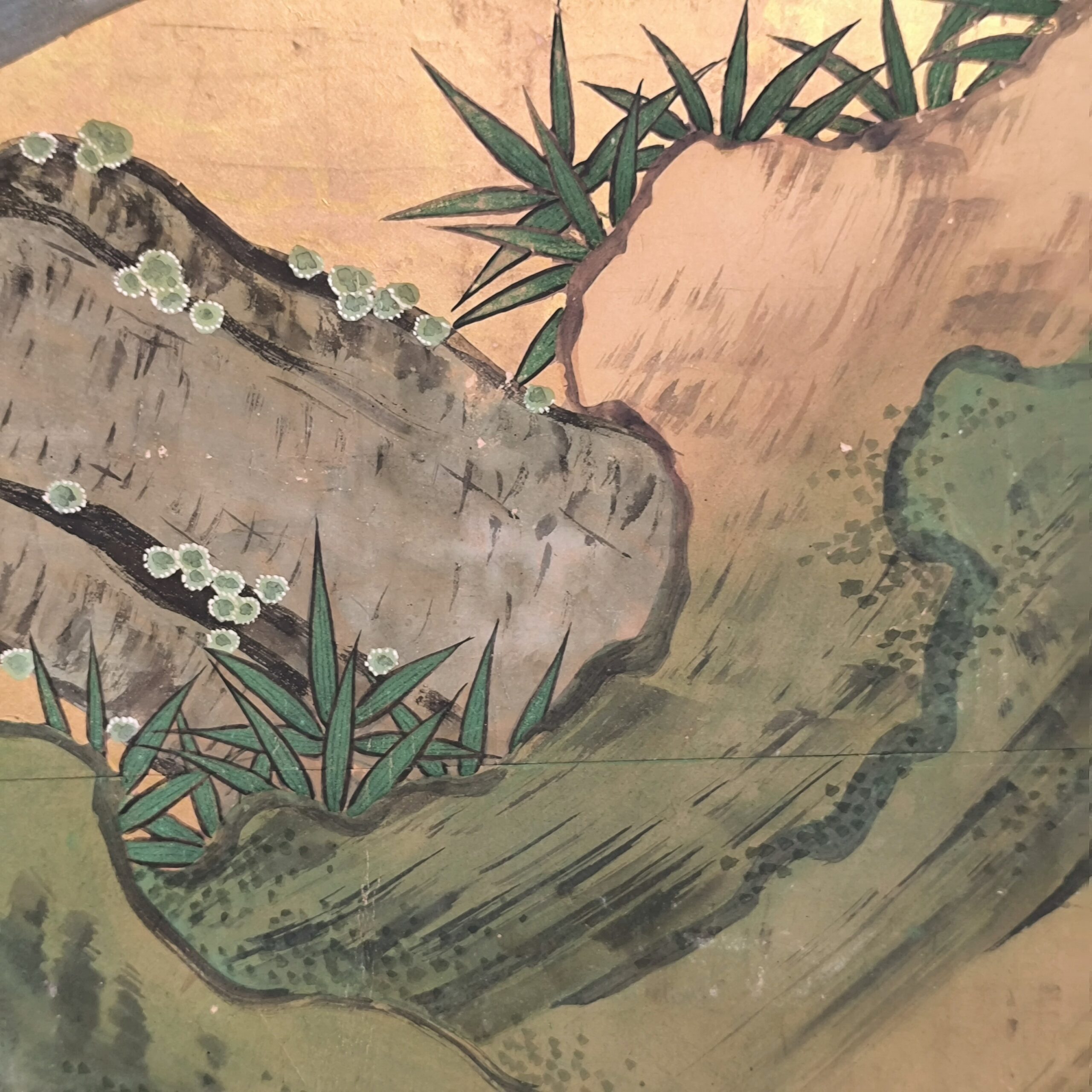 屏風とは複数の板を紙や絹で貼り、蝶番で繋げて折りたためる構造で、2曲・6曲などの形式が多く見られます。用途としては室内の間仕切りや風除け、儀礼や儀式での装飾、美術品としての鑑賞目的で作られました。元々は角度をつけて床に置いていましたが、今ではまっすぐに広げて壁に絵画のように飾られることが多いです。特に金箔地に絵が前面に描かれた物が人気です。時代によって金箔の大きさや色味が違い、使われた岩絵の具や絵の構図などから時代を考察します。