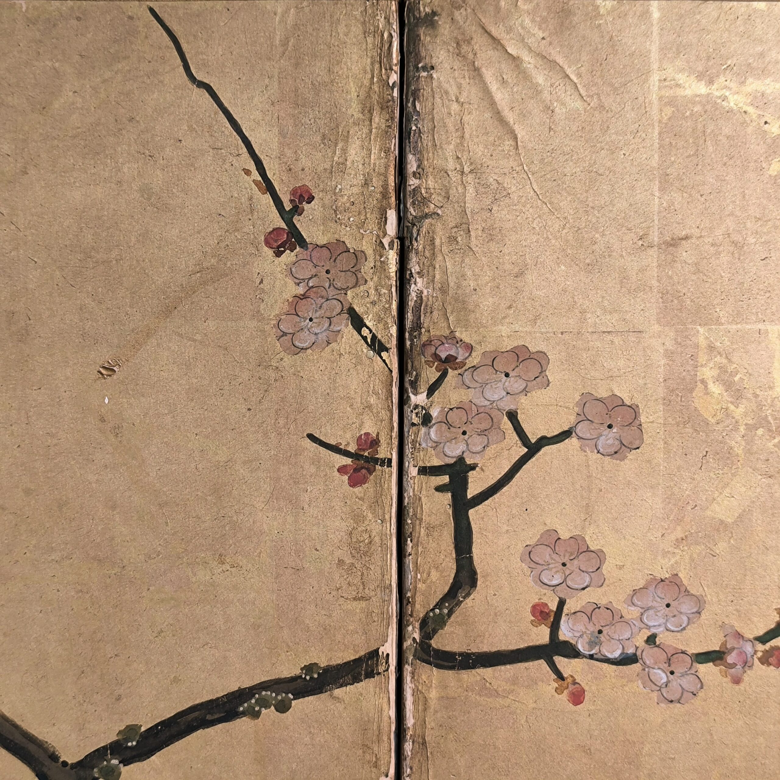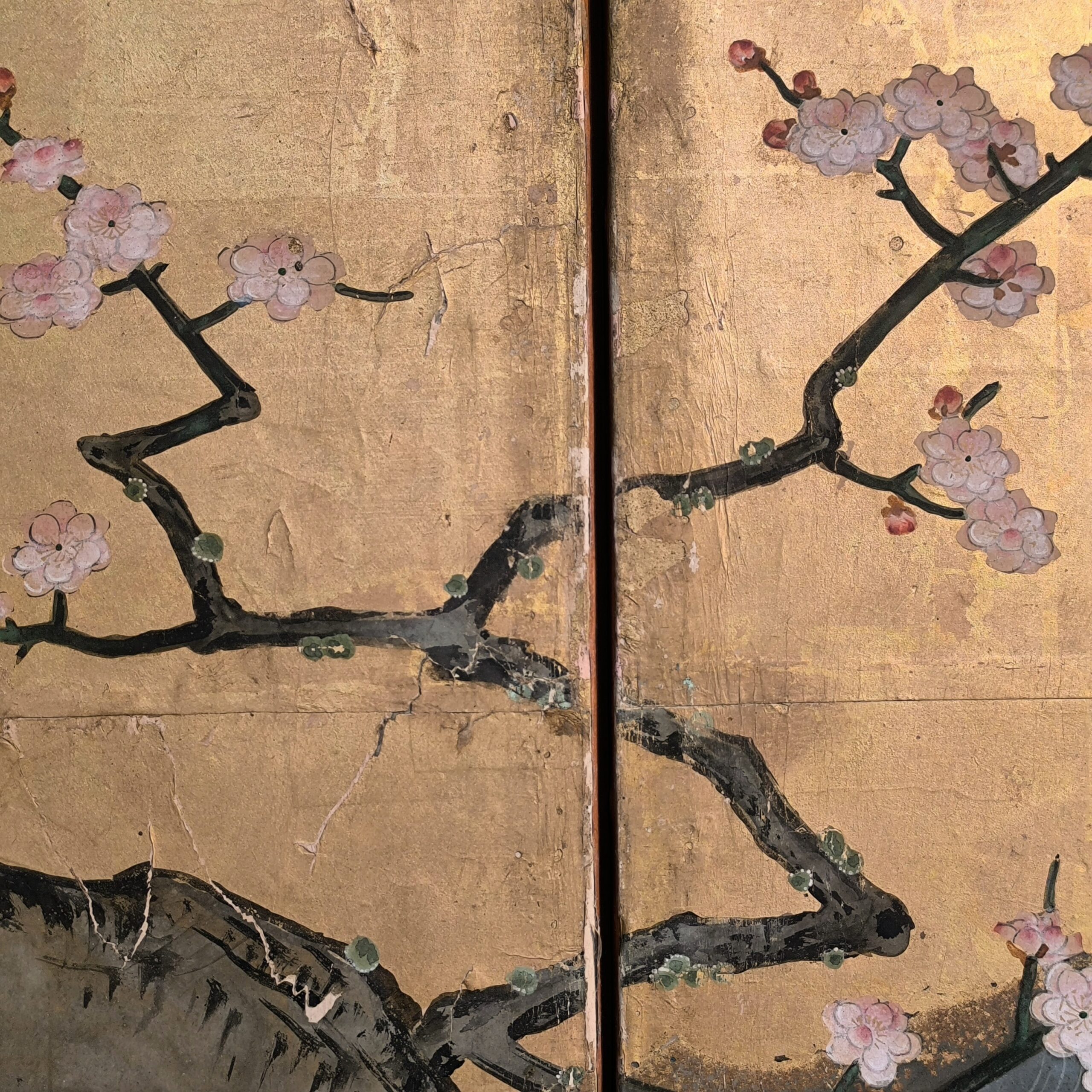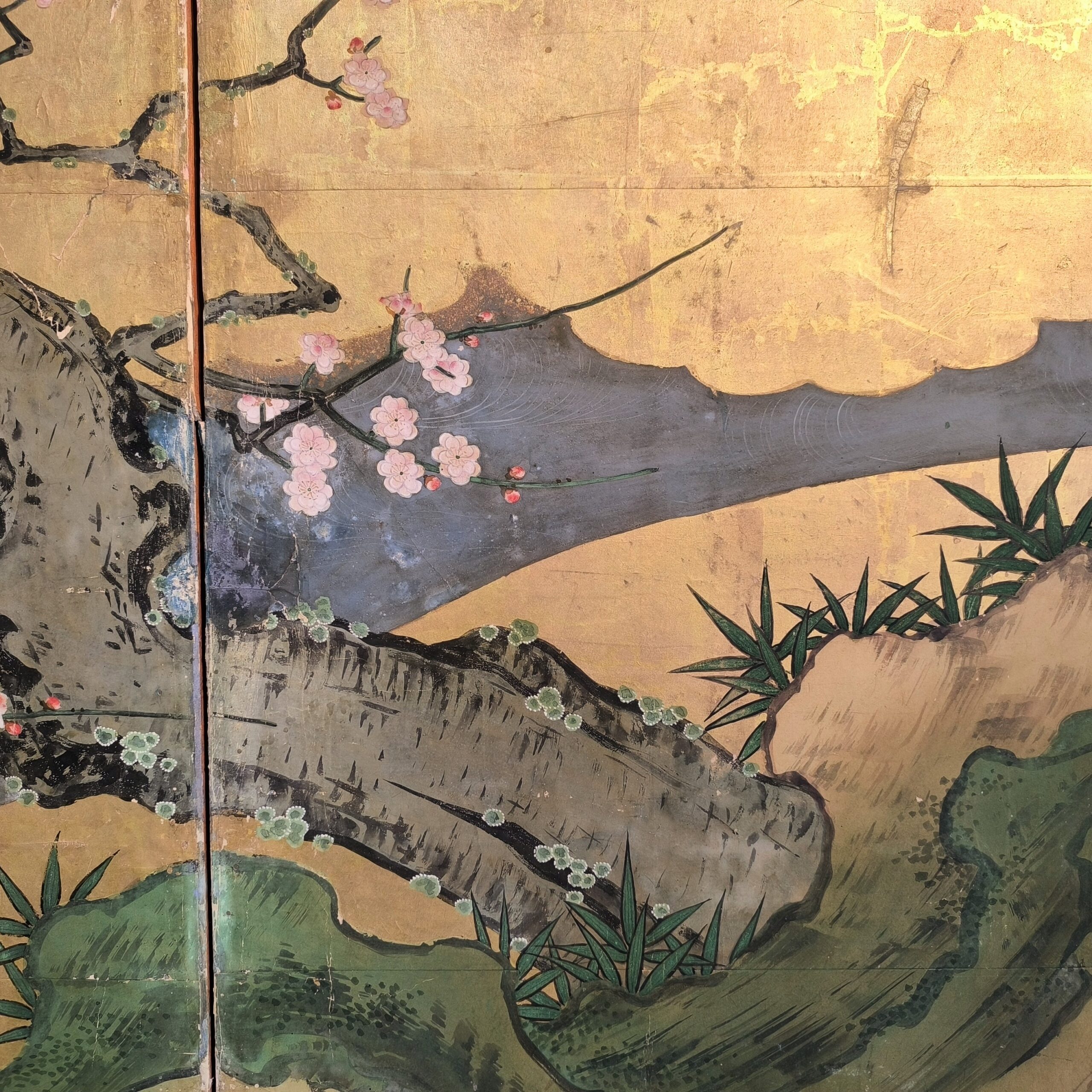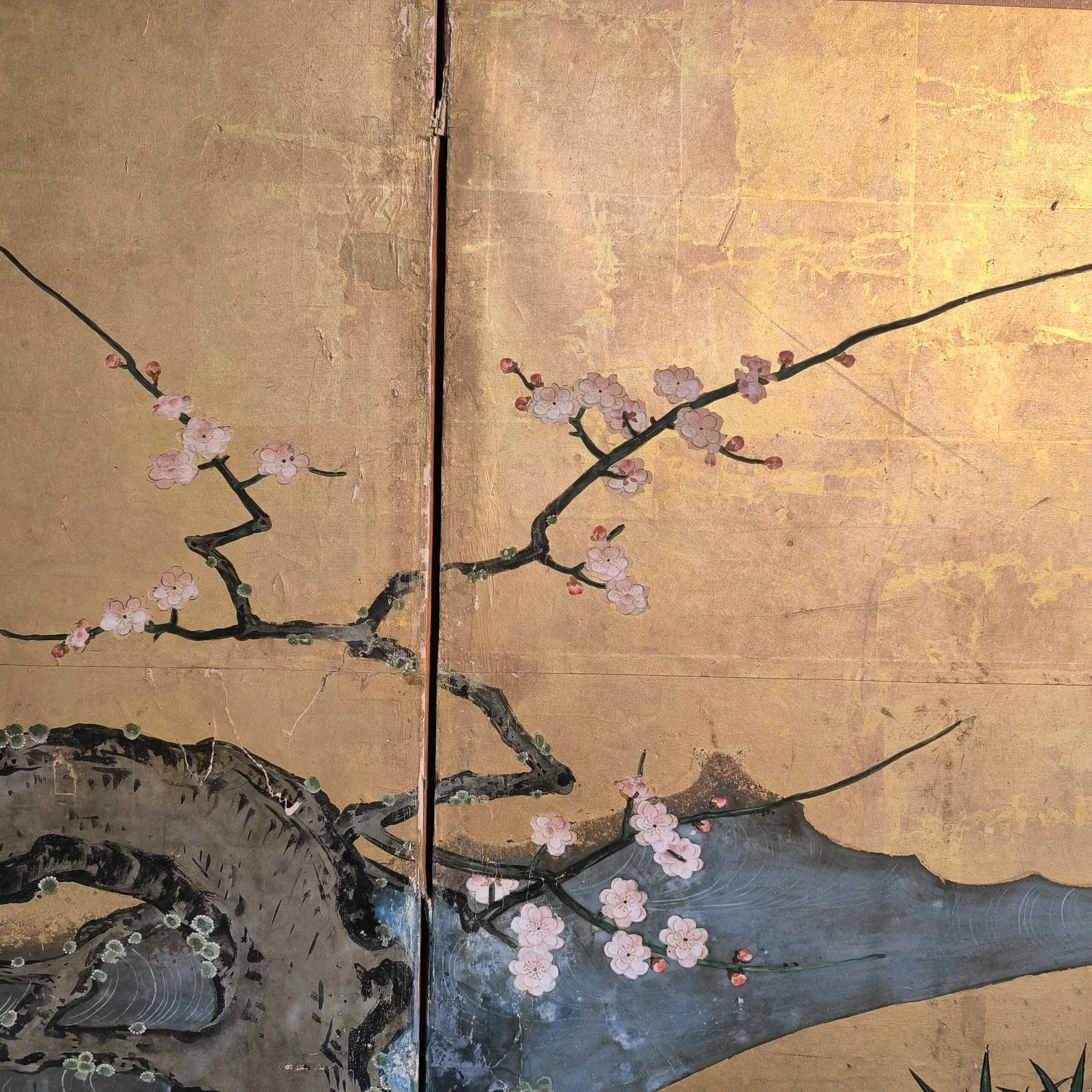 屏風とは複数の板を紙や絹で貼り、蝶番で繋げて折りたためる構造で、2曲・6曲などの形式が多く見られます。用途としては室内の間仕切りや風除け、儀礼や儀式での装飾、美術品としての鑑賞目的で作られました。元々は角度をつけて床に置いていましたが、今ではまっすぐに広げて壁に絵画のように飾られることが多いです。特に金箔地に絵が前面に描かれた物が人気です。時代によって金箔の大きさや色味が違い、使われた岩絵の具や絵の構図などから時代を考察します。