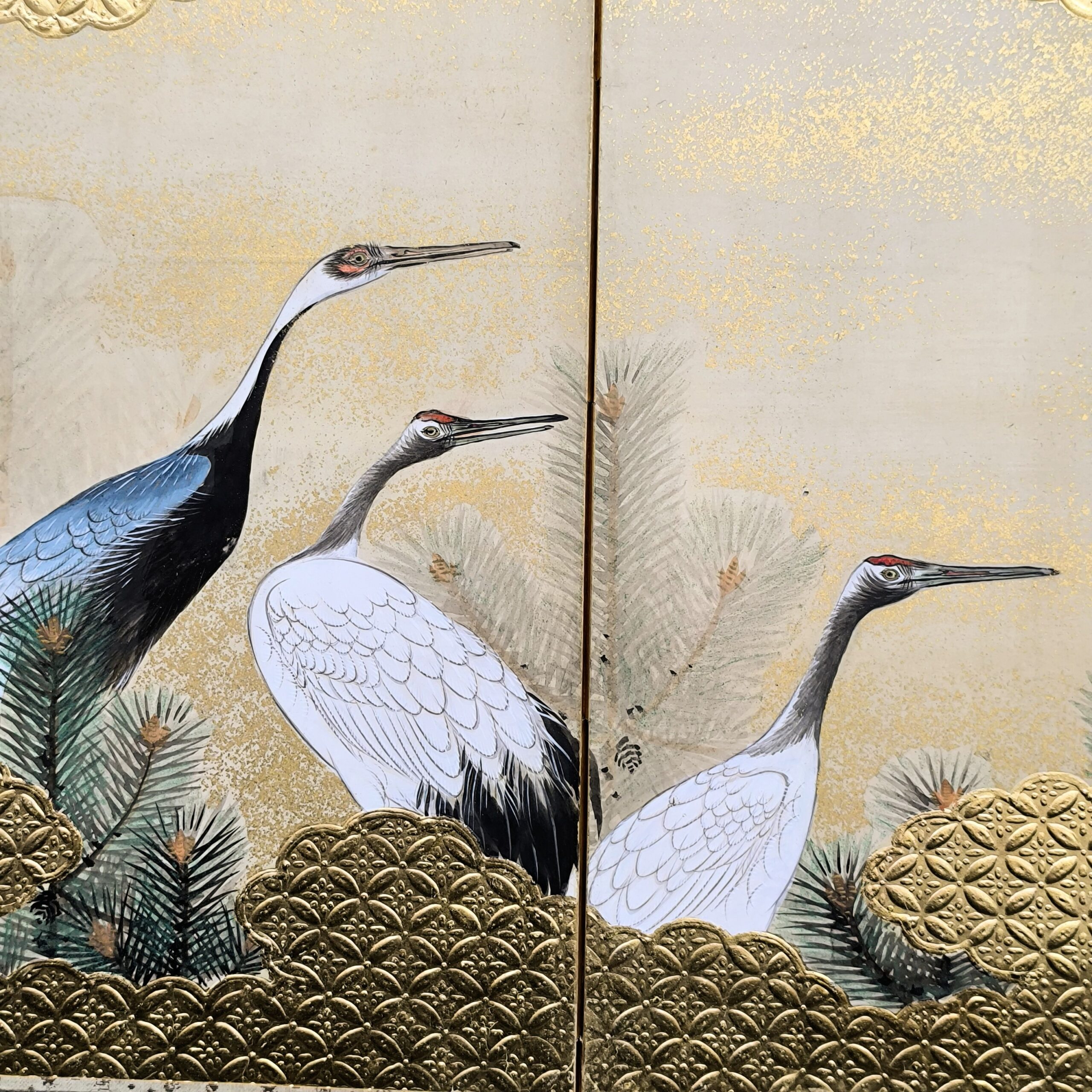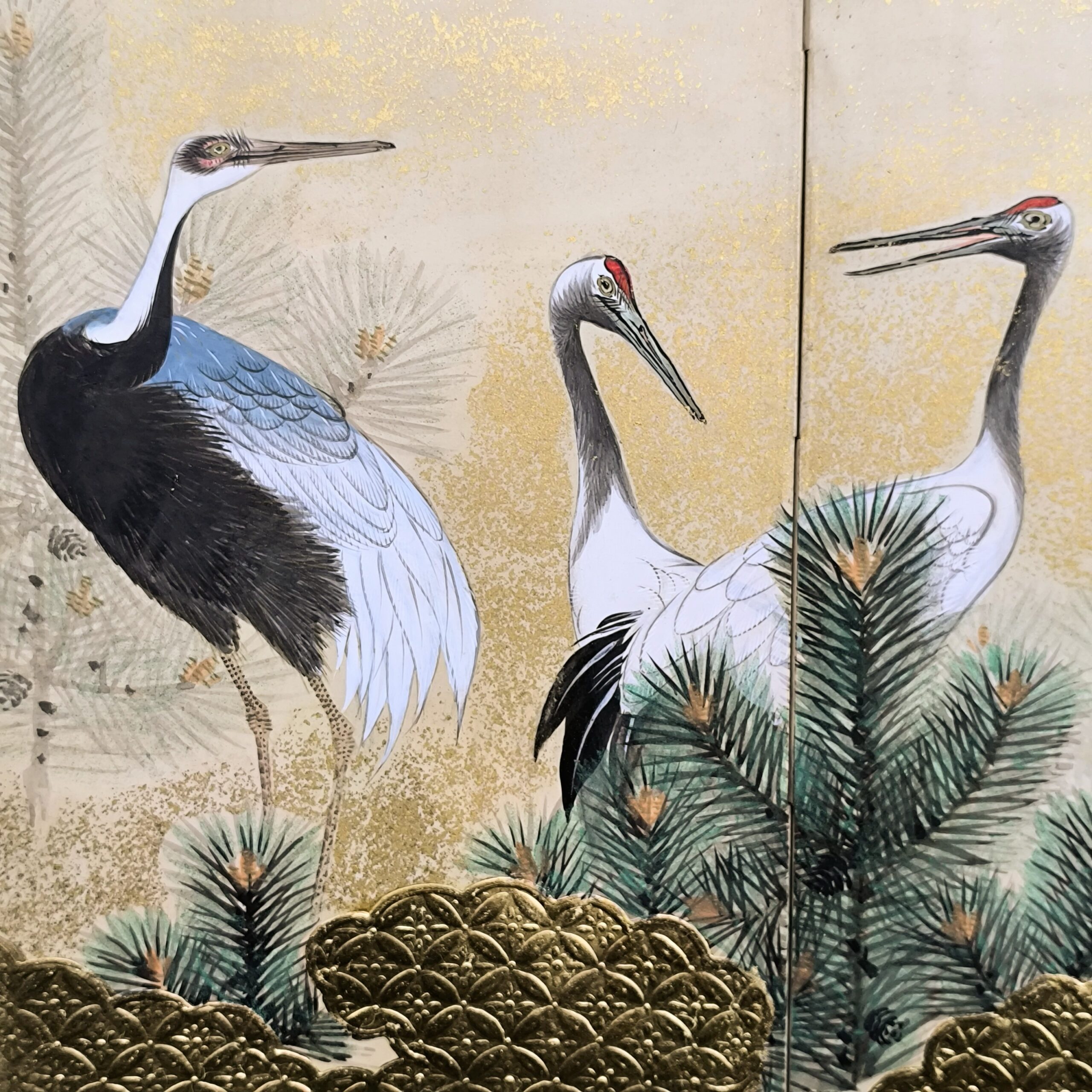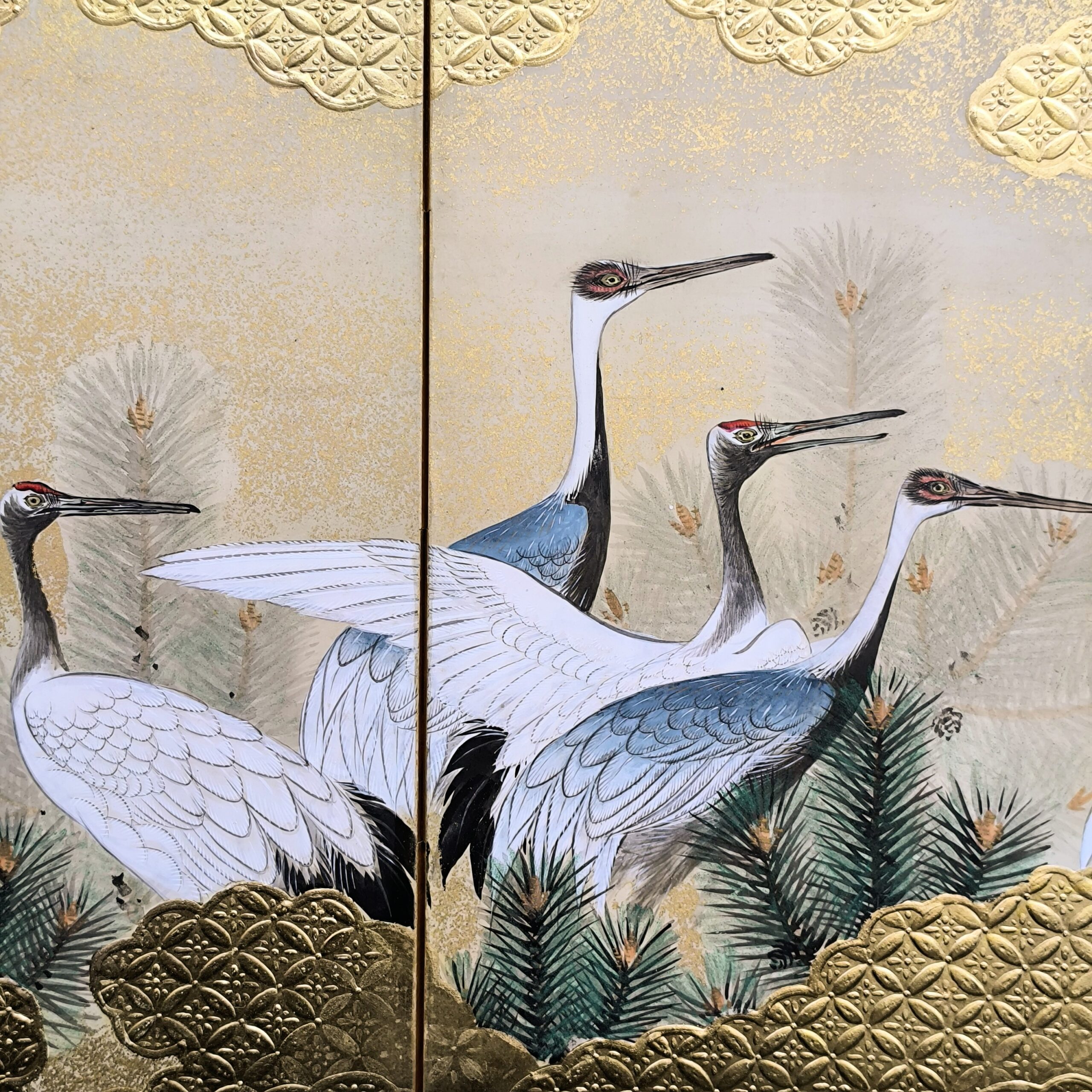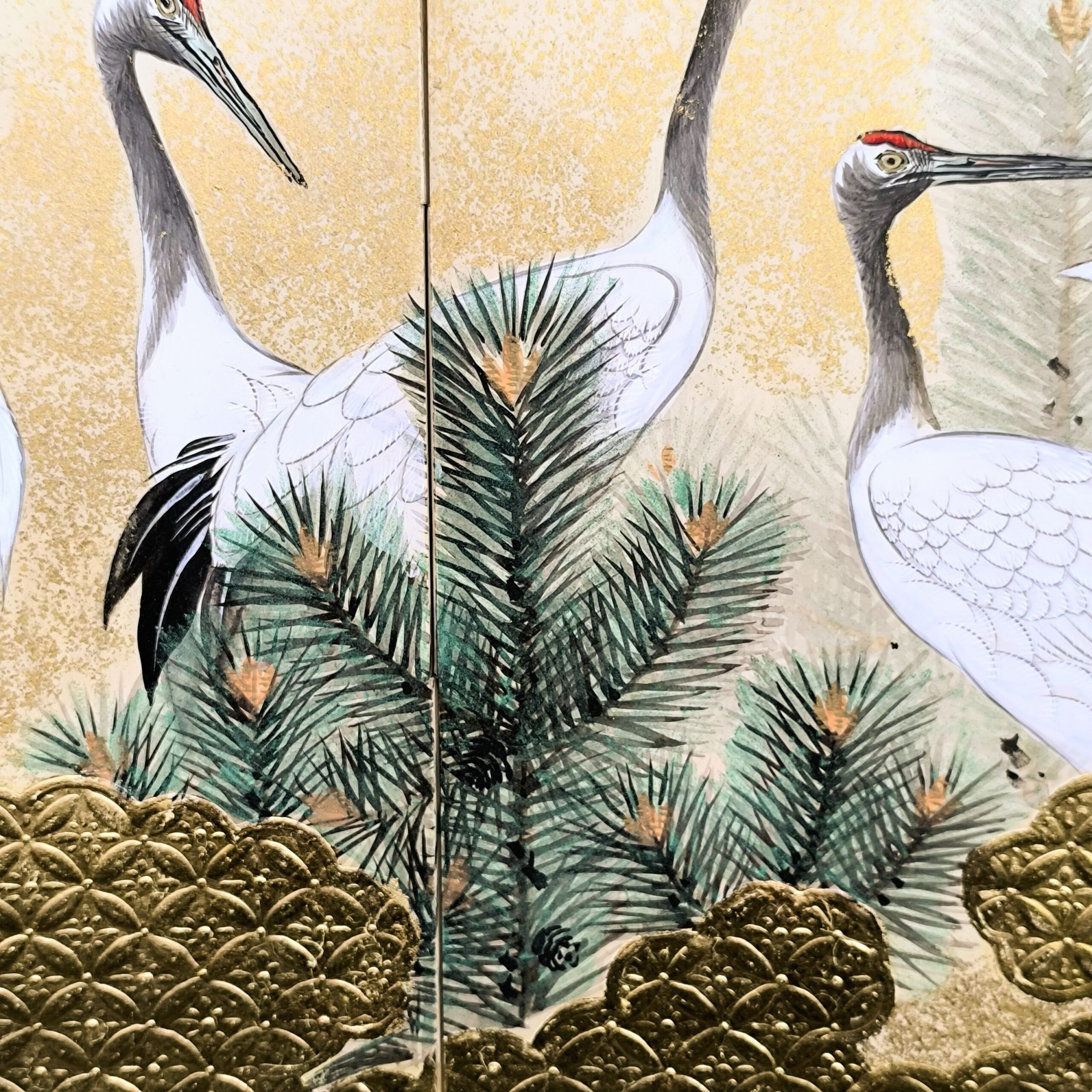 鶴の顔や羽などの描写は細かい部分まで描かれ、砂子がまかれたりと非常に凝っていて特別に注文を受けて制作された屏風かと思います。
