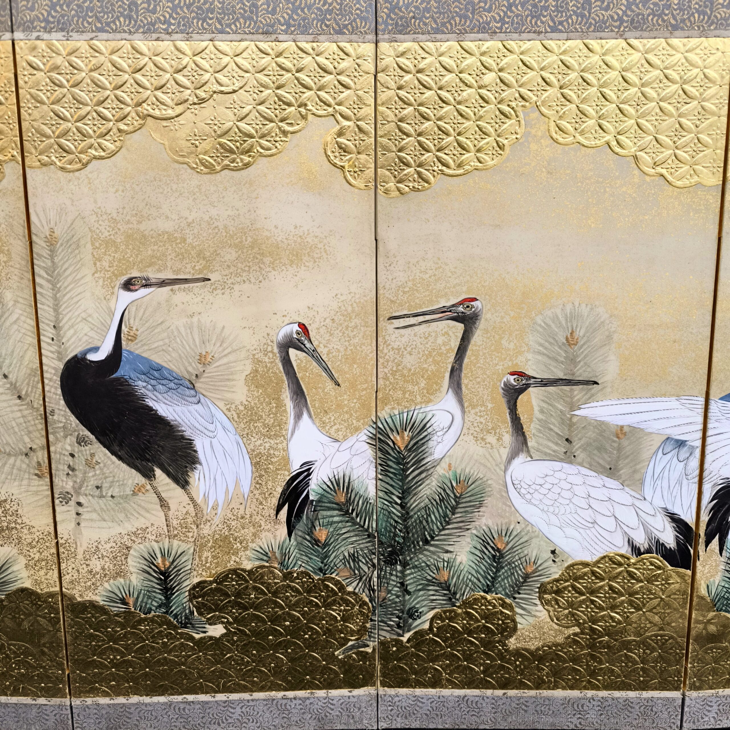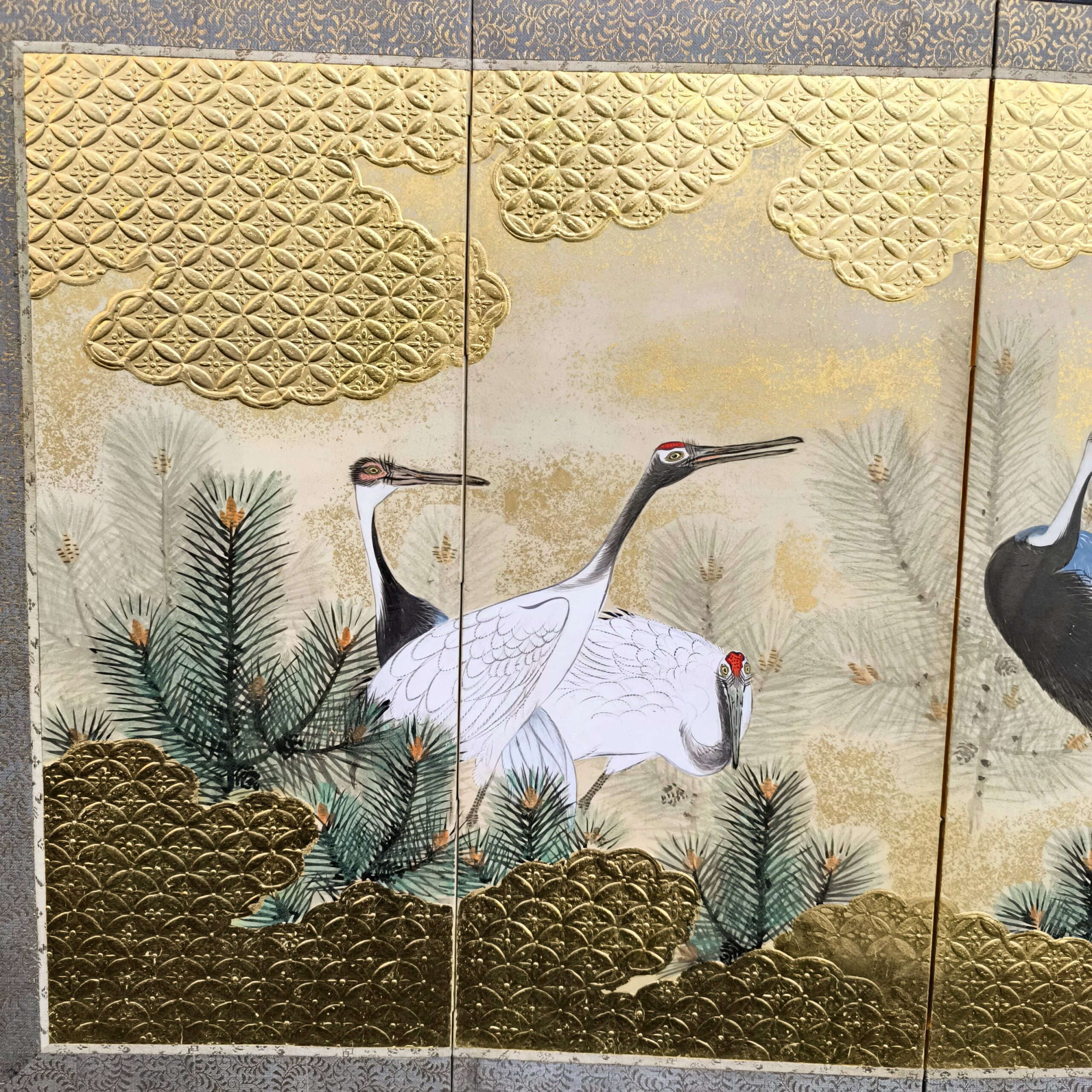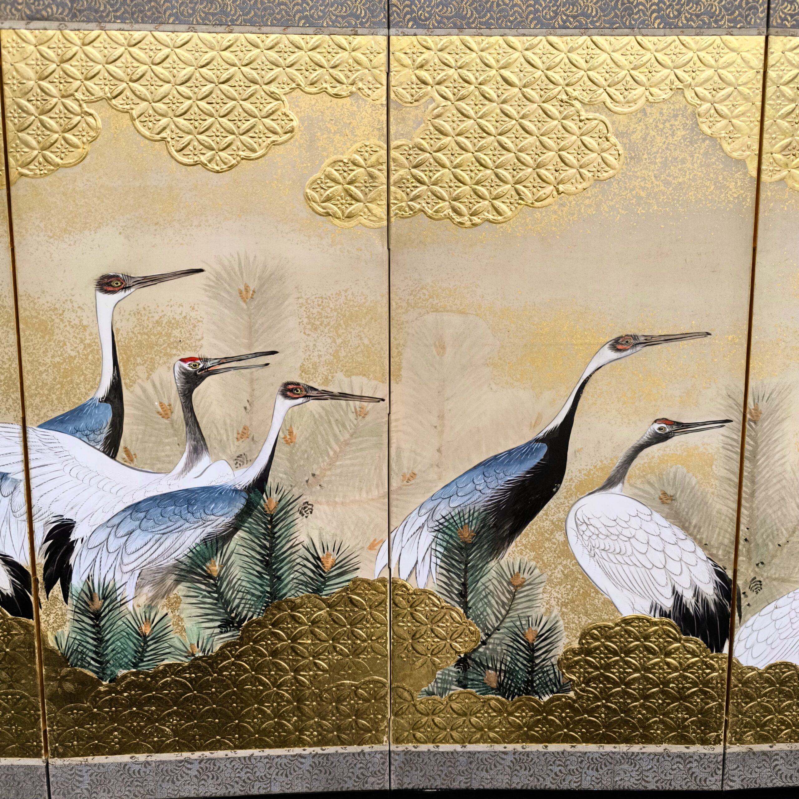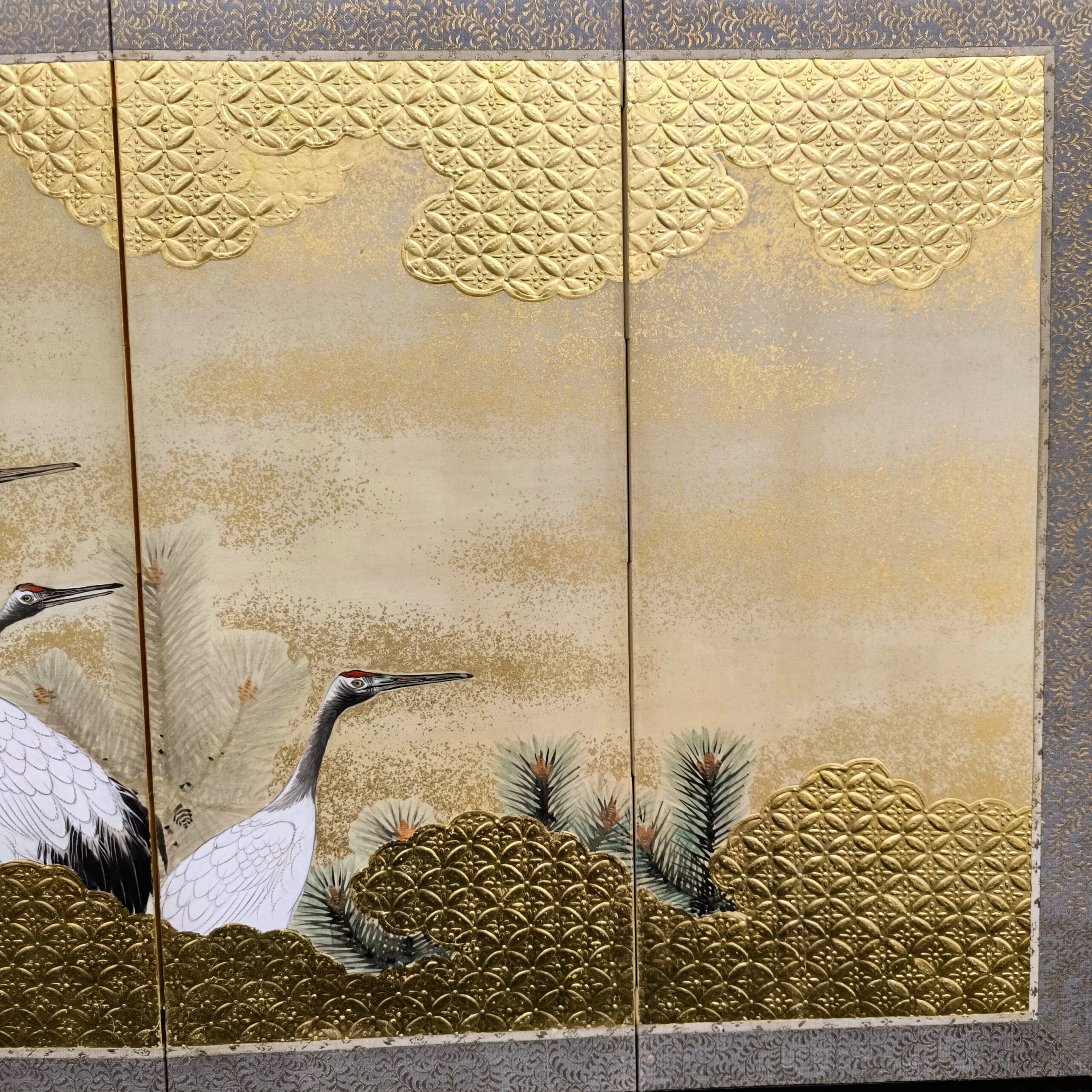 鶴の顔や羽などの描写は細かい部分まで描かれ、砂子がまかれたりと非常に凝っていて特別に注文を受けて制作された屏風かと思います。