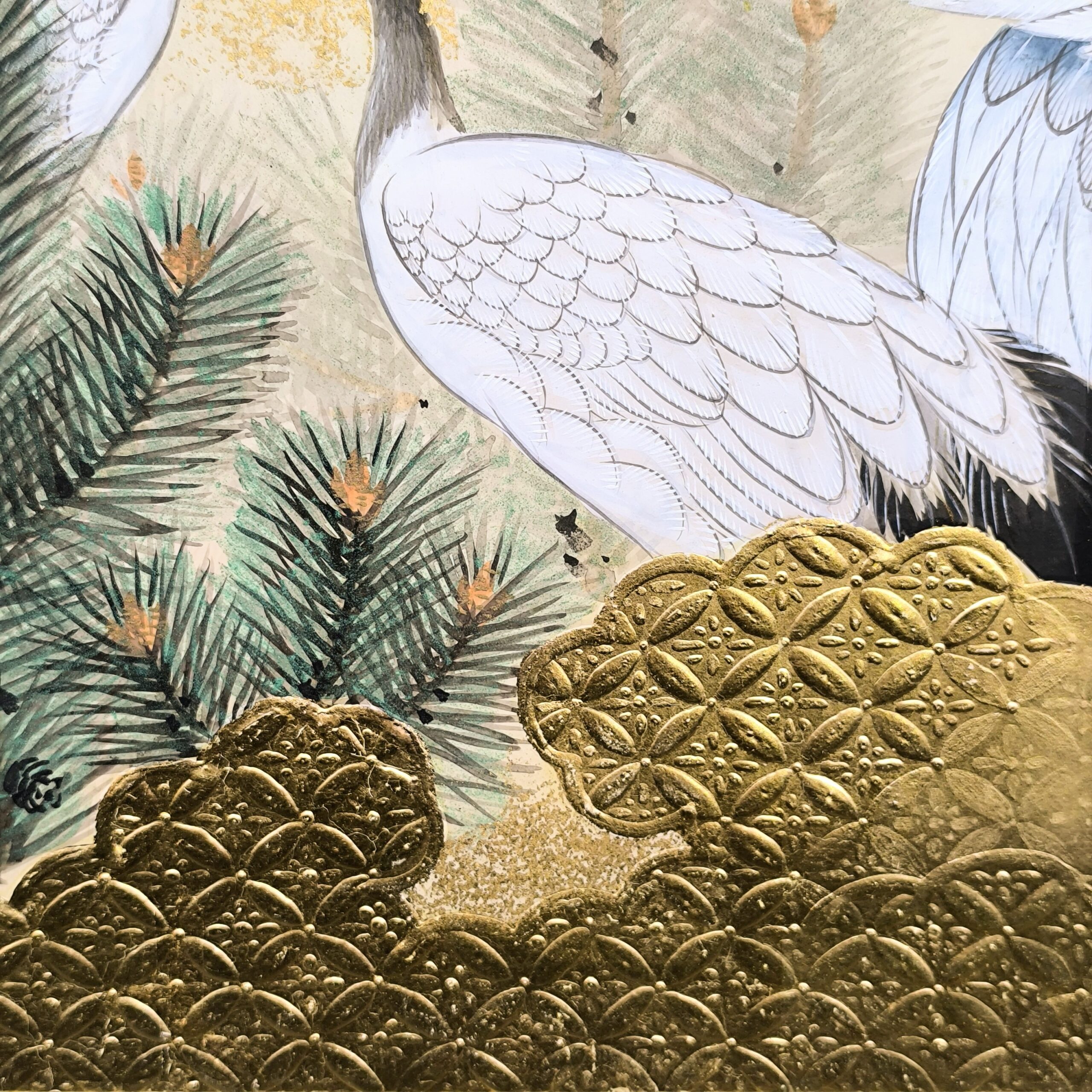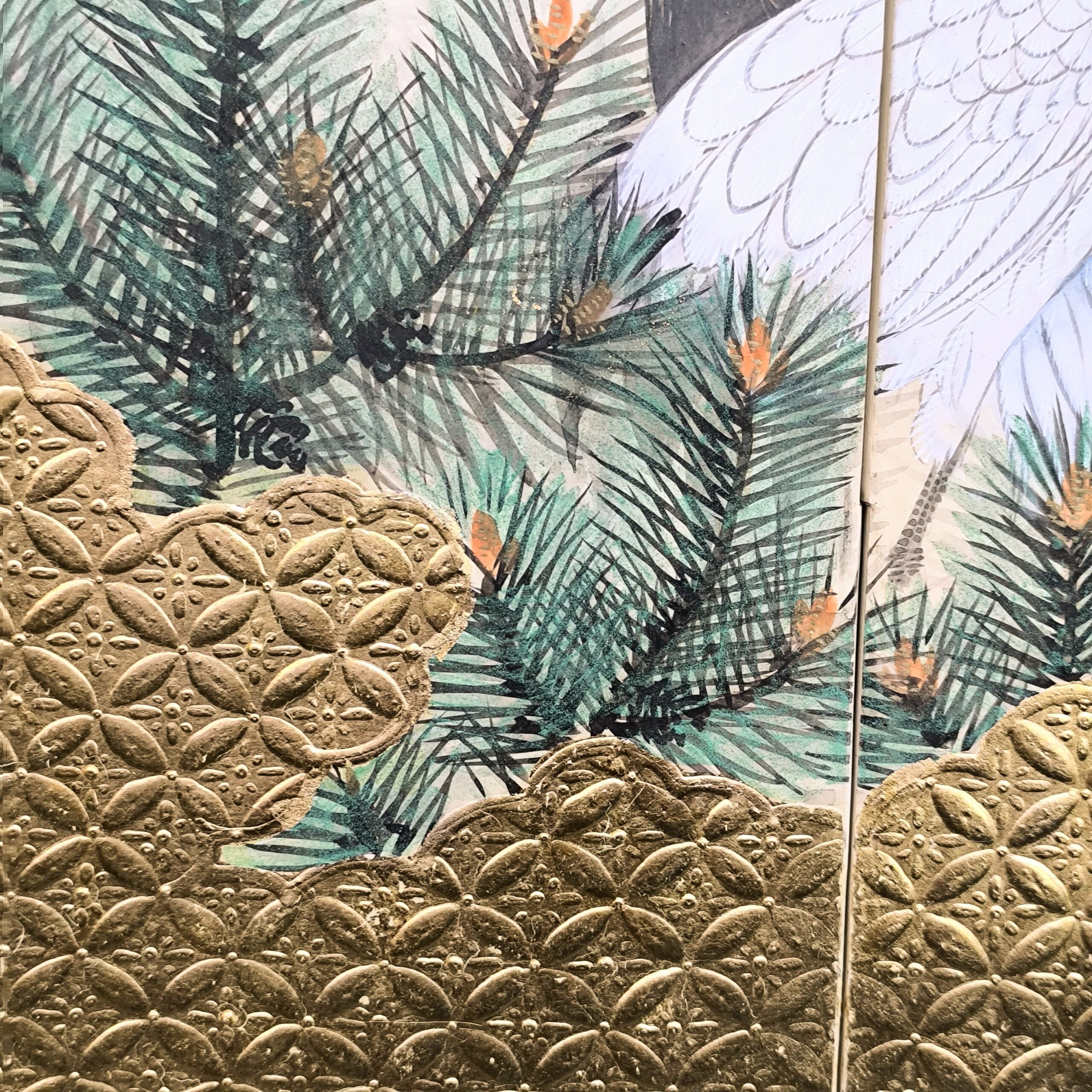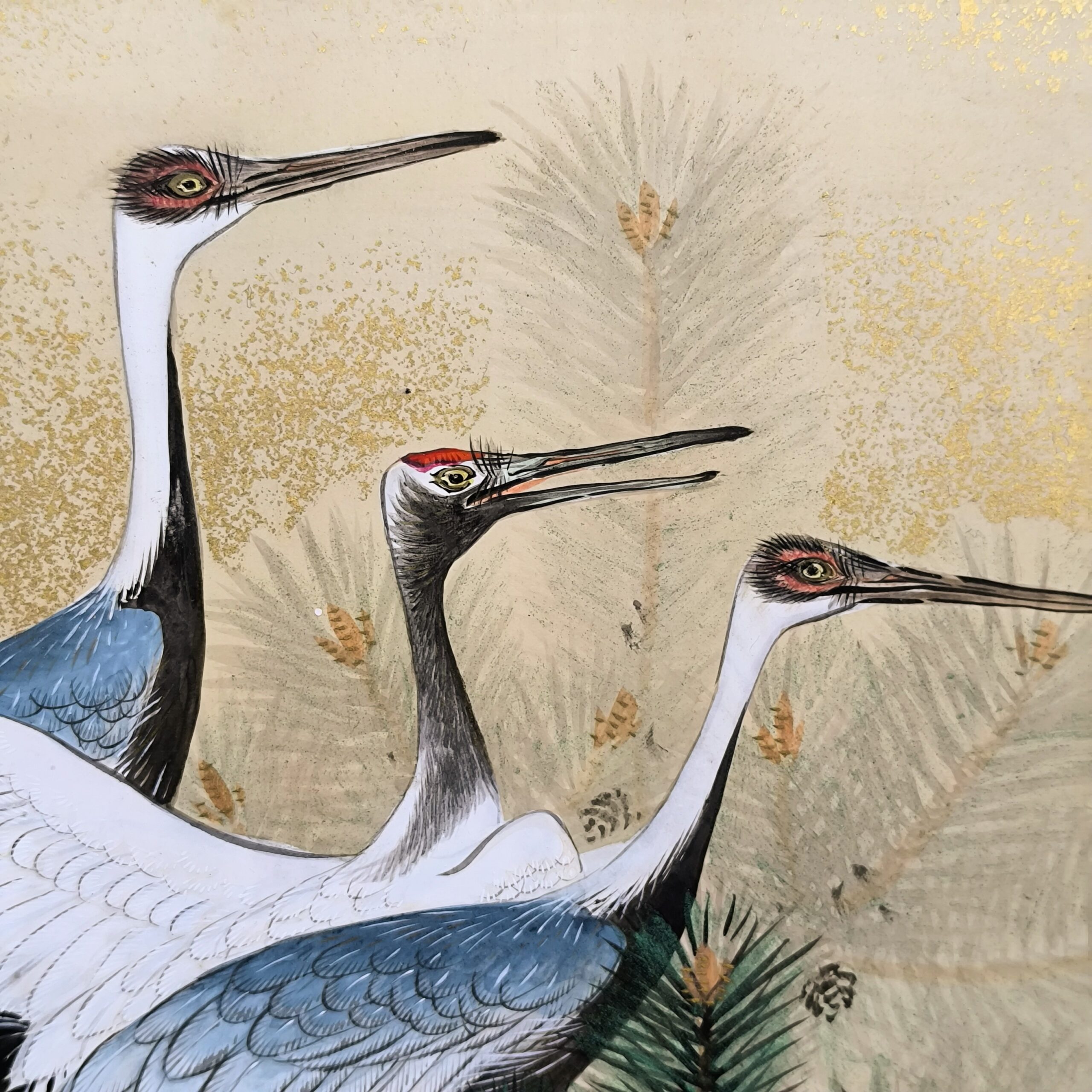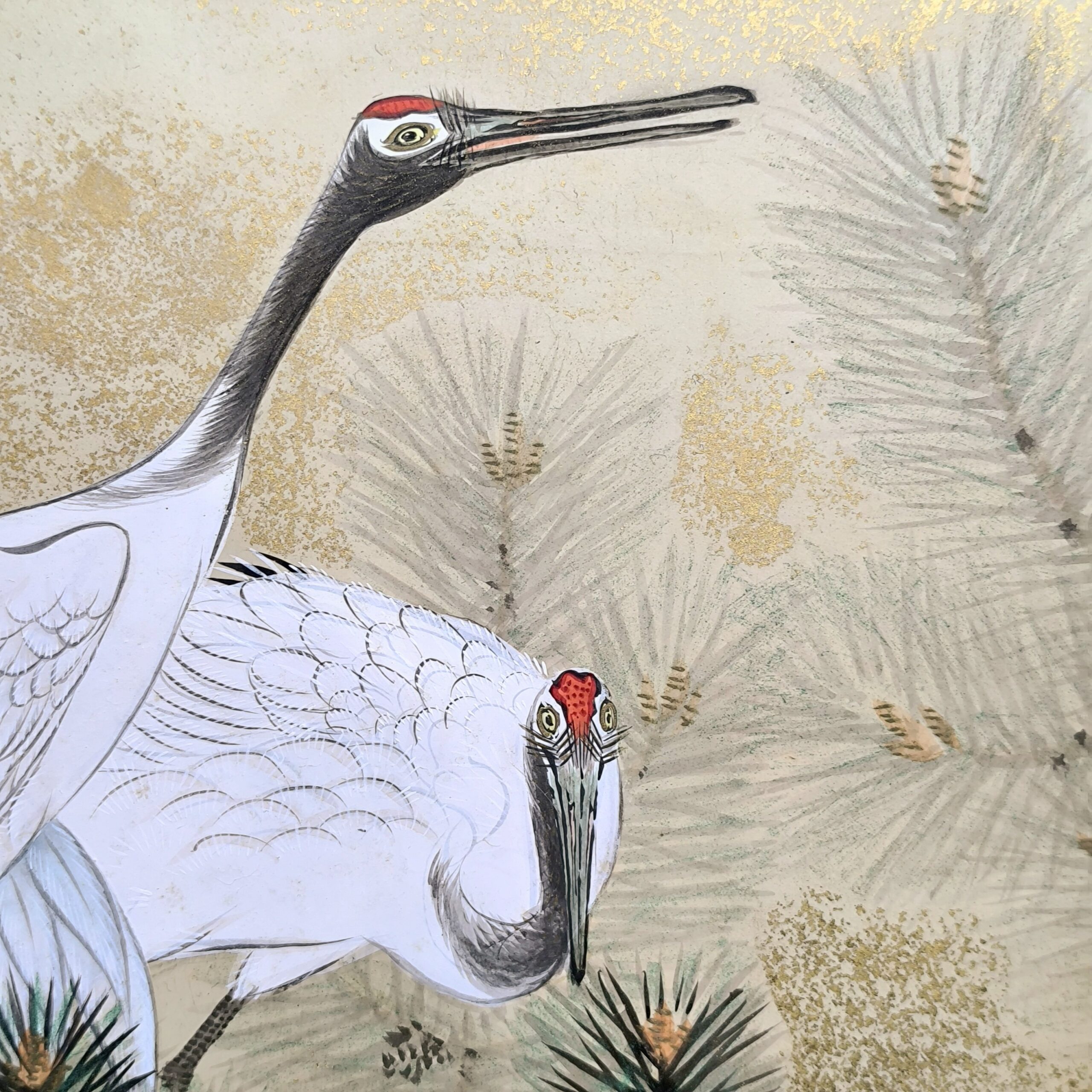鶴の顔や羽などの描写は細かい部分まで描かれ、砂子がまかれたりと非常に凝っていて特別に注文を受けて制作された屏風かと思います。