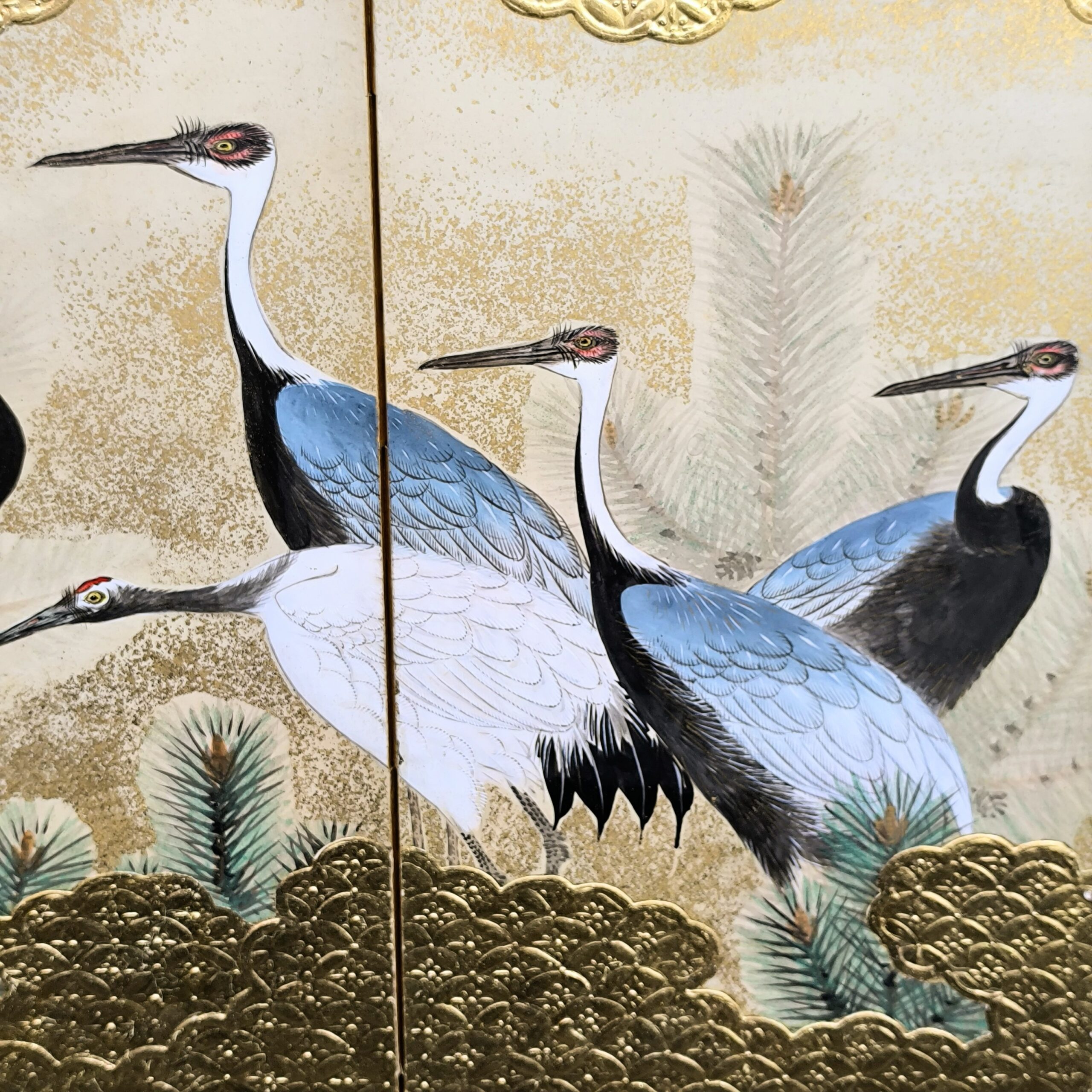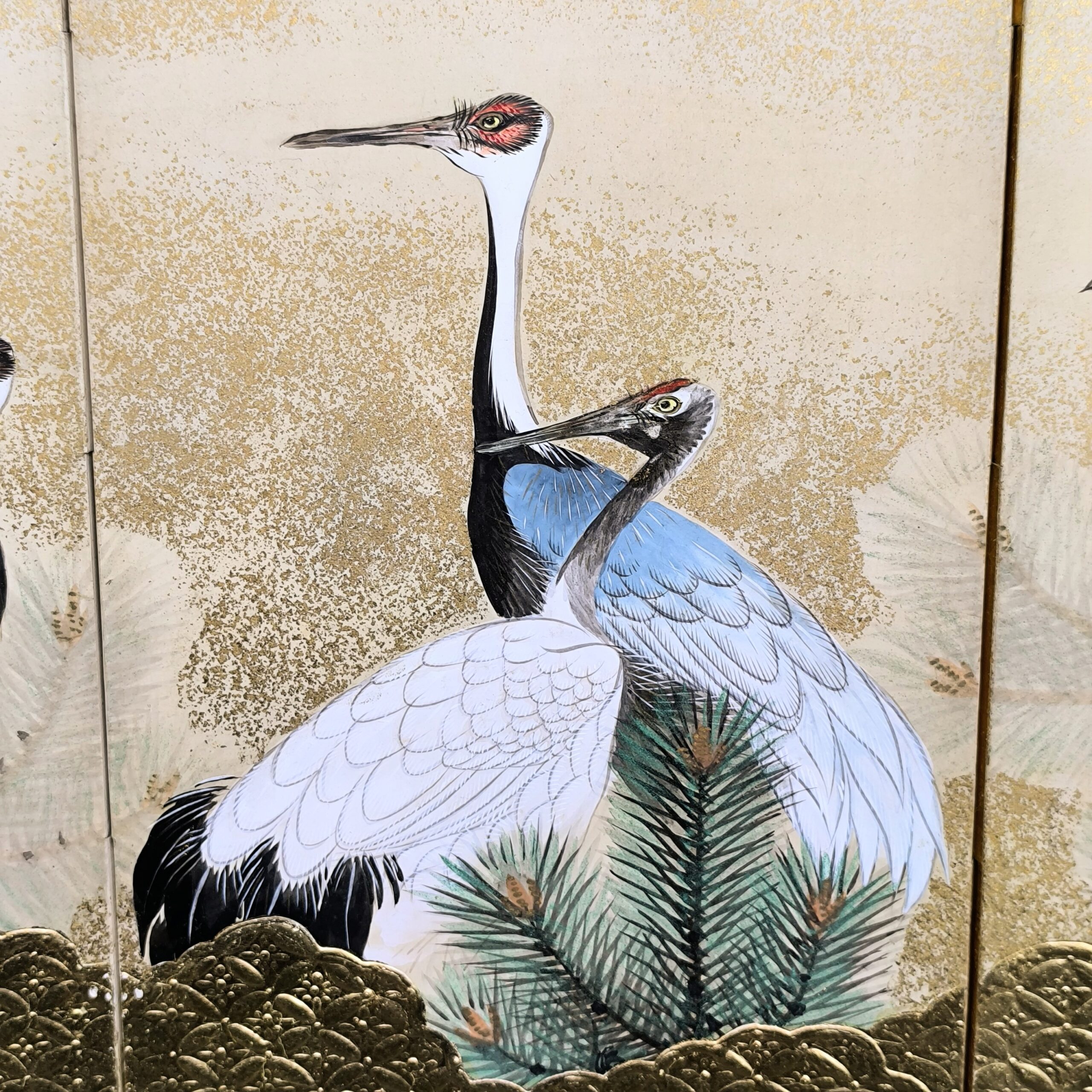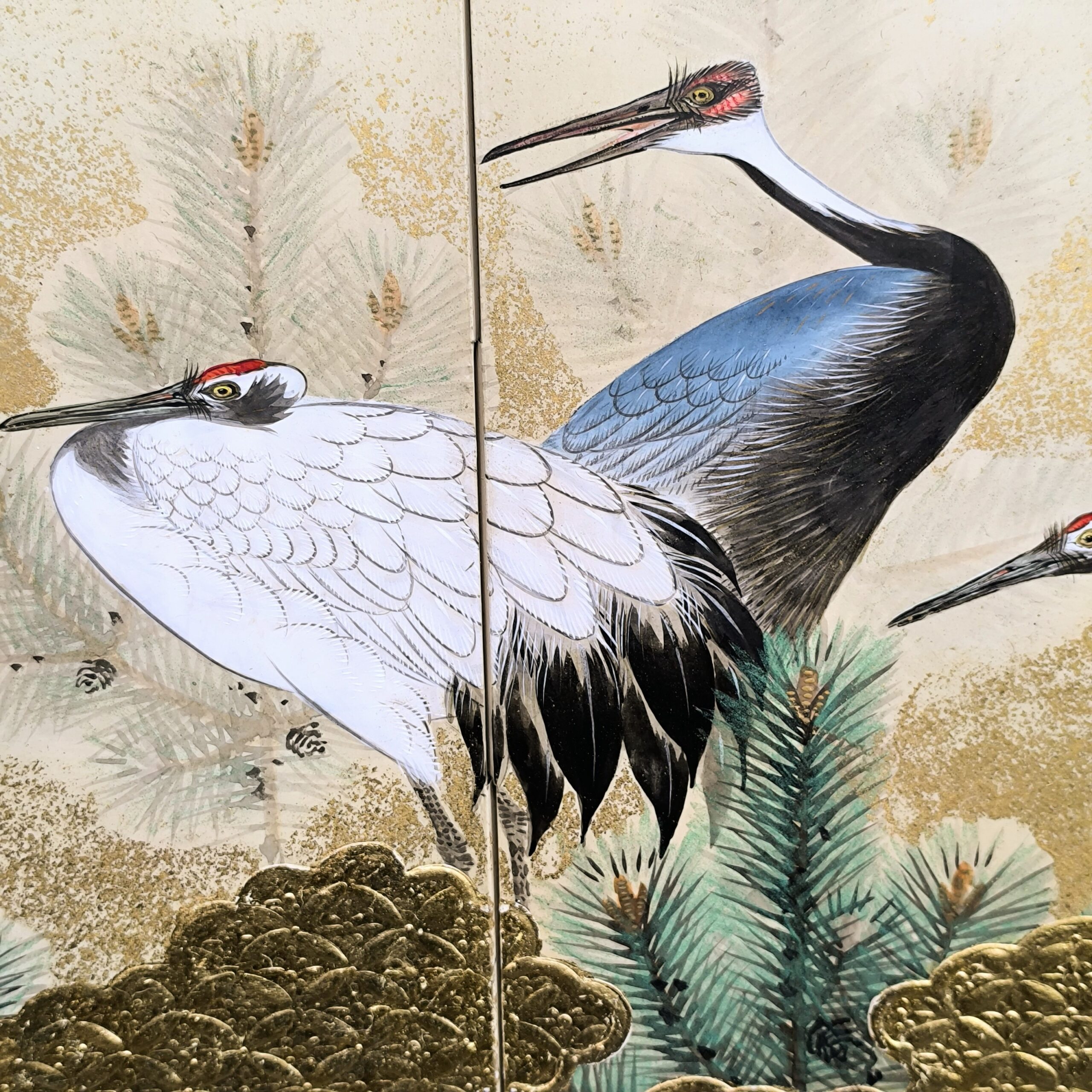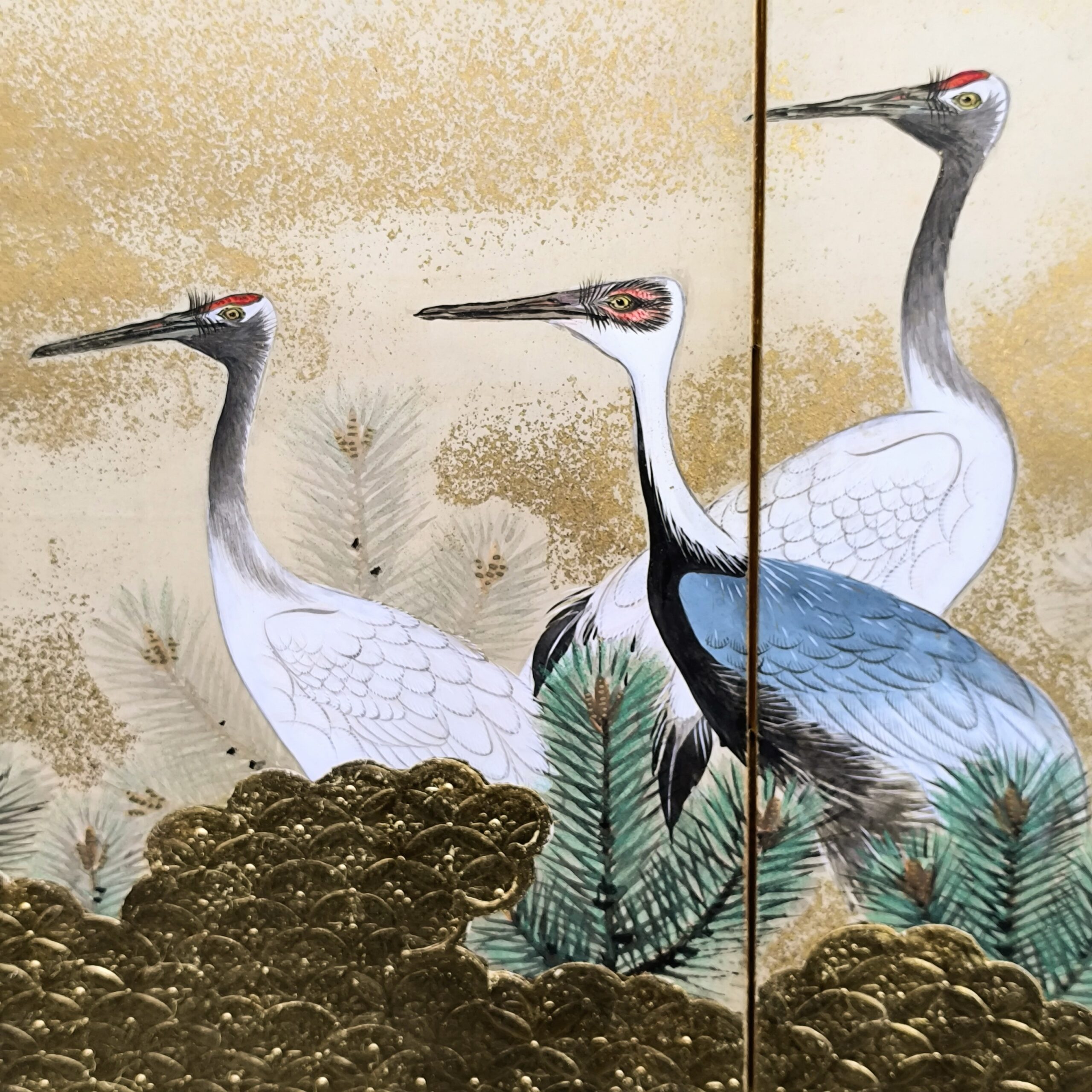 鶴の顔や羽などの描写は細かい部分まで描かれ、砂子がまかれたりと非常に凝っていて特別に注文を受けて制作された屏風かと思います。
