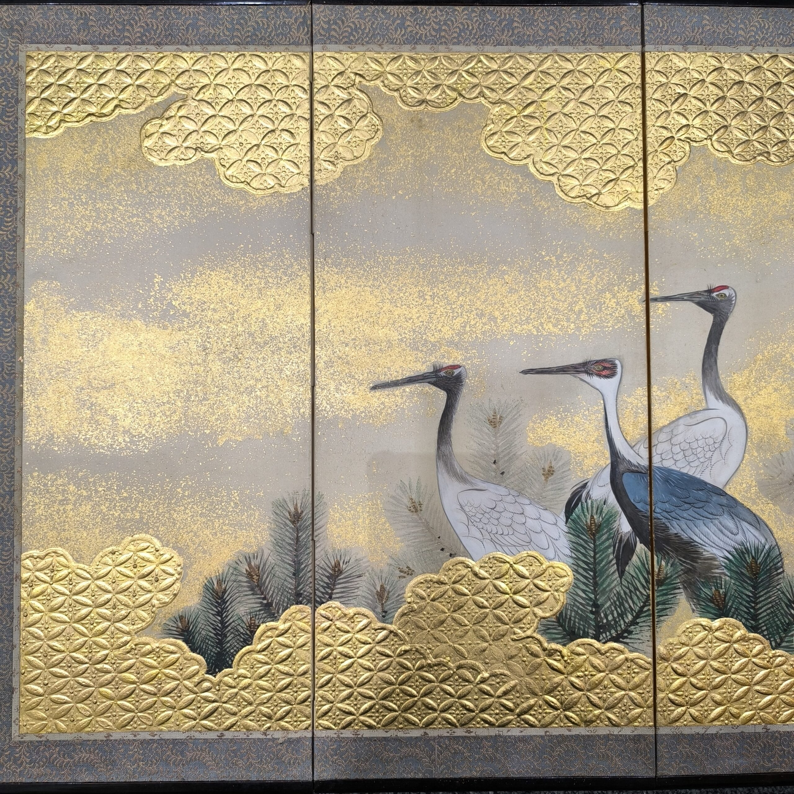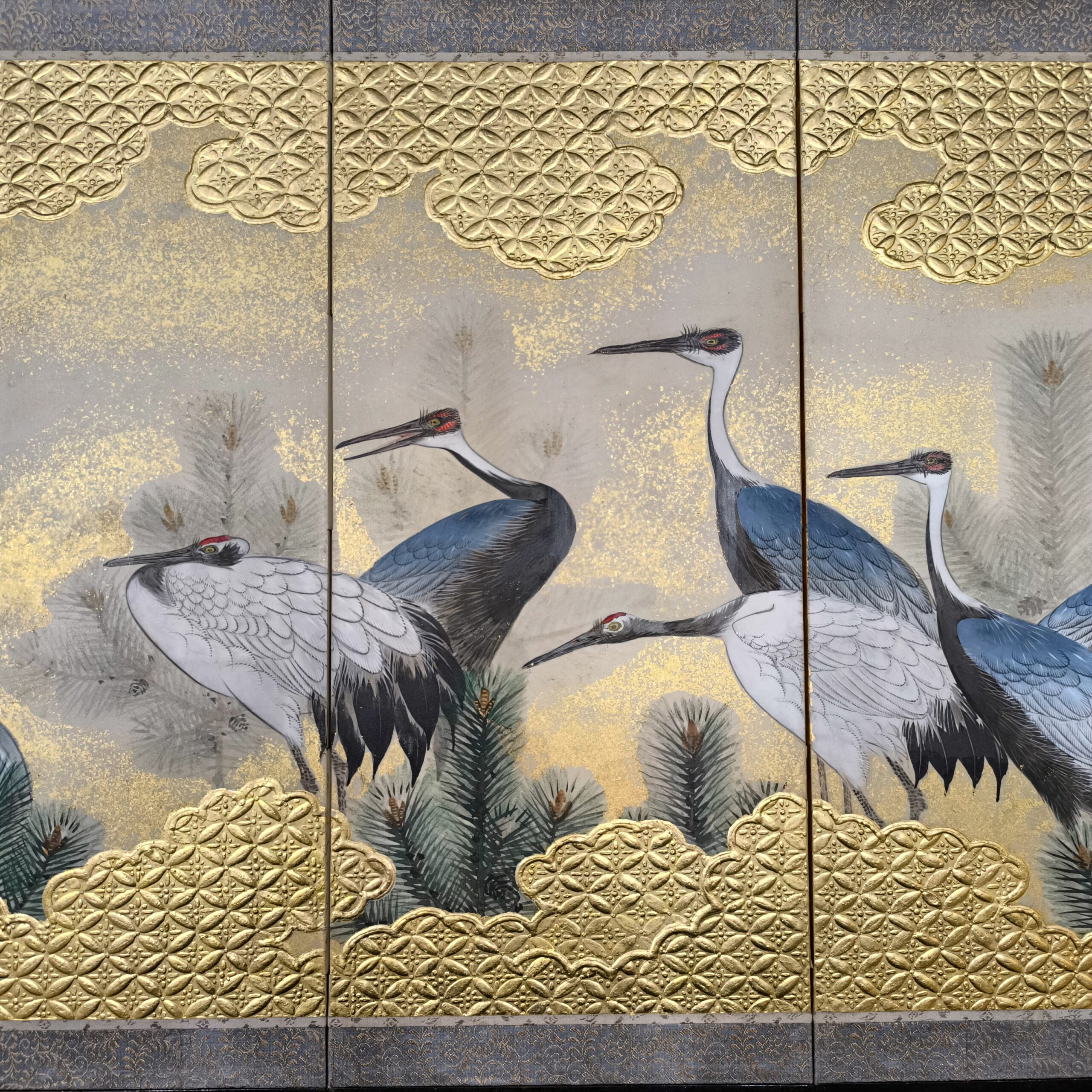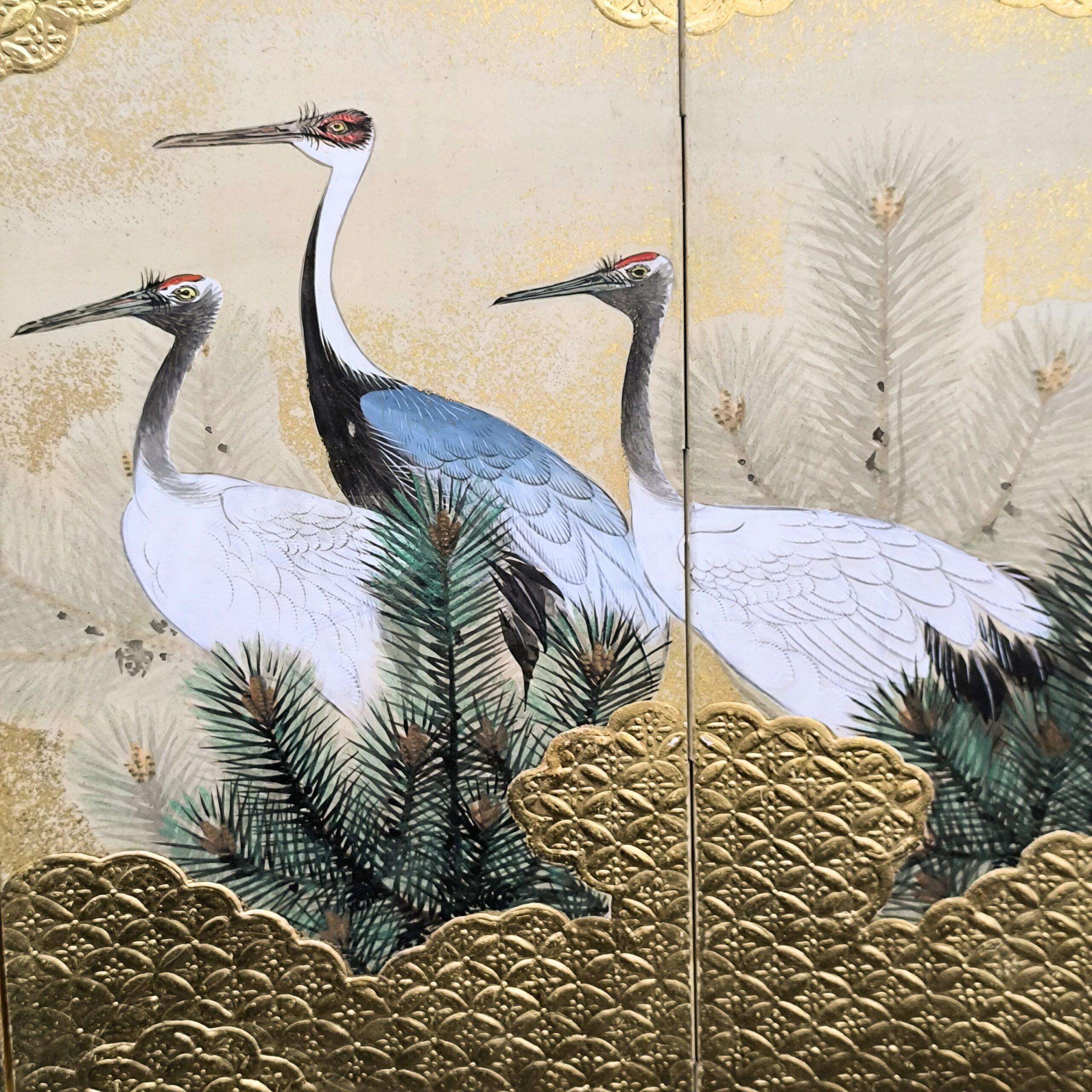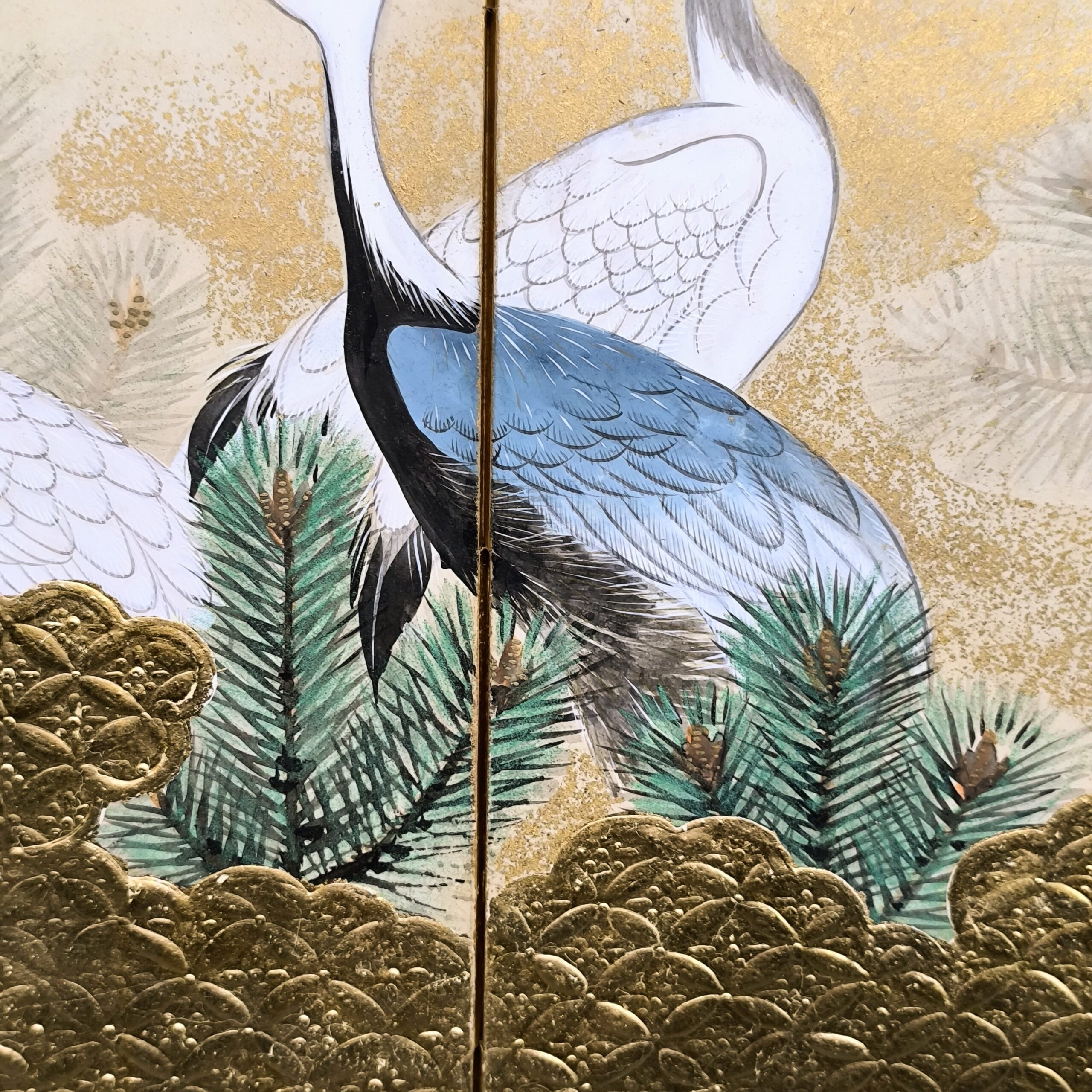 鶴の顔や羽などの描写は細かい部分まで描かれ、砂子がまかれたりと非常に凝っていて特別に注文を受けて制作された屏風かと思います。