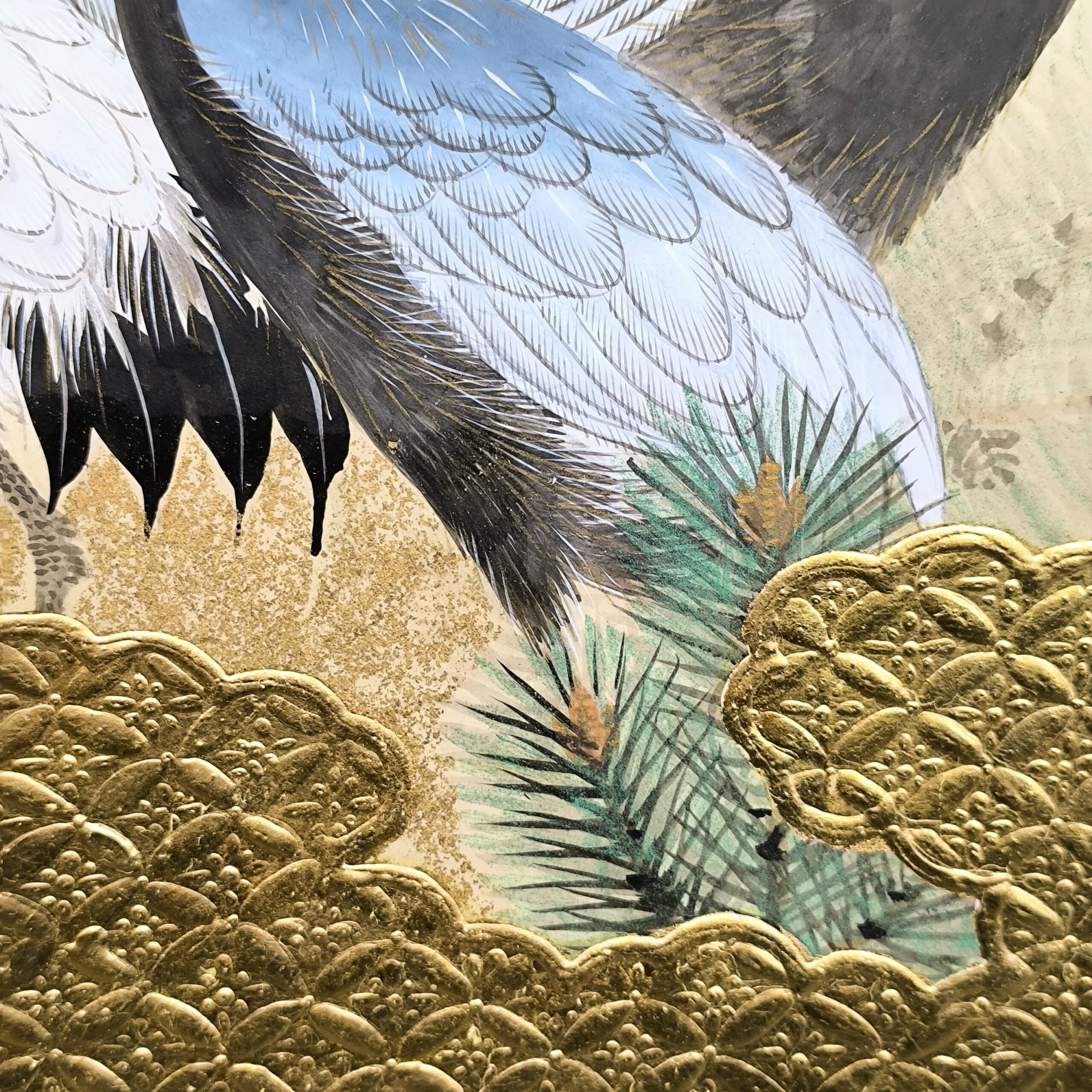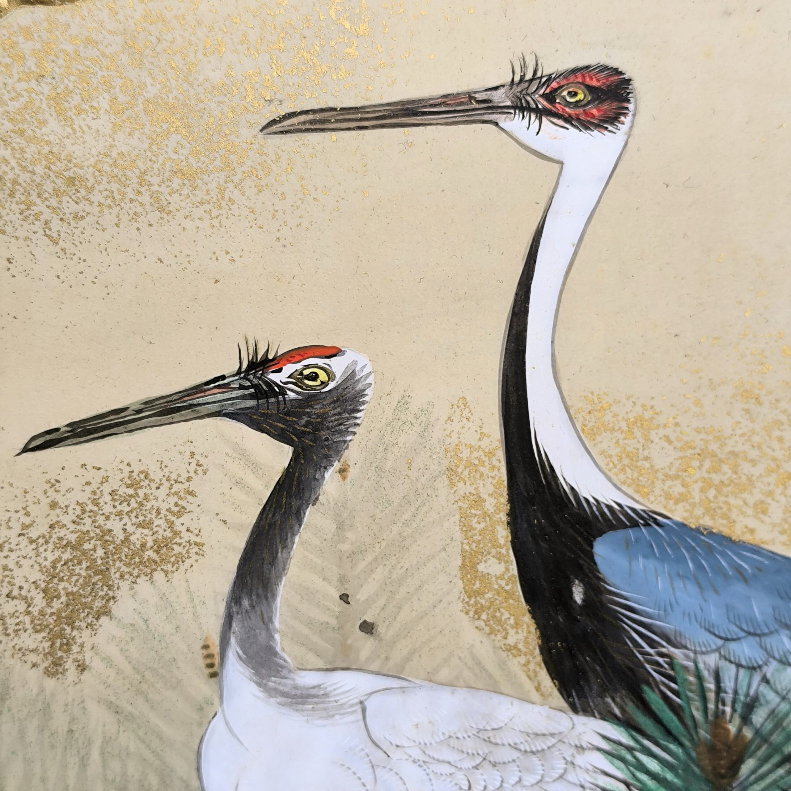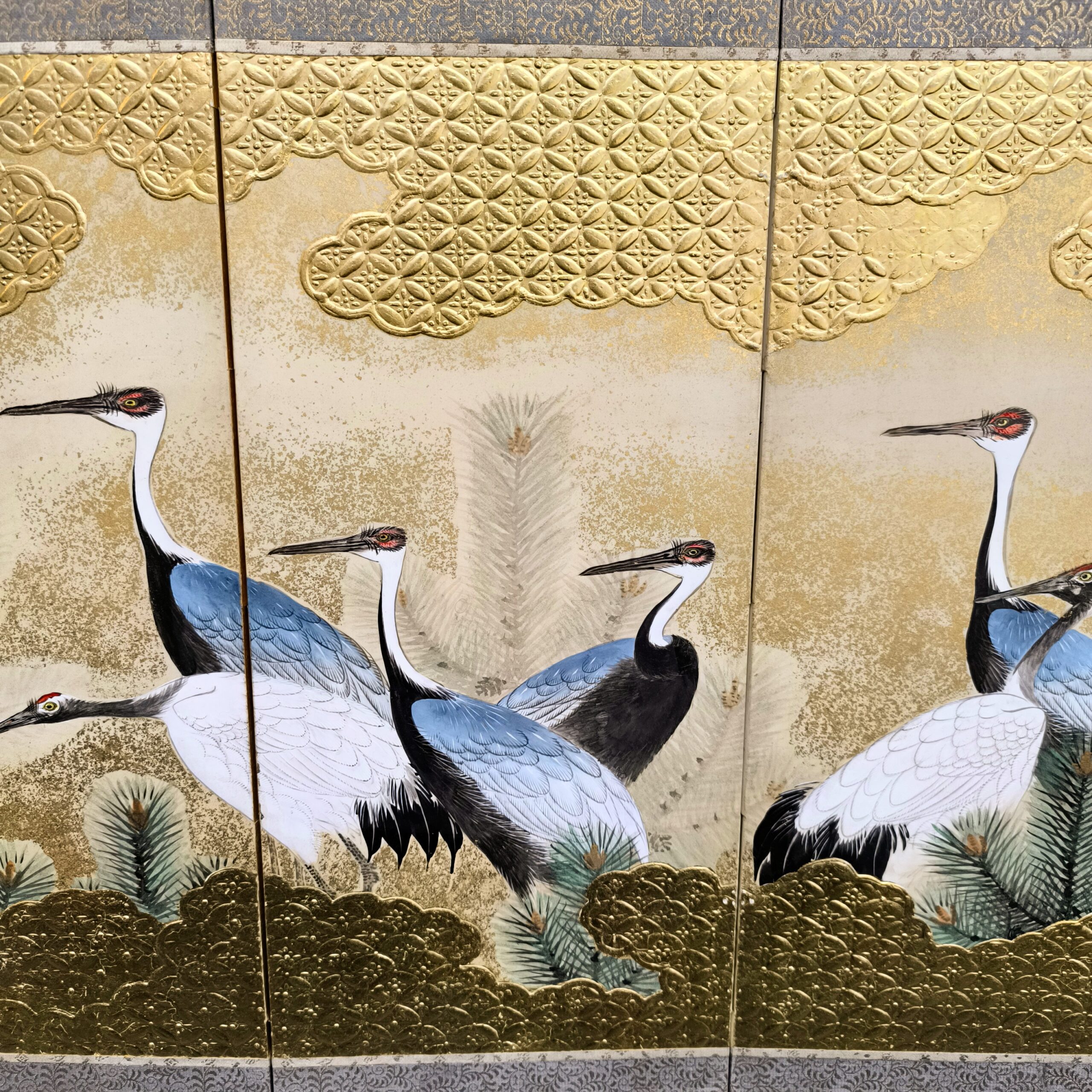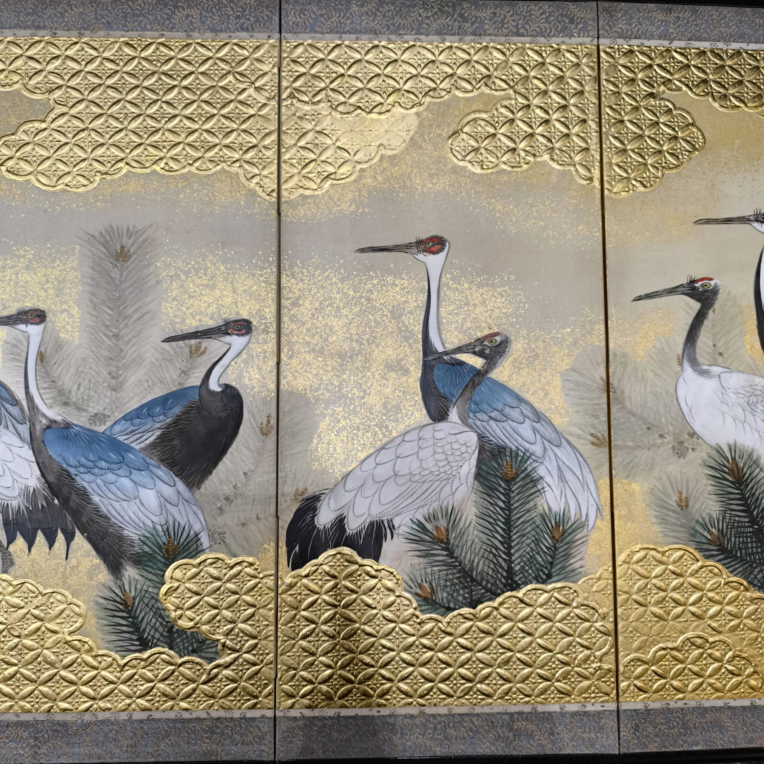 鶴の顔や羽などの描写は細かい部分まで描かれ、砂子がまかれたりと非常に凝っていて特別に注文を受けて制作された屏風かと思います。