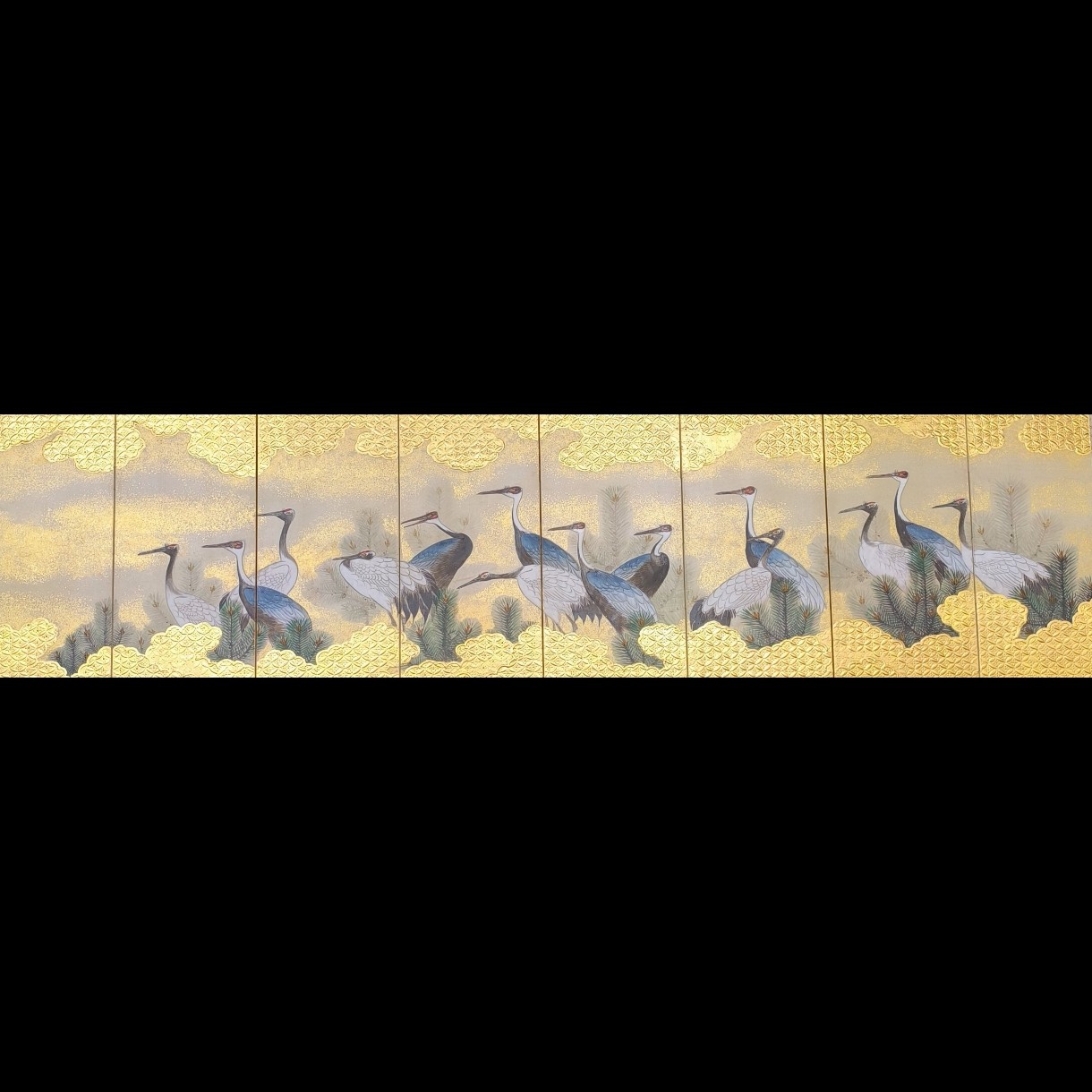 紙本金地著色若松群鶴図8曲雛屏風