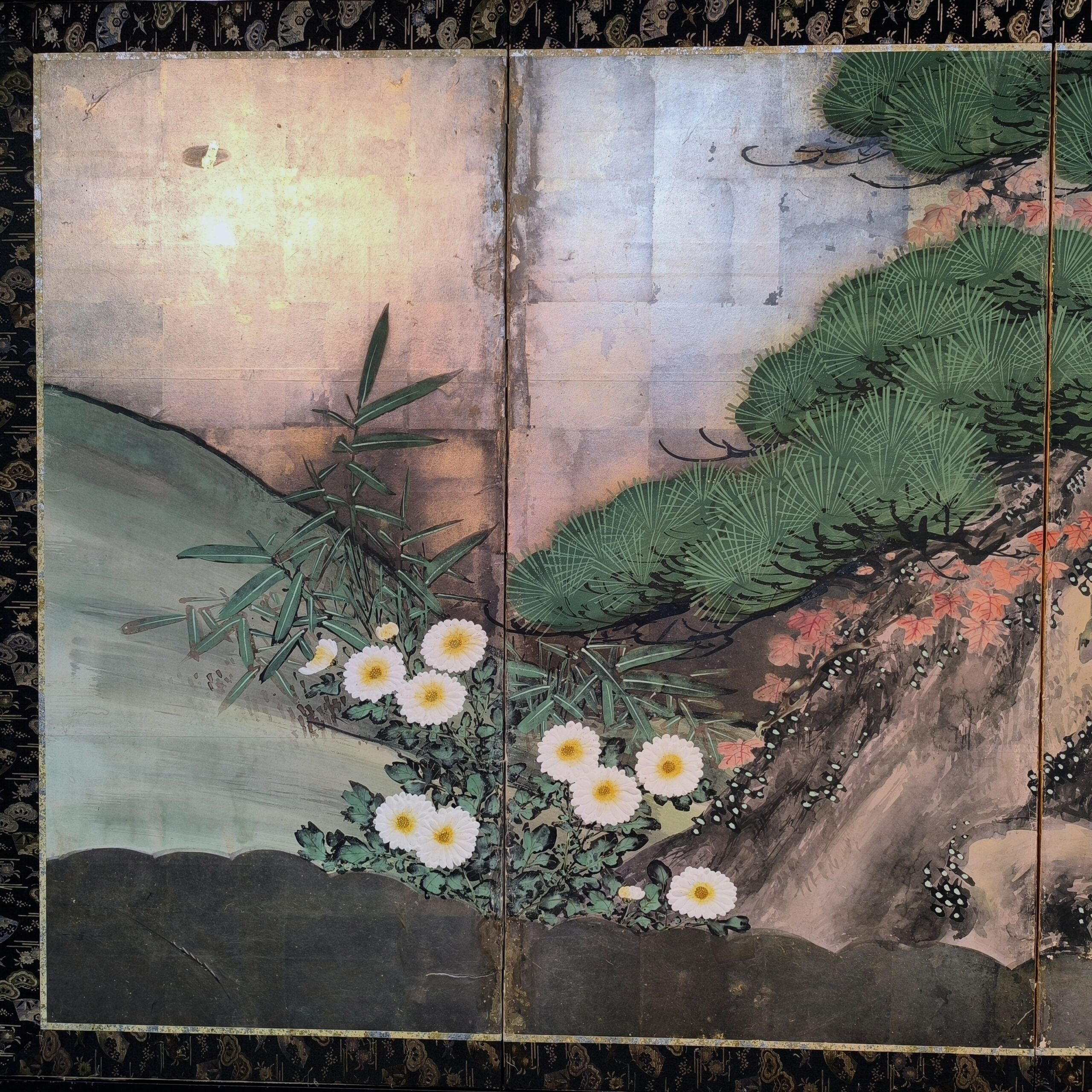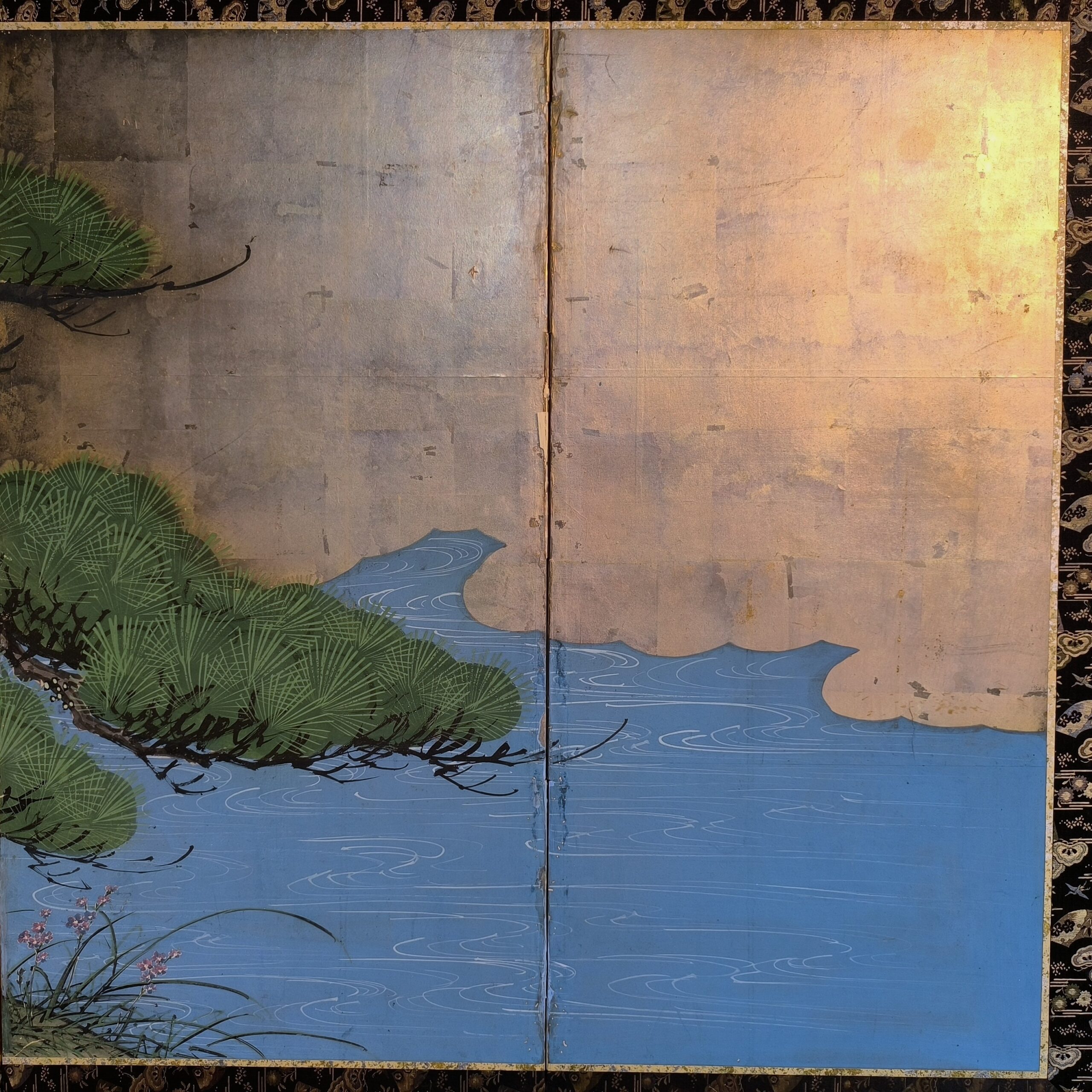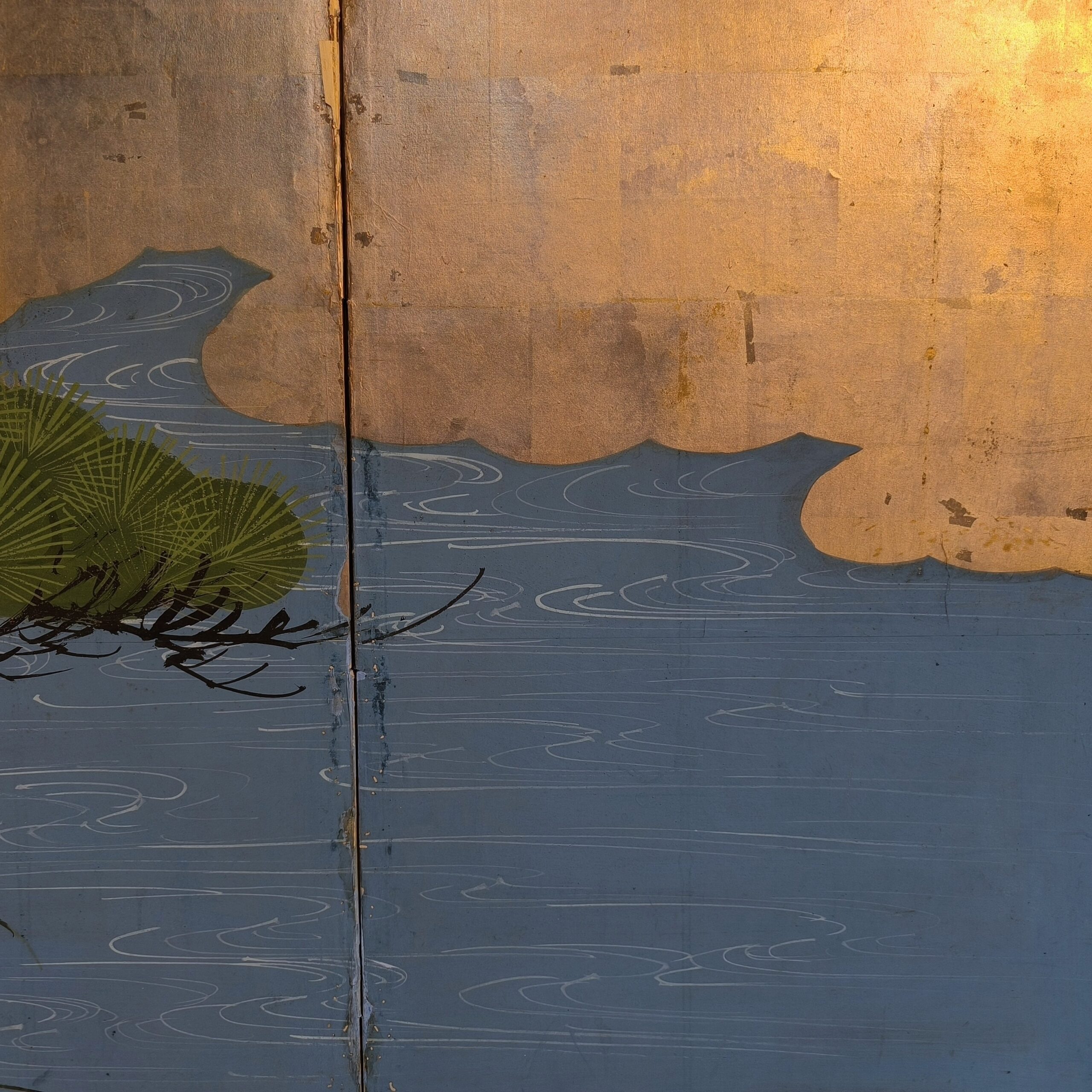 屏風とは複数の板を紙や絹で貼り、蝶番で繋げて折りたためる構造で、2曲・6曲などの形式が多く見られます。用途としては室内の間仕切りや風除け、儀礼や儀式での装飾、美術品としての鑑賞目的で作られました。元々は角度をつけて床に置いていましたが、今ではまっすぐに広げて壁に絵画のように飾られることが多いです。特に金箔地に絵が前面に描かれた物が人気です。時代によって金箔の大きさや色味が違い、使われた岩絵の具や絵の構図などから時代を考察します。