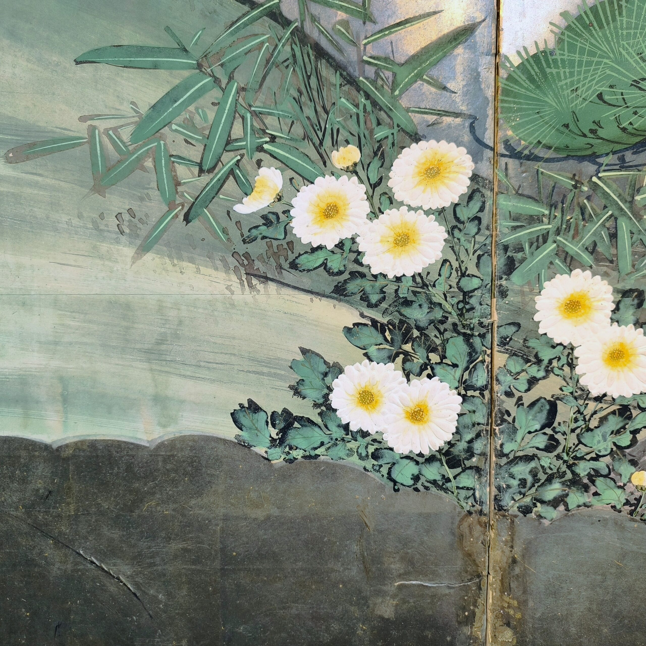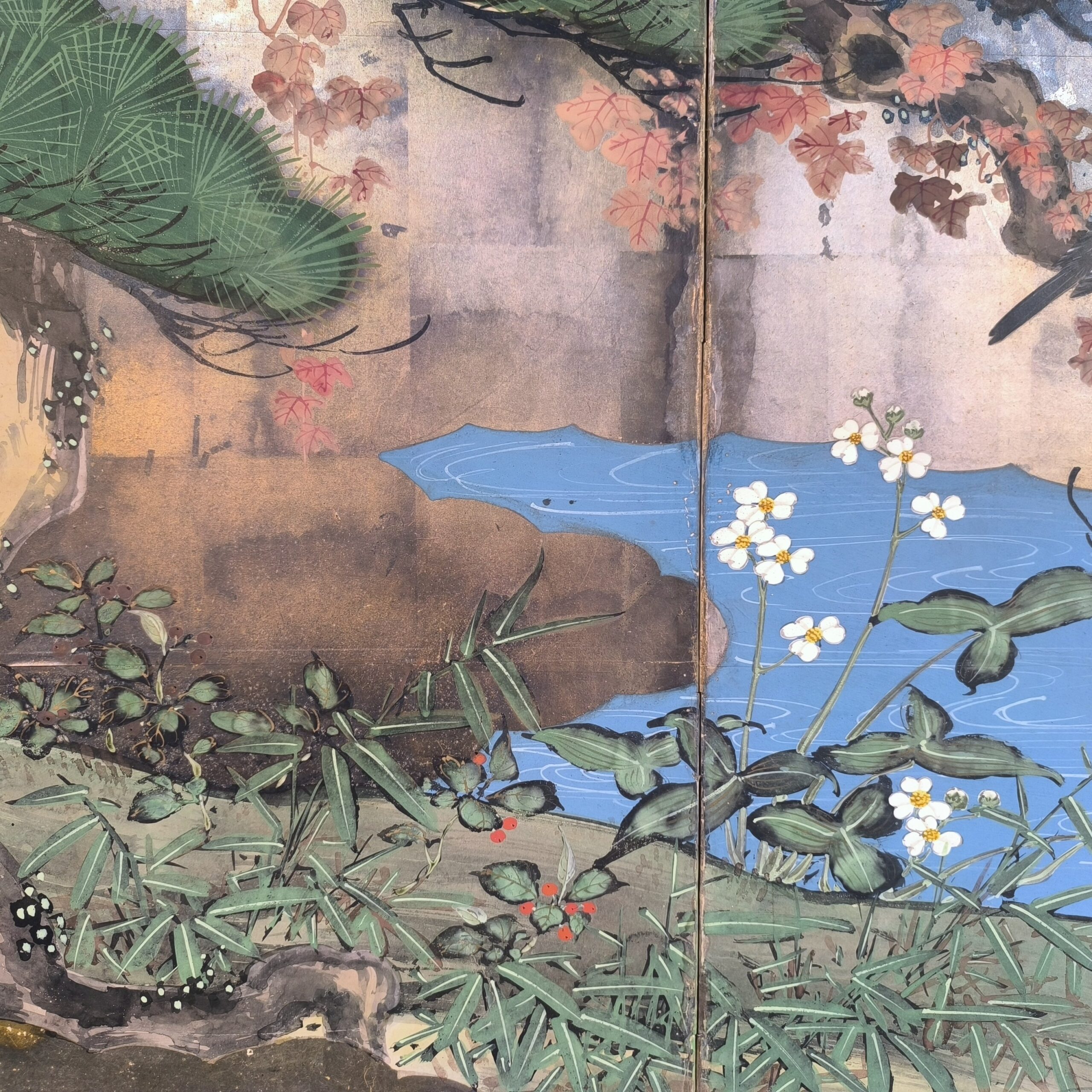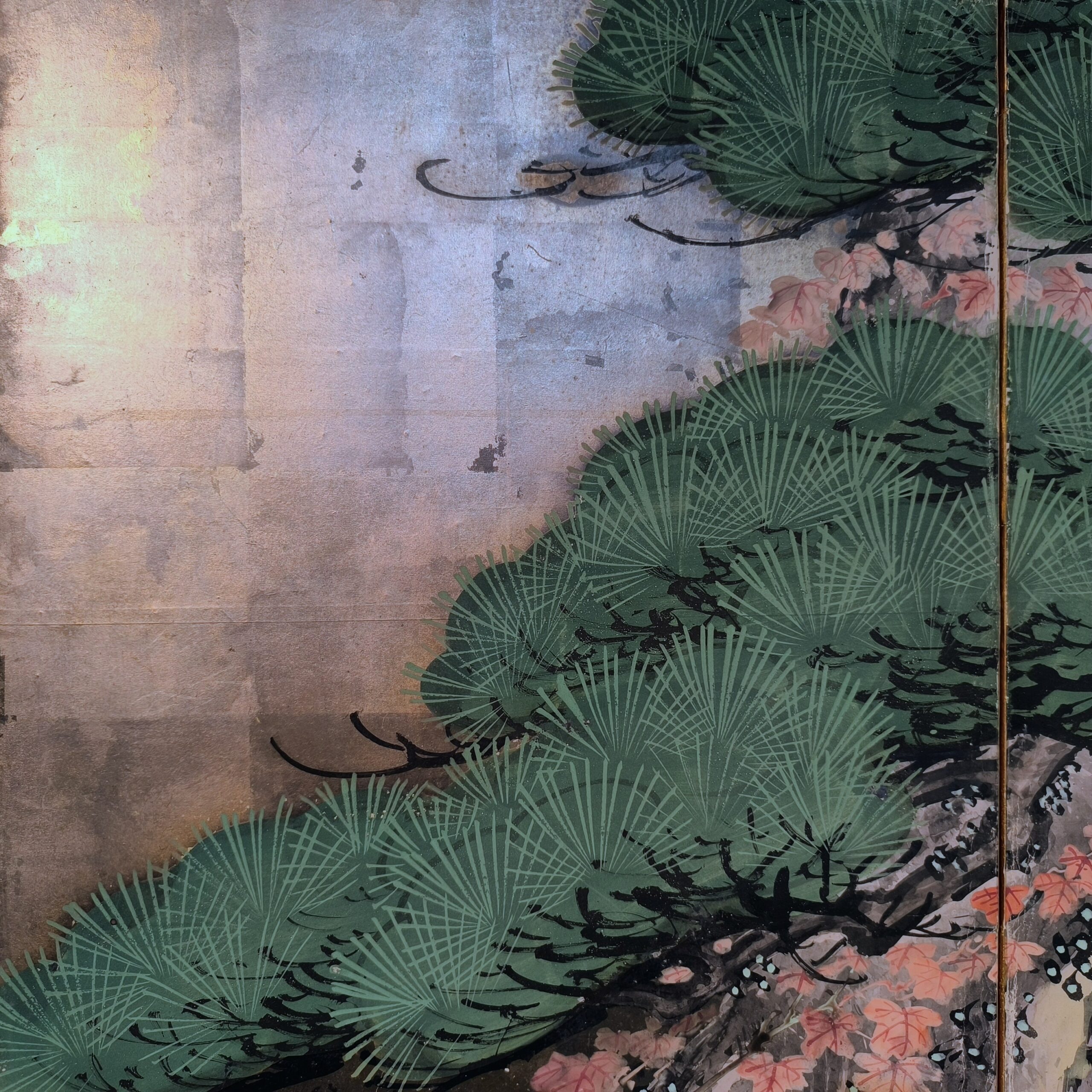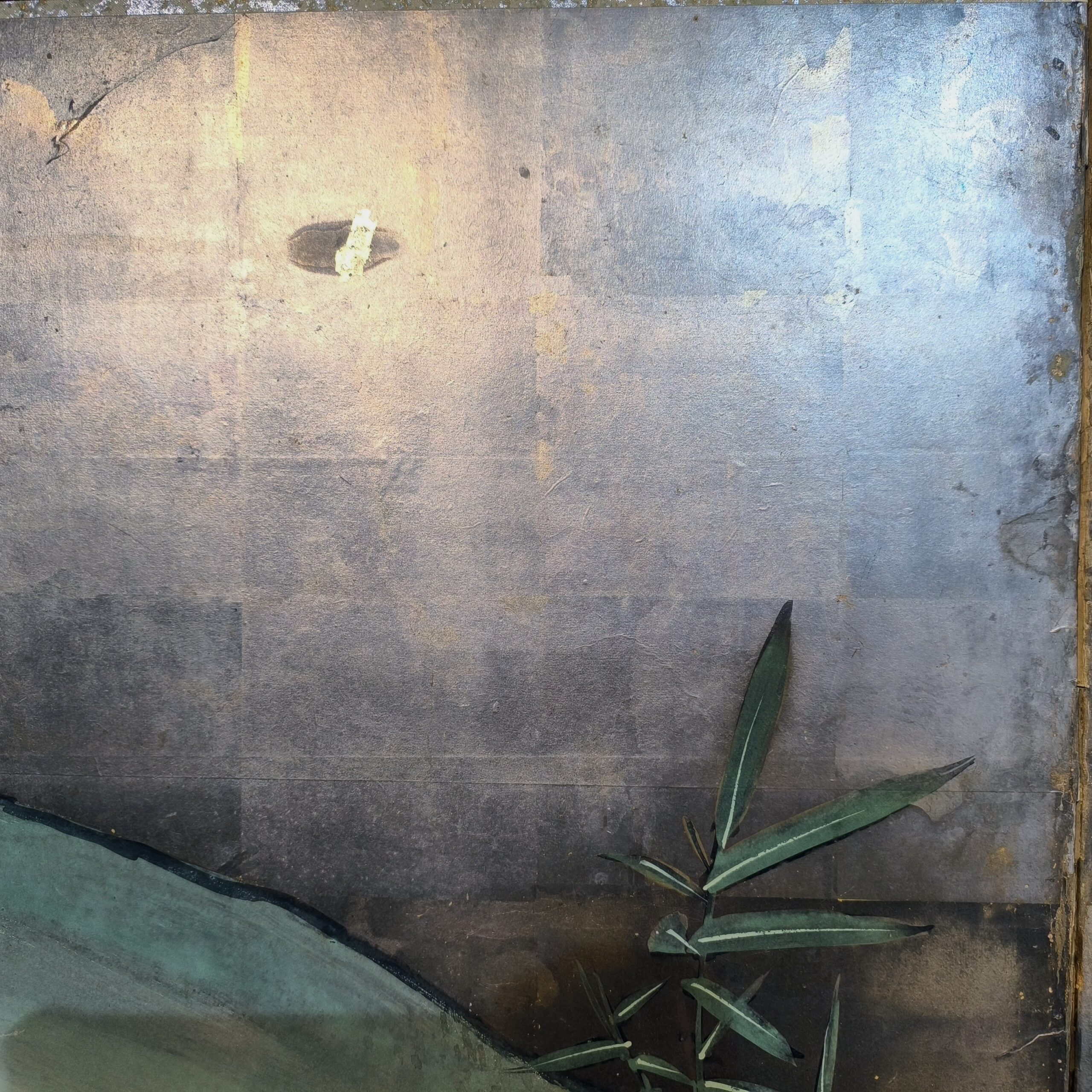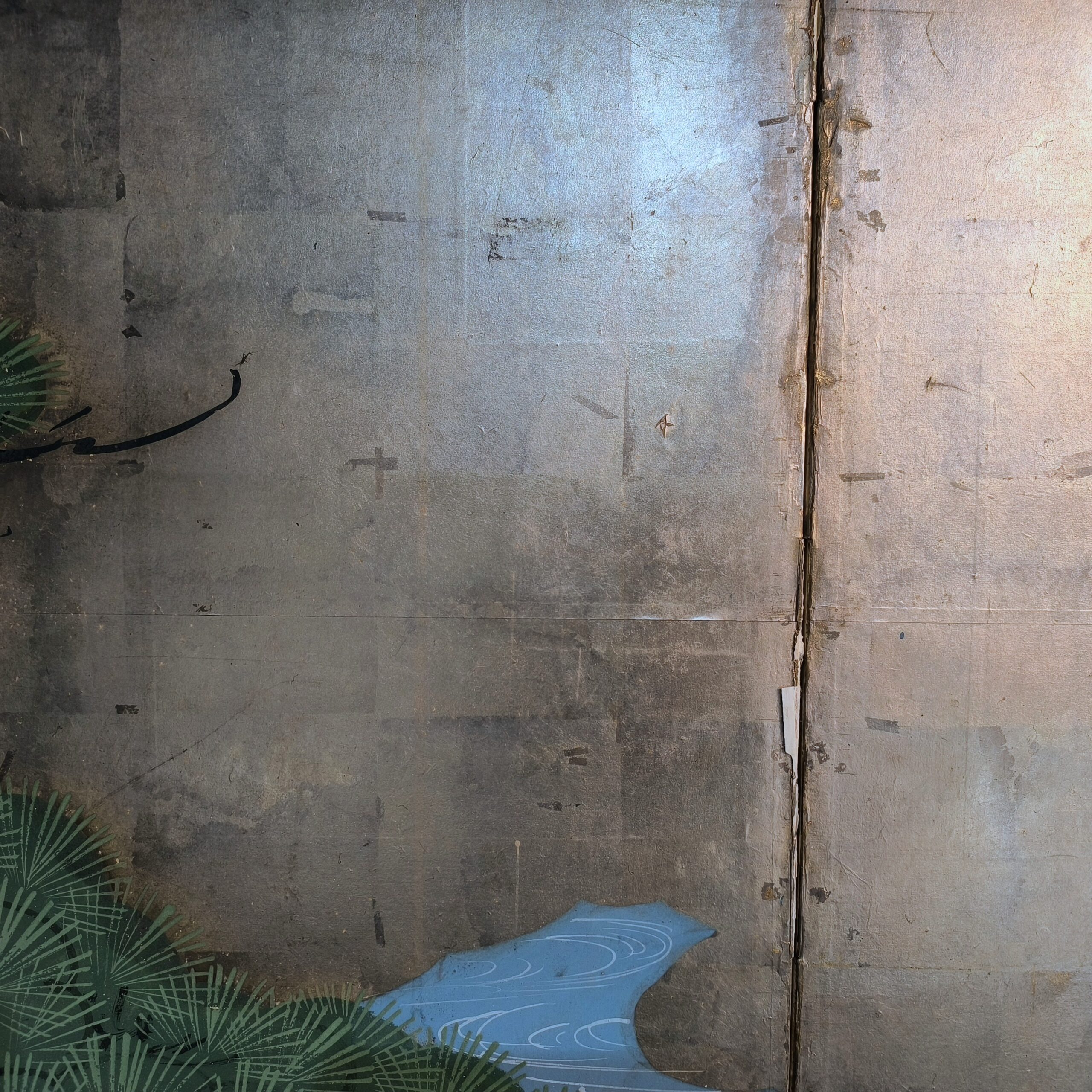 錆びた銀の風合いが、銀地ならではの風合いで色の対比もでて描写も細かくてバランスの取れた屏風です。