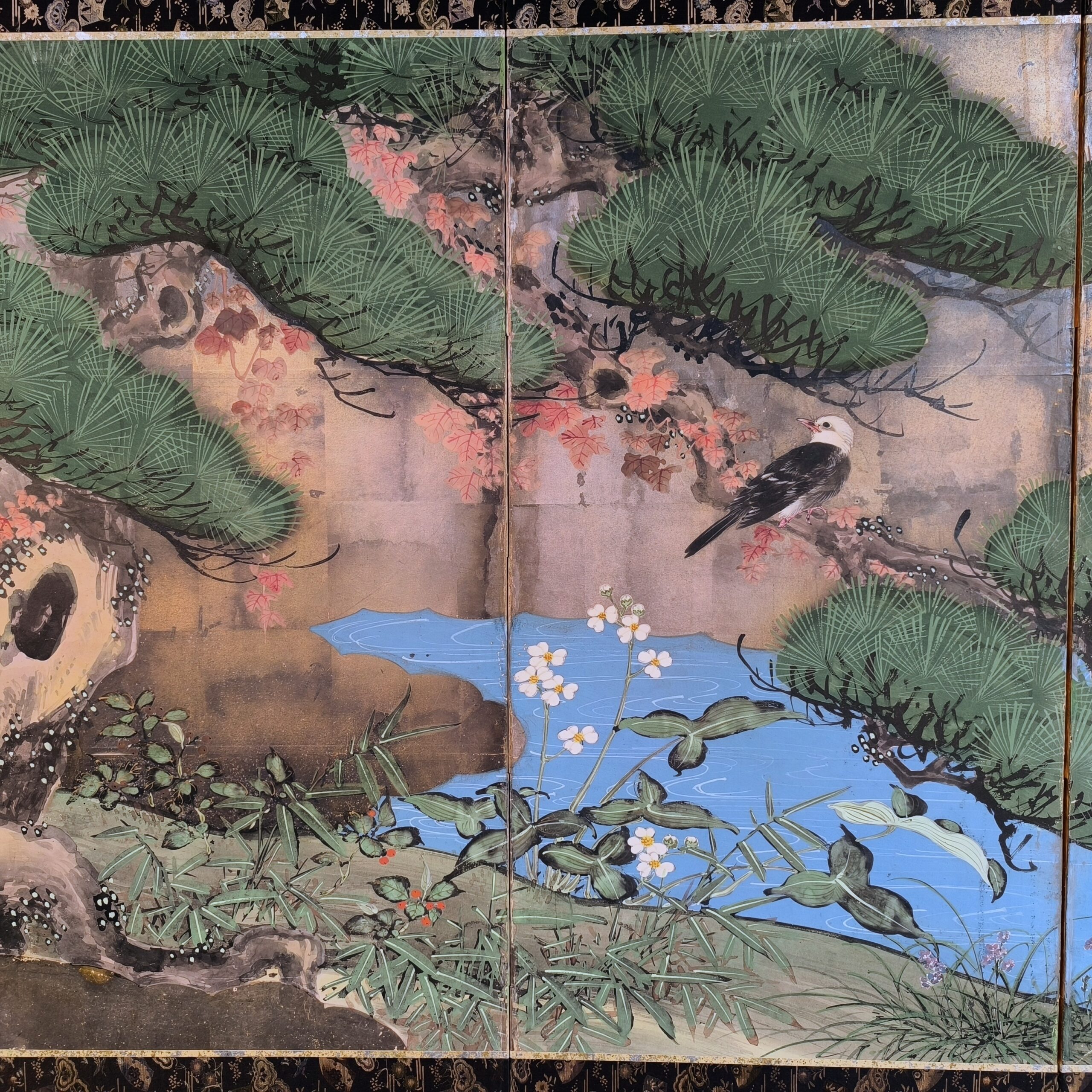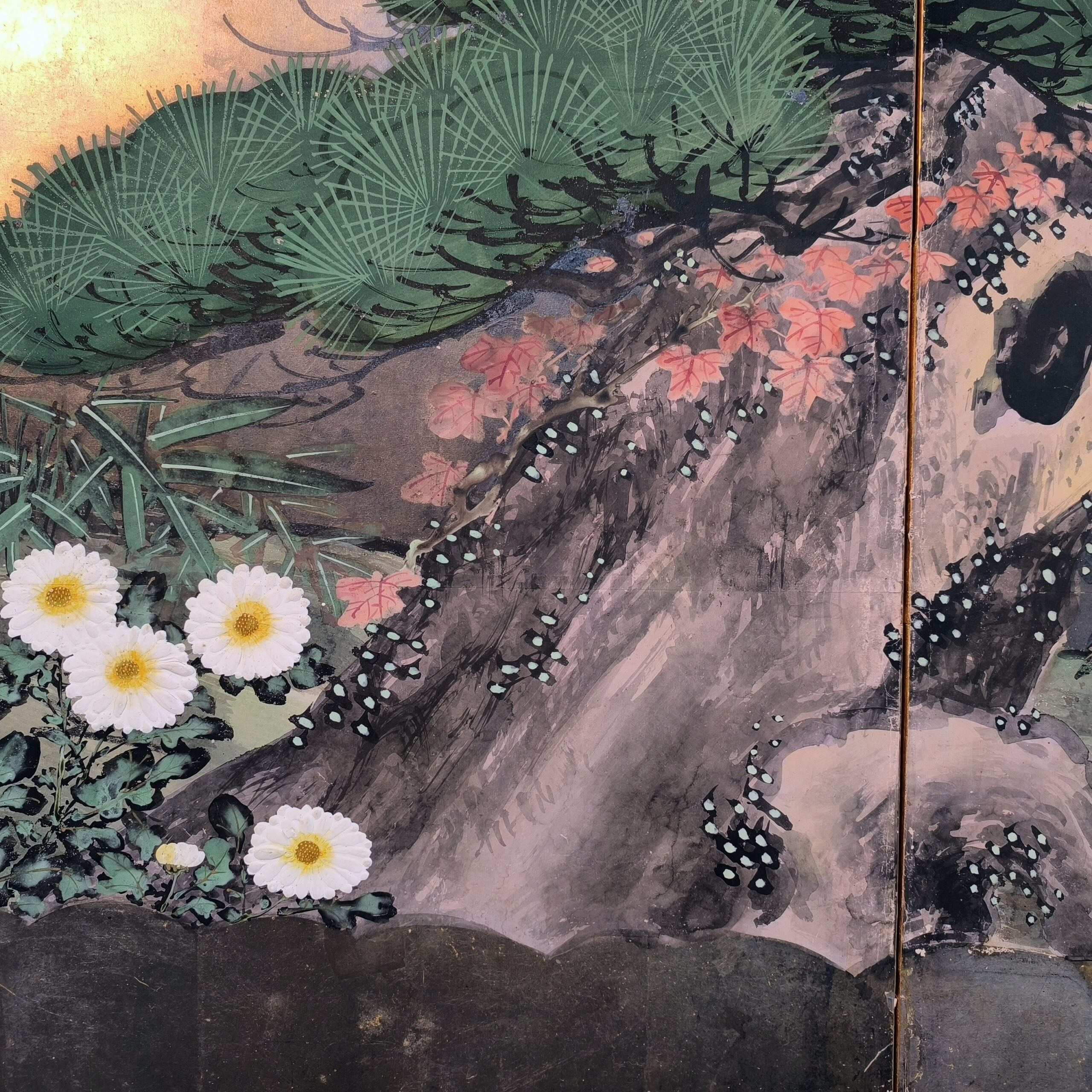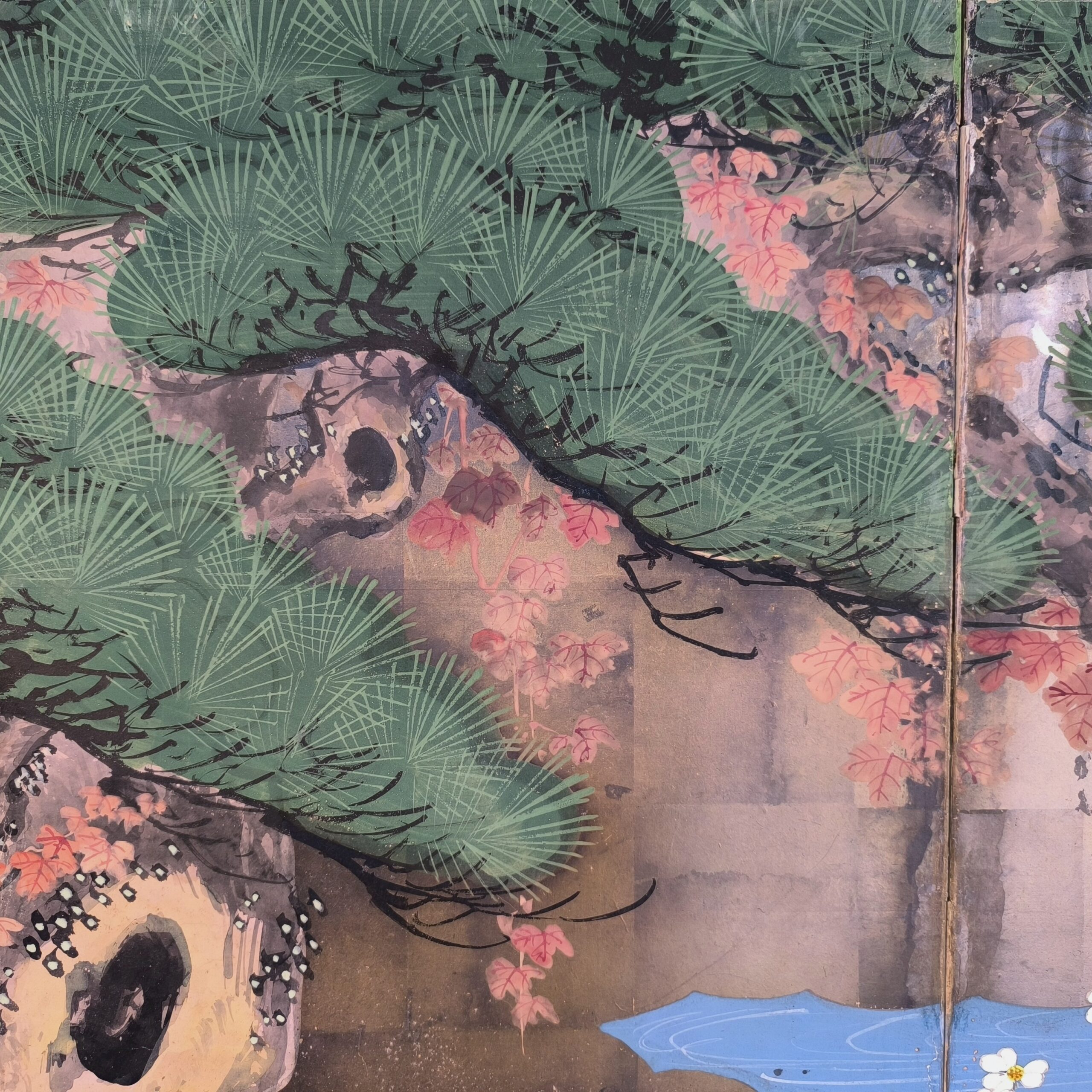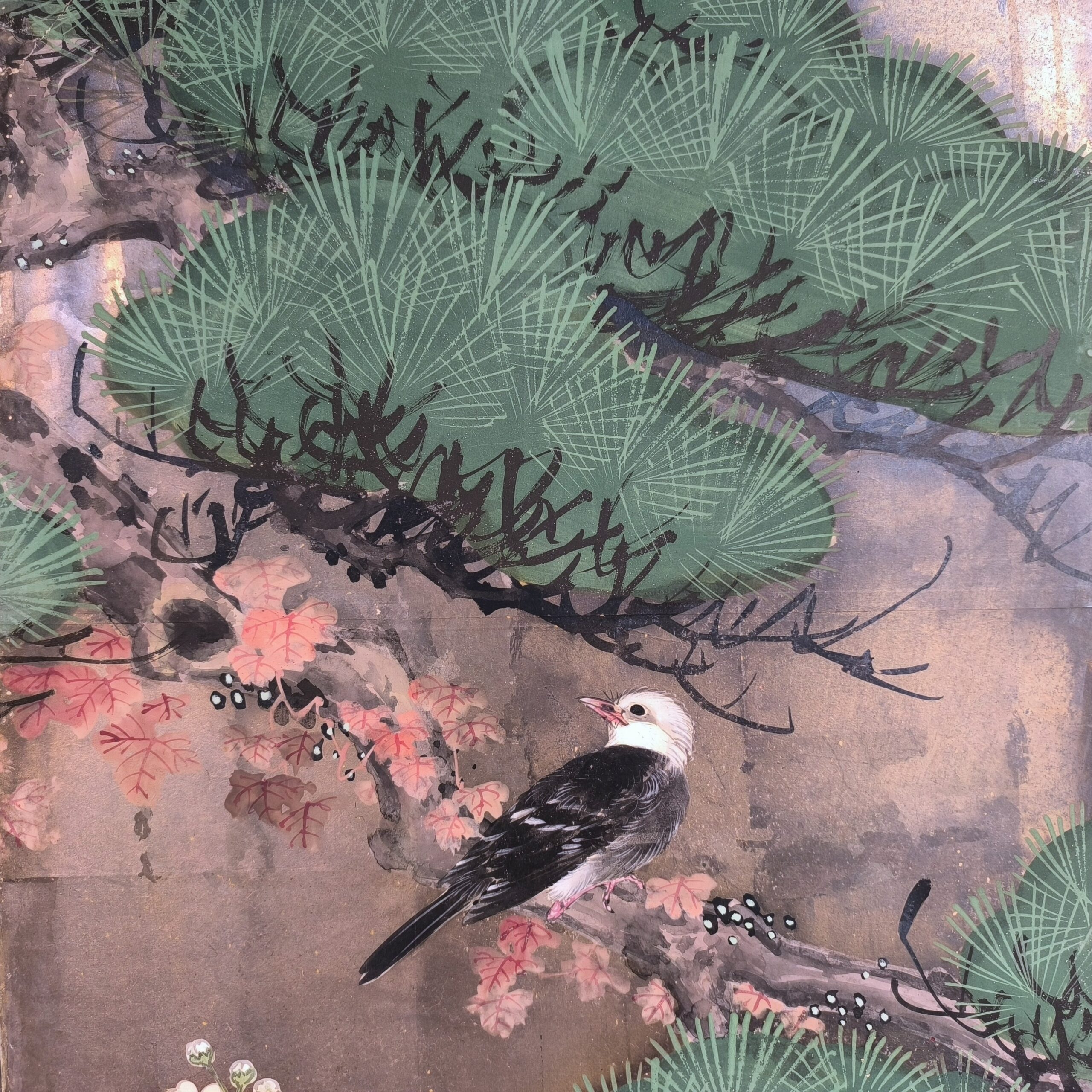 錆びた銀の風合いが、銀地ならではの風合いで色の対比もでて描写も細かくてバランスの取れた屏風です。