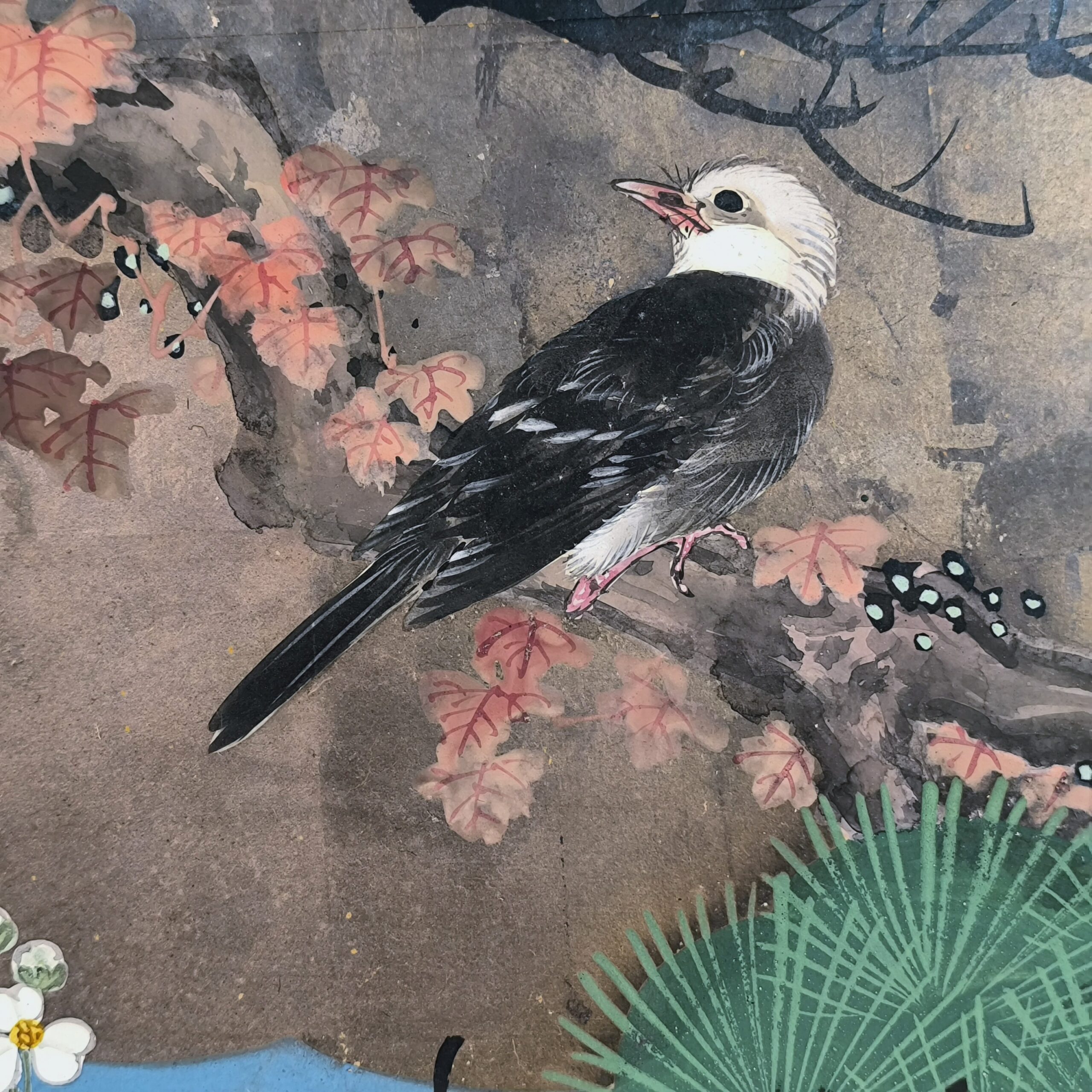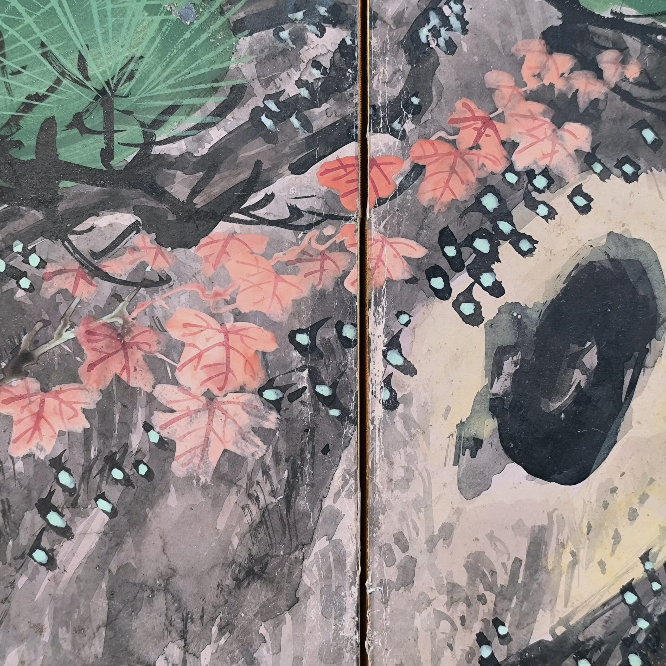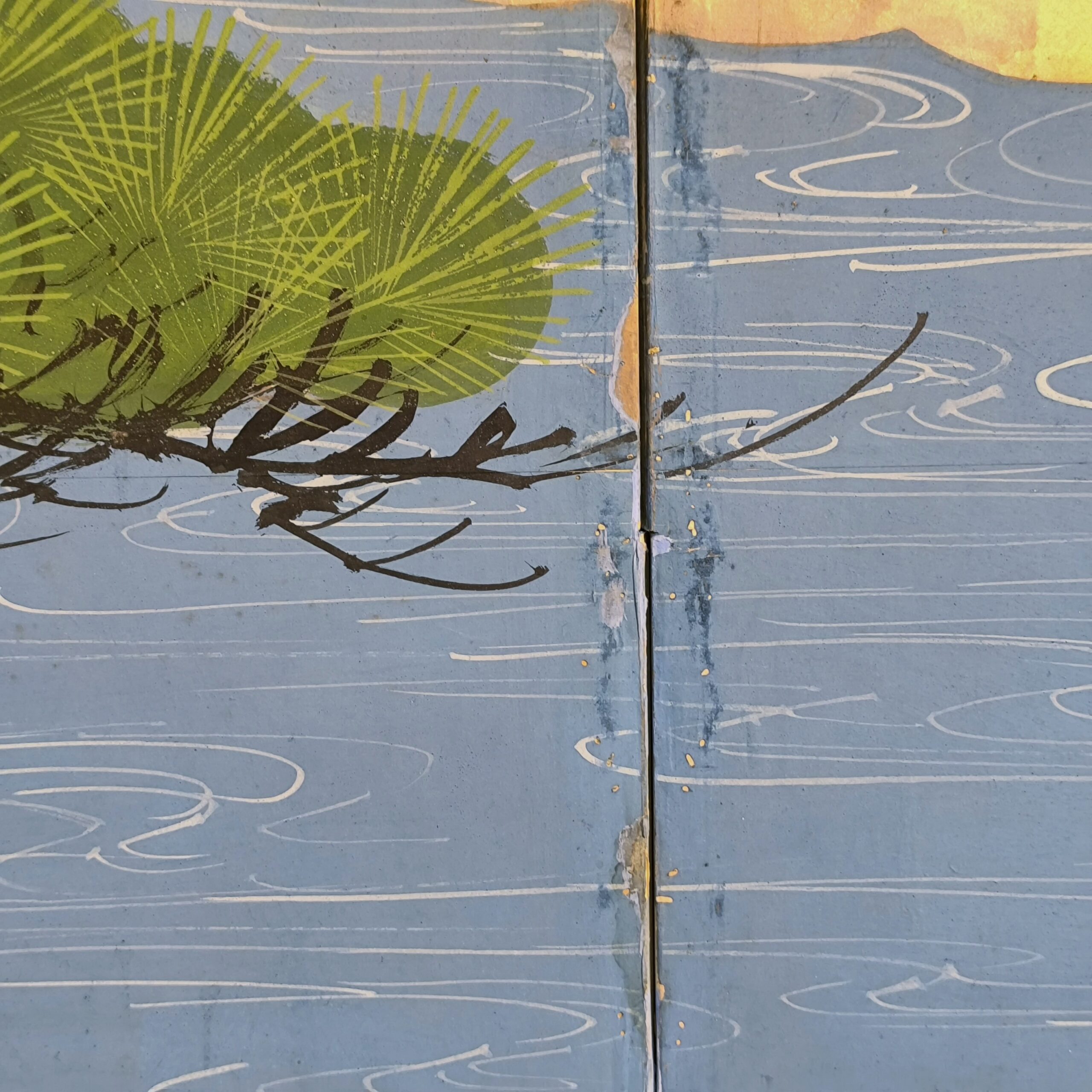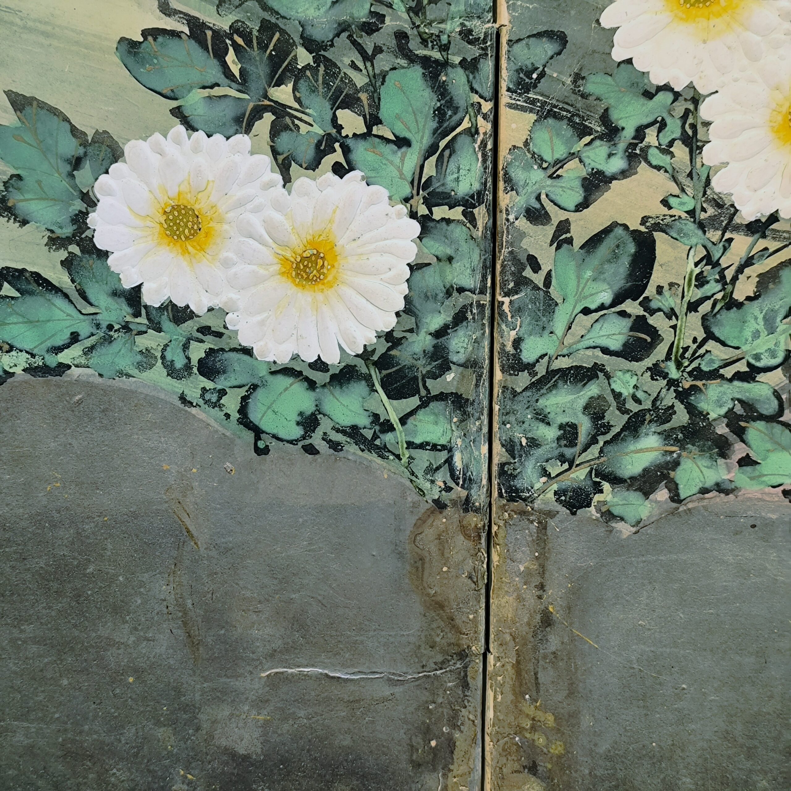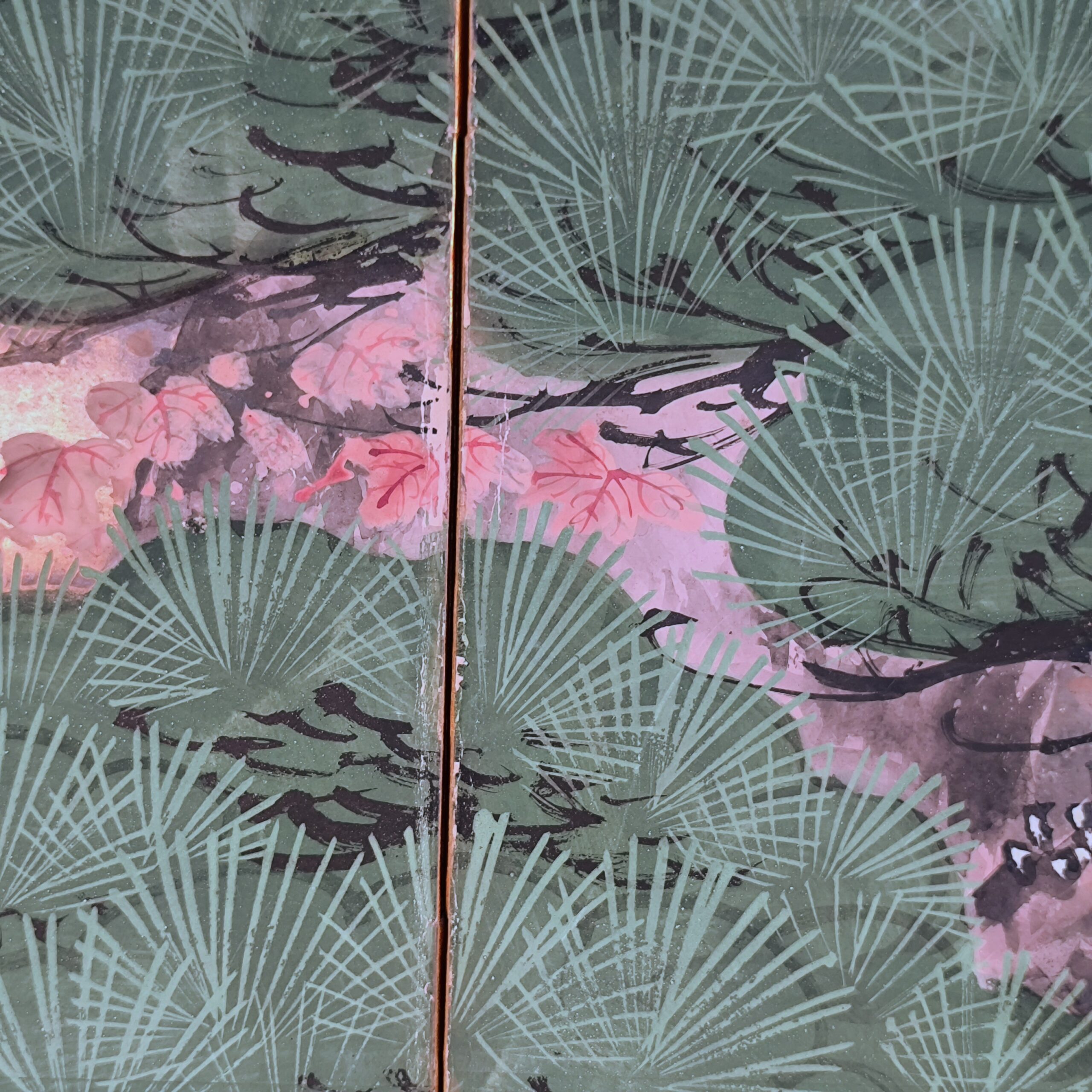 錆びた銀の風合いが、銀地ならではの風合いで色の対比もでて描写も細かくてバランスの取れた屏風です。