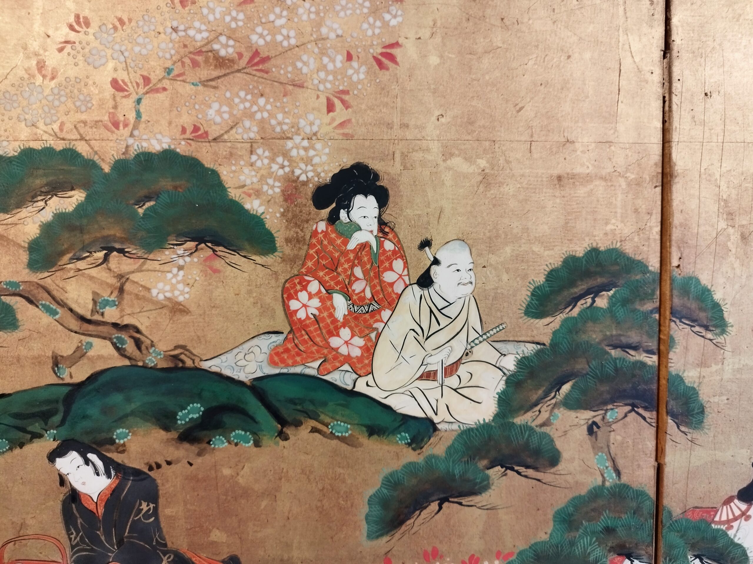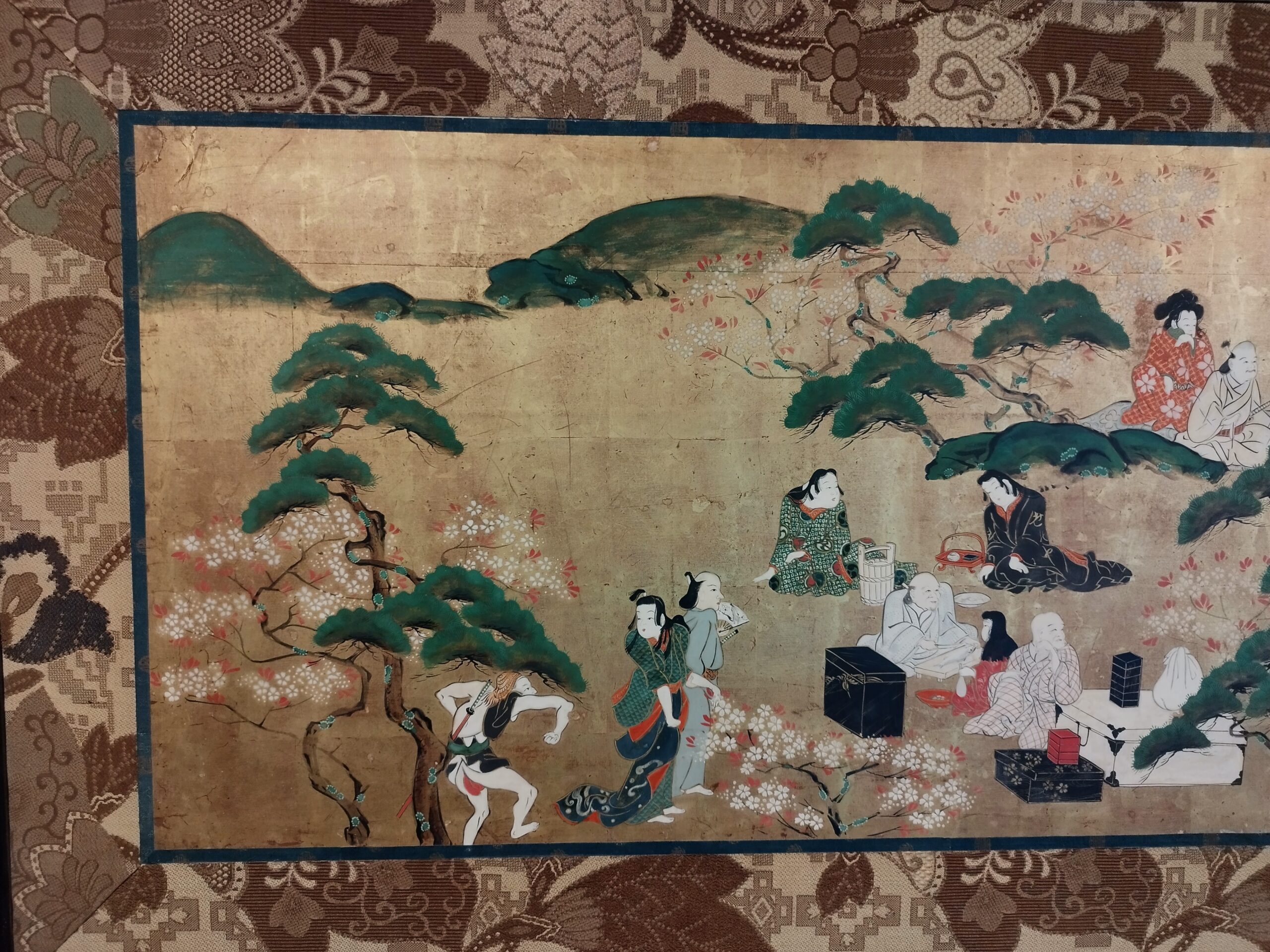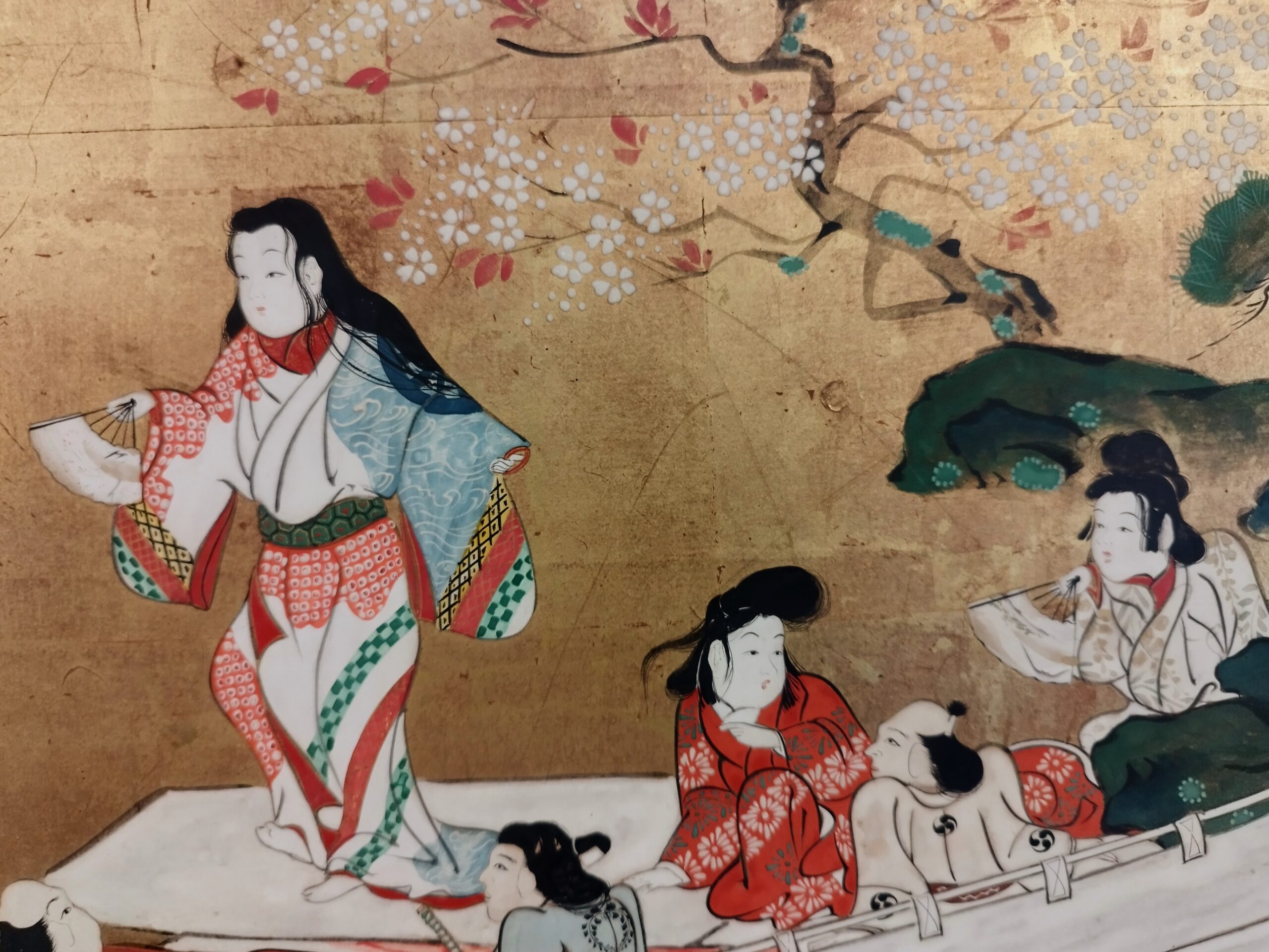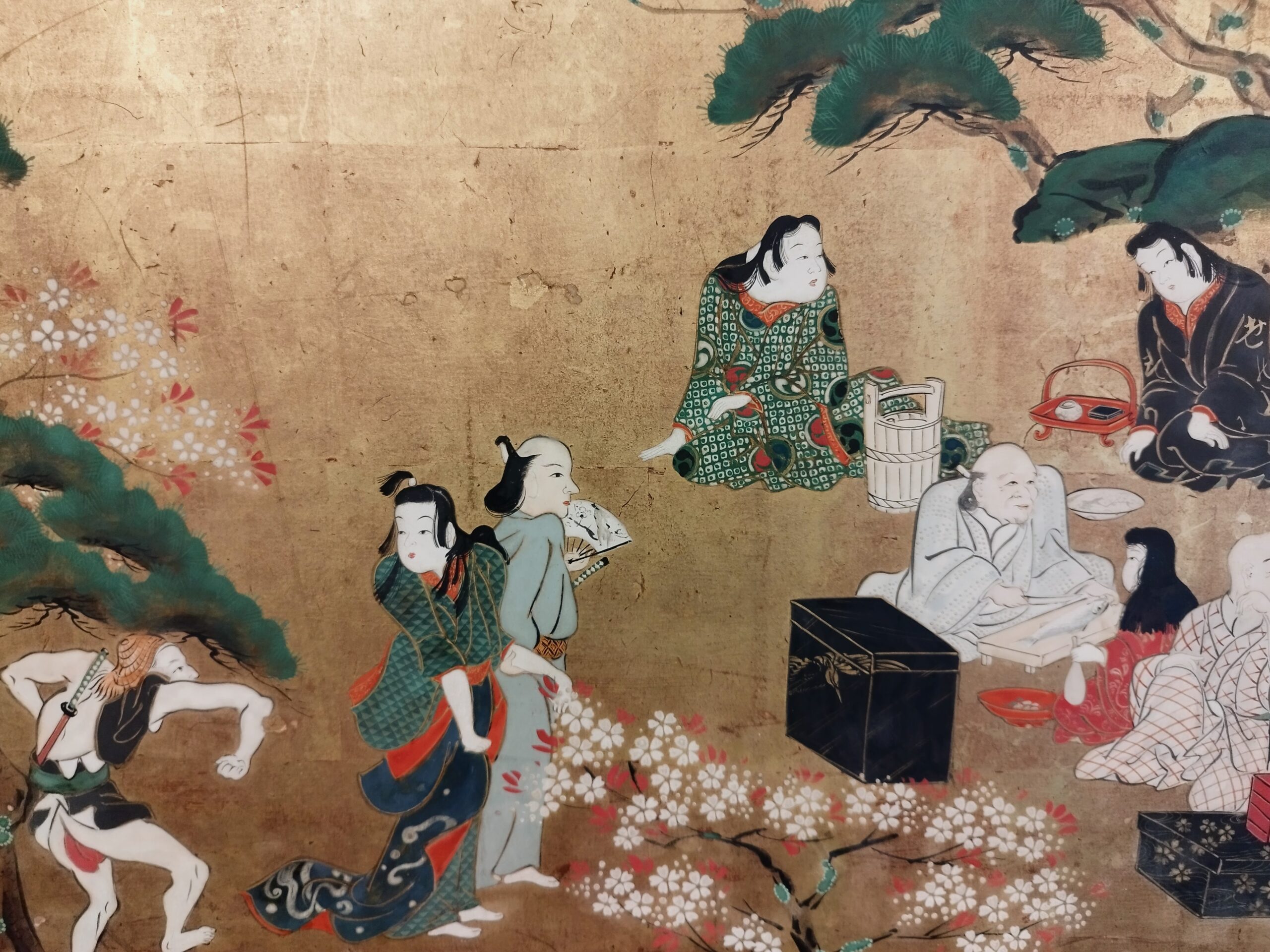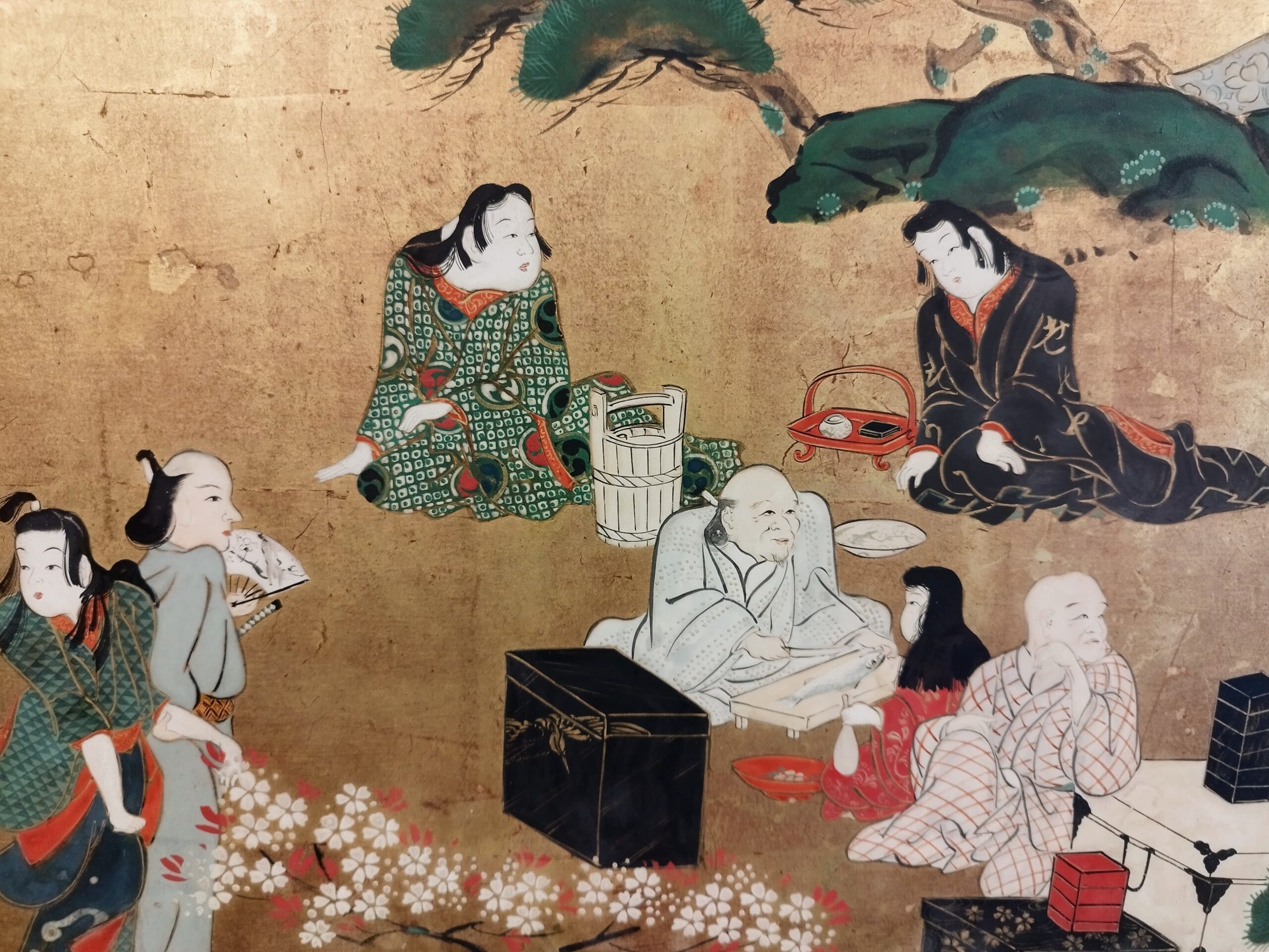japanese antique 2 hold paper screen painted in ink and color on a gold ground with Cherry blossom viewing