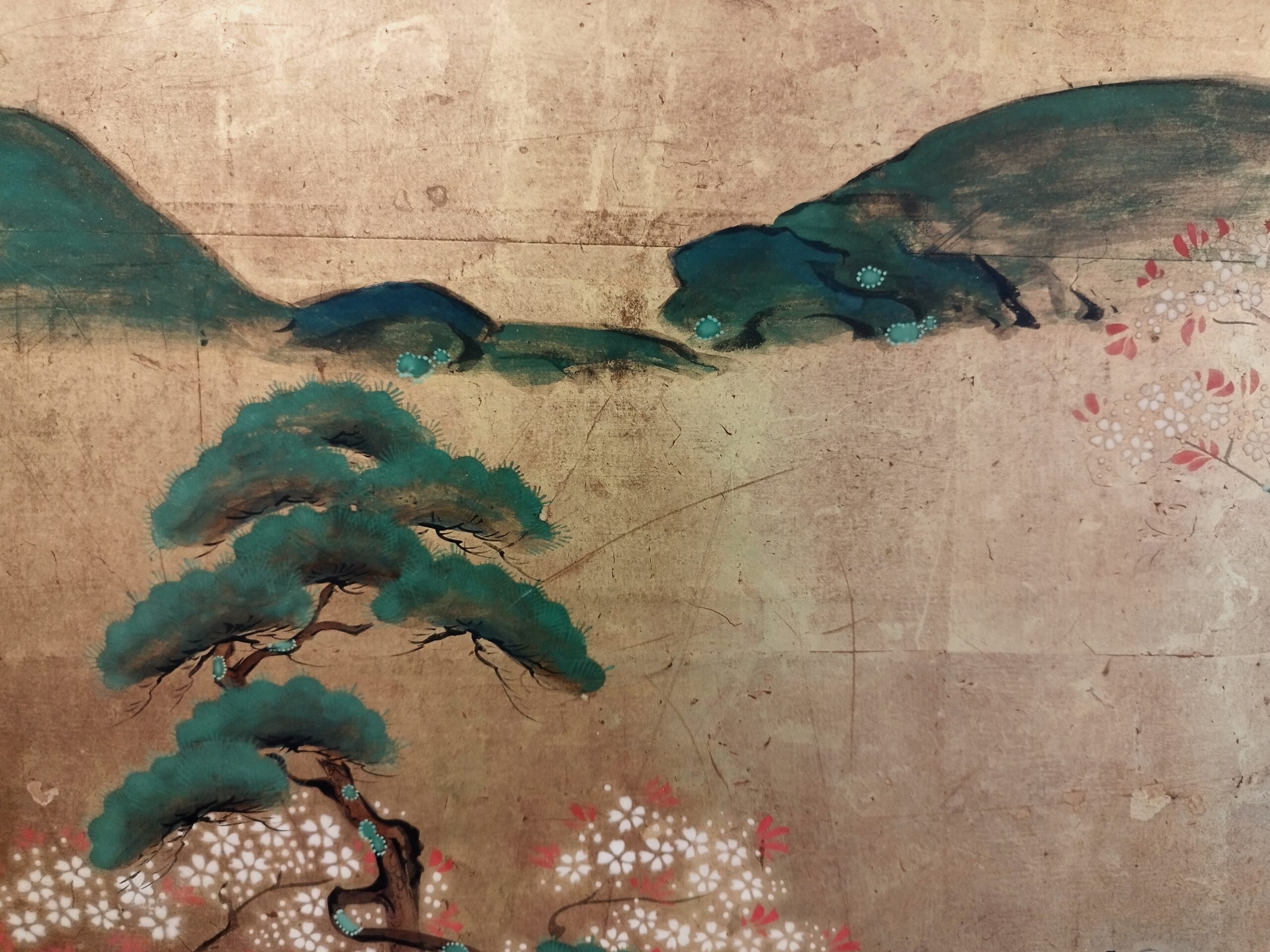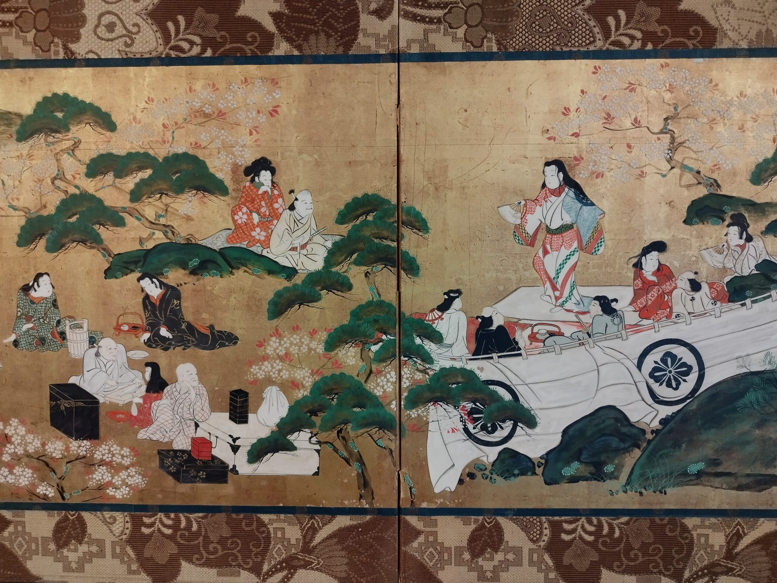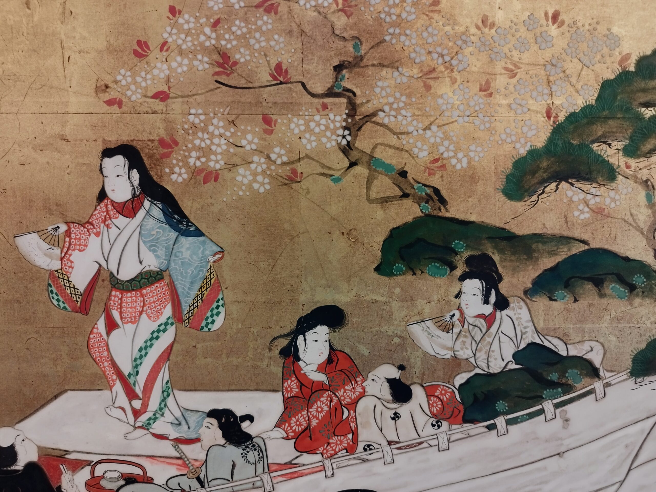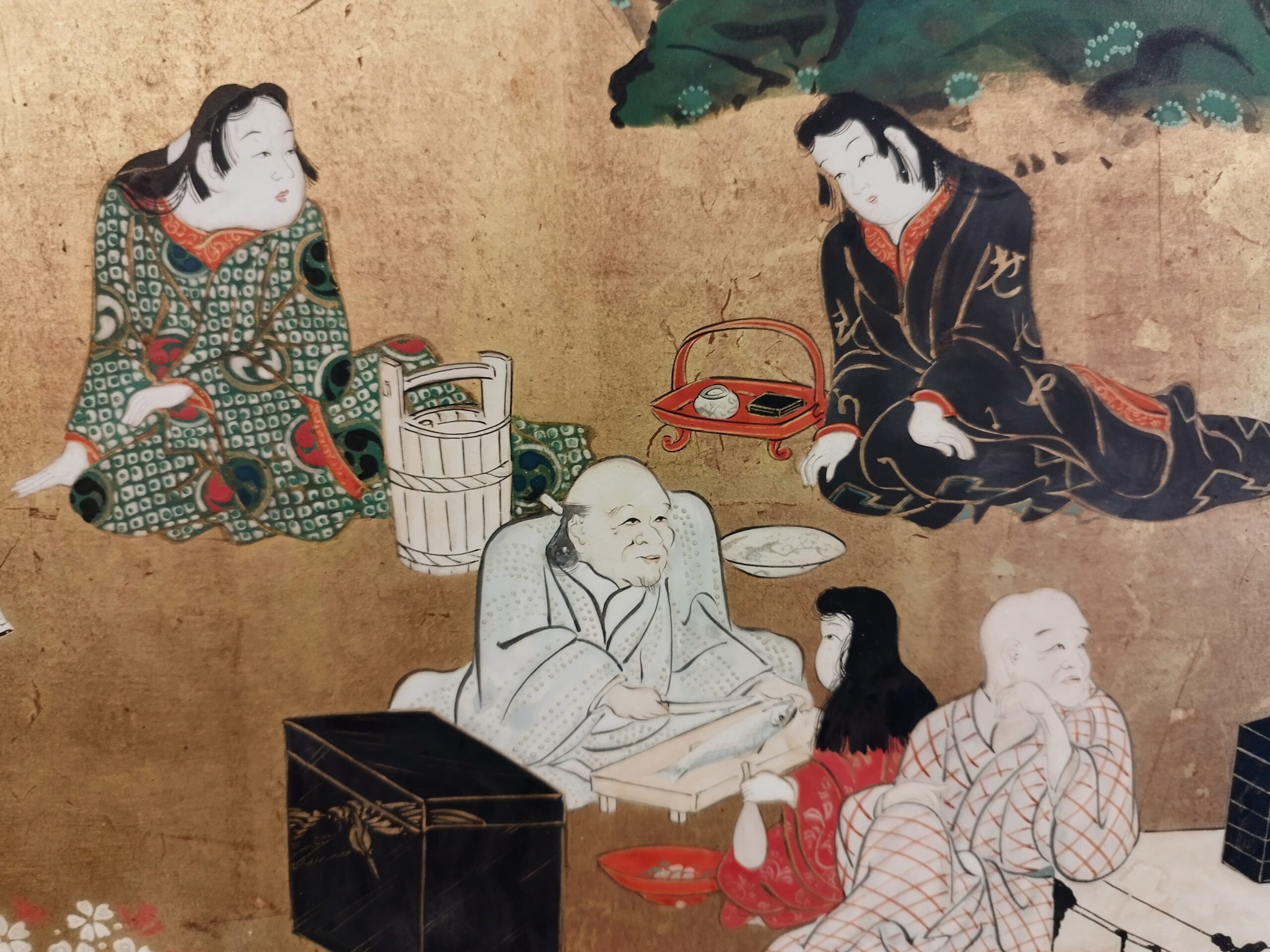japanese antique 2 hold paper screen painted in ink and color on a gold ground with Cherry blossom viewing