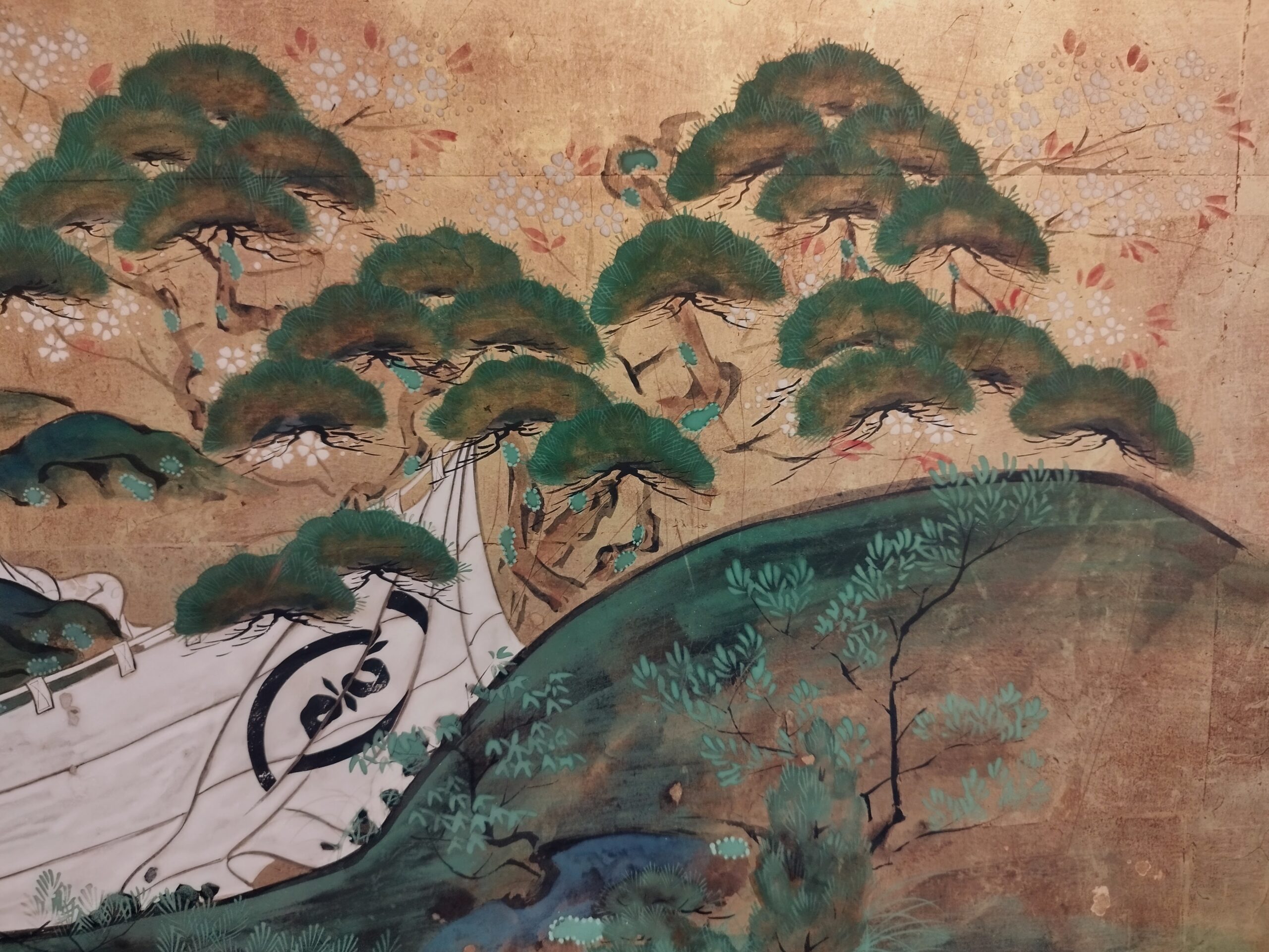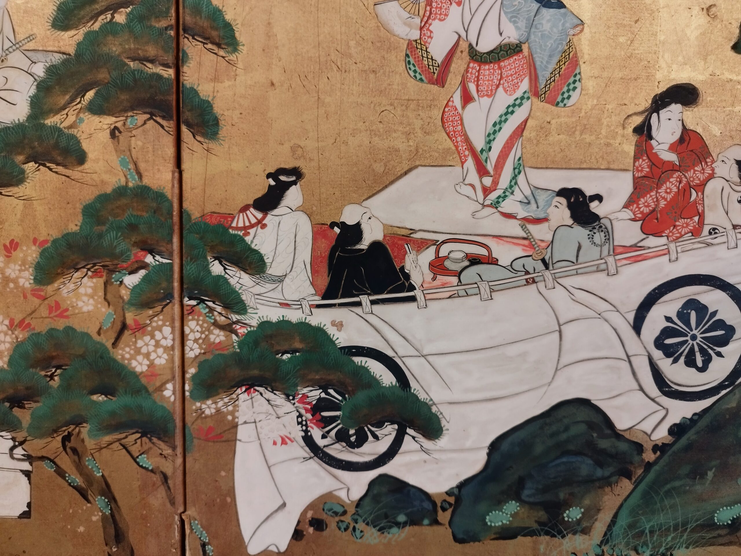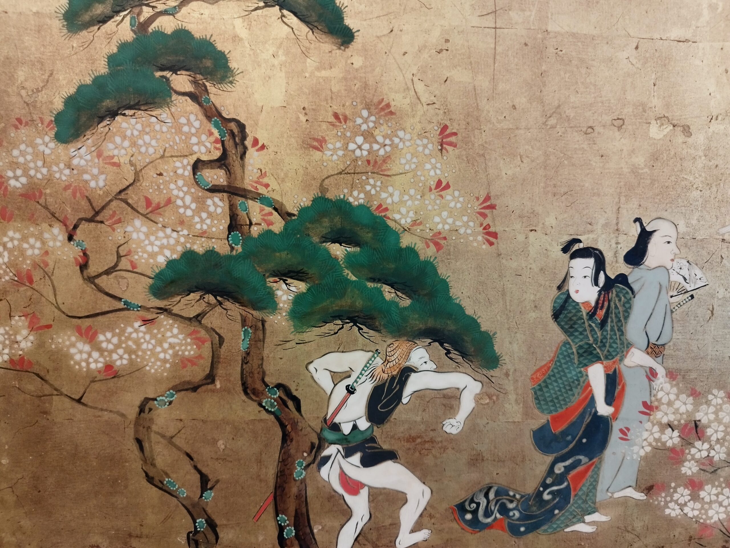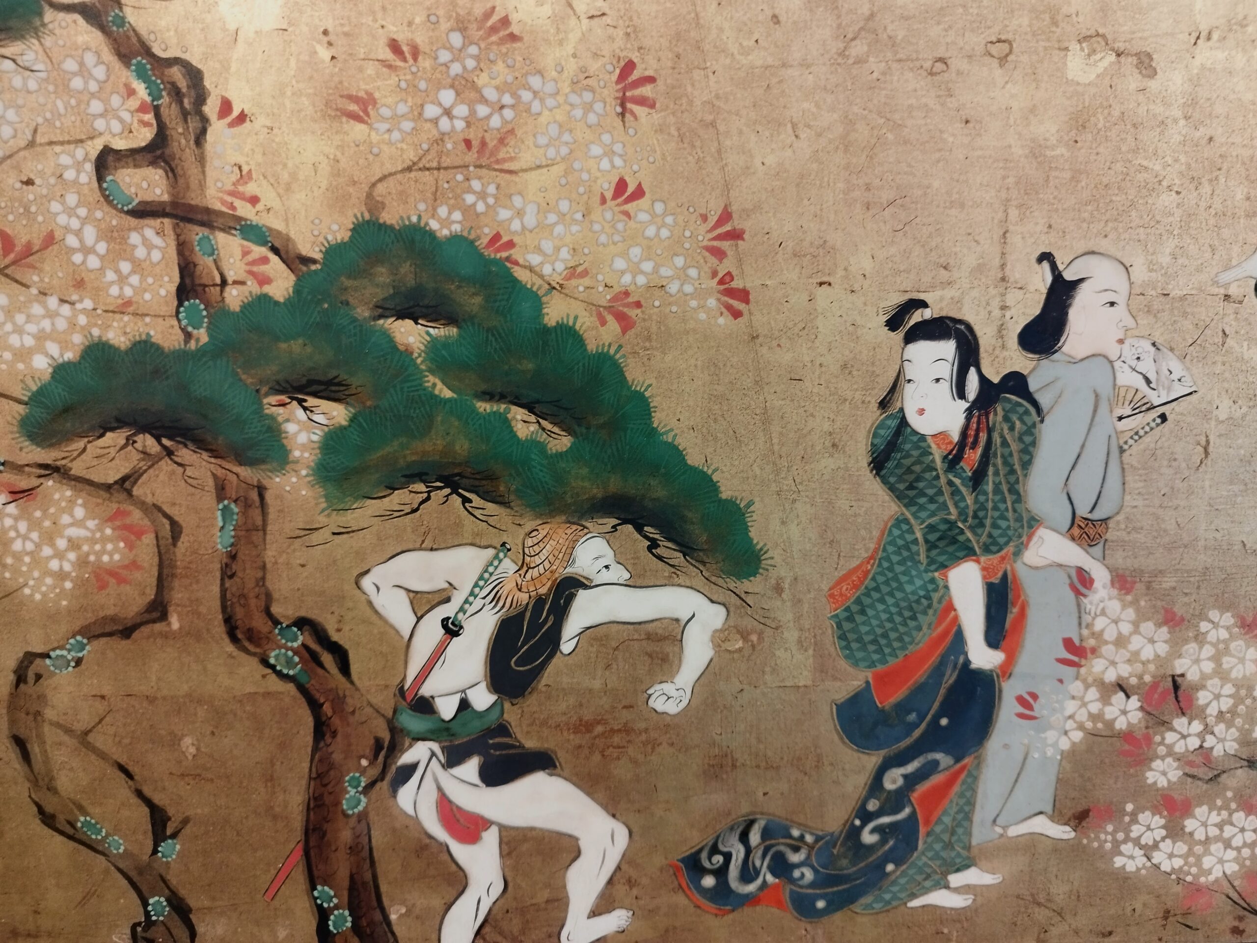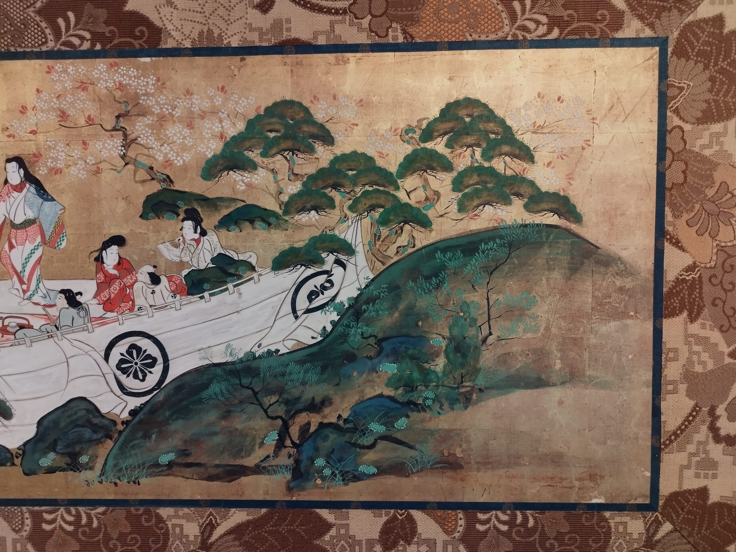 japanese antique 2 hold paper screen painted in ink and color on a gold ground with Cherry blossom viewing