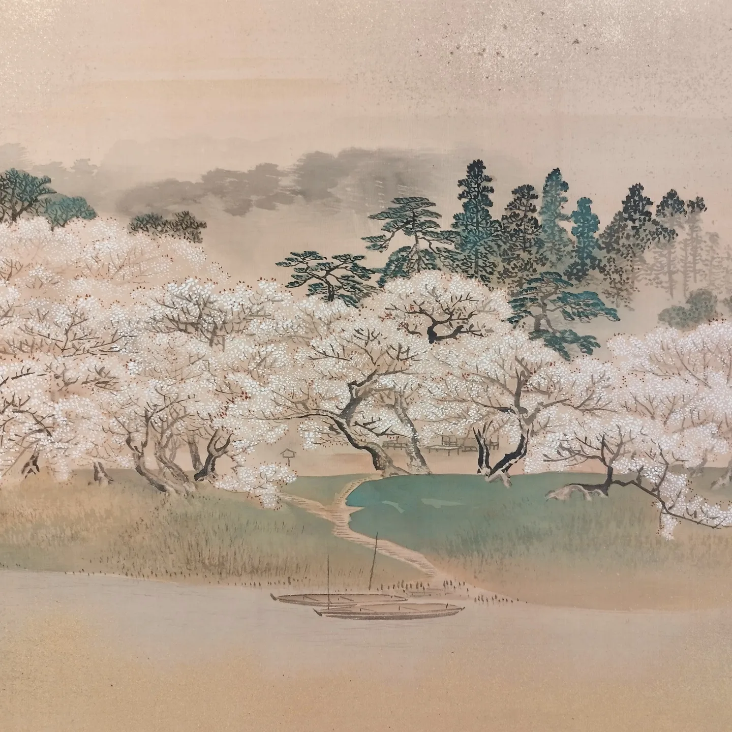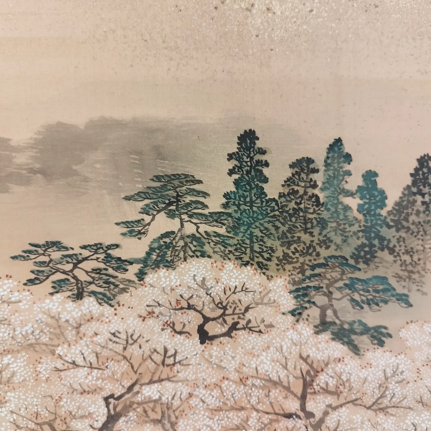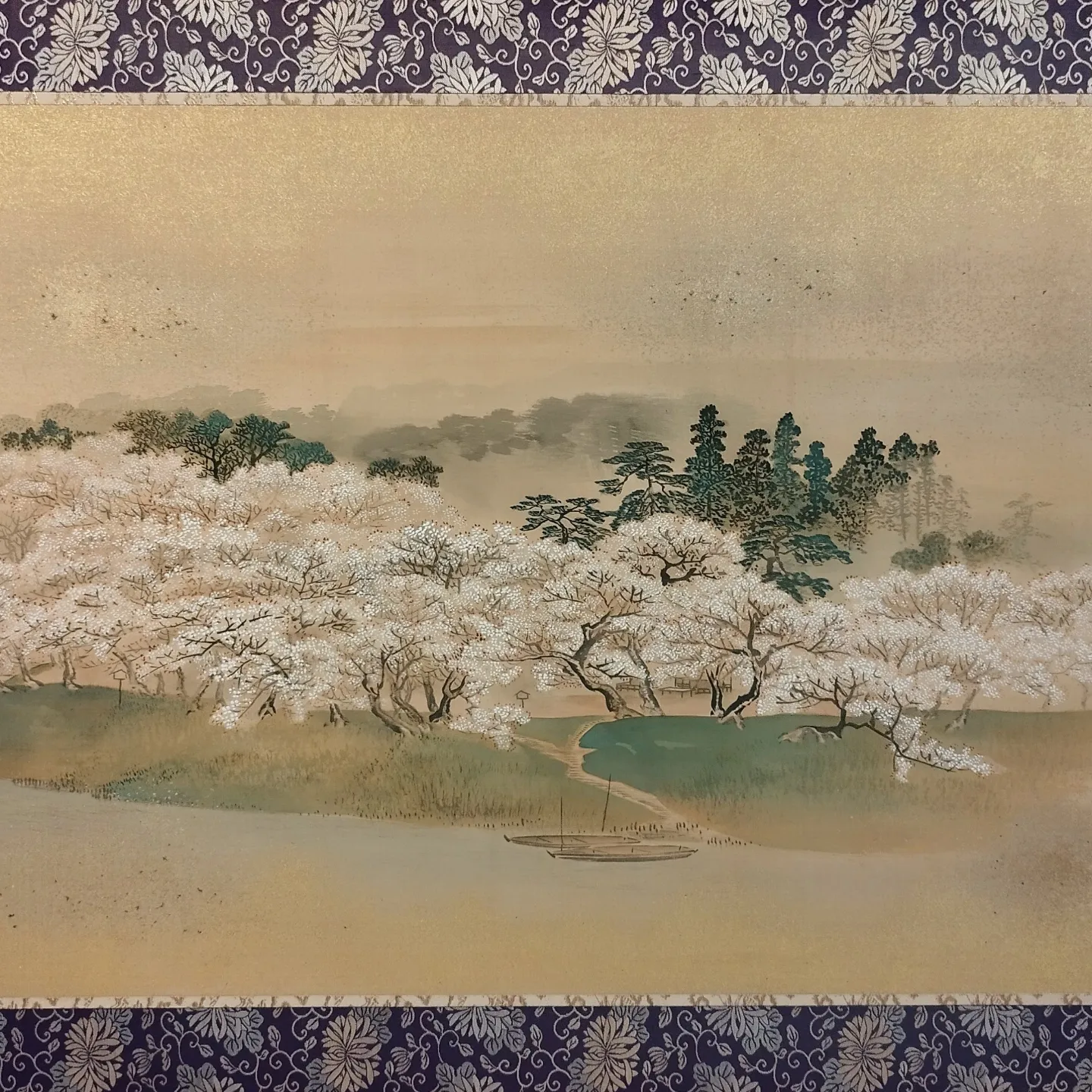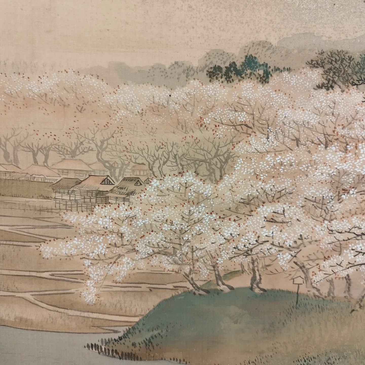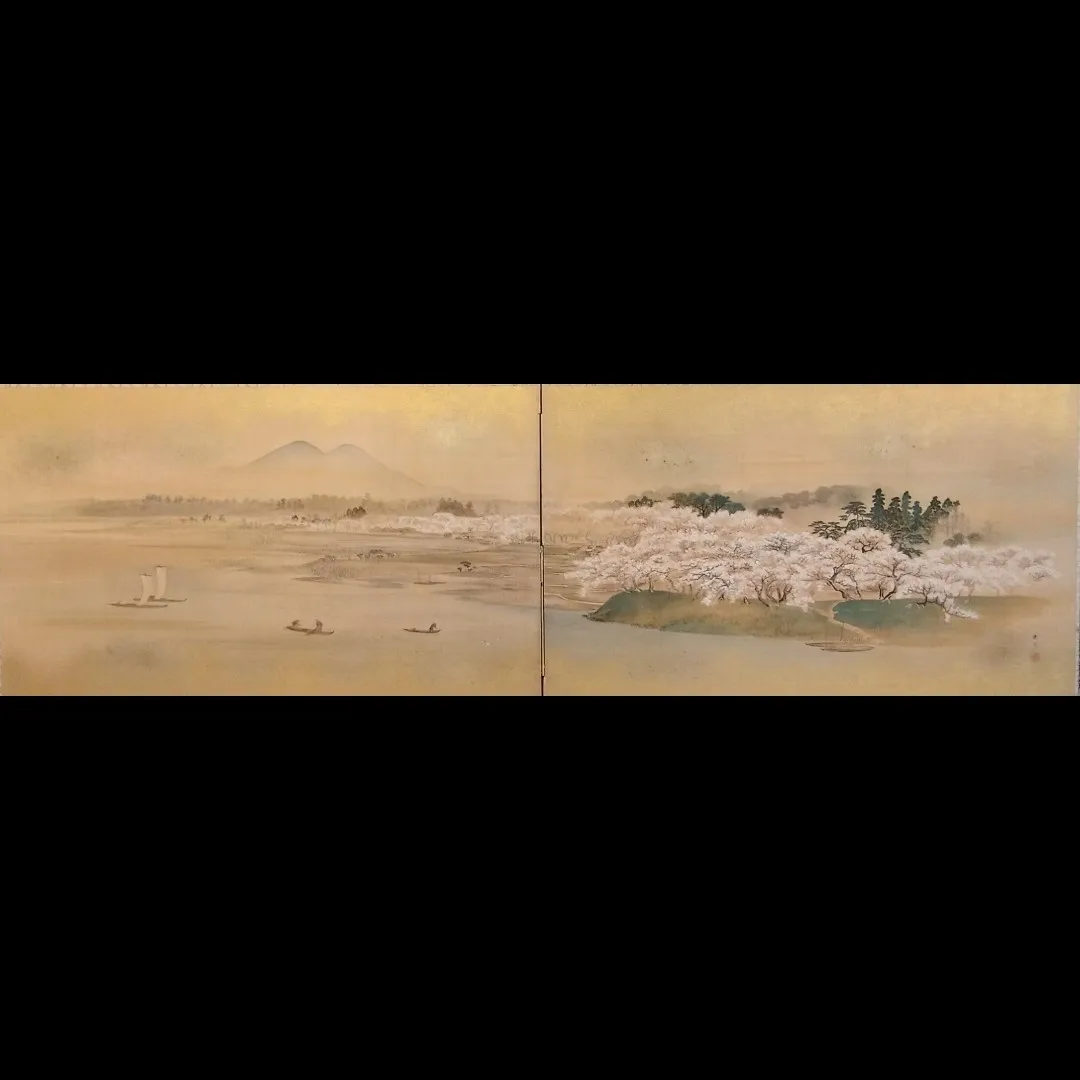 japanese antique 2 hold silk screen painted in ink and color with cherry blossom landscape by Gyokushou Kawabata