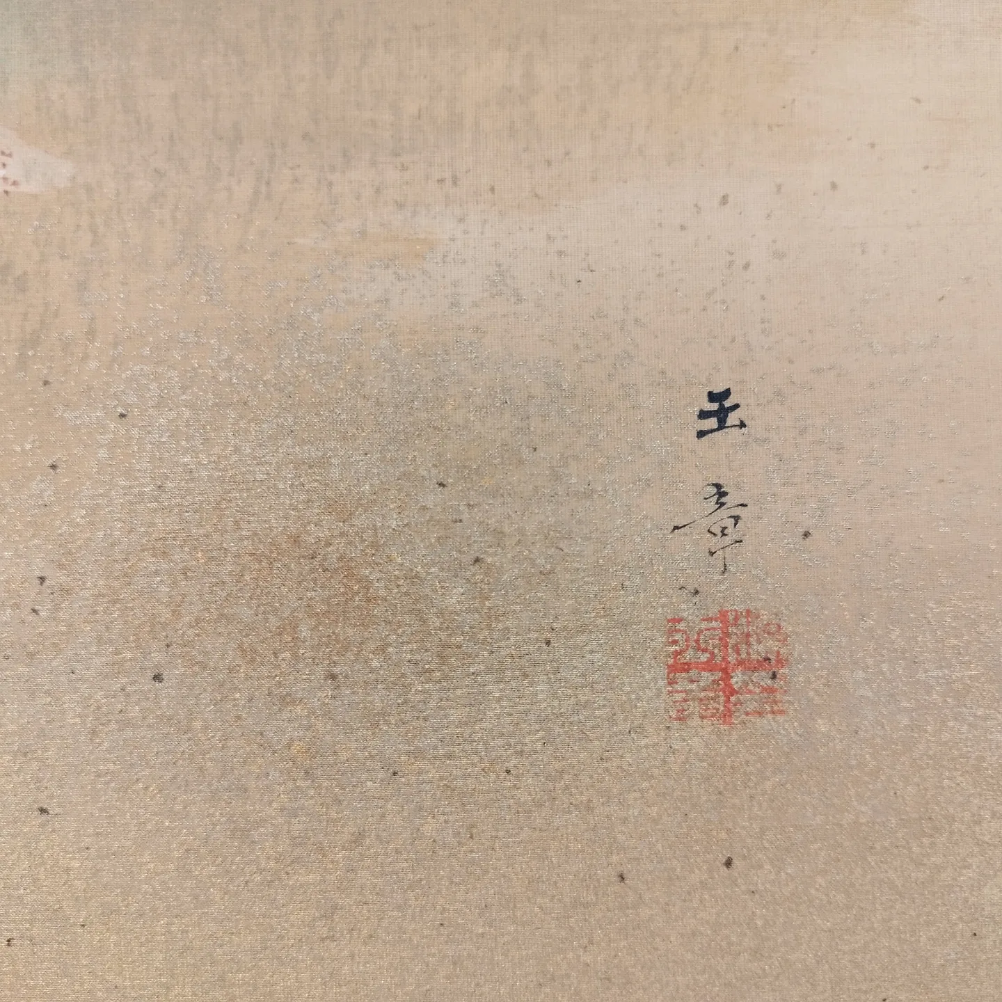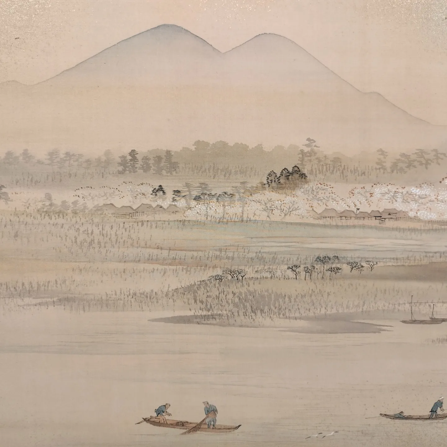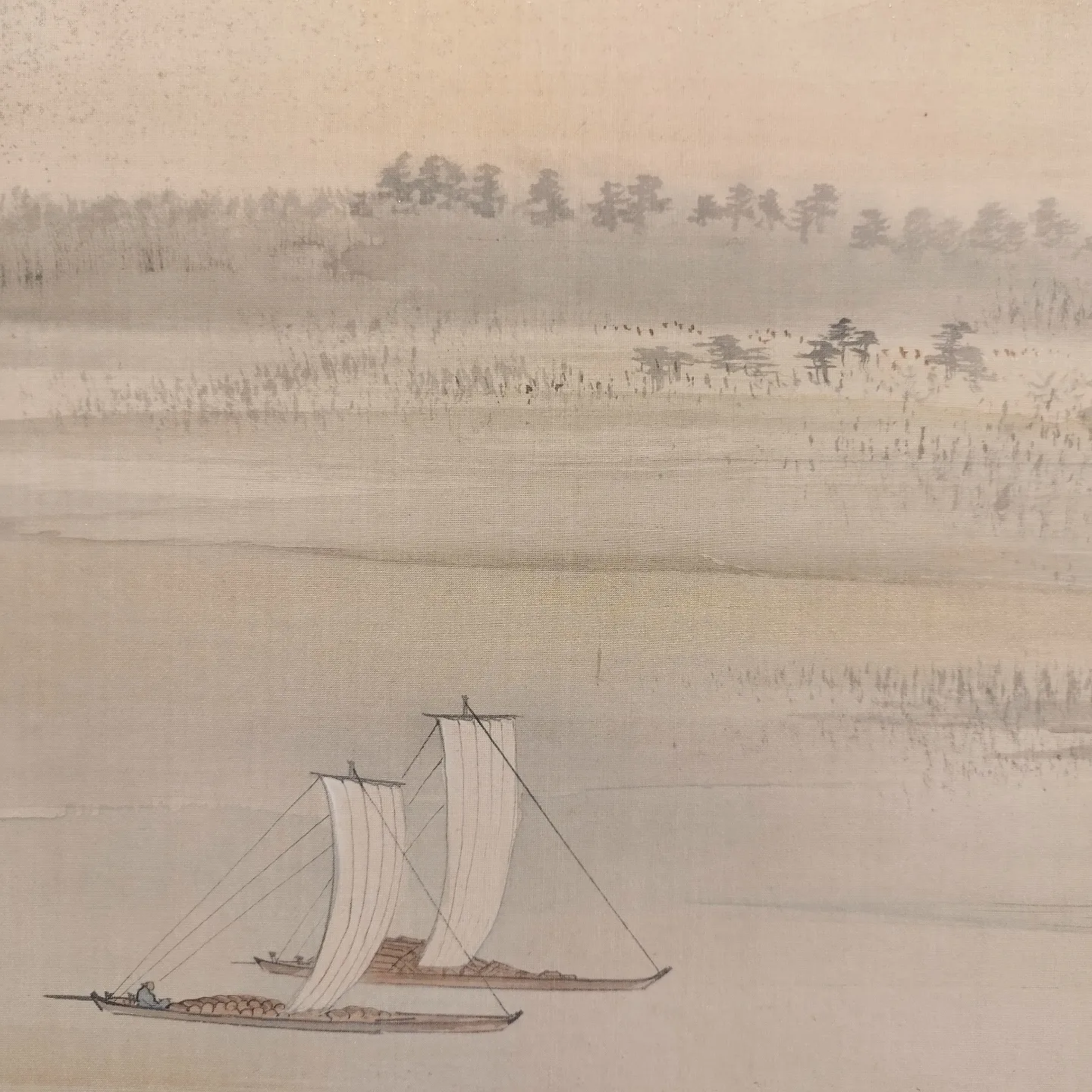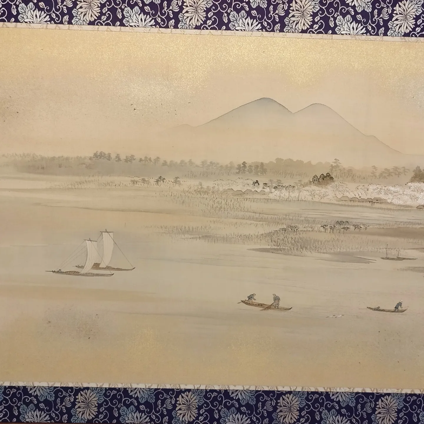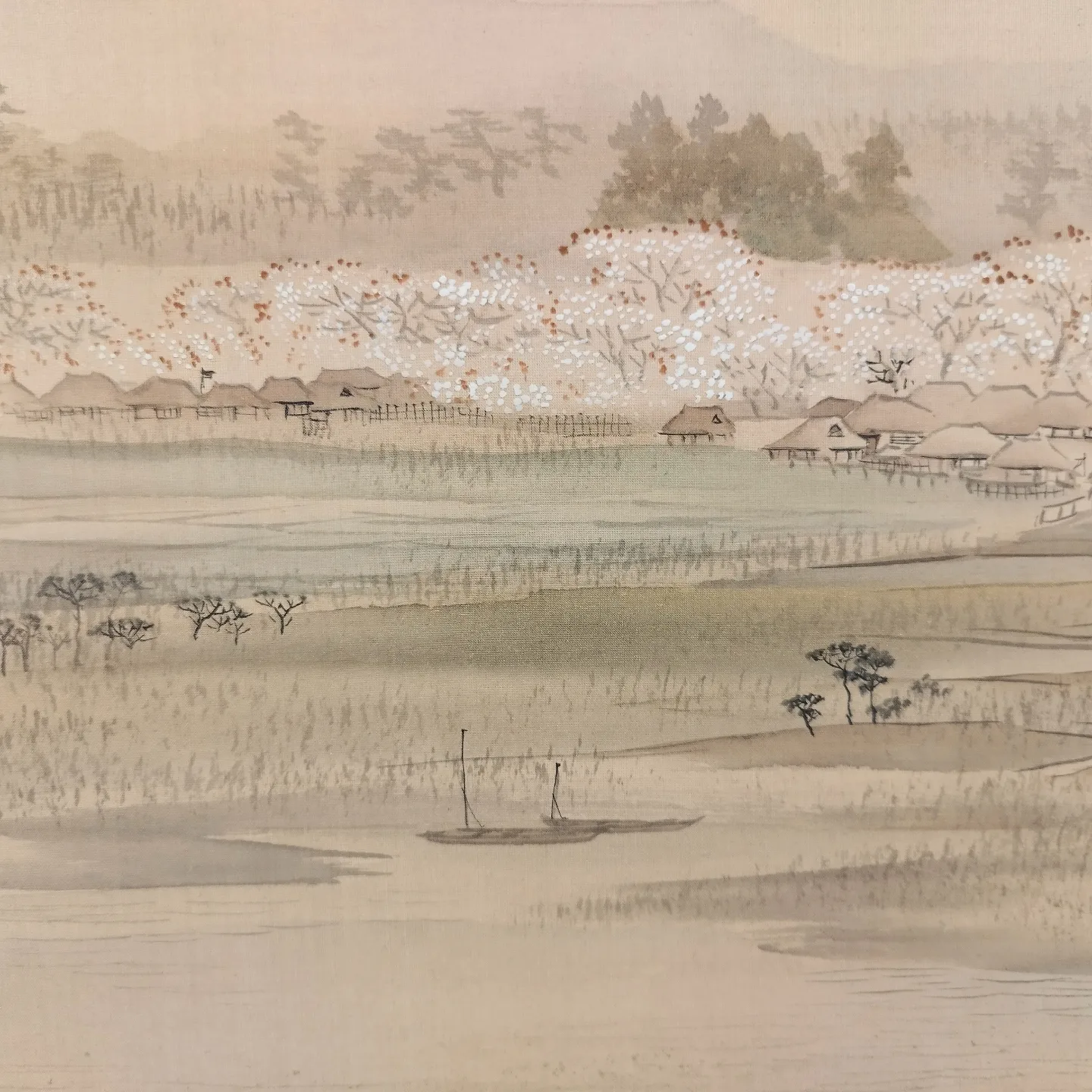 japanese antique 2 hold silk screen painted in ink and color with cherry blossom landscape by Gyokushou Kawabata