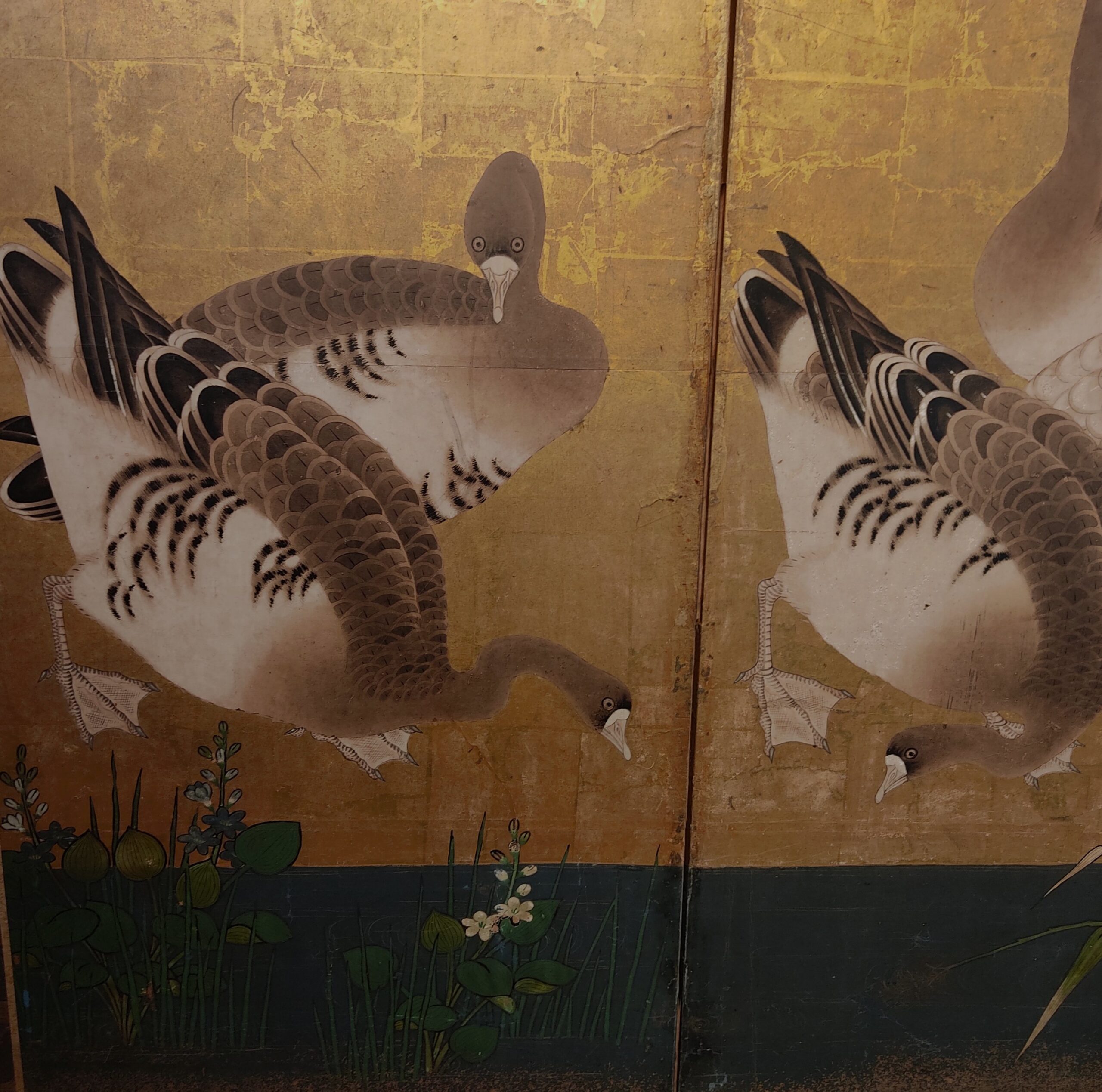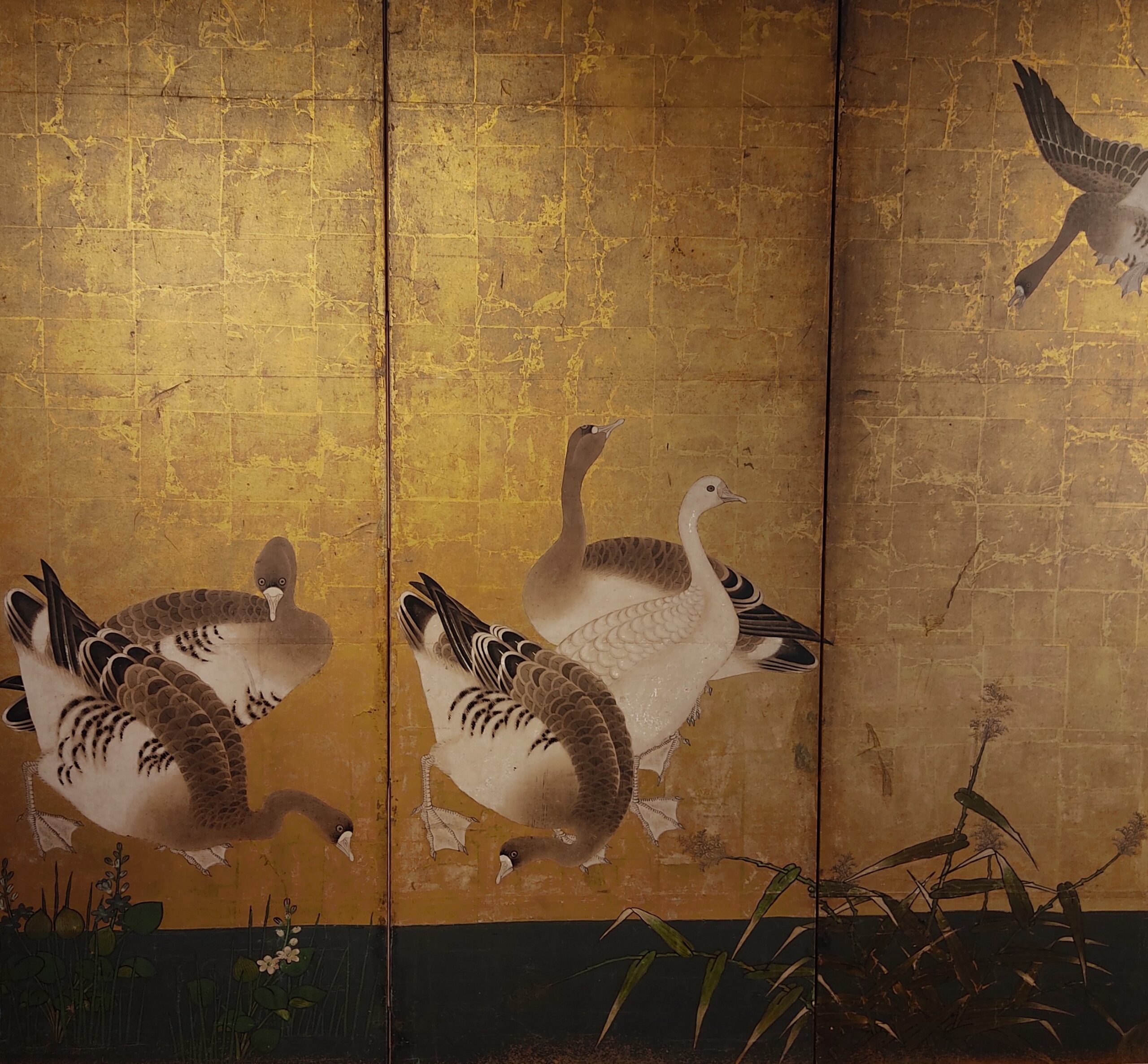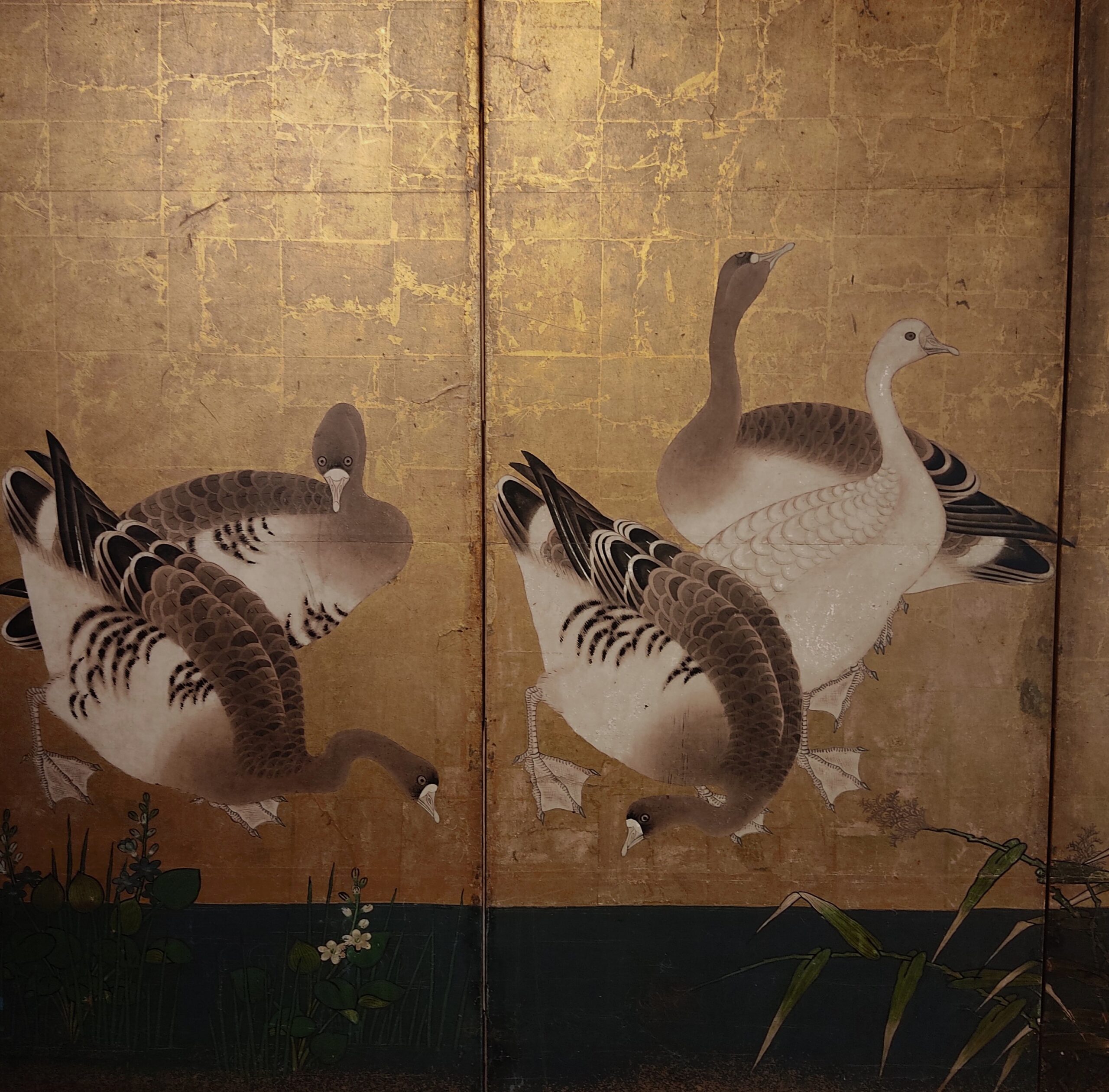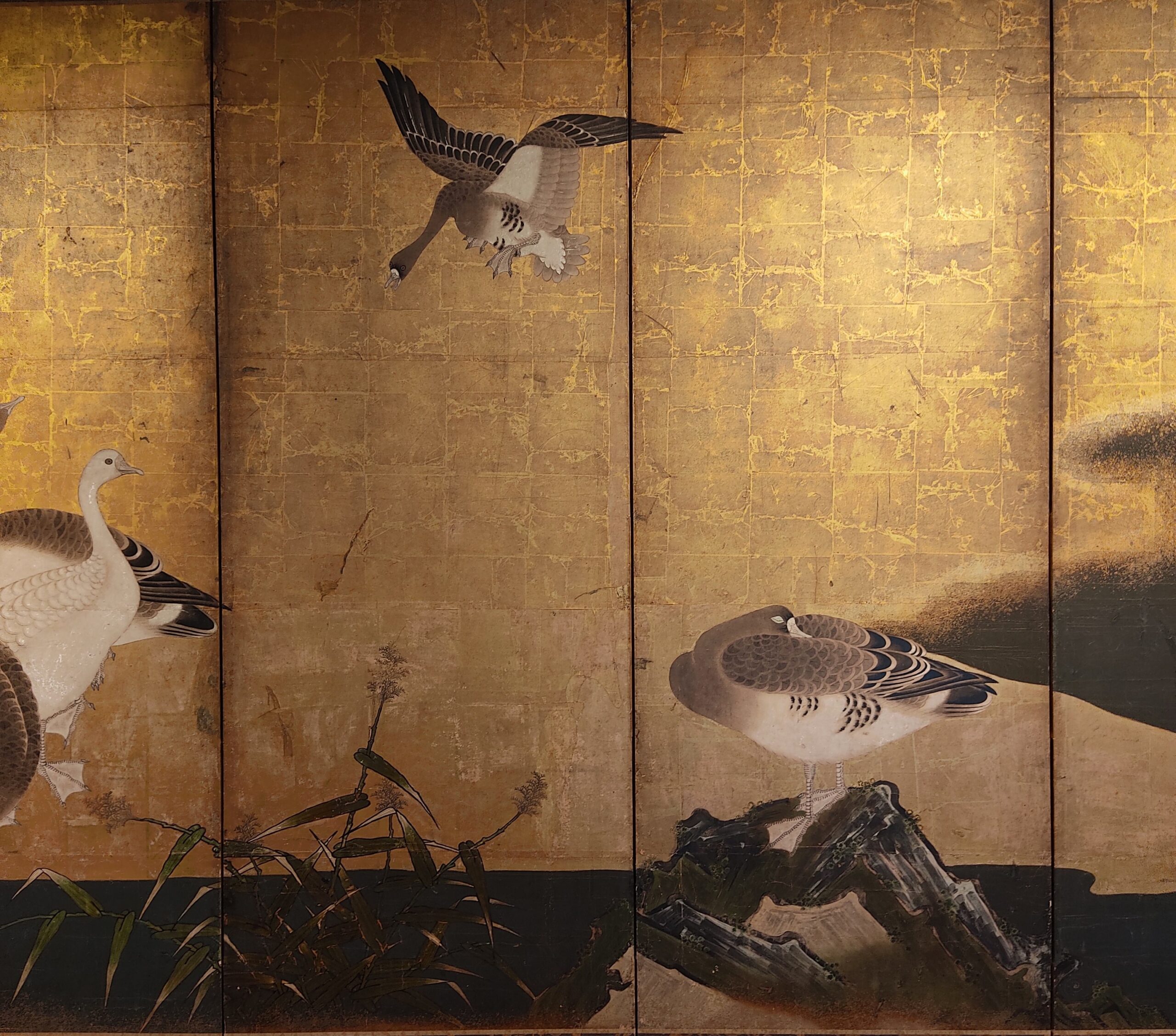 水辺で戯れる雁たちが緻密に描かており、金箔の風合いがとてもいいです。