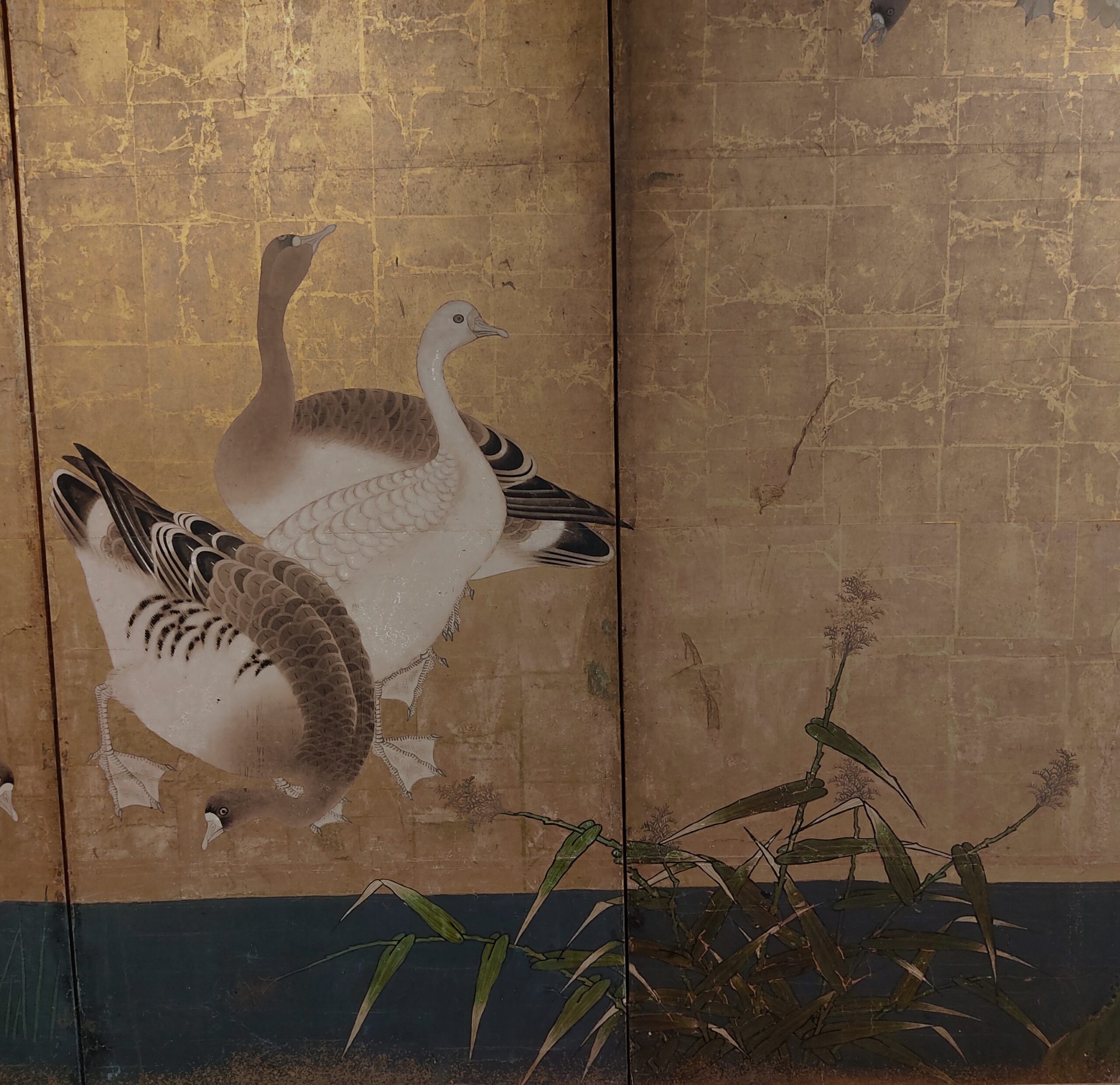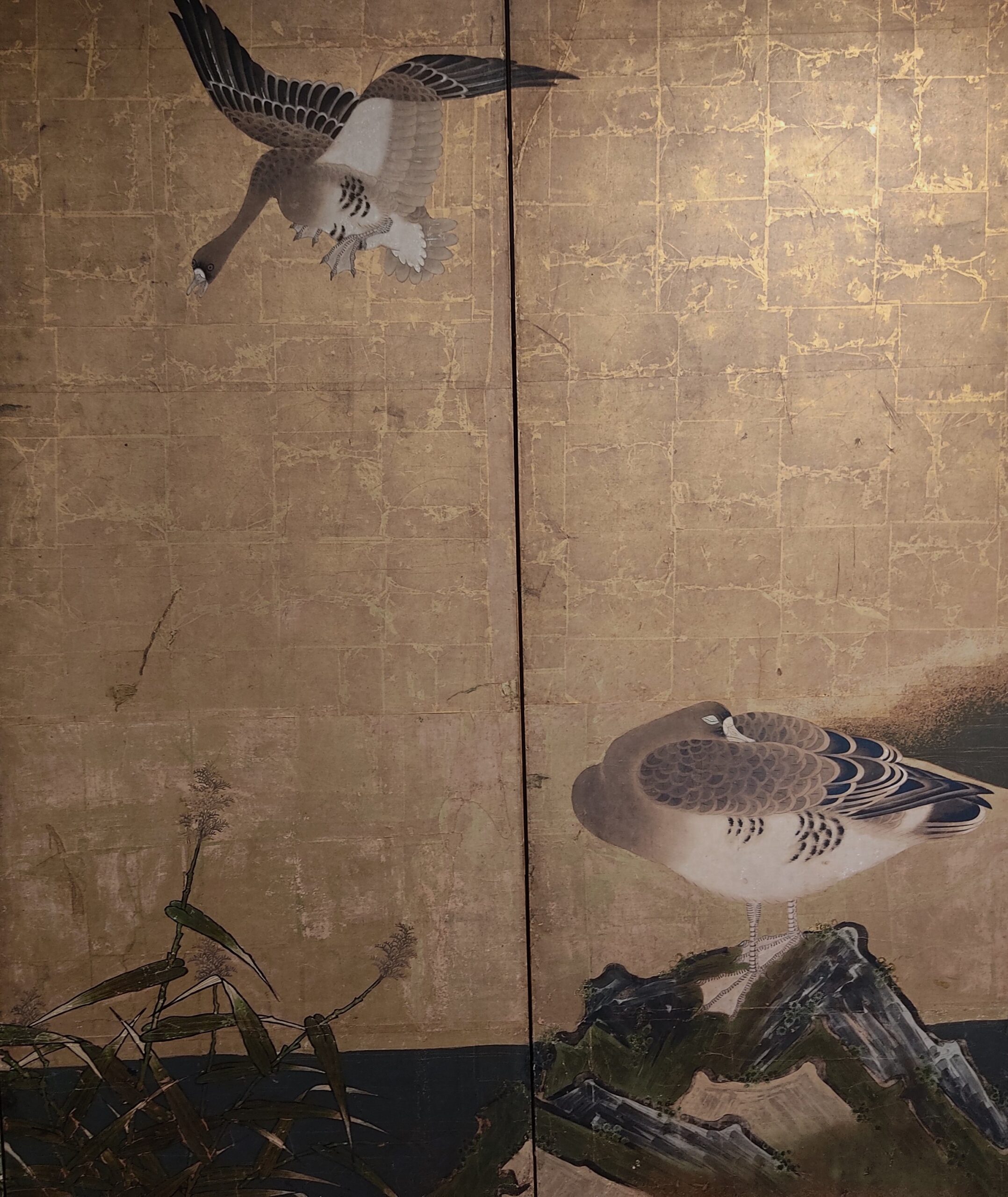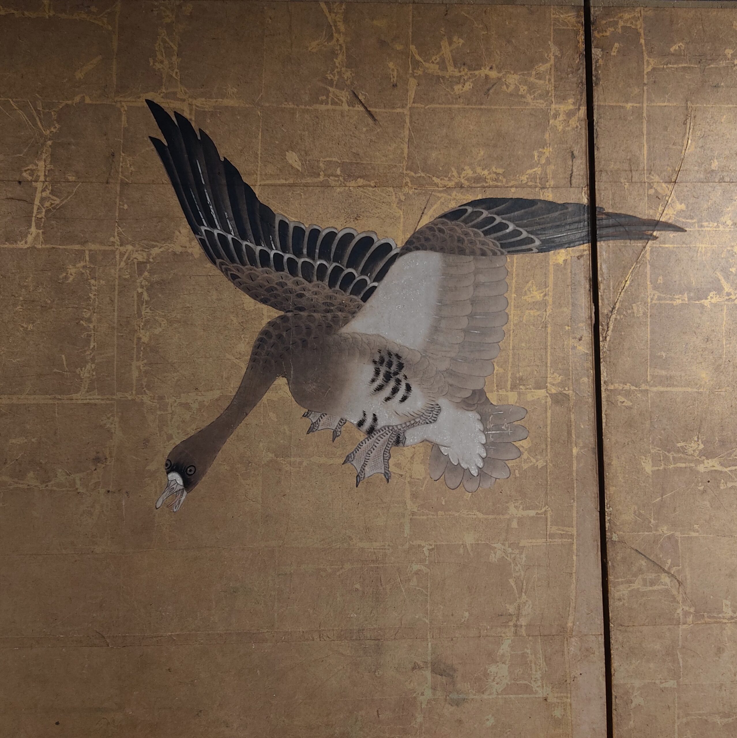 水辺で戯れる雁たちが緻密に描かており、金箔の風合いがとてもいいです。