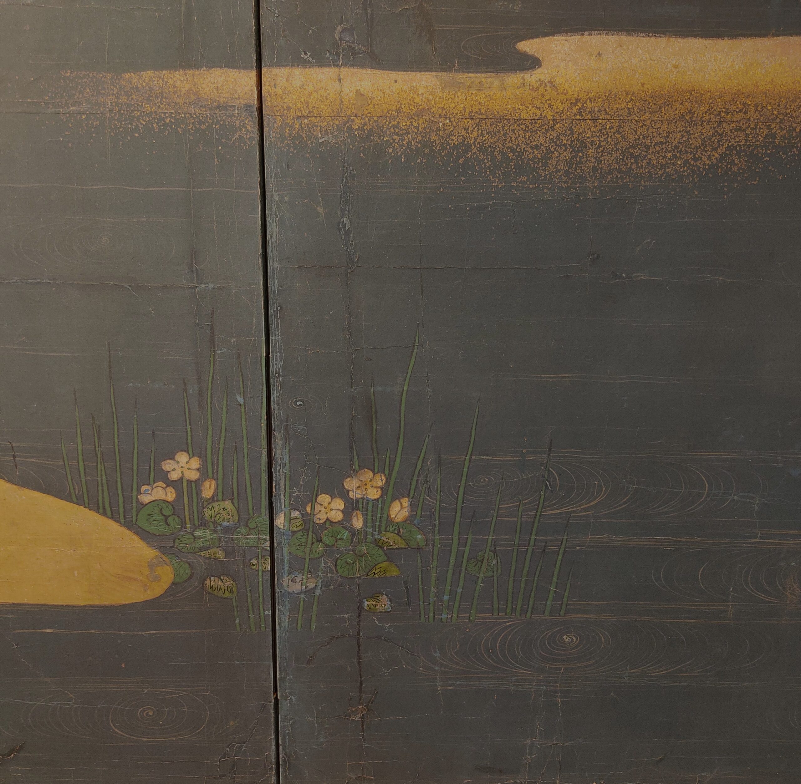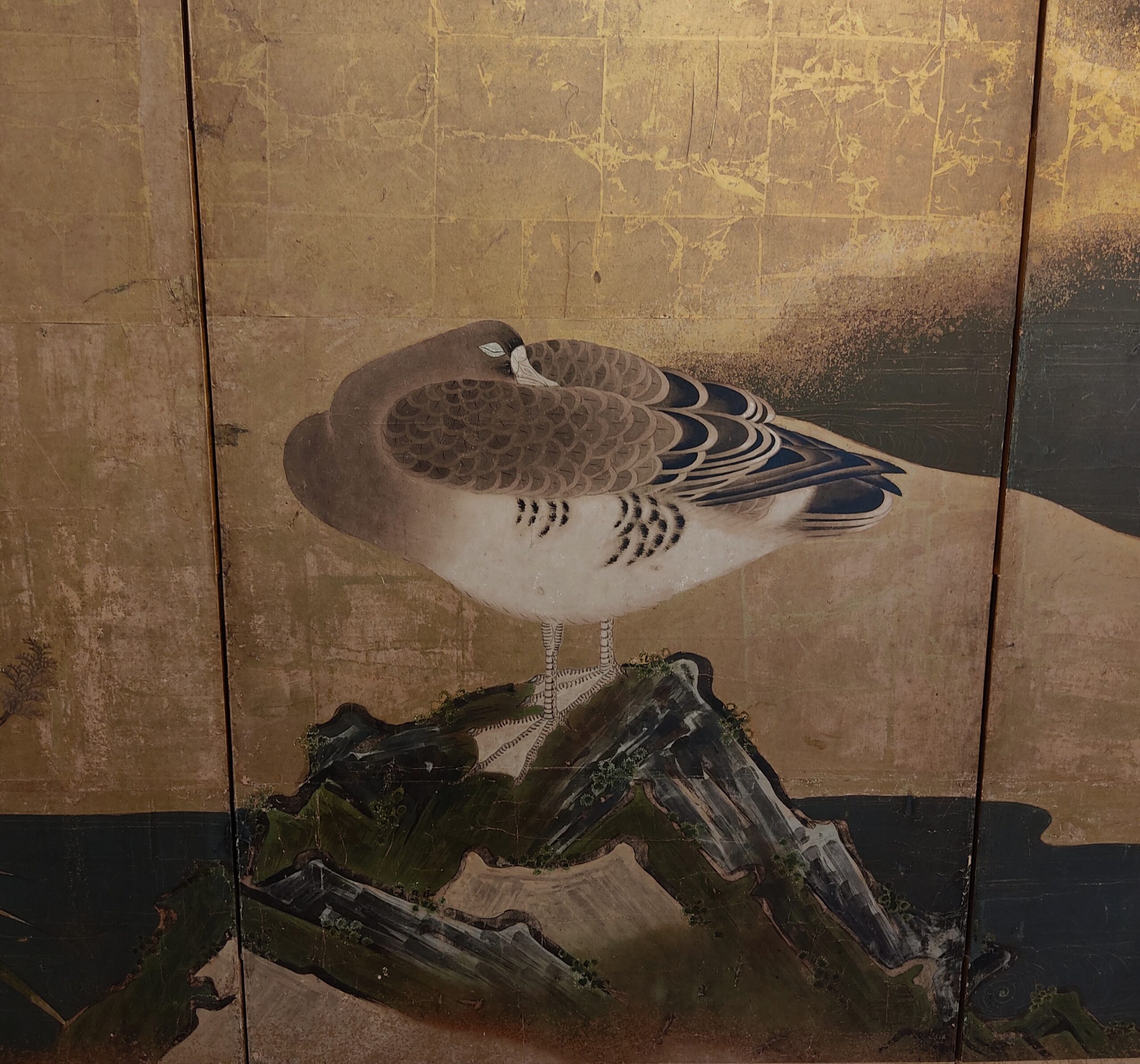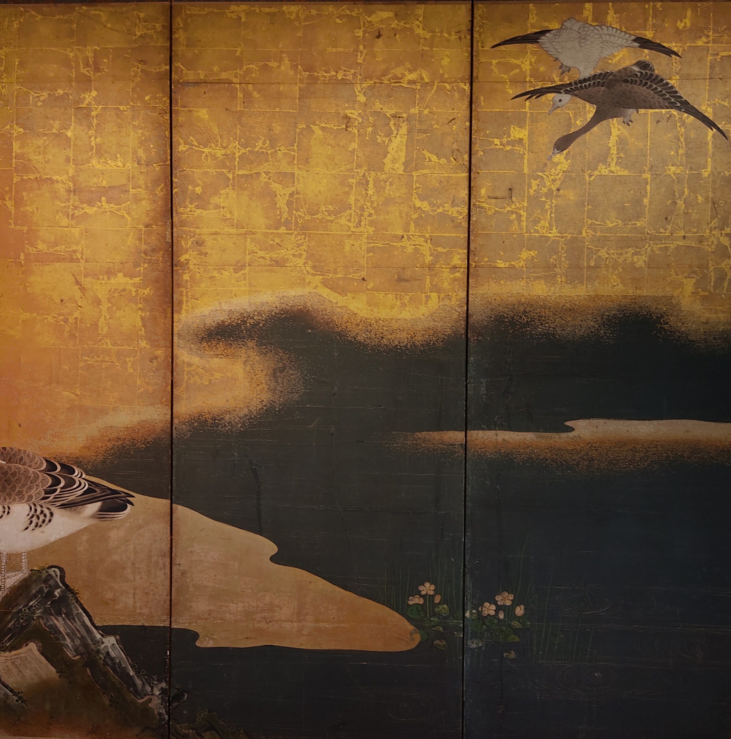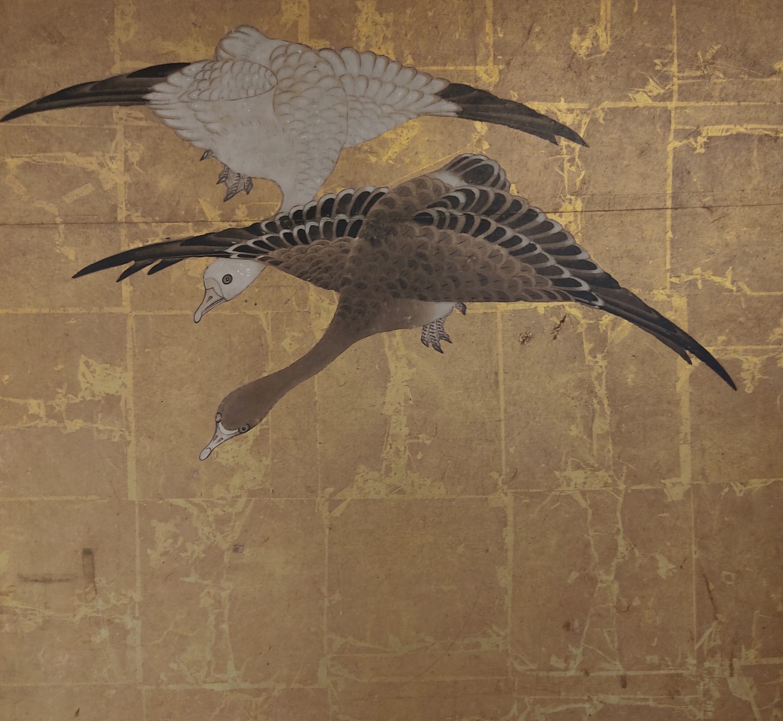 水辺で戯れる雁たちが緻密に描かており、金箔の風合いがとてもいいです。