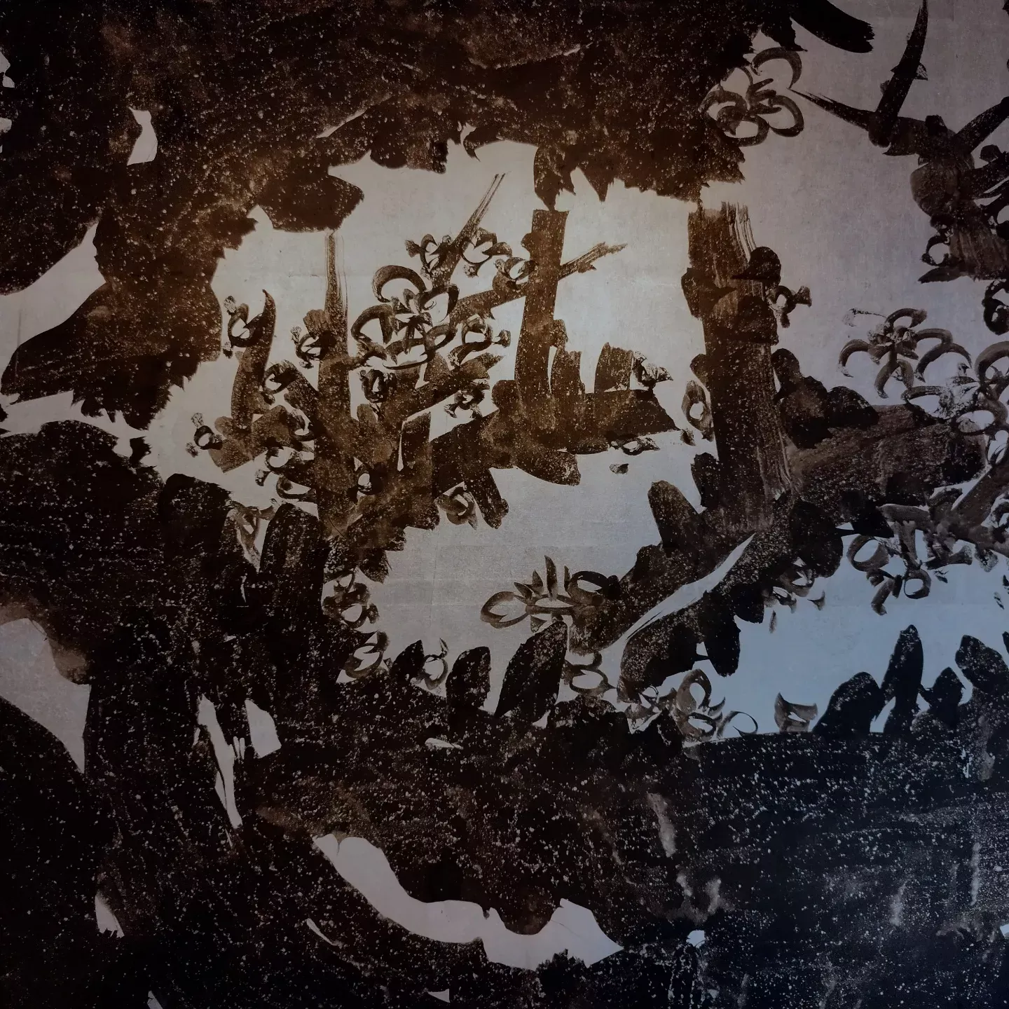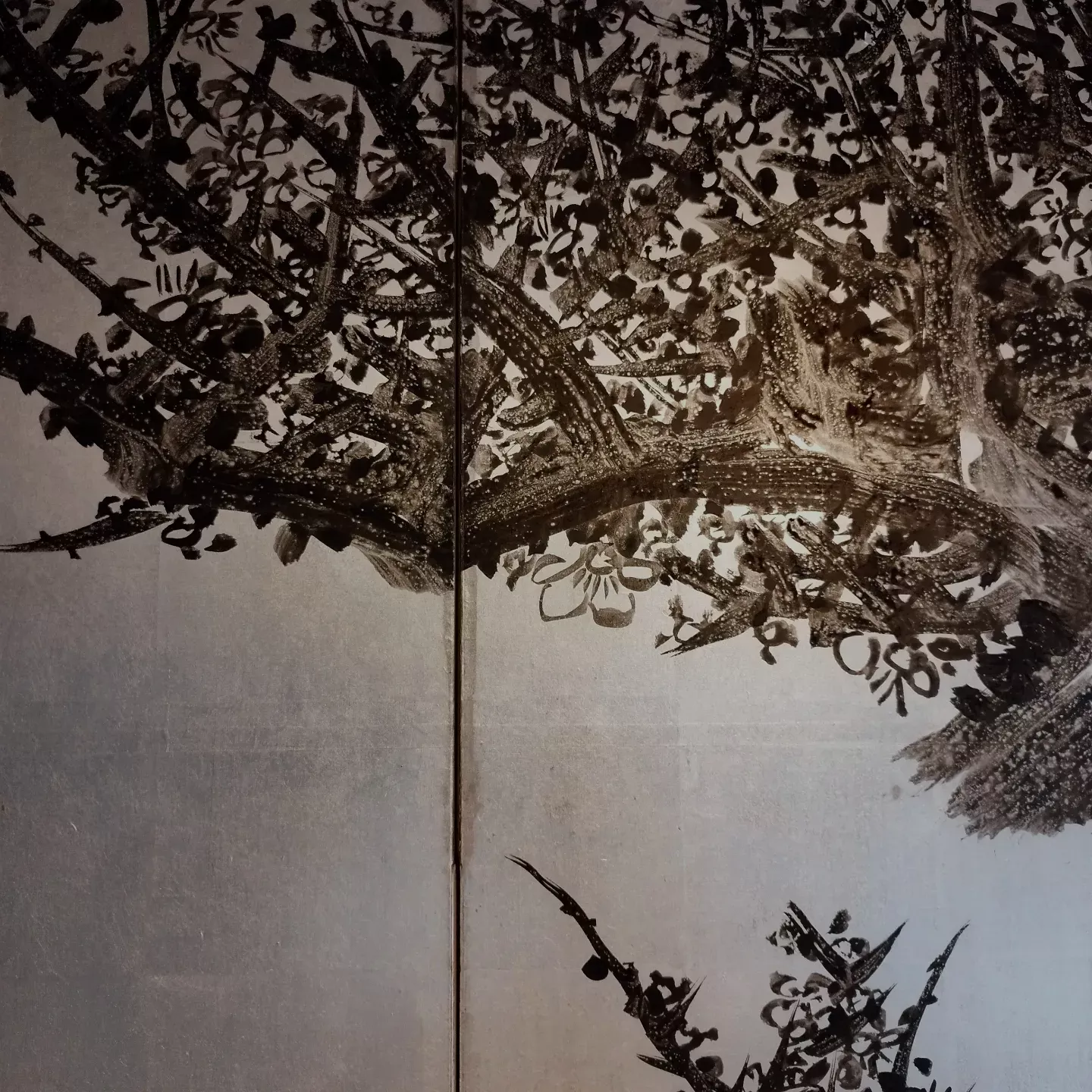 墨の濃淡を生かし、梅がダイナミックに描かれています。銀と黒のコントラストが目を引きます。