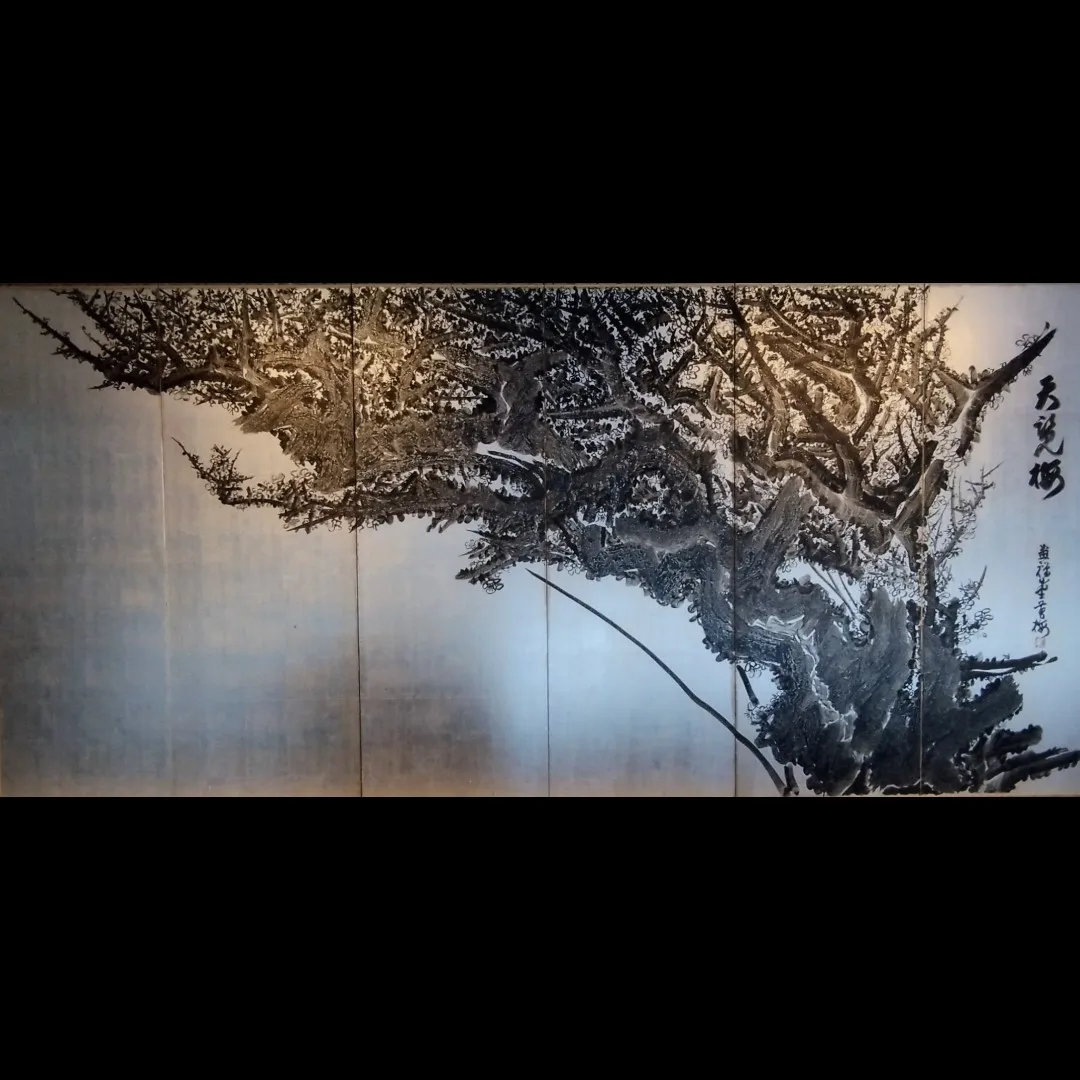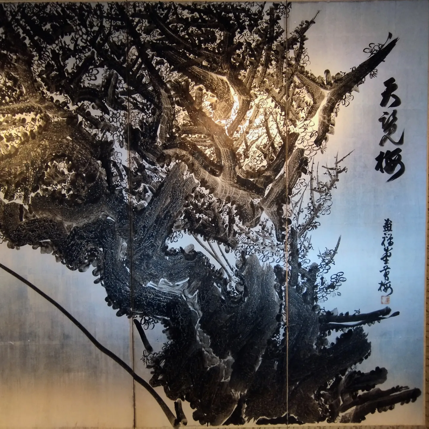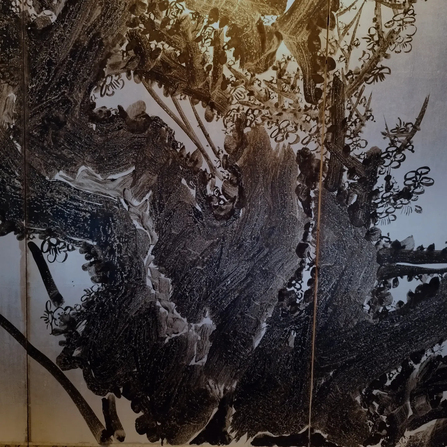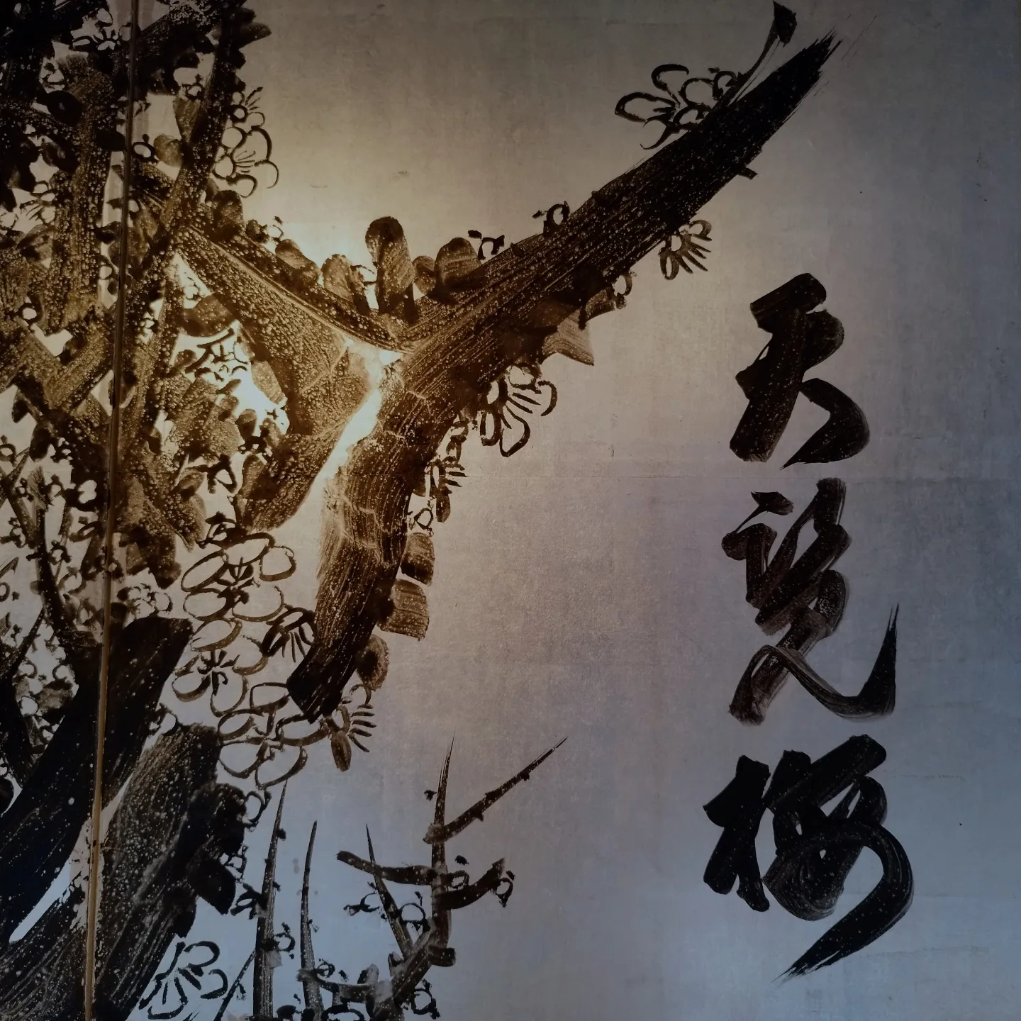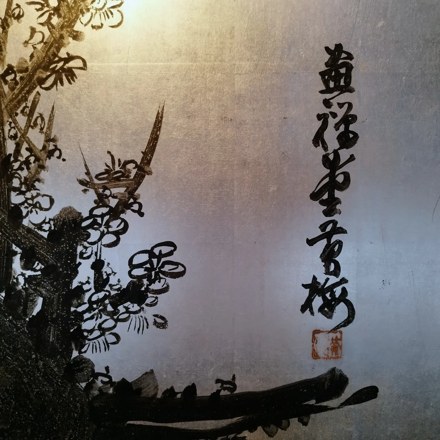 墨の濃淡を生かし、梅がダイナミックに描かれています。銀と黒のコントラストが目を引きます。