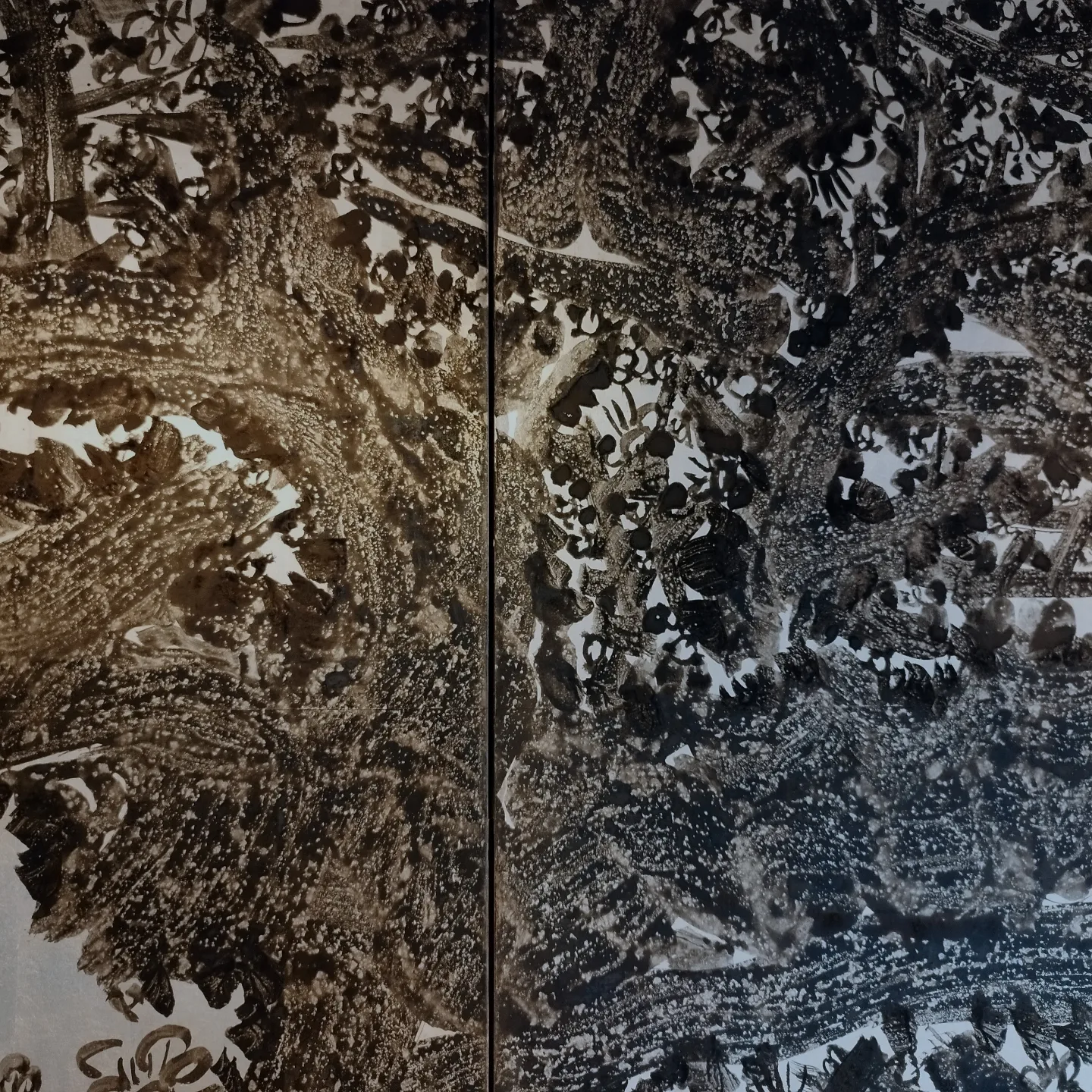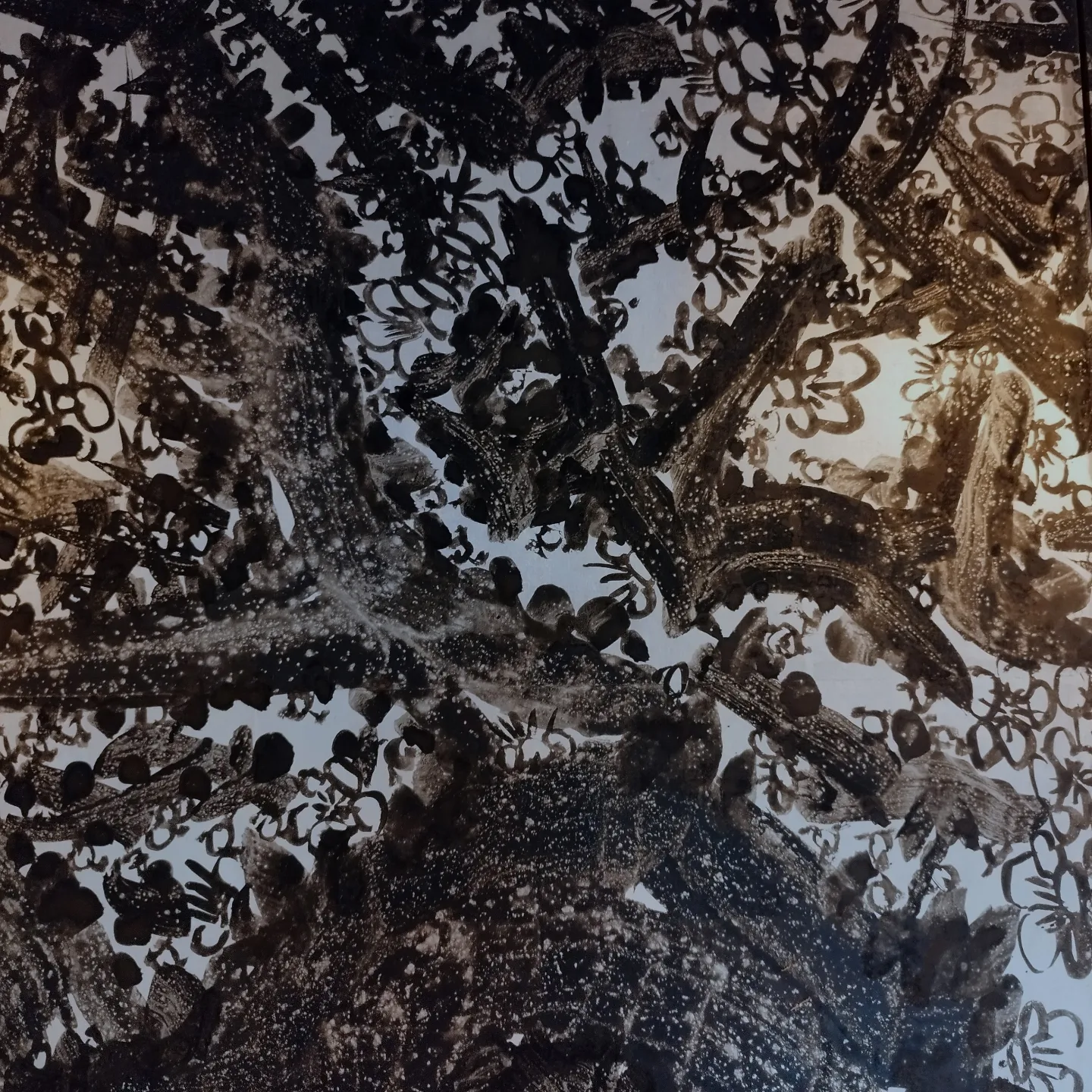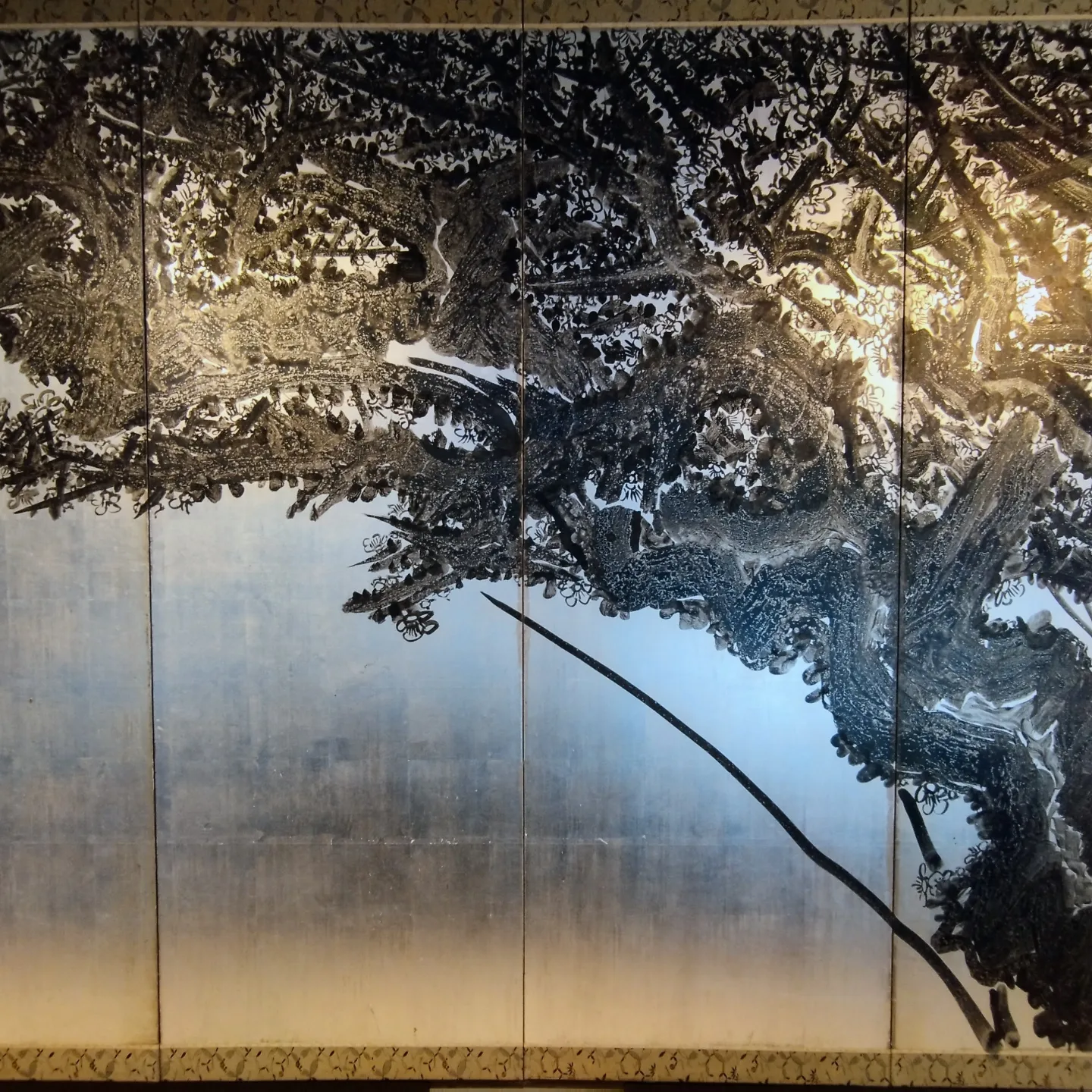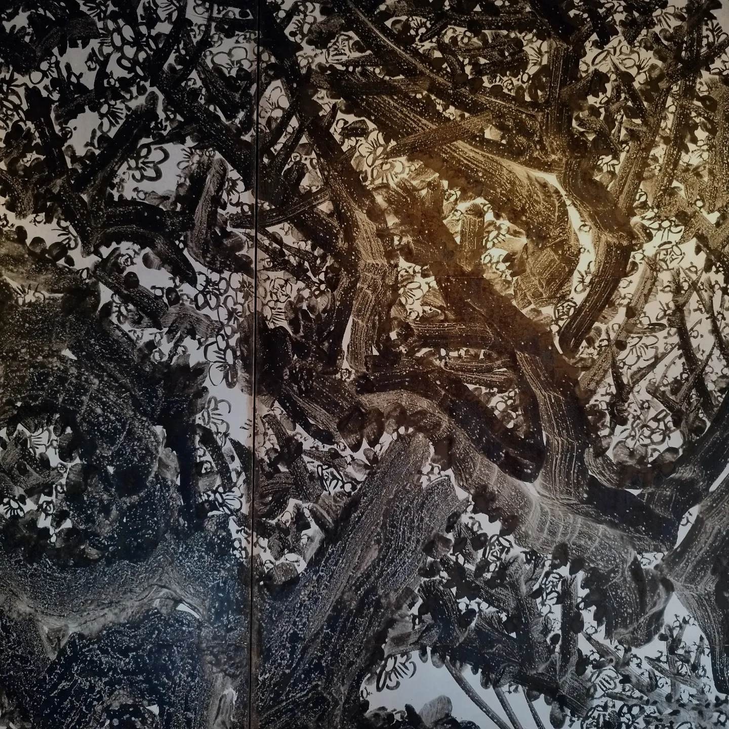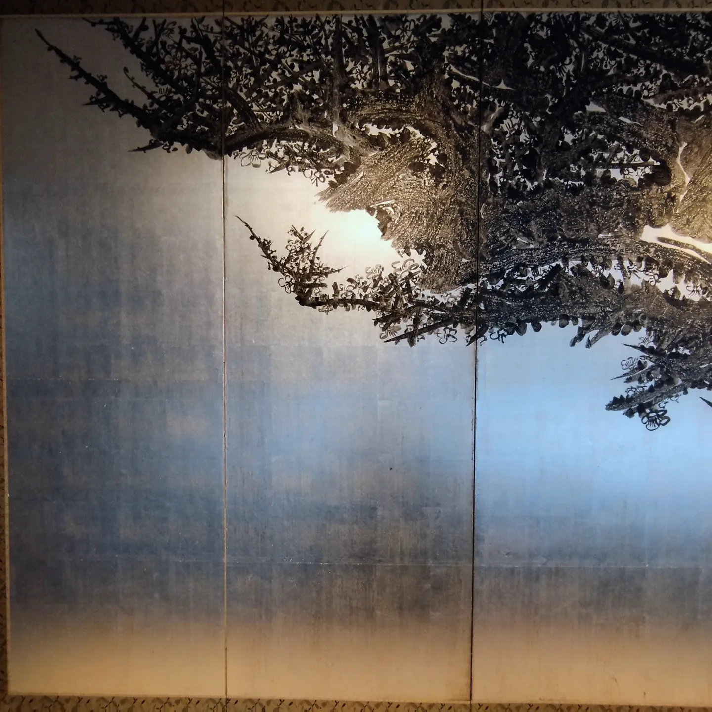 墨の濃淡を生かし、梅がダイナミックに描かれています。銀と黒のコントラストが目を引きます。
