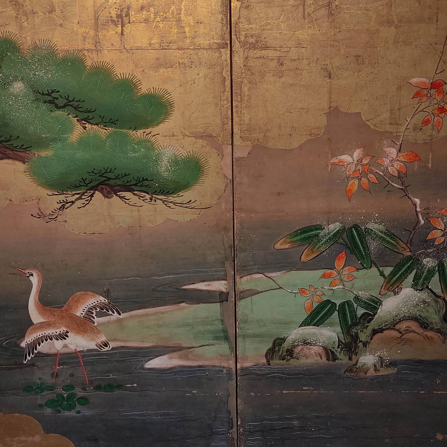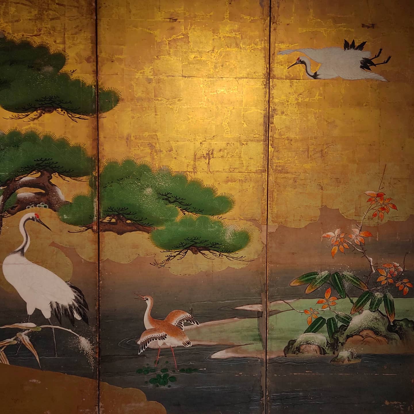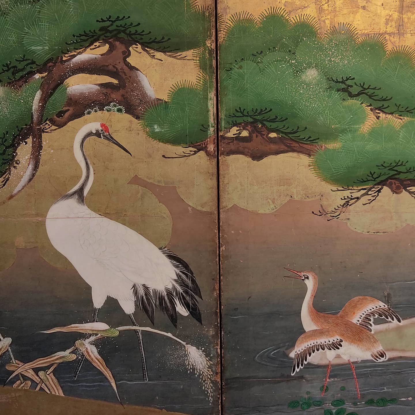 金地に大胆に描かれた松に鶴の親子が仲睦まじく描かれ絢爛豪華です。