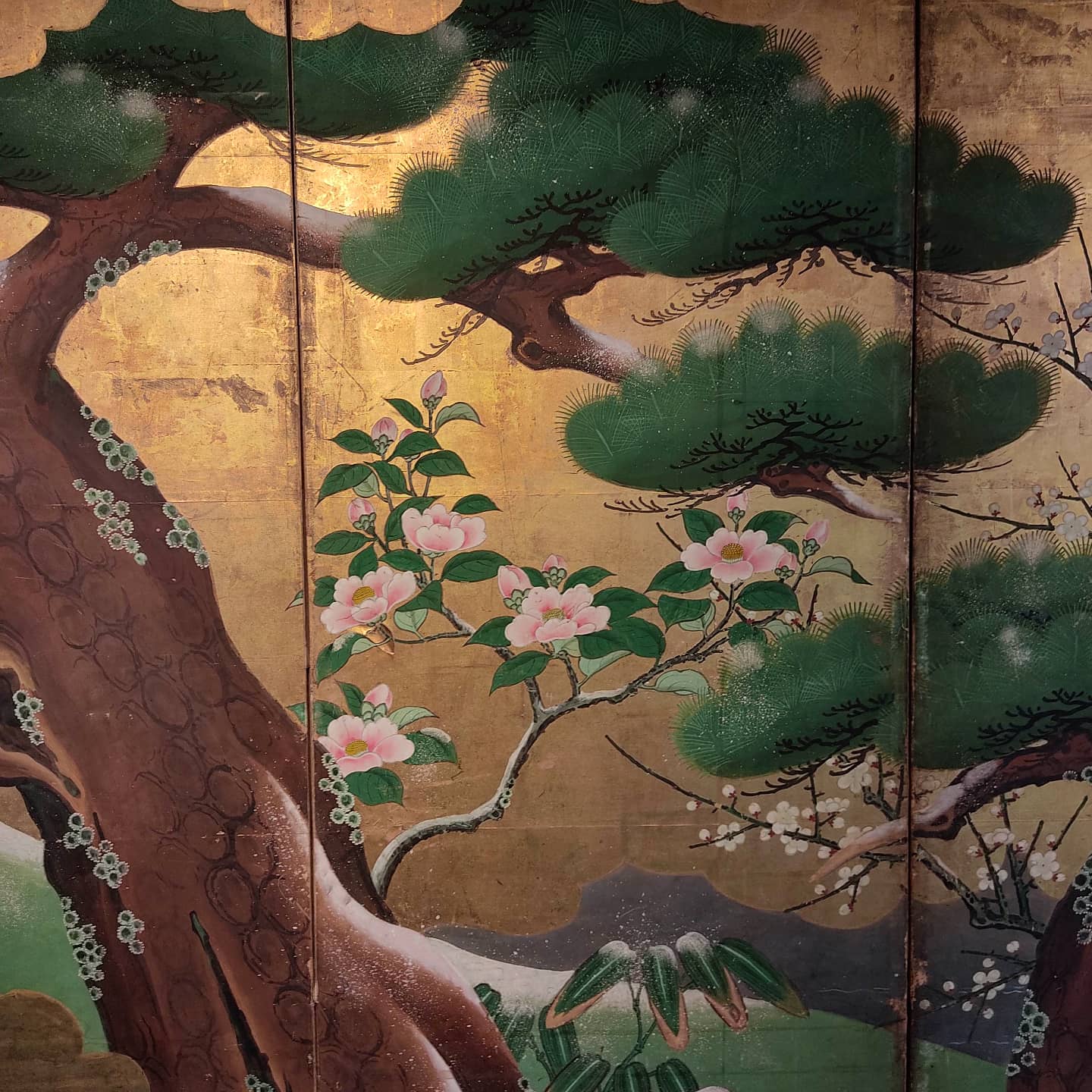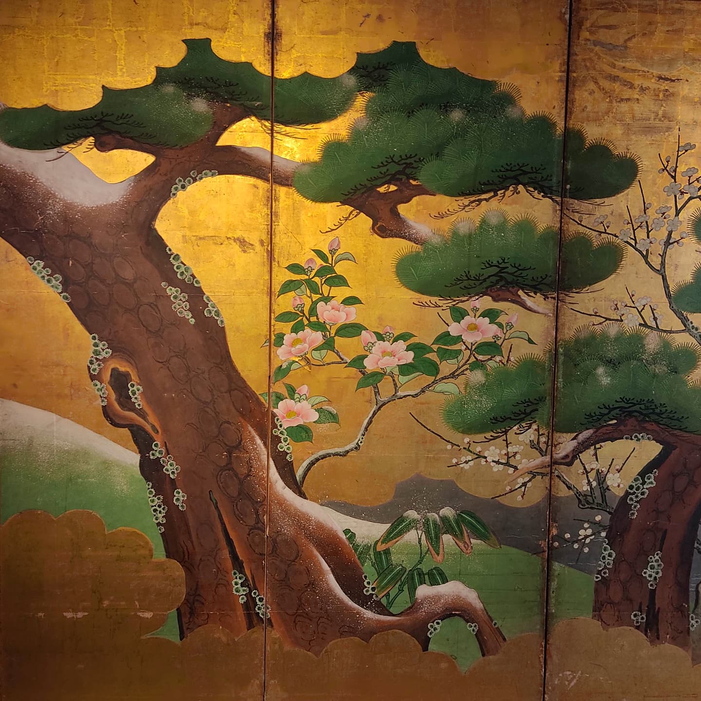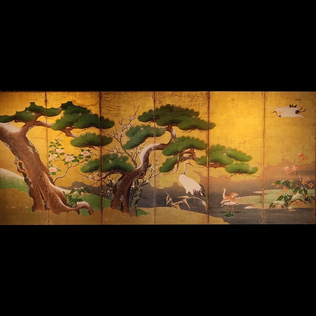 金地に大胆に描かれた松に鶴の親子が仲睦まじく描かれ絢爛豪華です。
