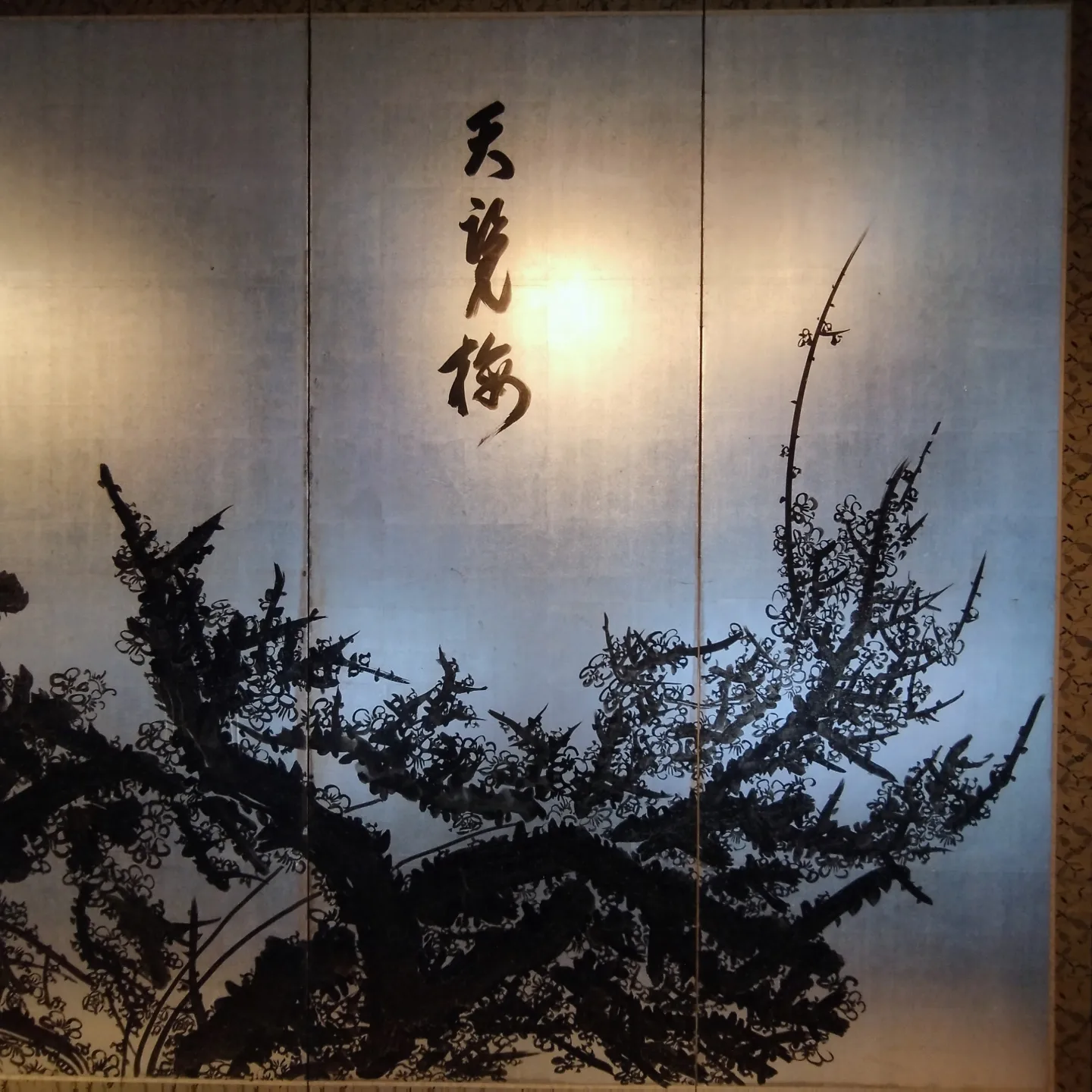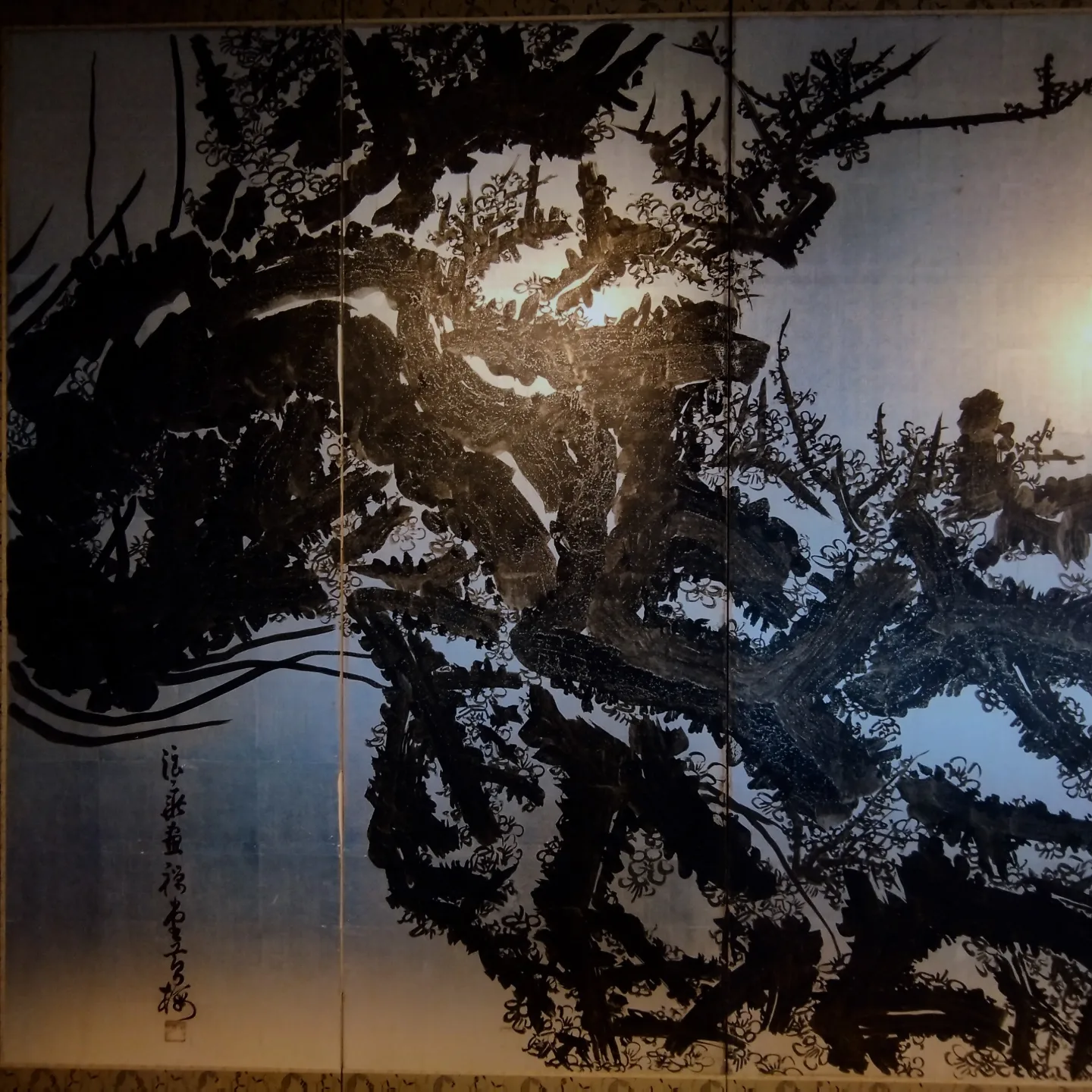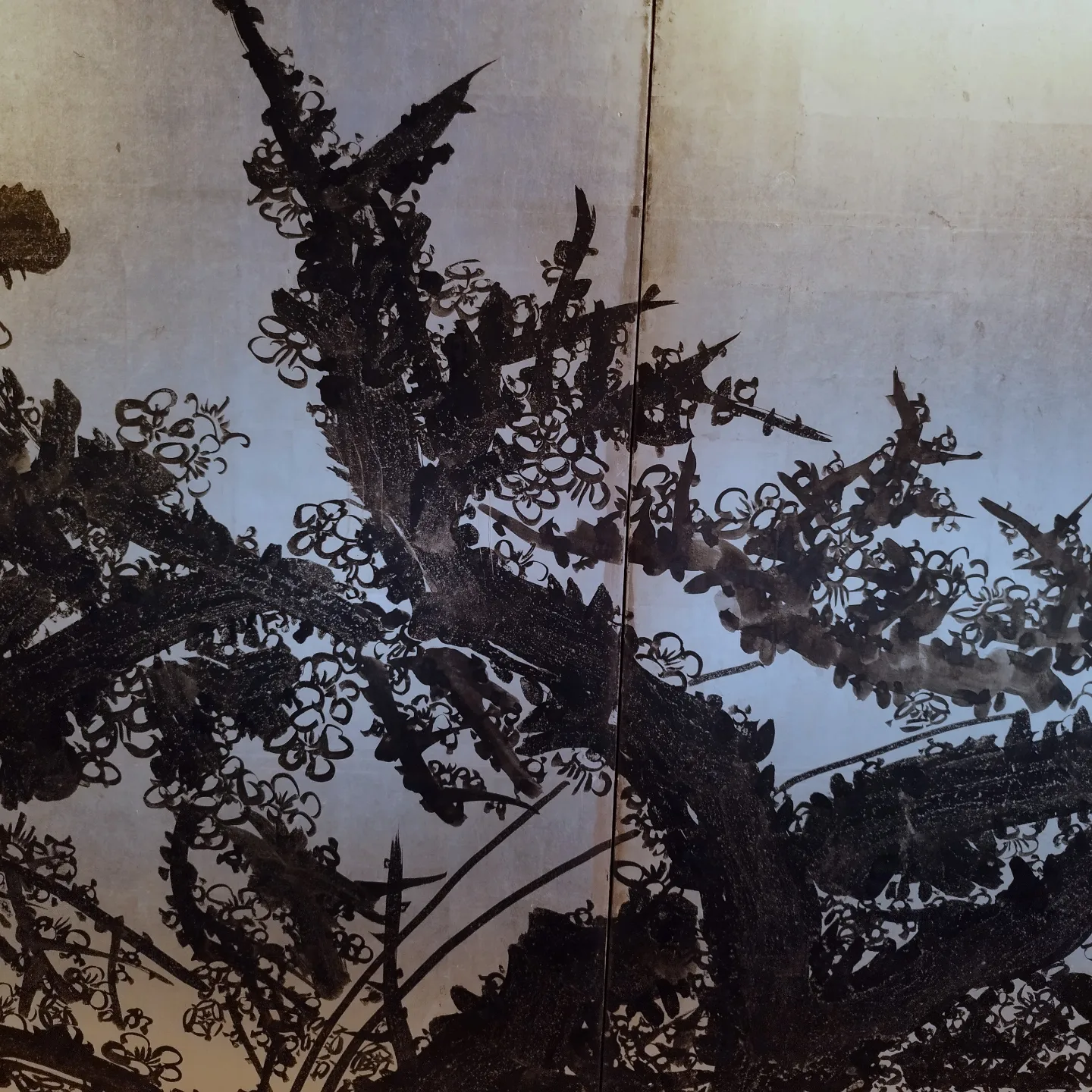 japanese antique 6 hold paper screen painted in ink on a silver ground with a plum tree by Koubai Ooishi