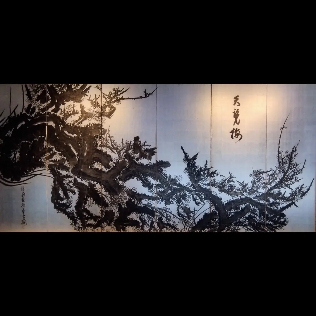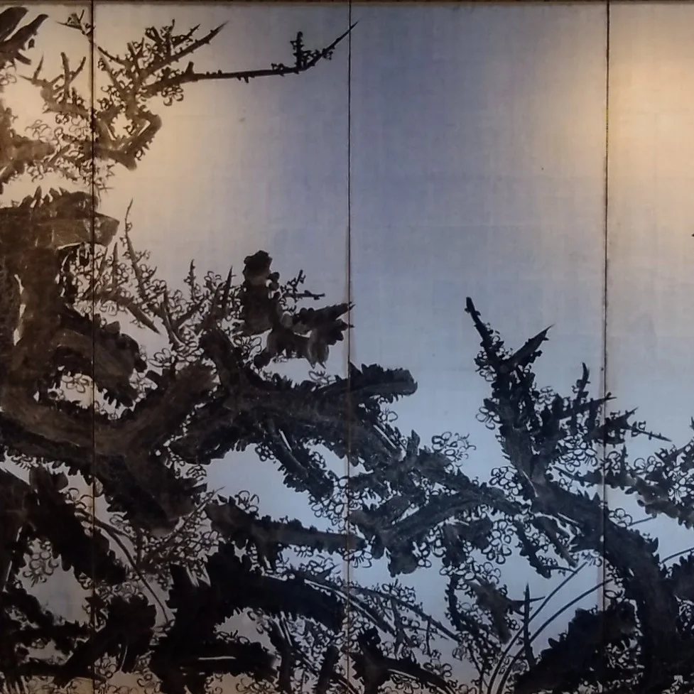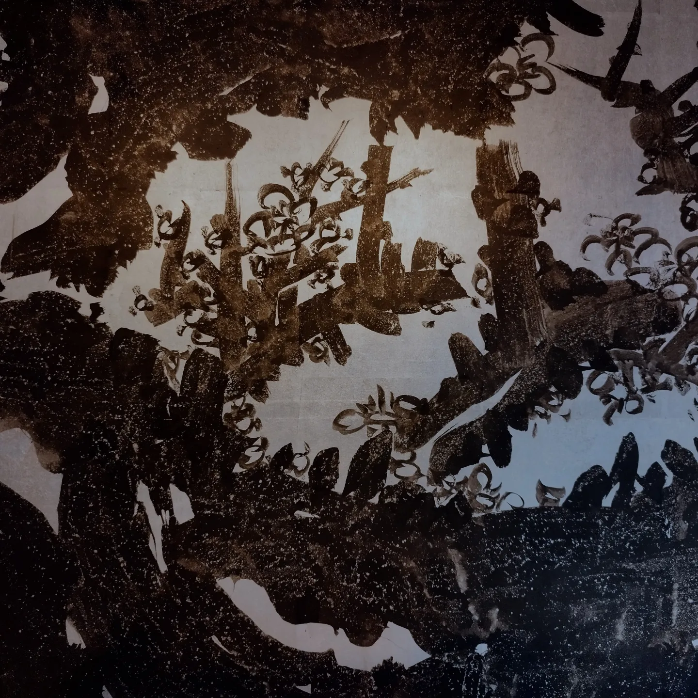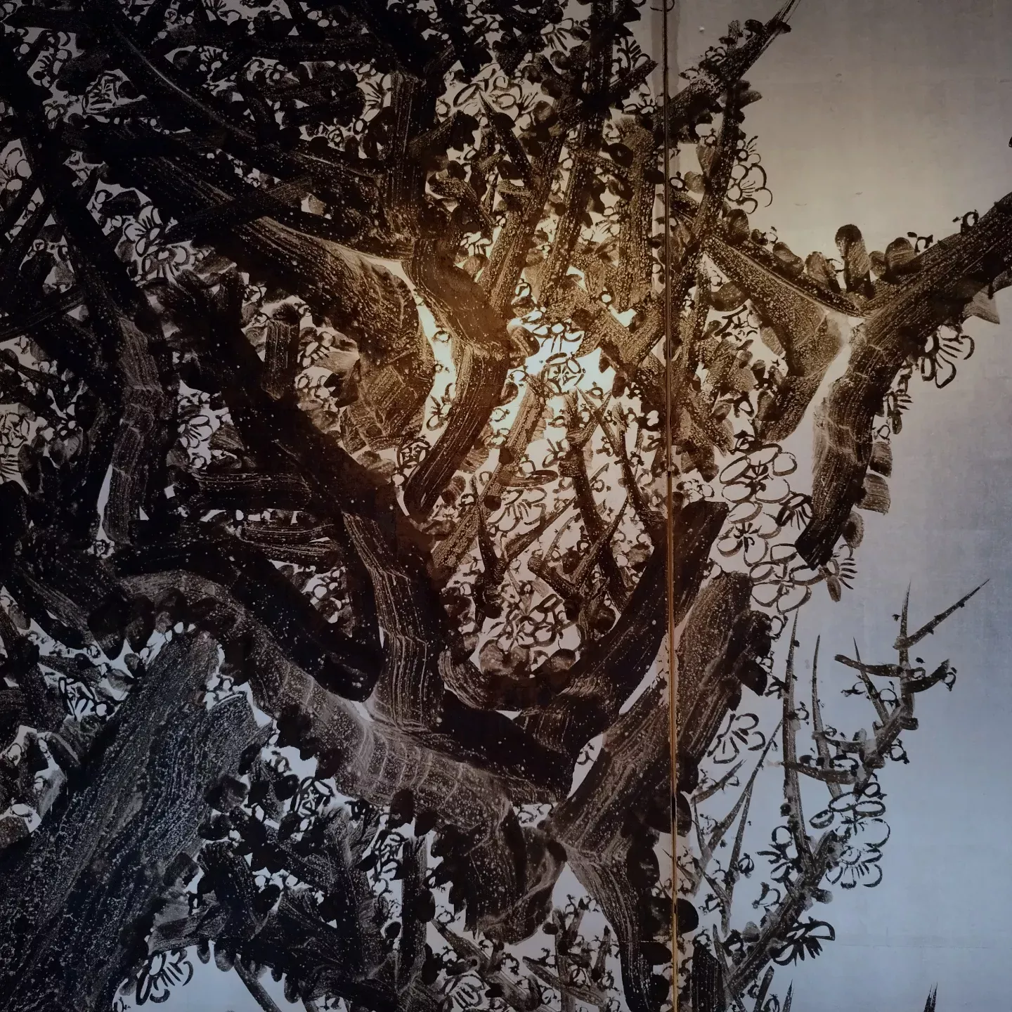 japanese antique 6 hold paper screen painted in ink on a silver ground with a plum tree by Koubai Ooishi