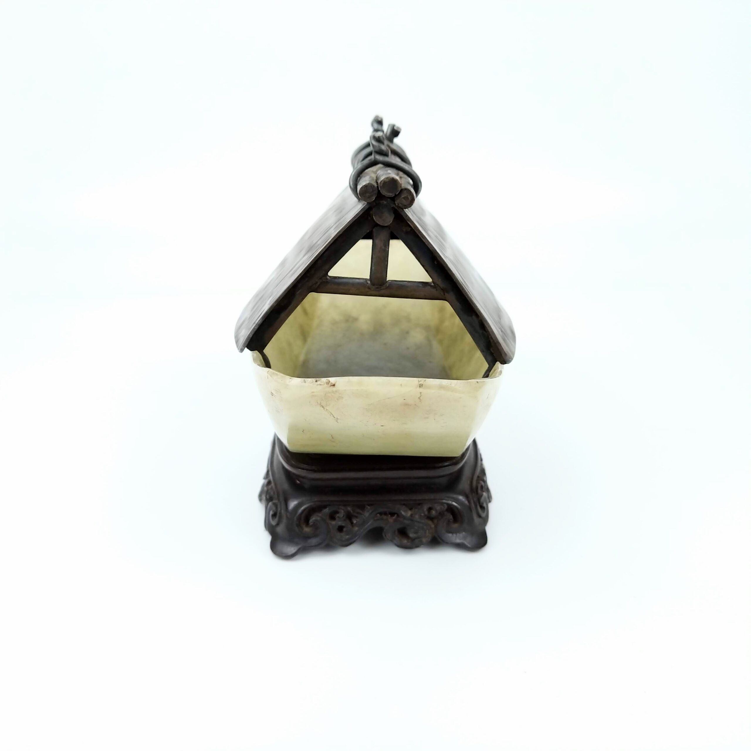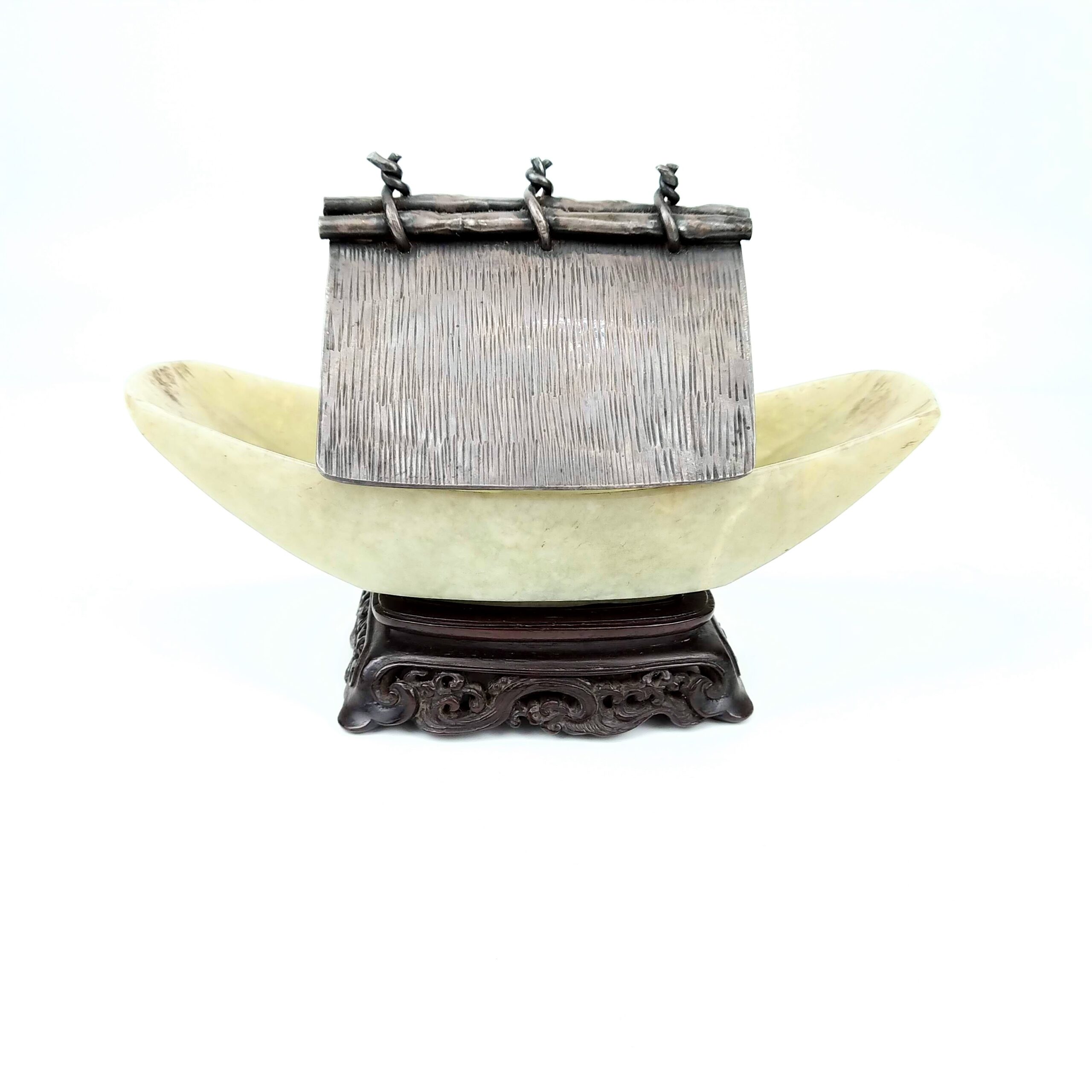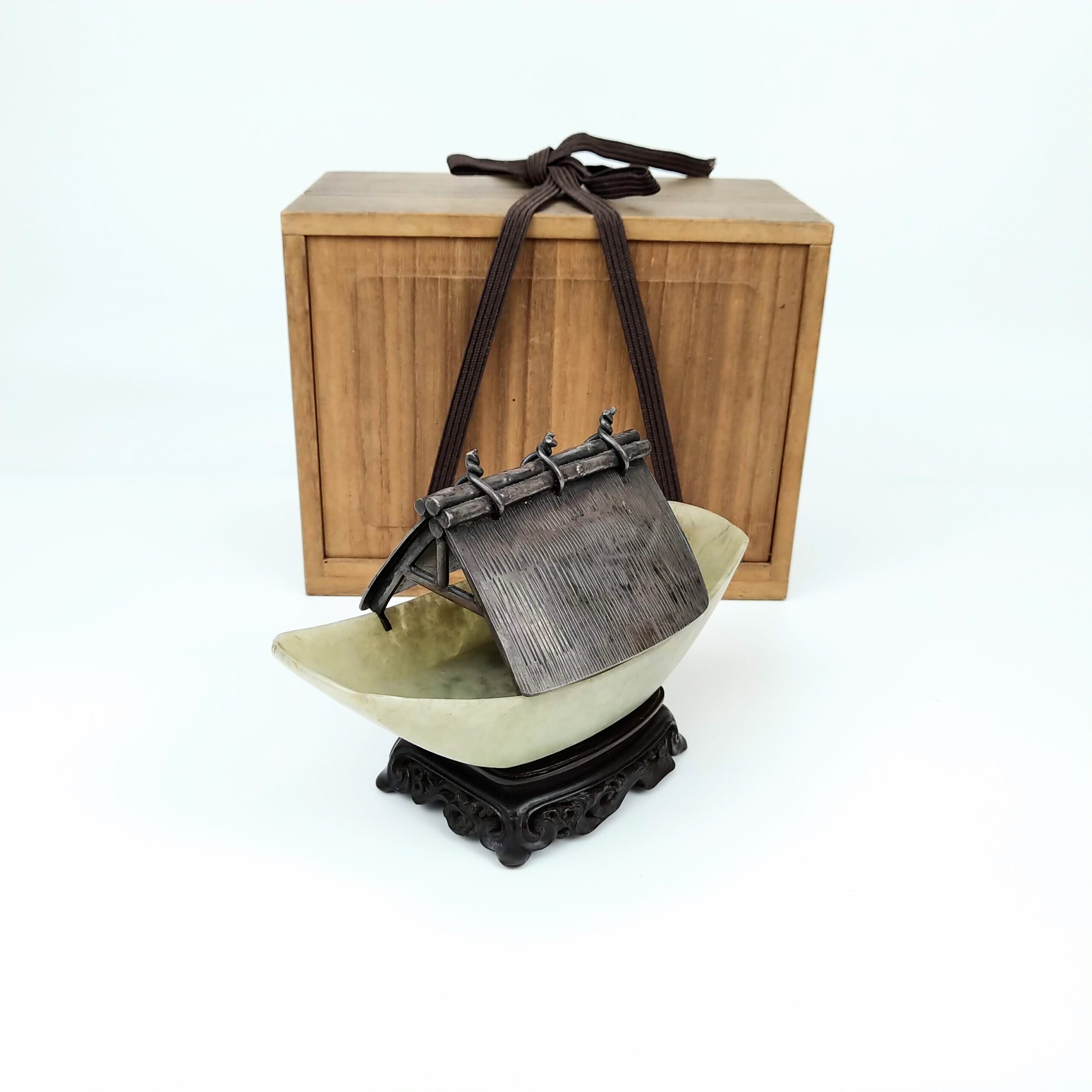 japanese antique jade boat shape incense burner with red sandalwood and silver lamp chimny