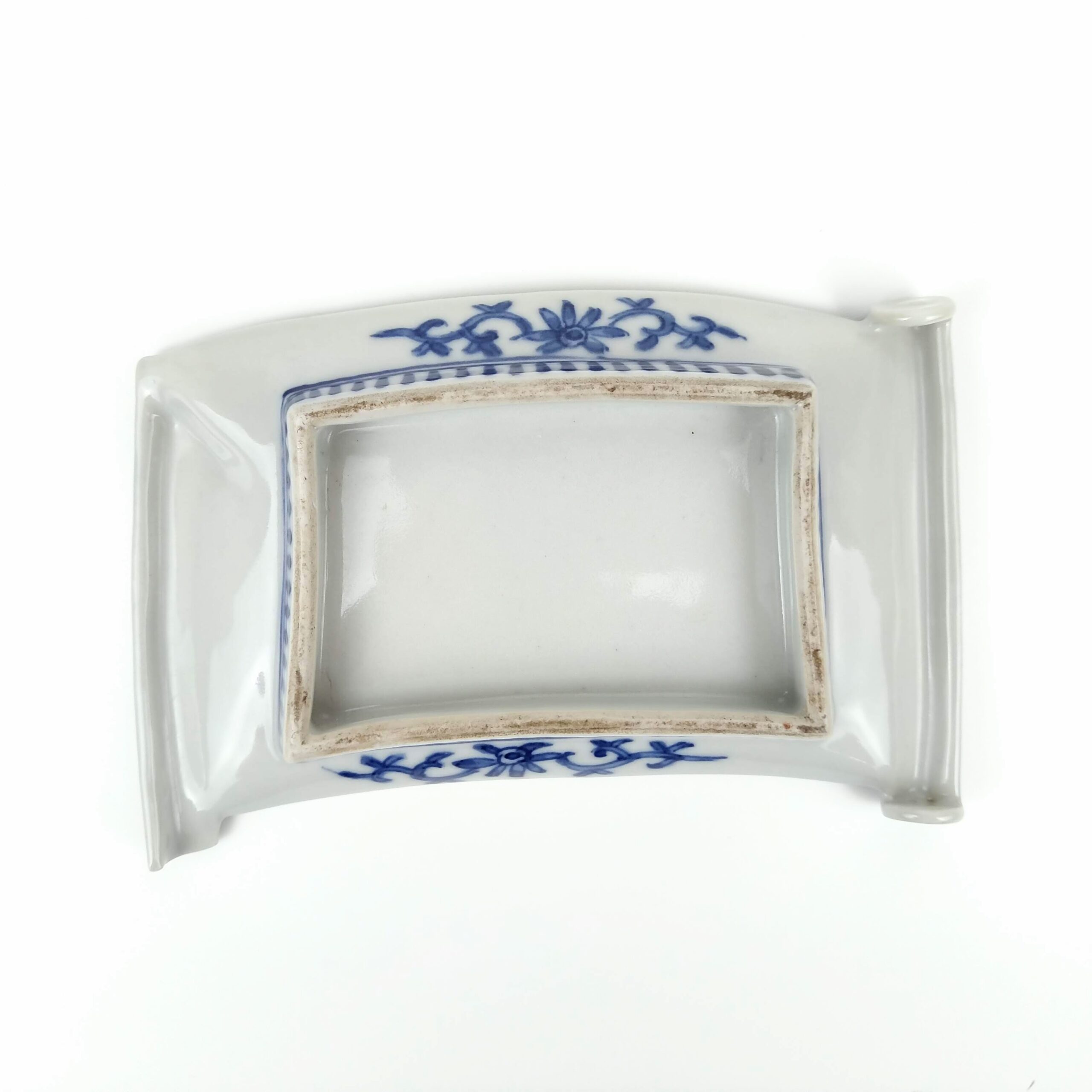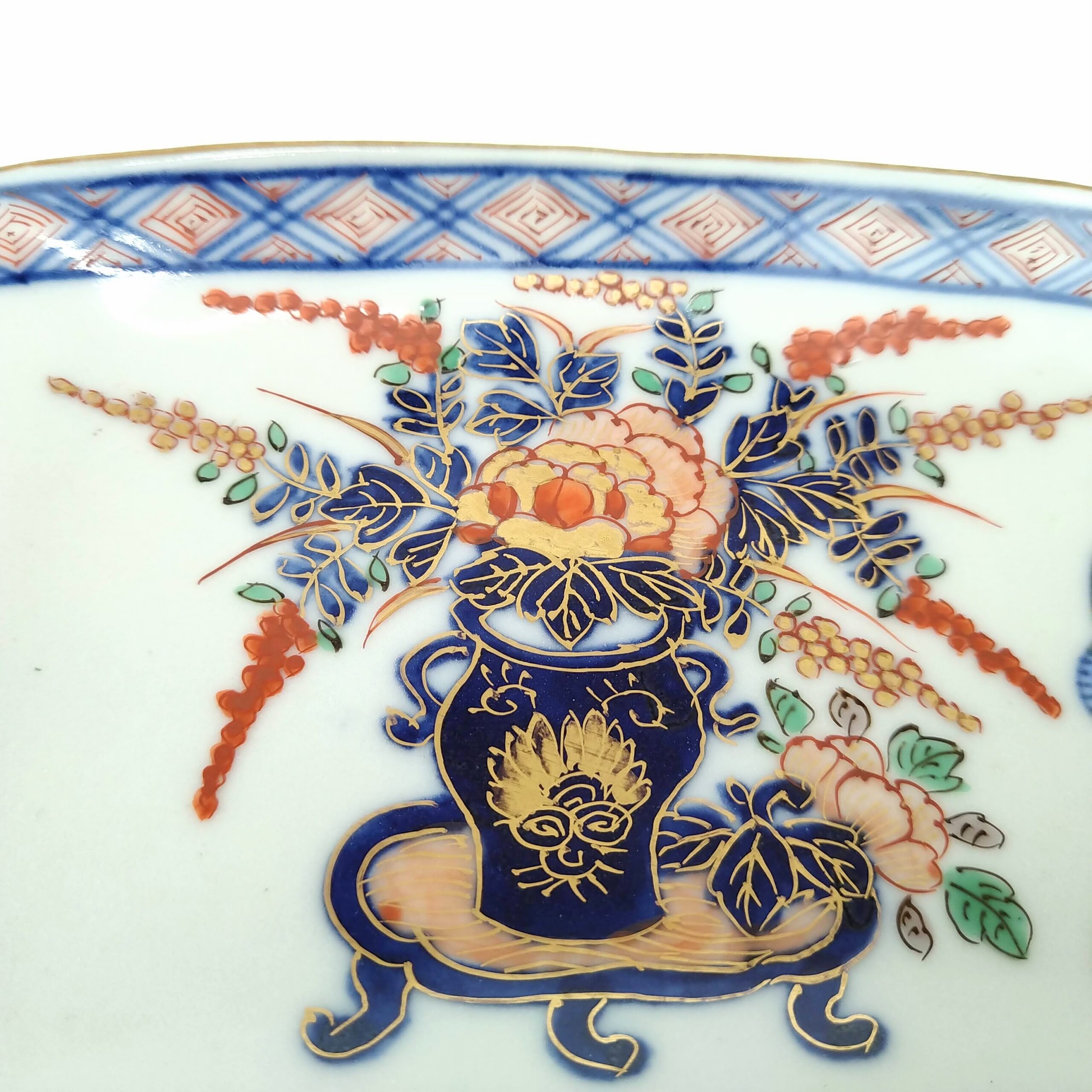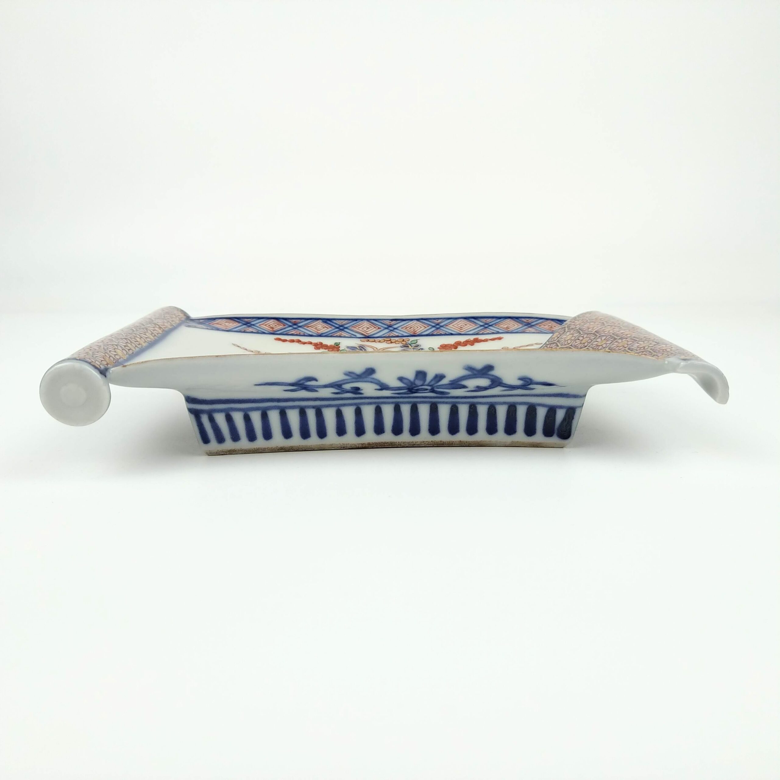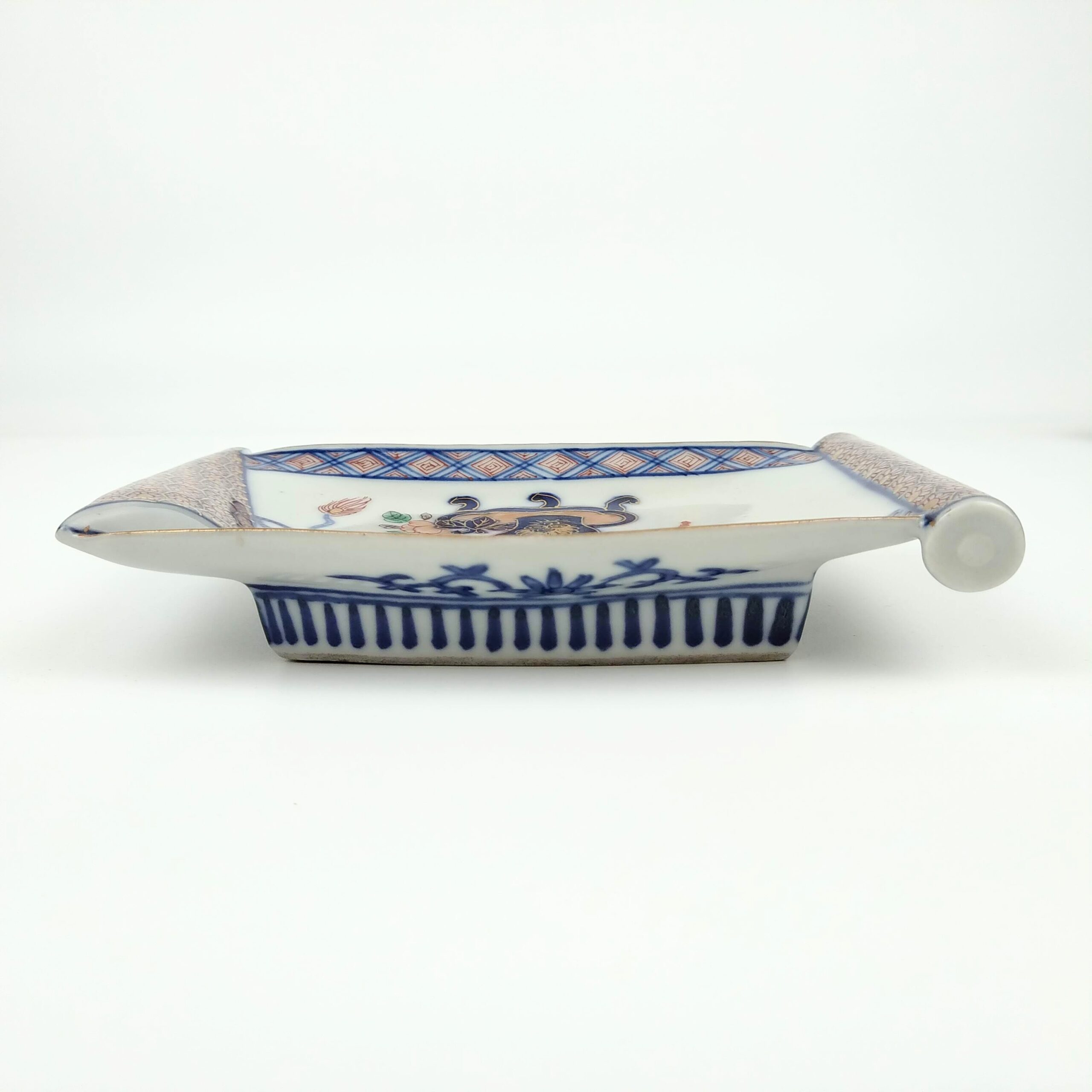 japanese antique Daishouji colored scroll shape dish wih design of flower vase