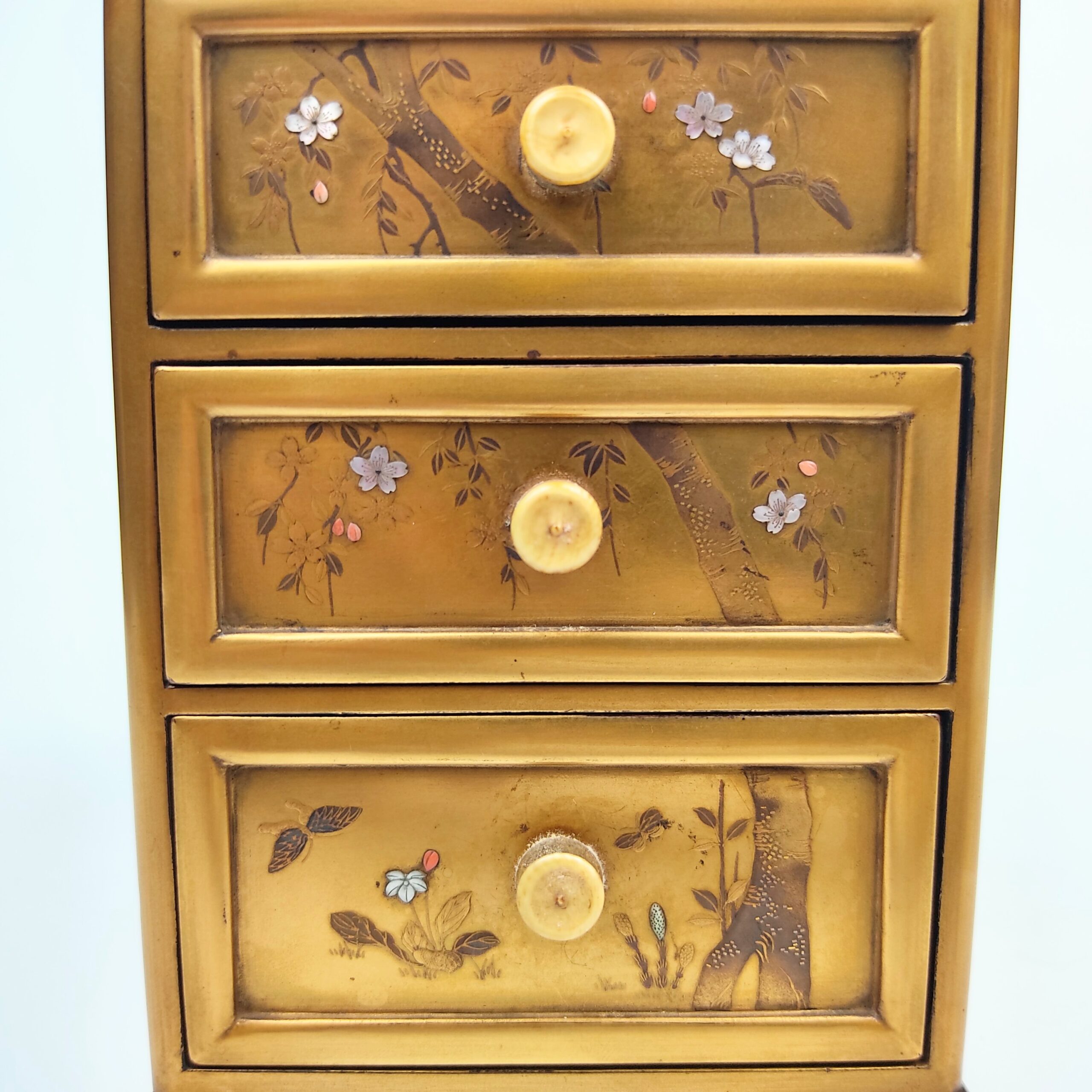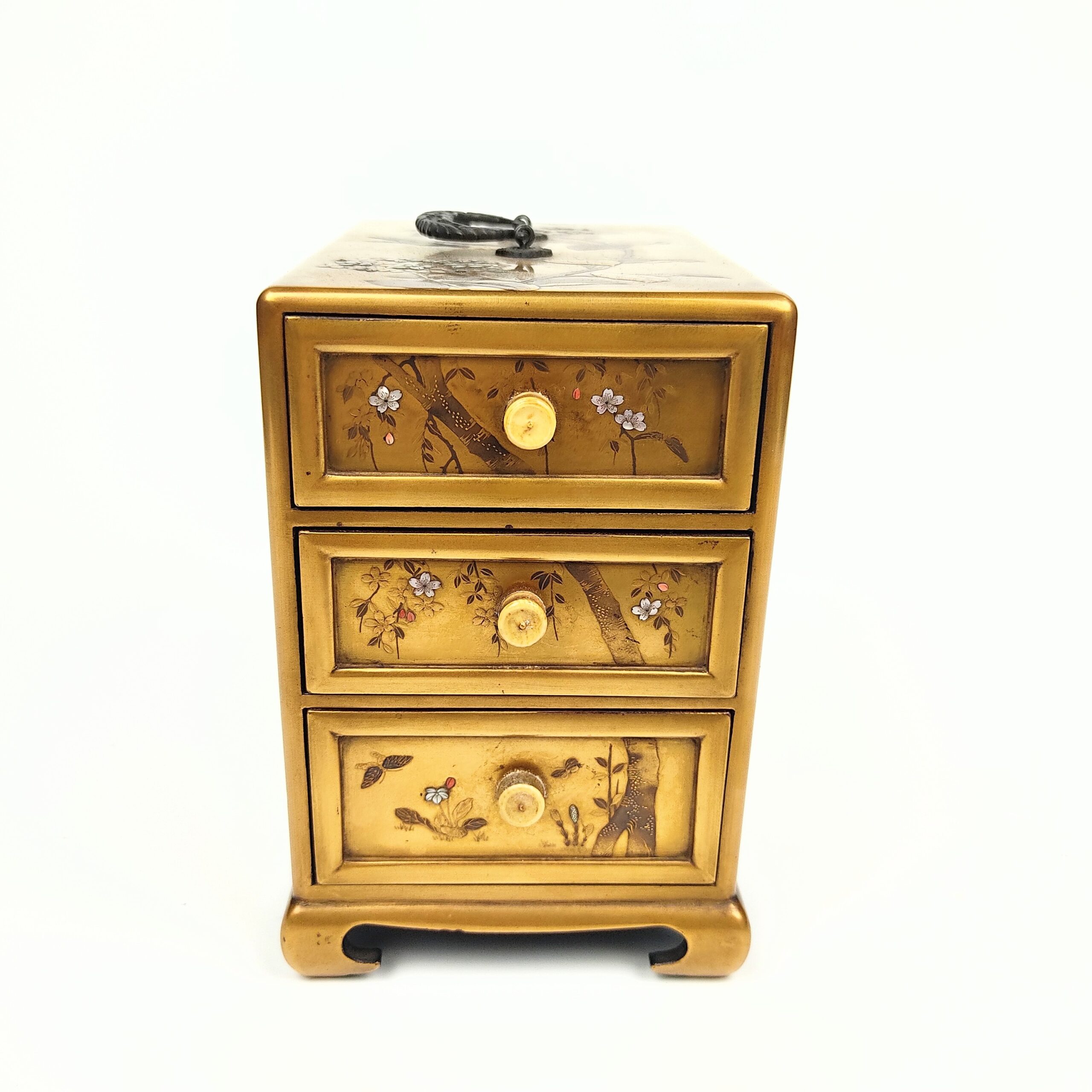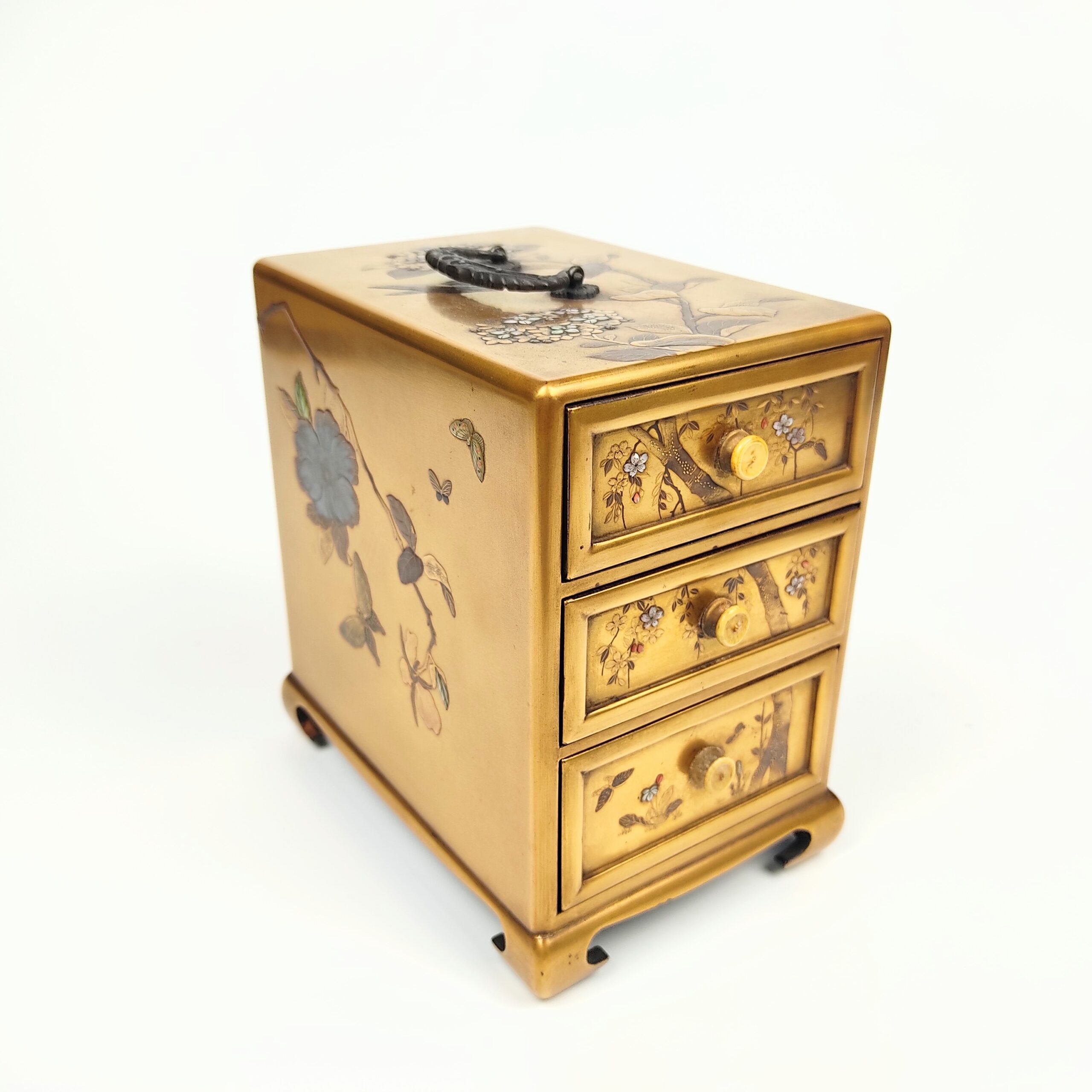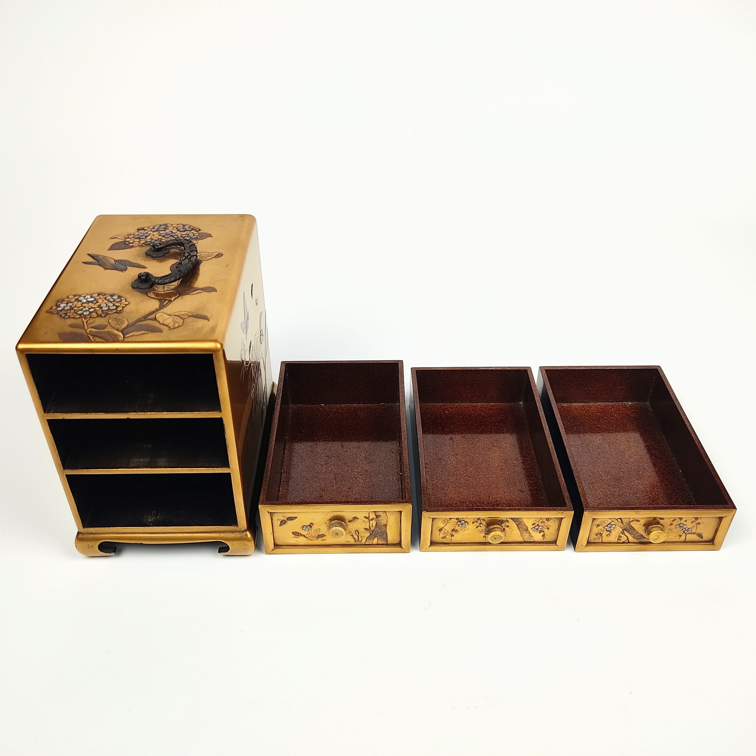 japanese antique Flowers and butterflies design 3 drawer box with gold and silver lacquer,mother of pearl and coral decorations