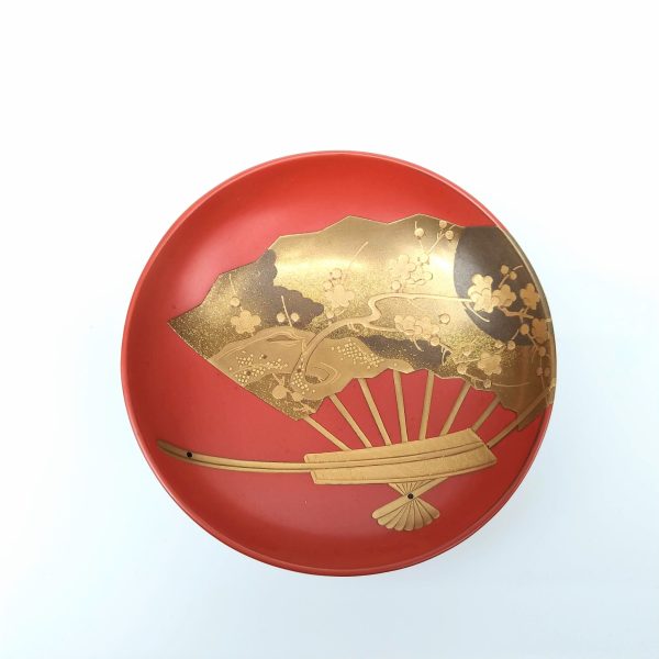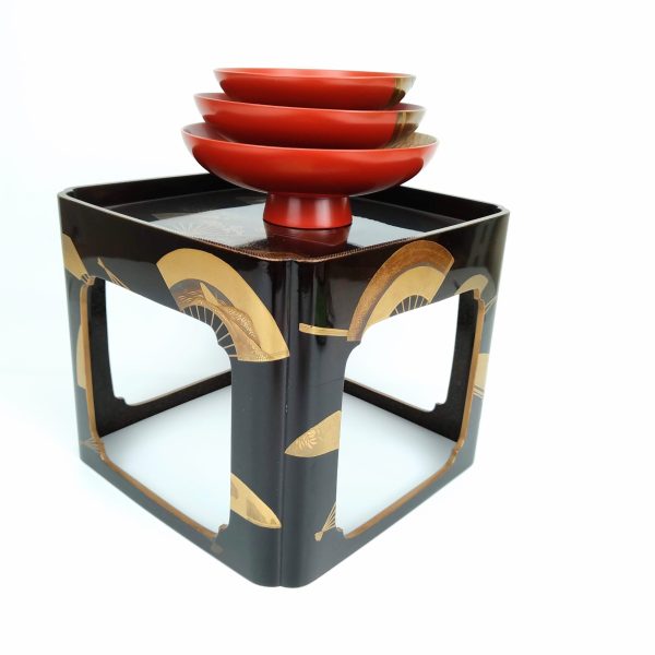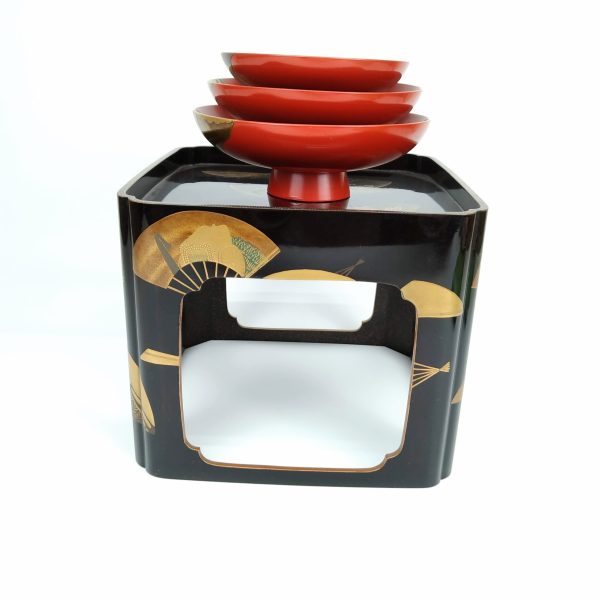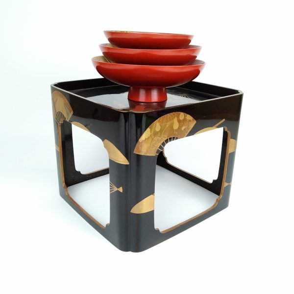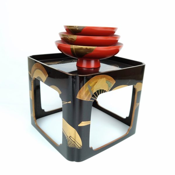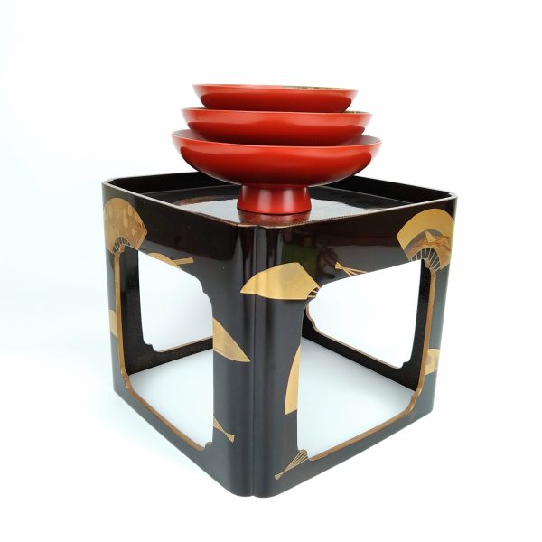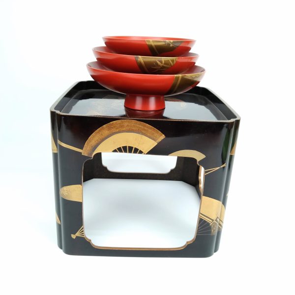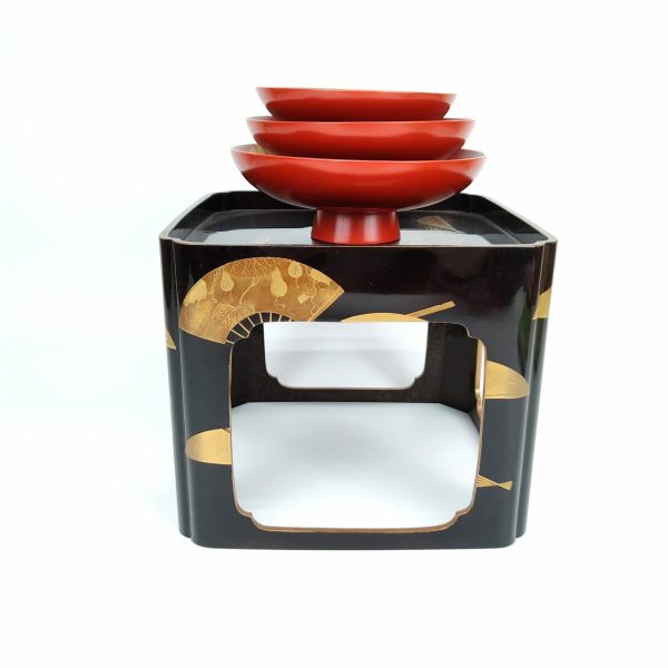 japanese antique Gold lacquer 3 sake cups with stand,design of fan