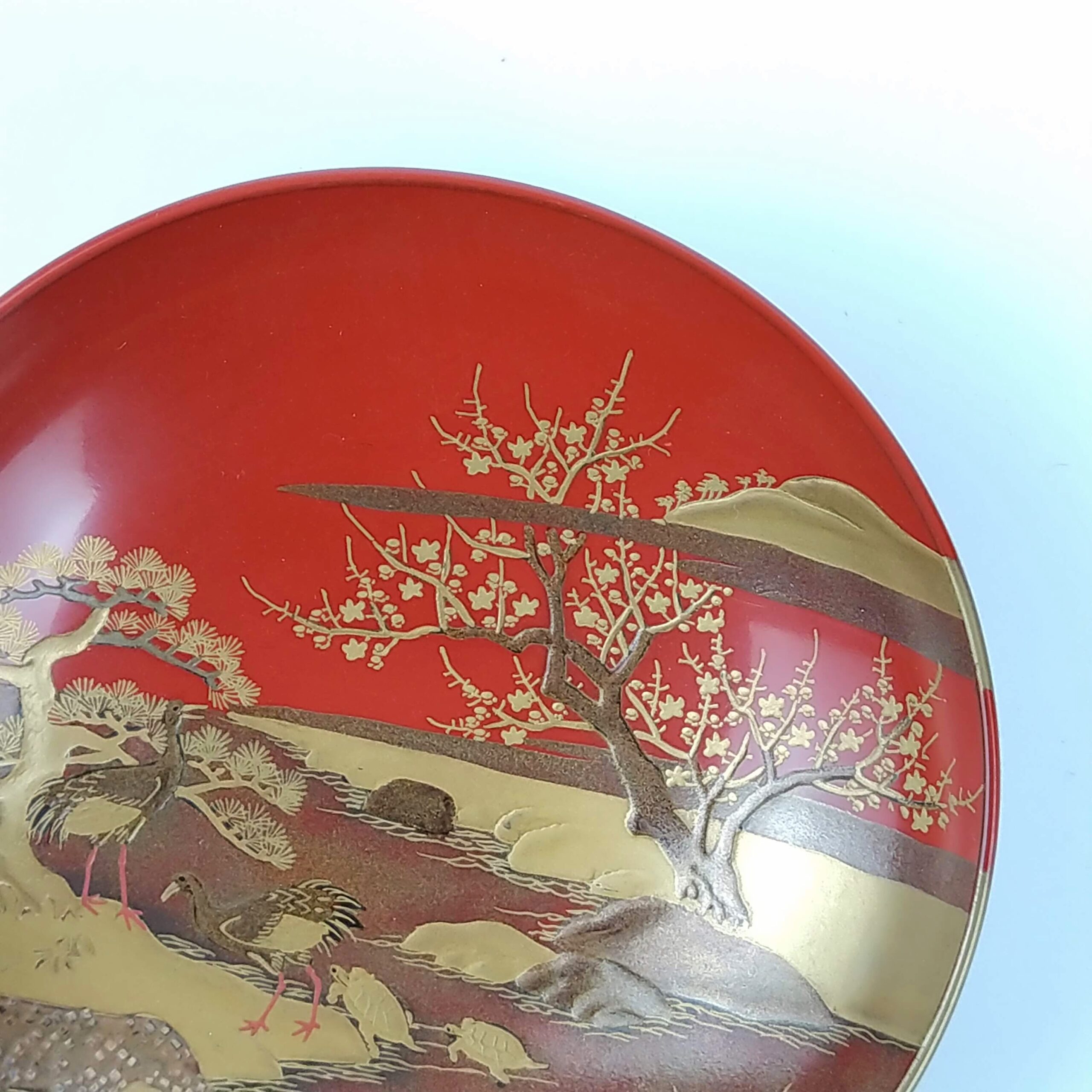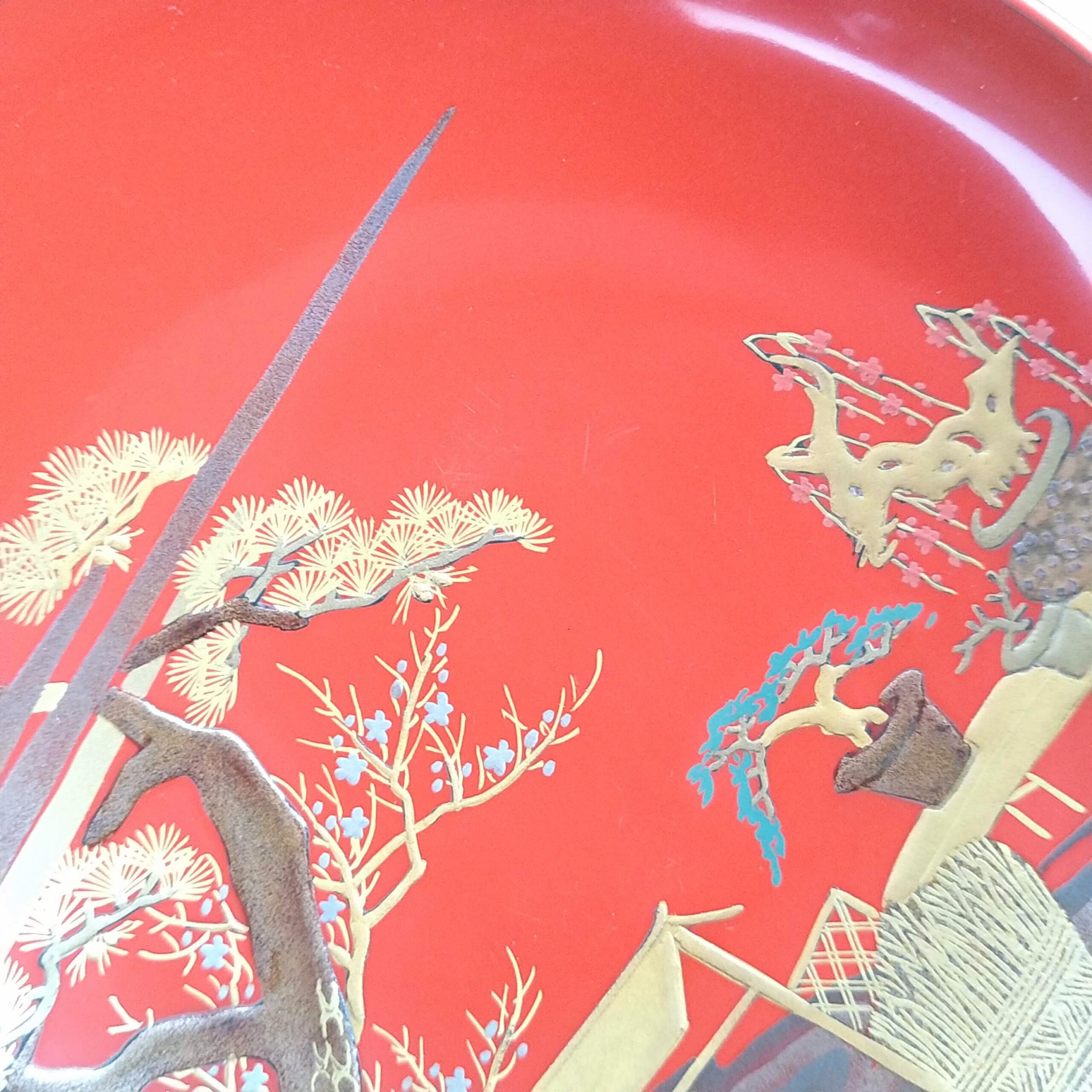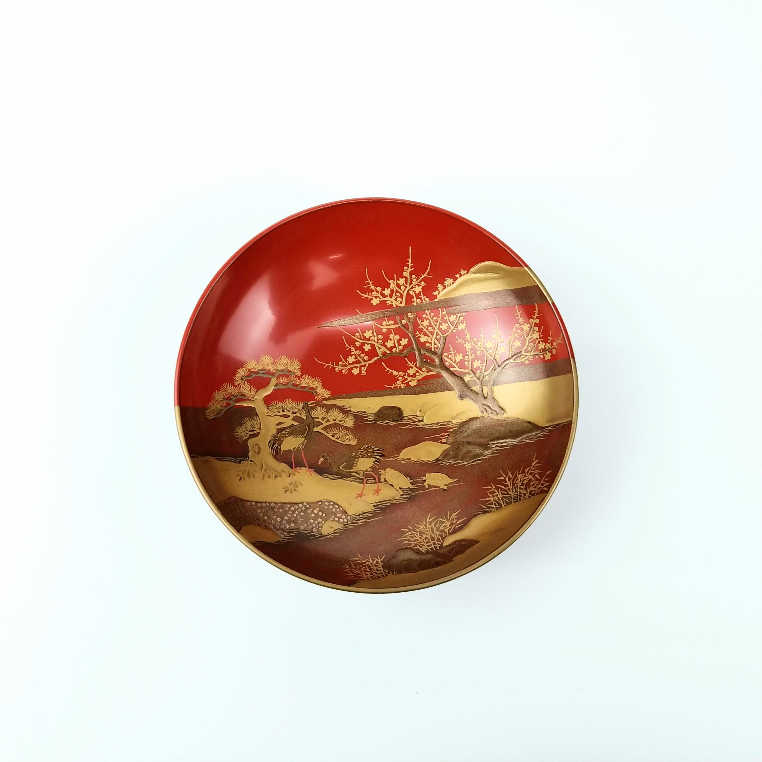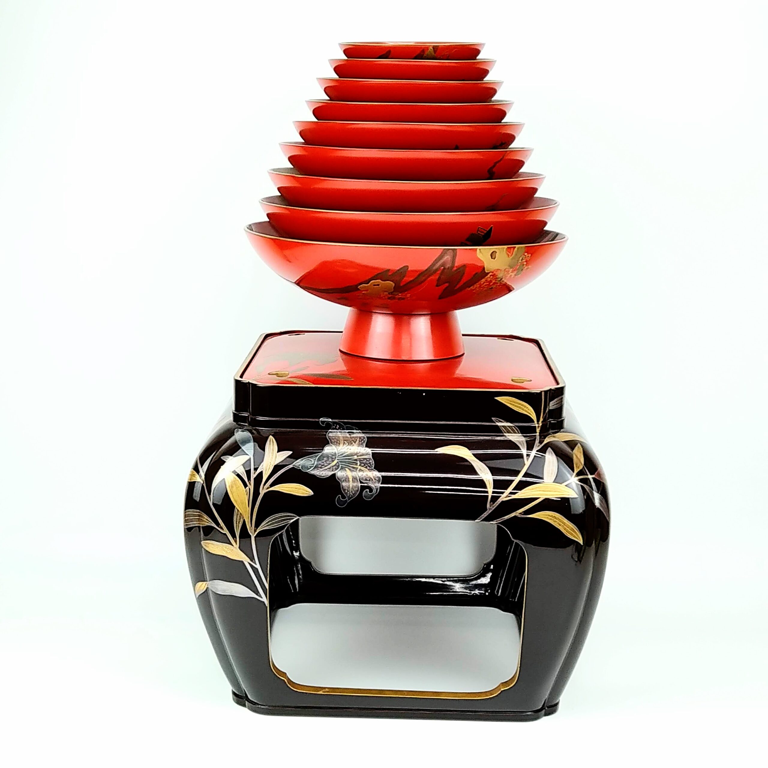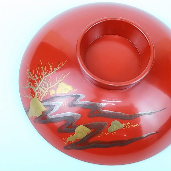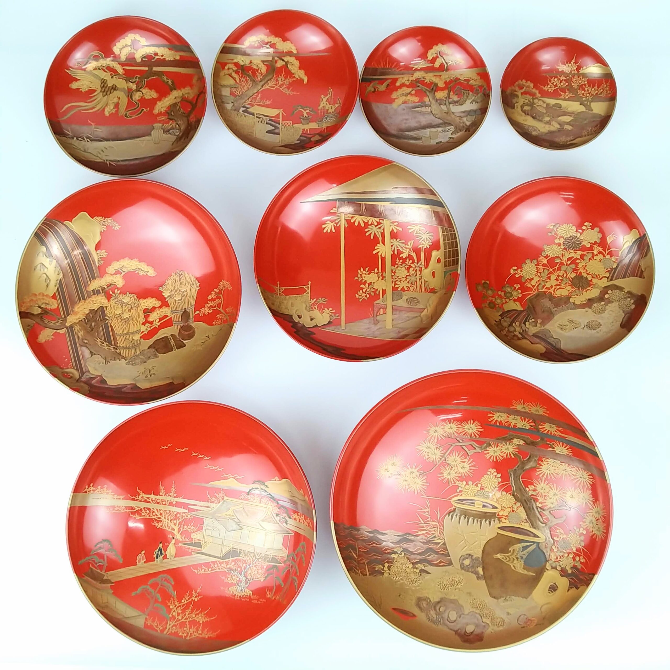 japanese antique Gold lacquer 9 sake cups with different design and stand