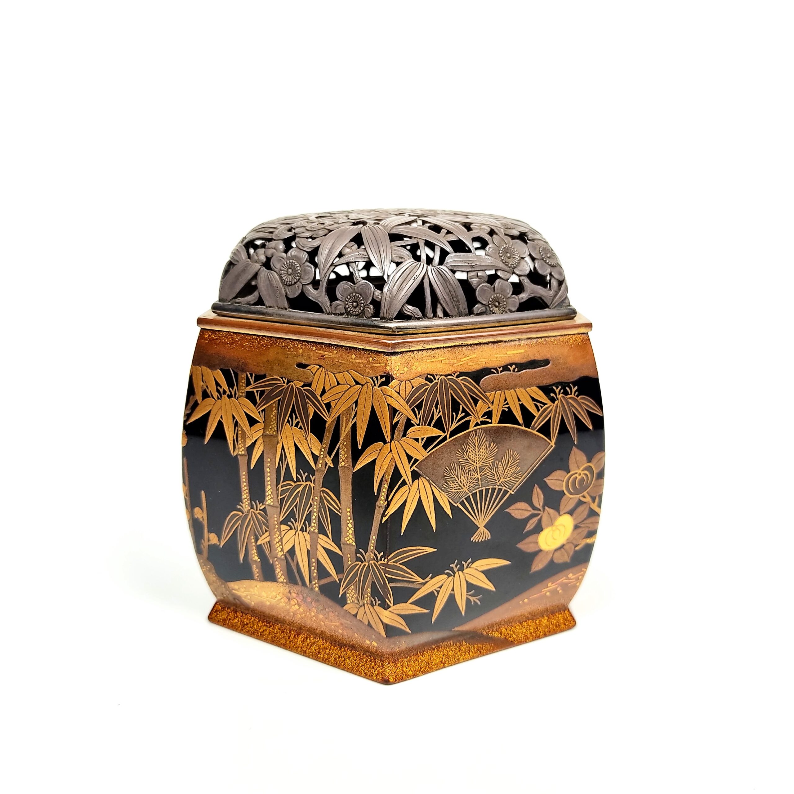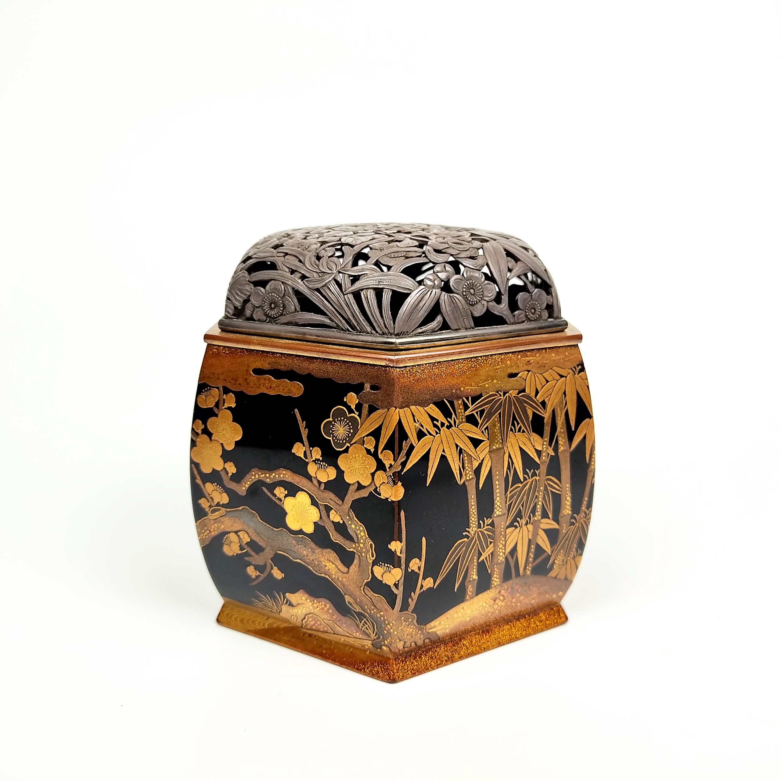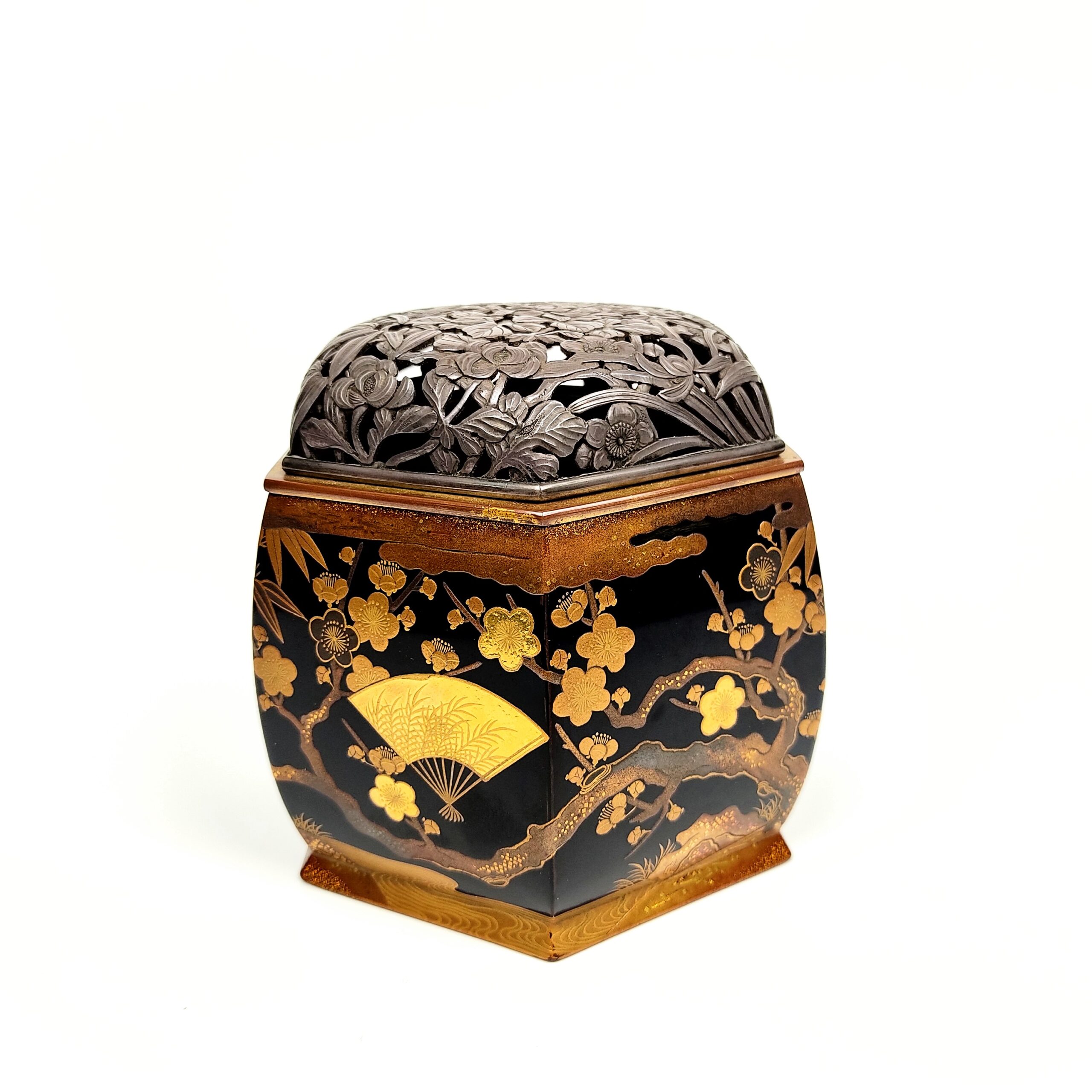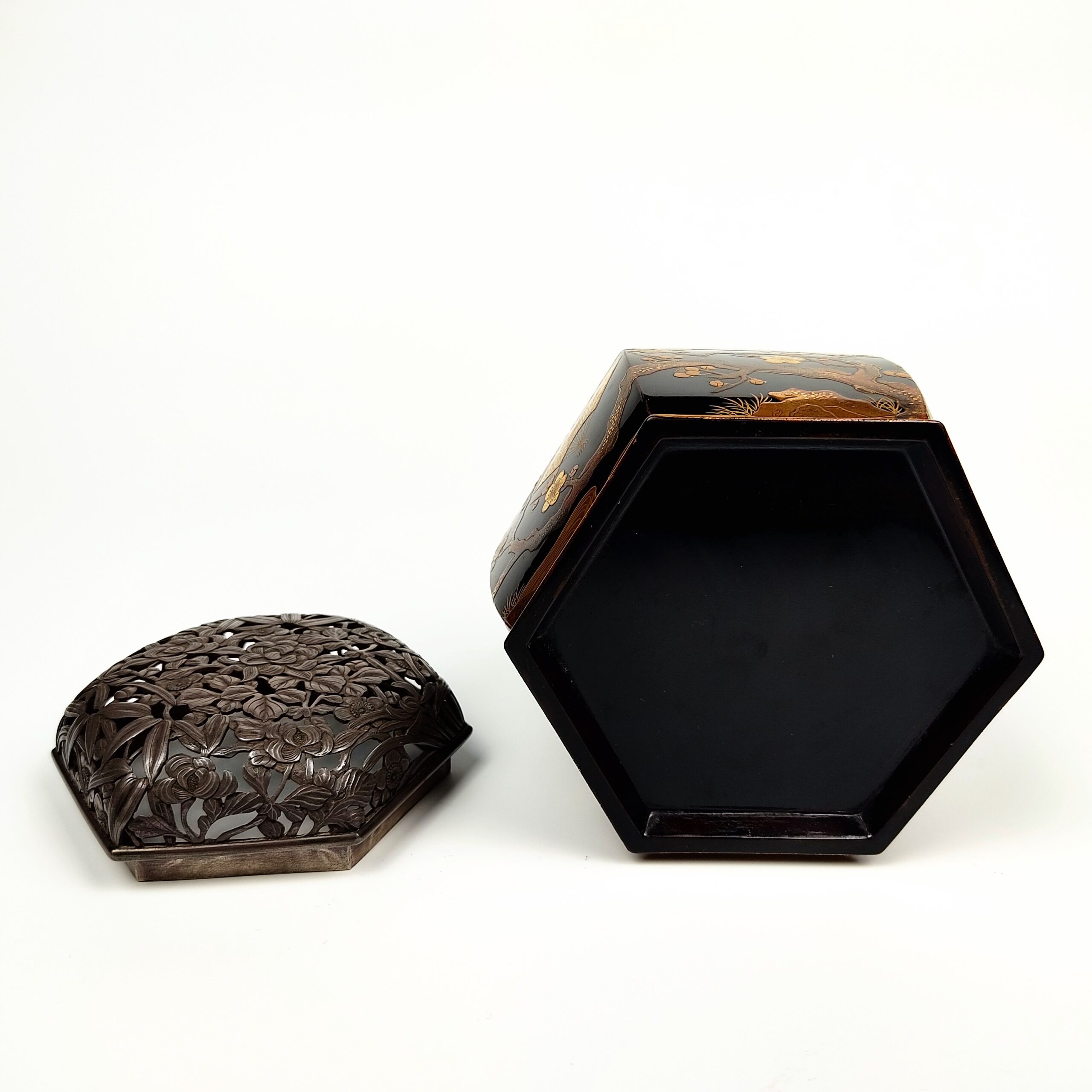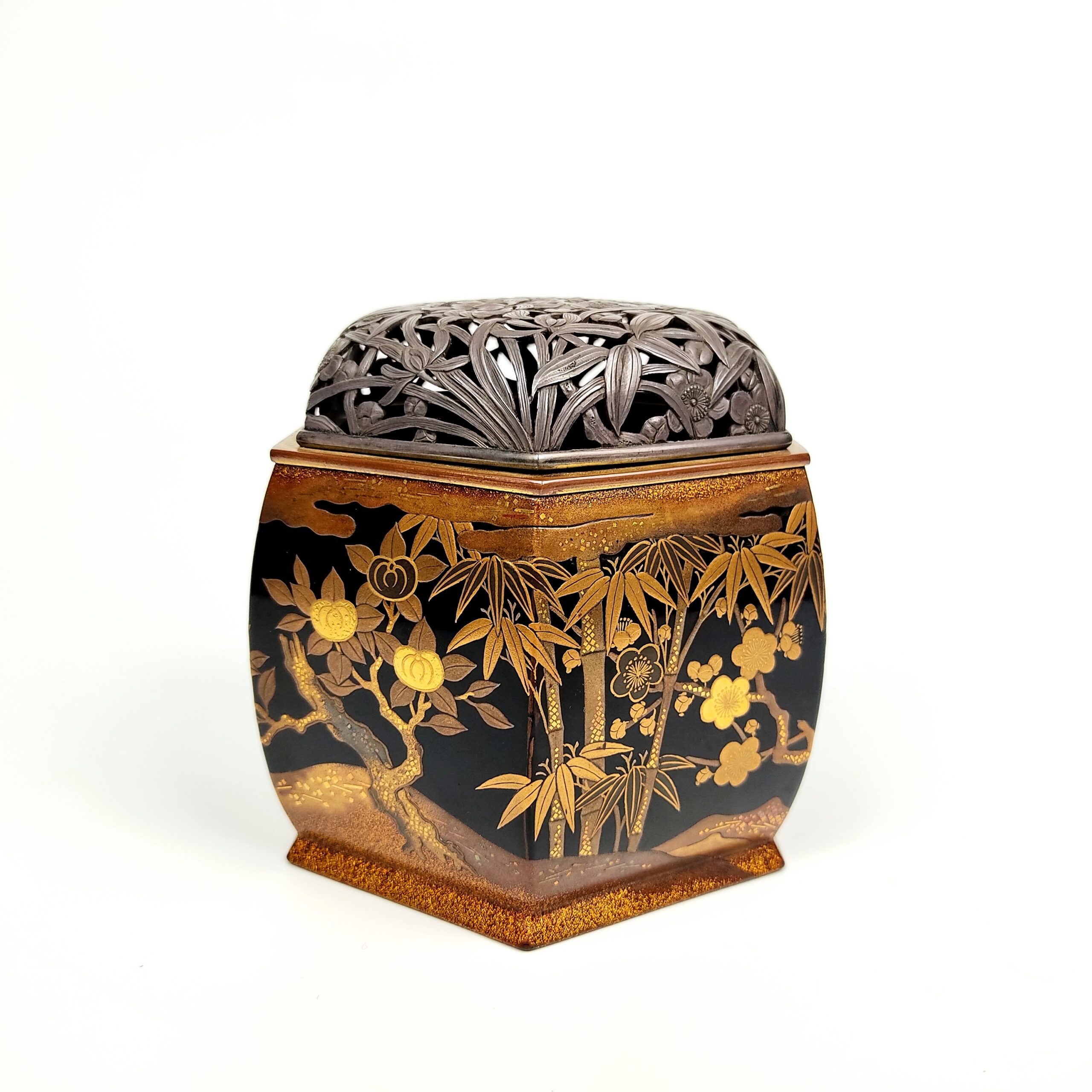 japanese antique Hexagon shape incense burner with gold lacquer decoration of pine,bamboo,plum,tachibana and fan.with carved silver chimny