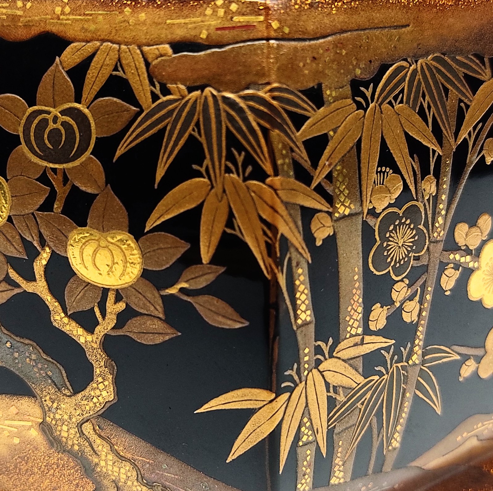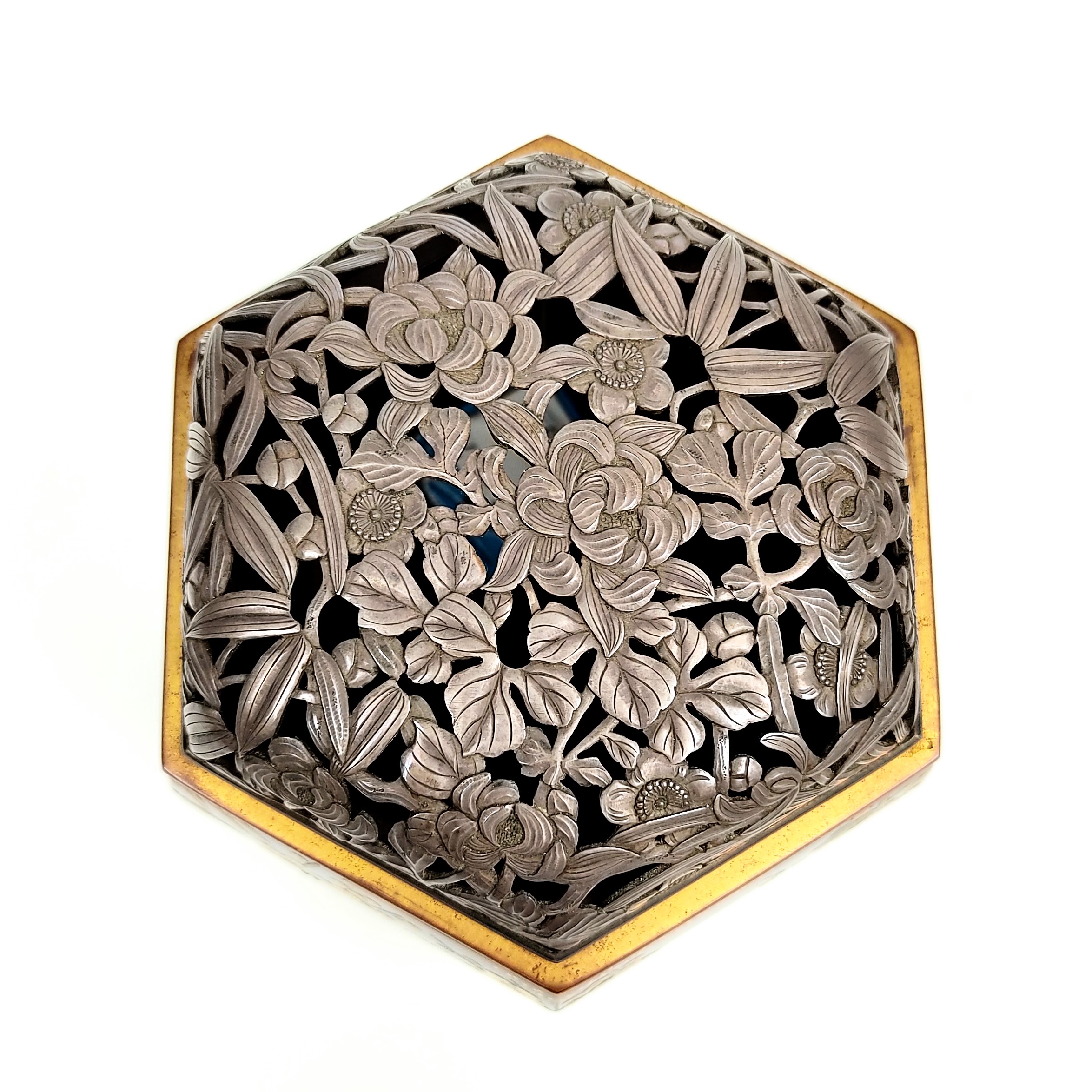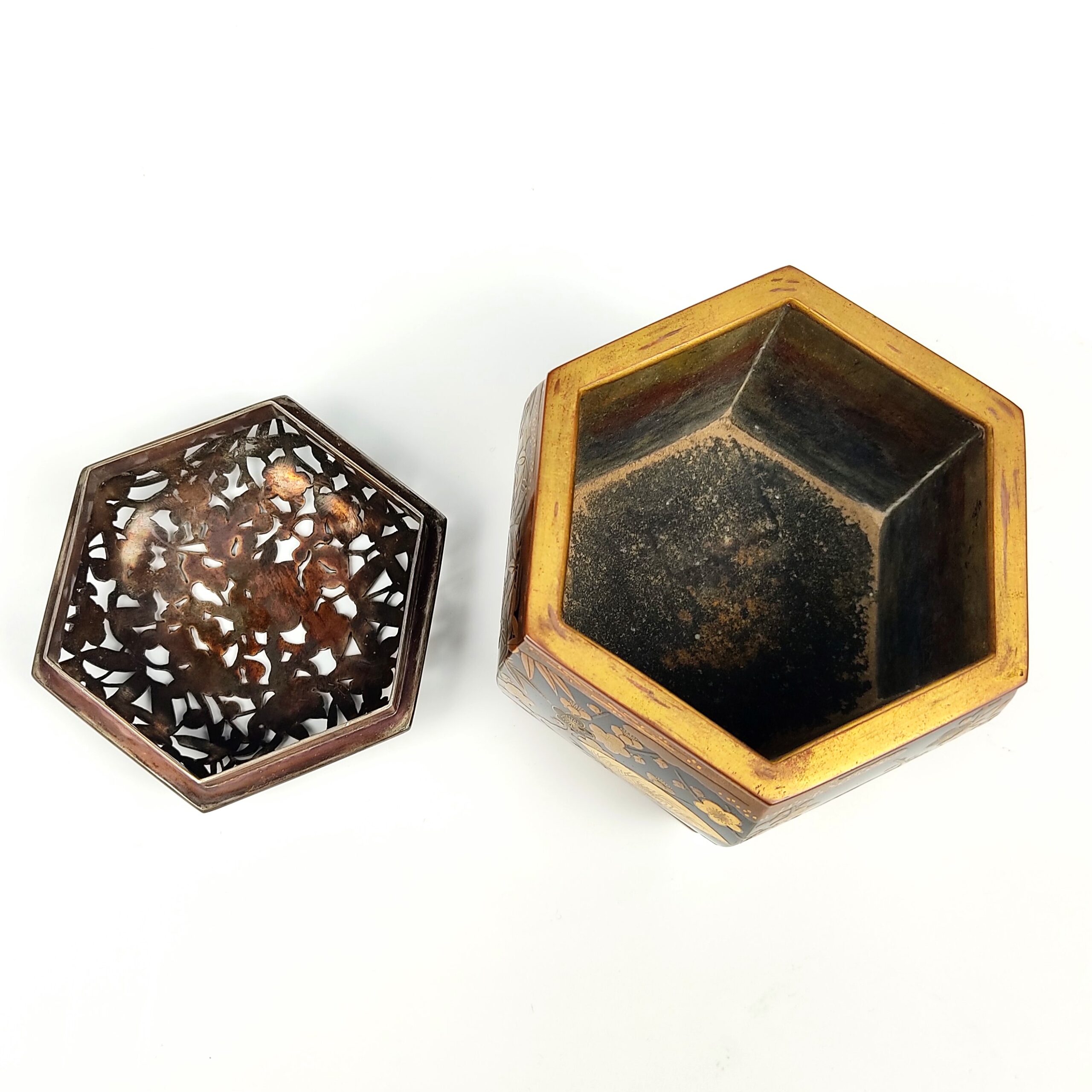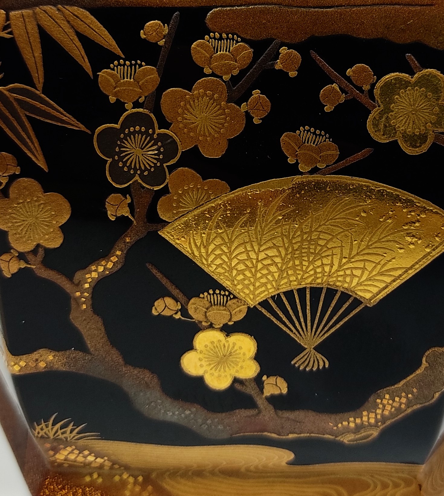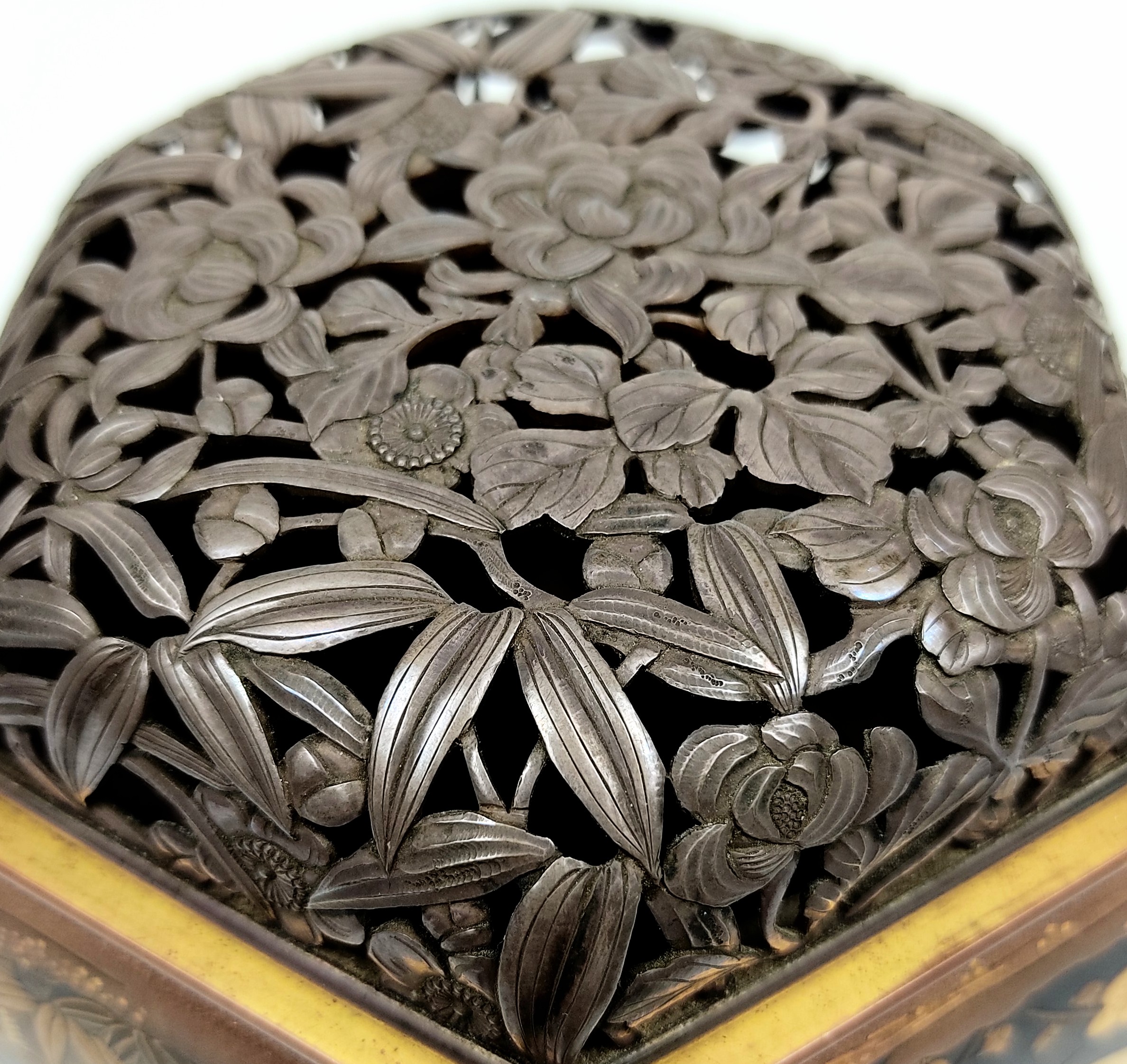 japanese antique Hexagon shape incense burner with gold lacquer decoration of pine,bamboo,plum,tachibana and fan.with carved silver chimny