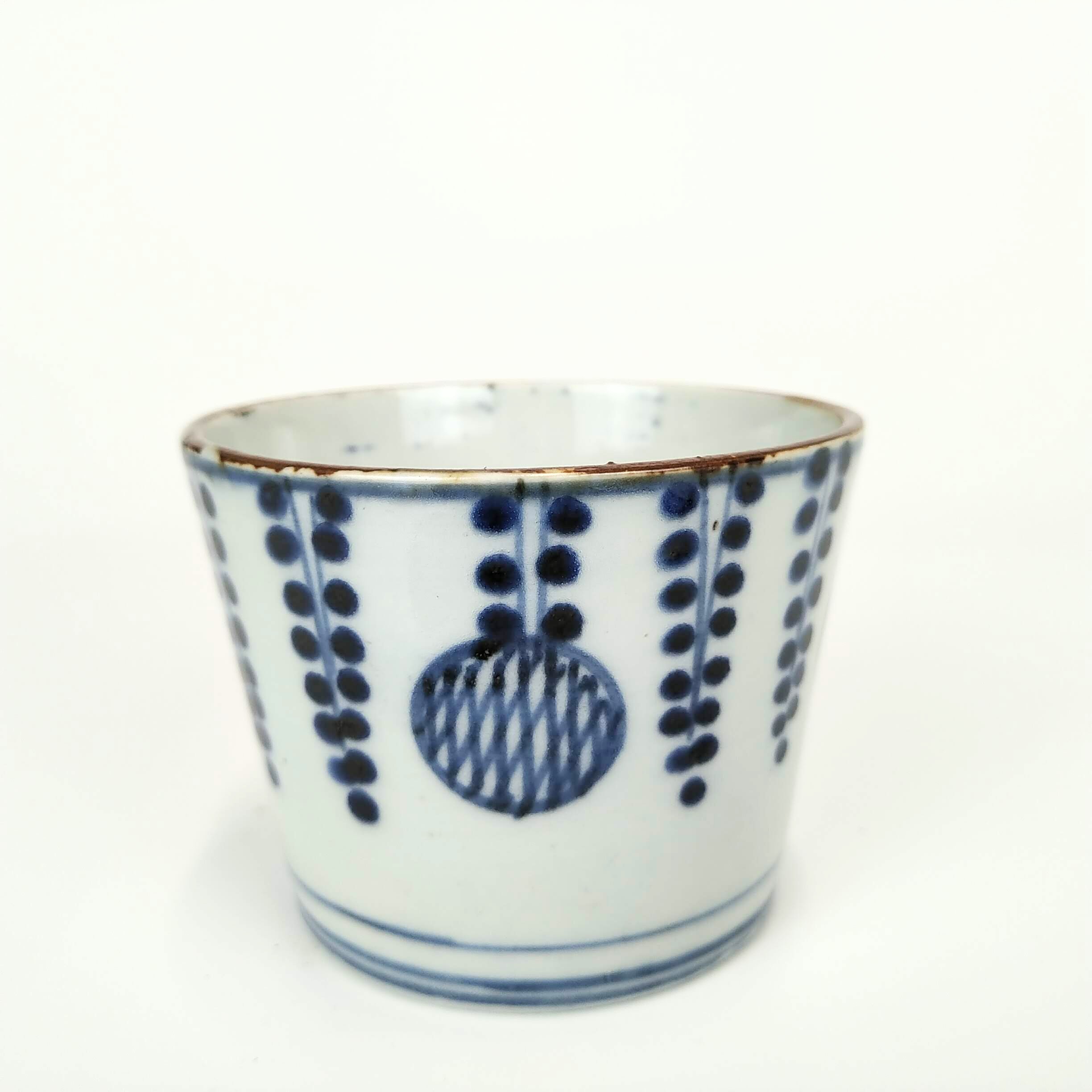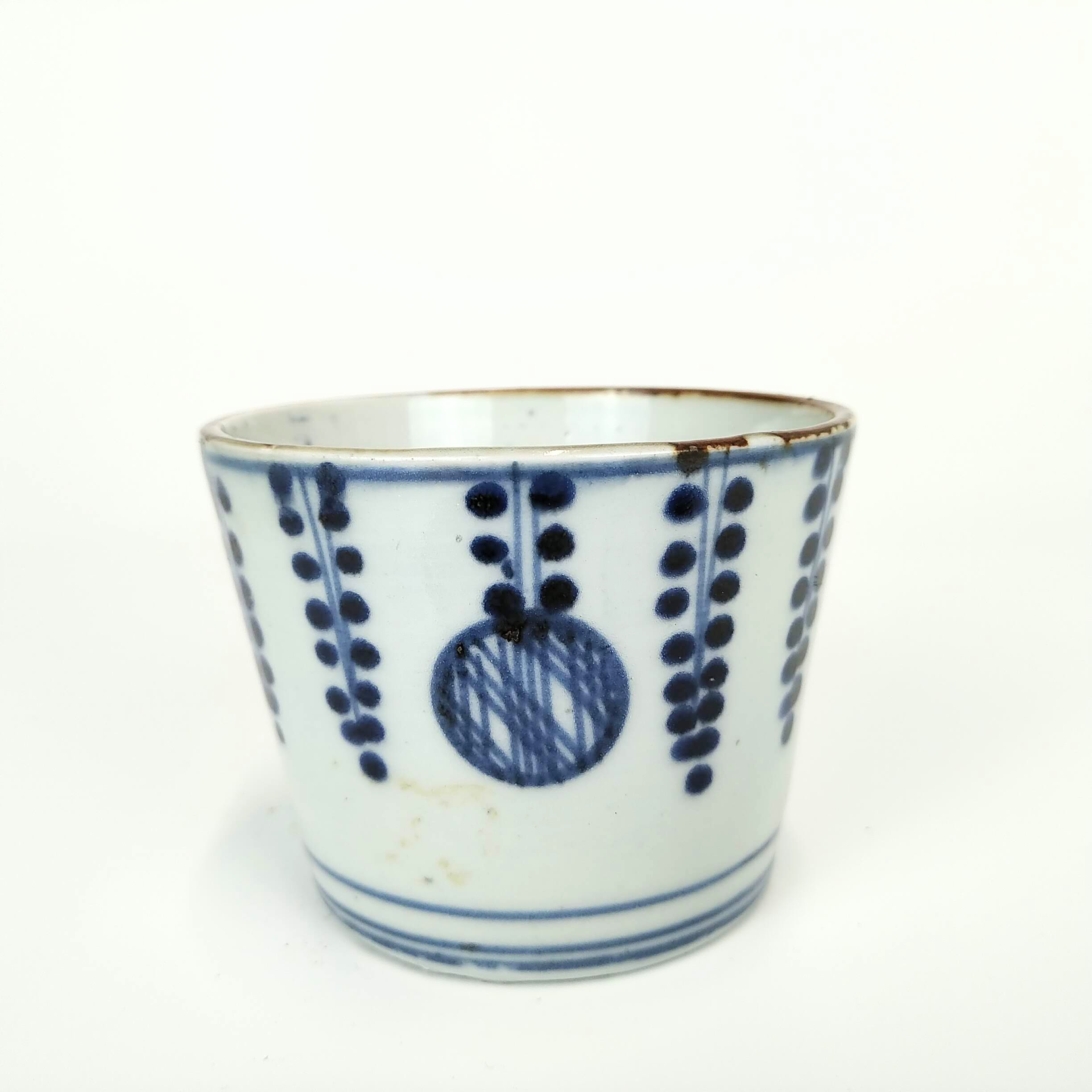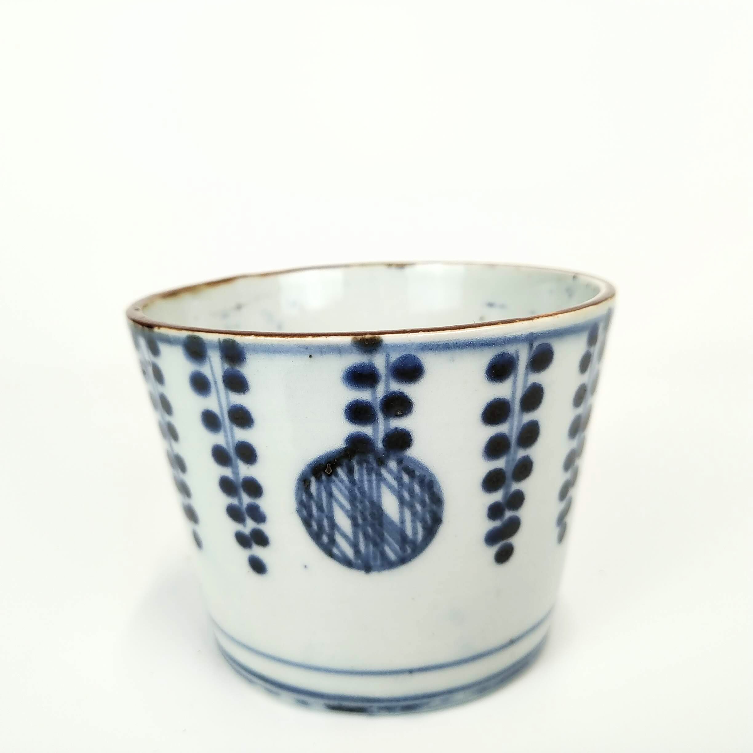 japanese antique Imari blue and white soba cup with design of drooping wisteria in circle